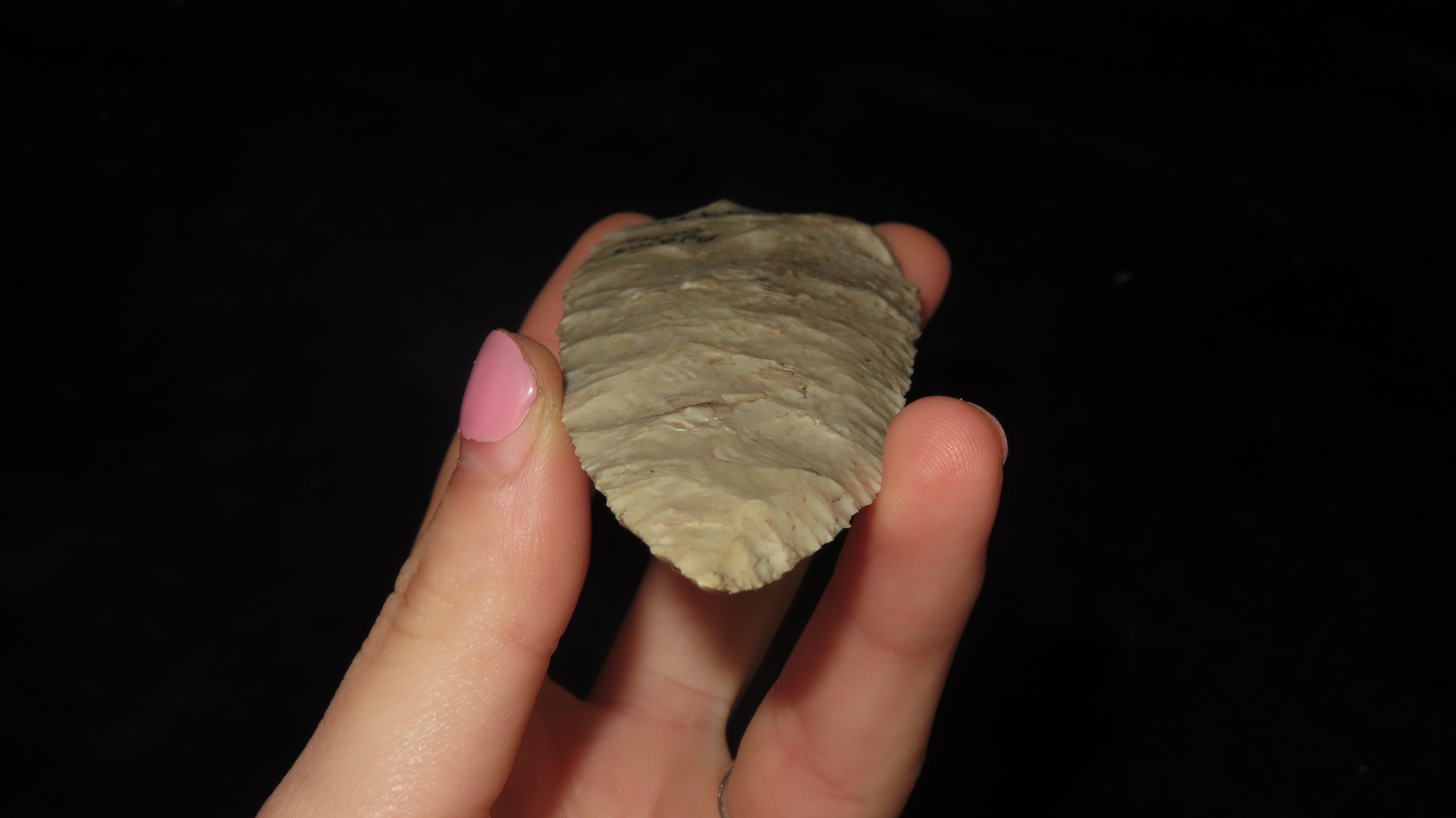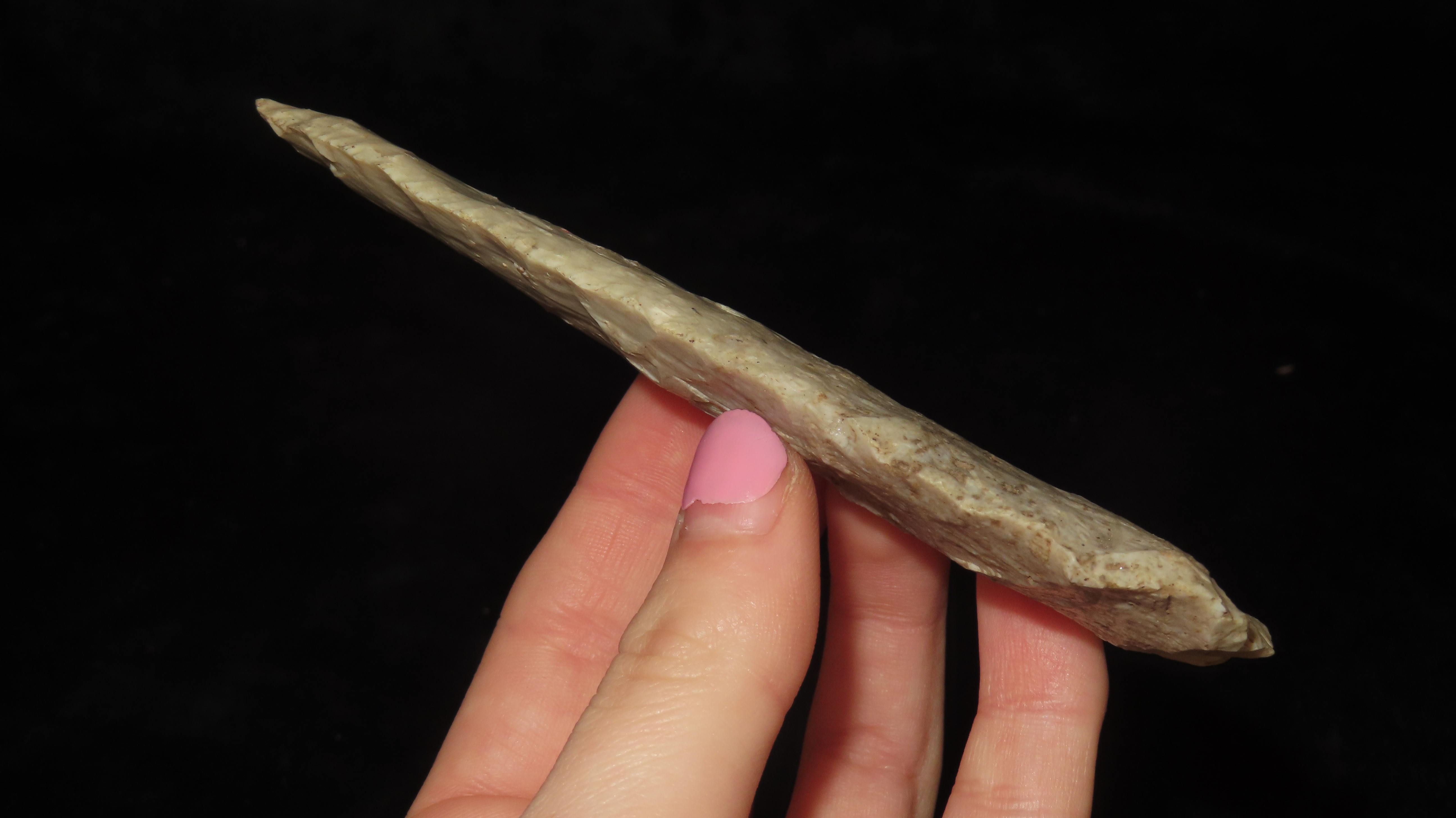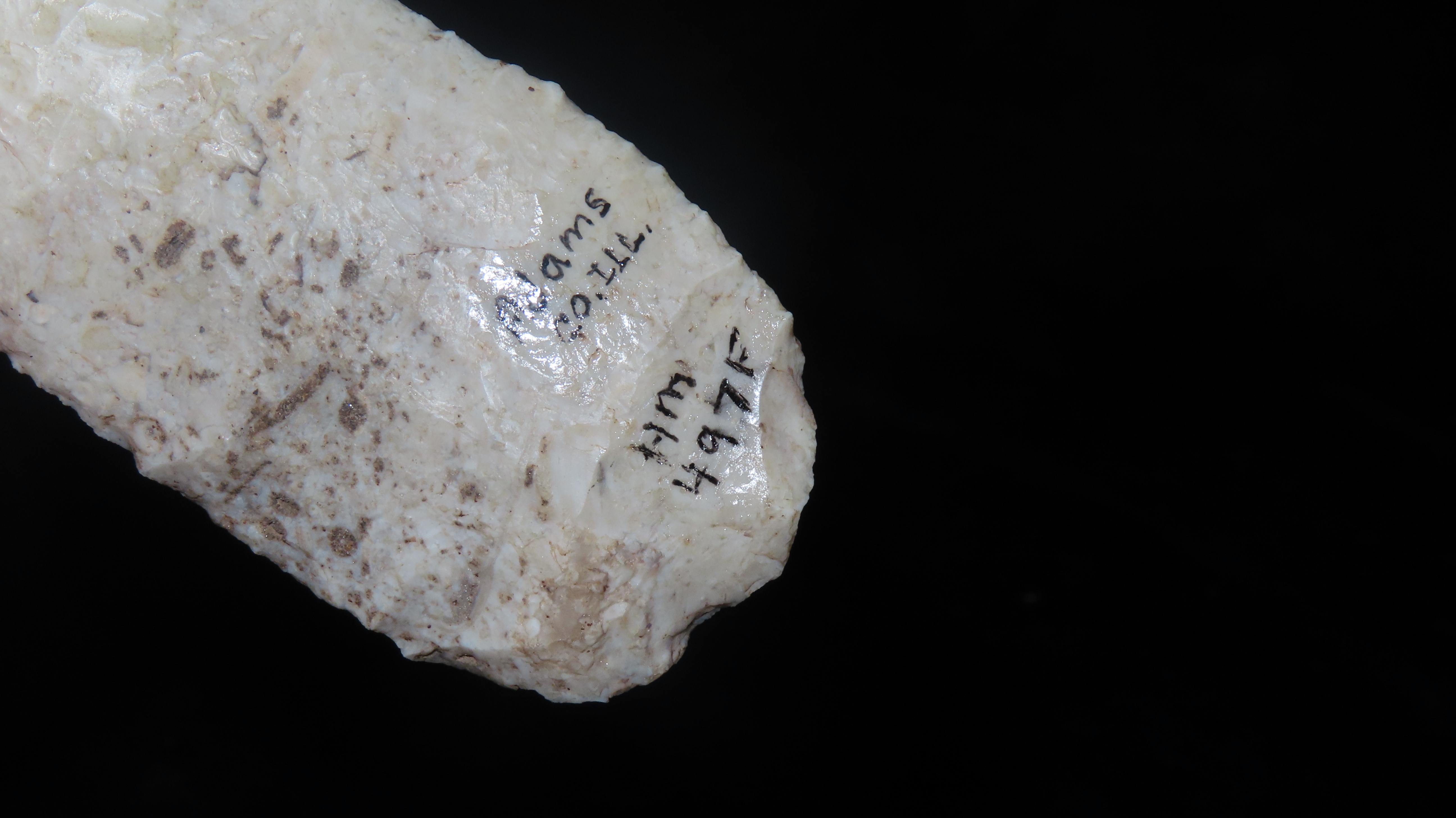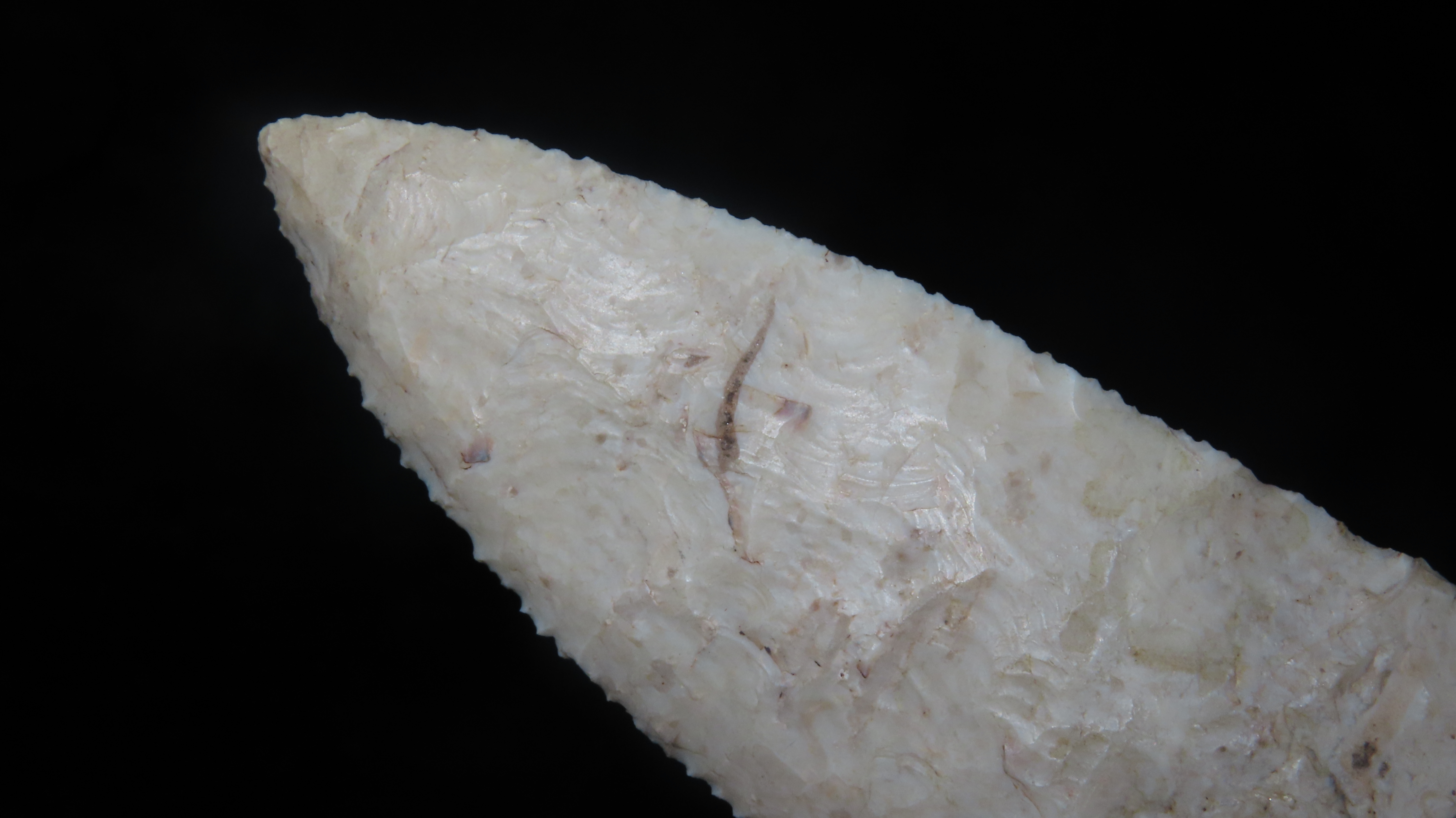 4 7/8″ x 1 5/8″ Knife, Found in Adams Co. Illinois, Well-made blade with very fine sarrated blade edges and a nice color. Ex. Herb Mangold Collection