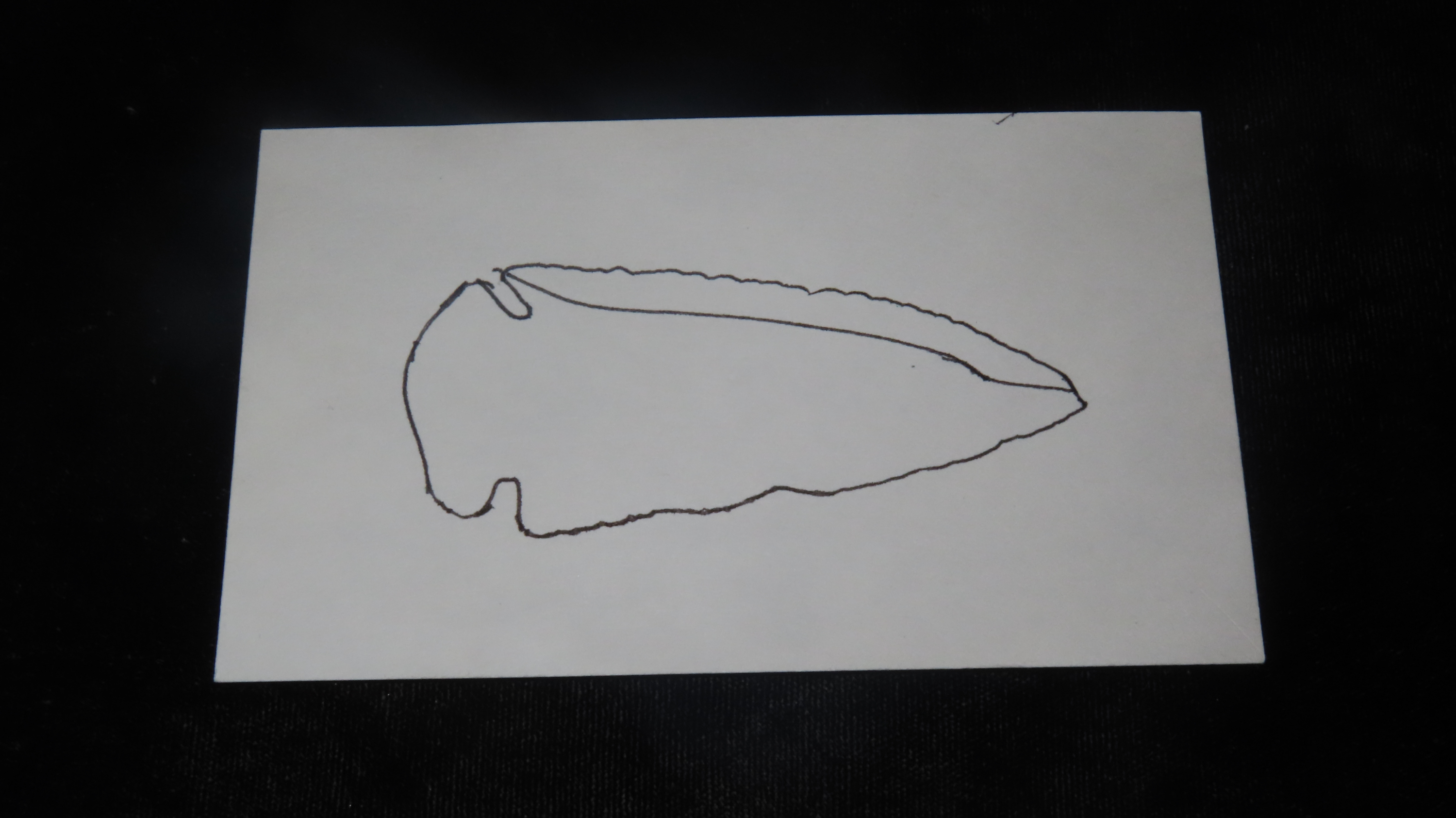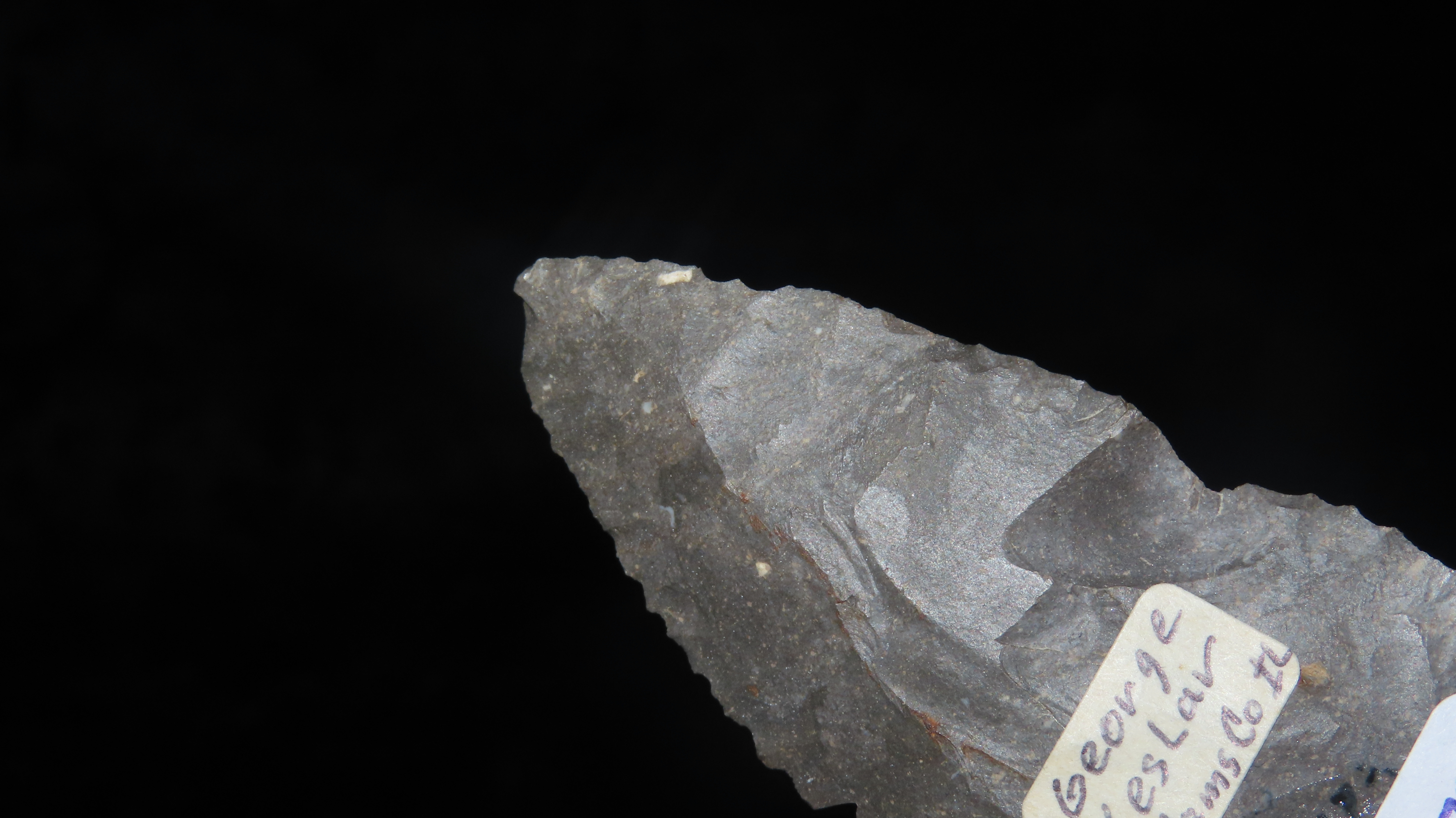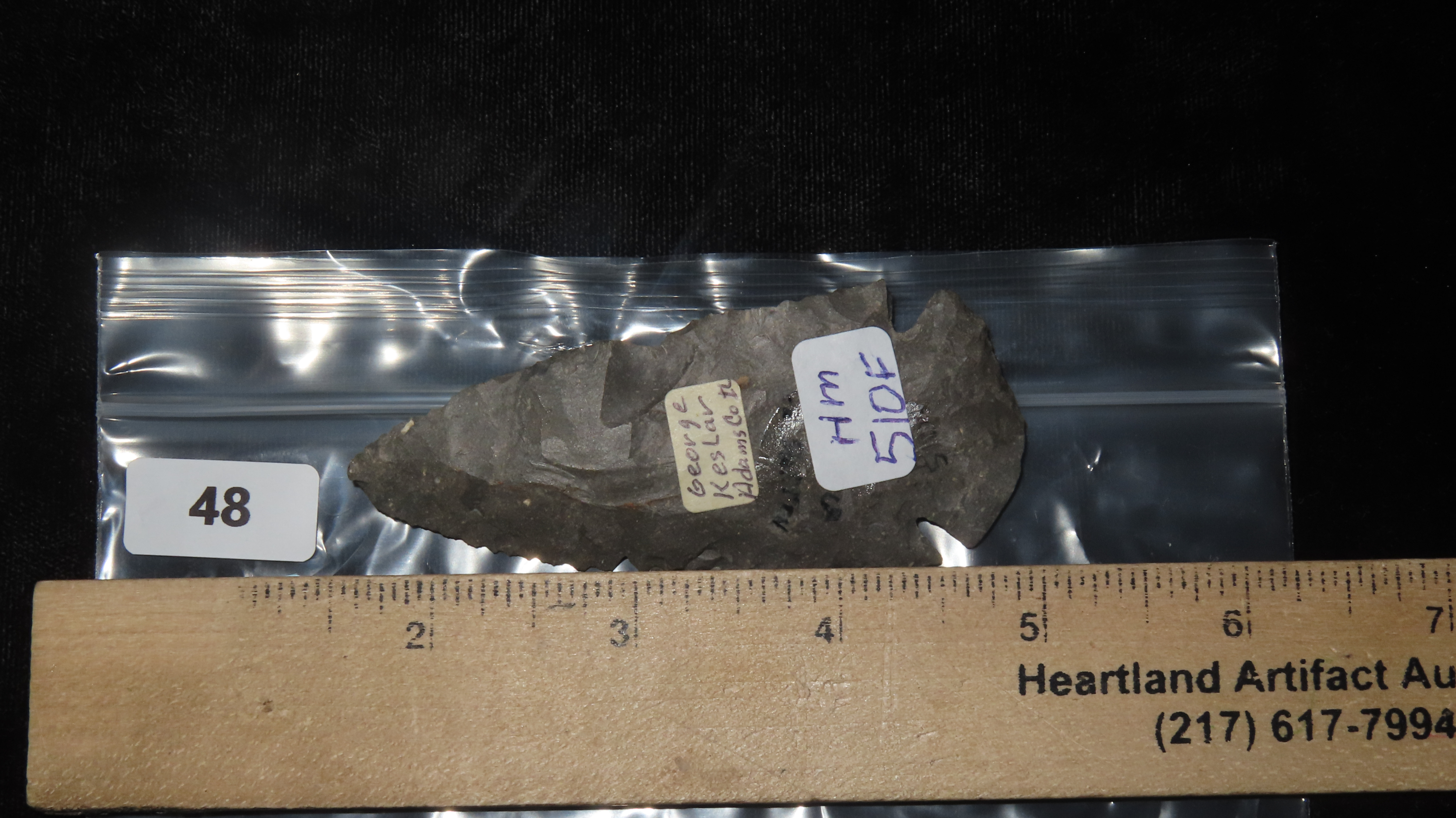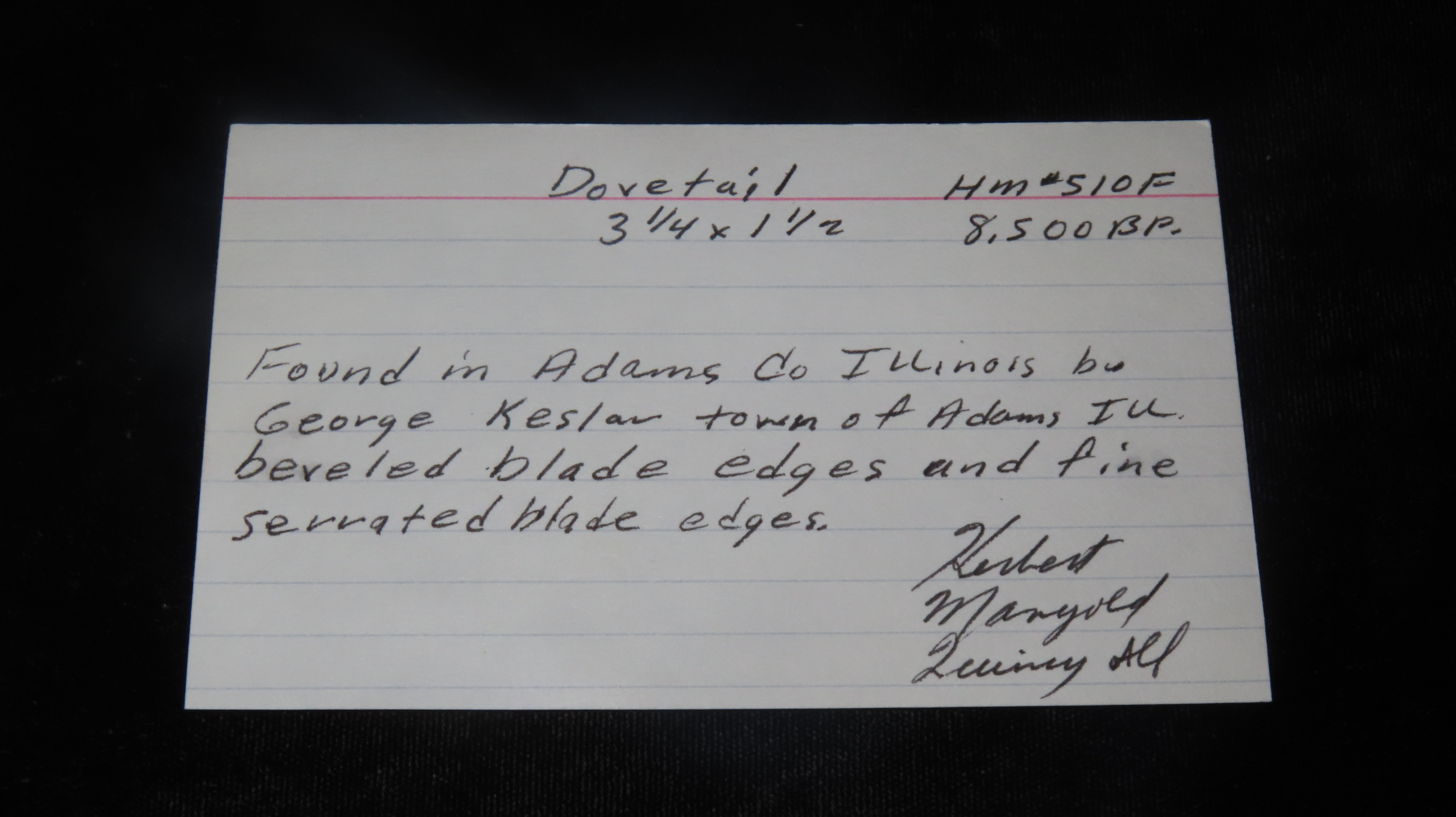 3 1/4″ x 1 1/2″ Dovetail, Found in Adams Co. Illinois by George Keslar in the town of Adams, IL. Nicely beveled with serrated blade edges. Ex. Herb Mangold Collection