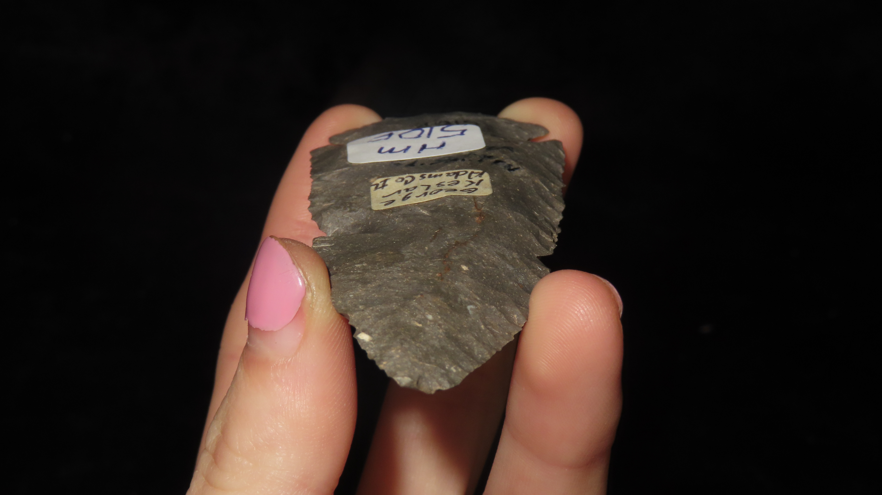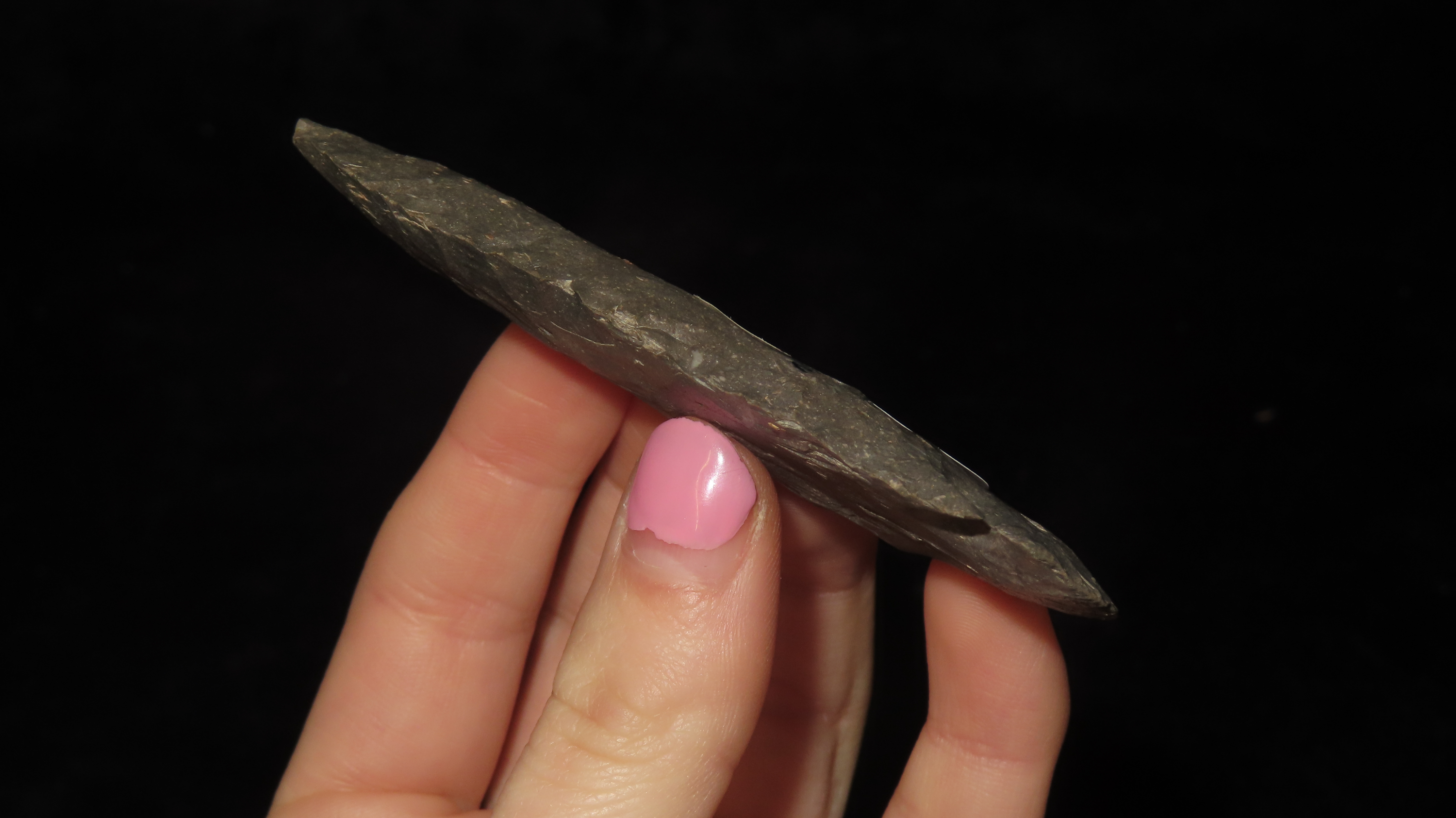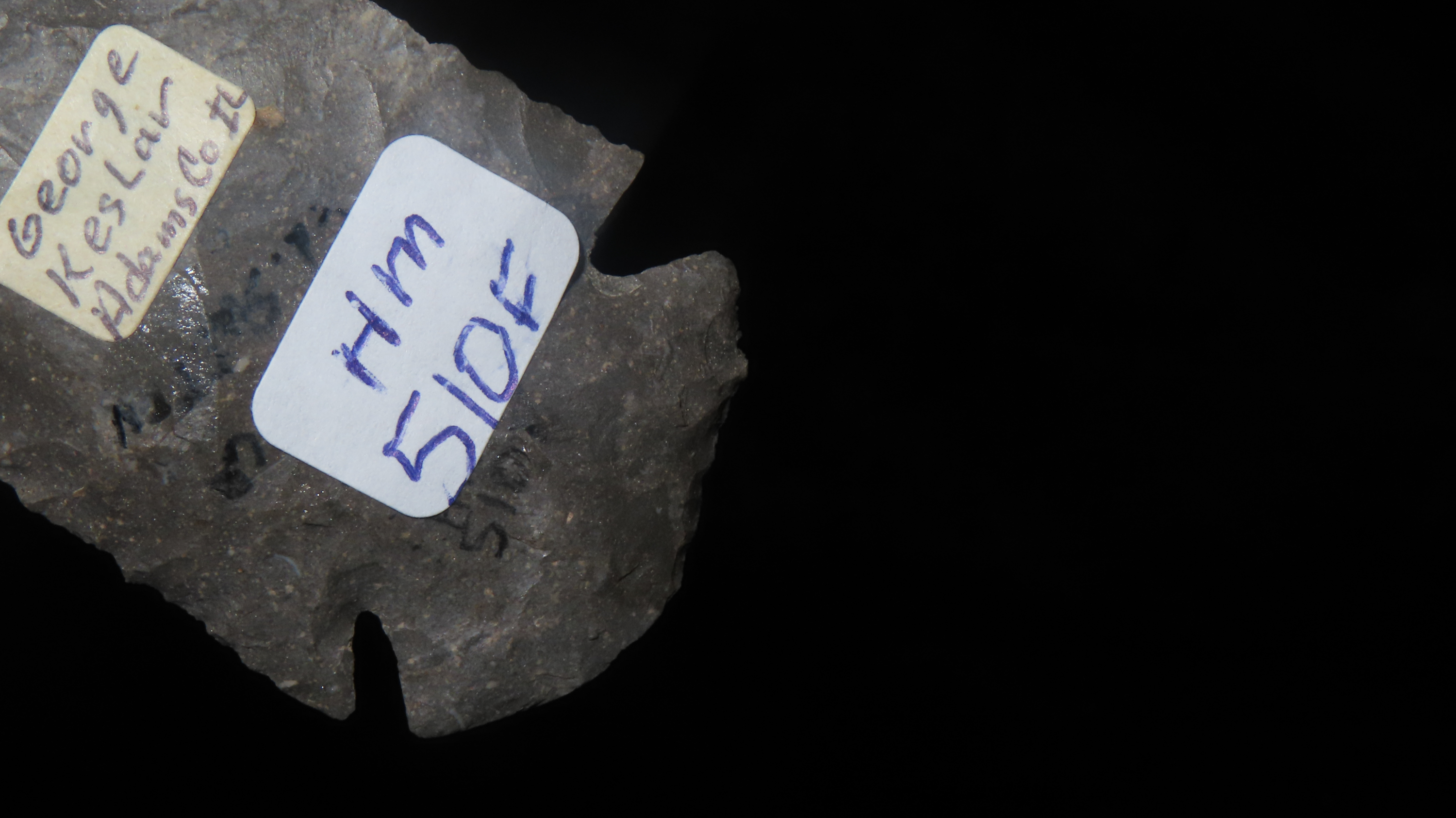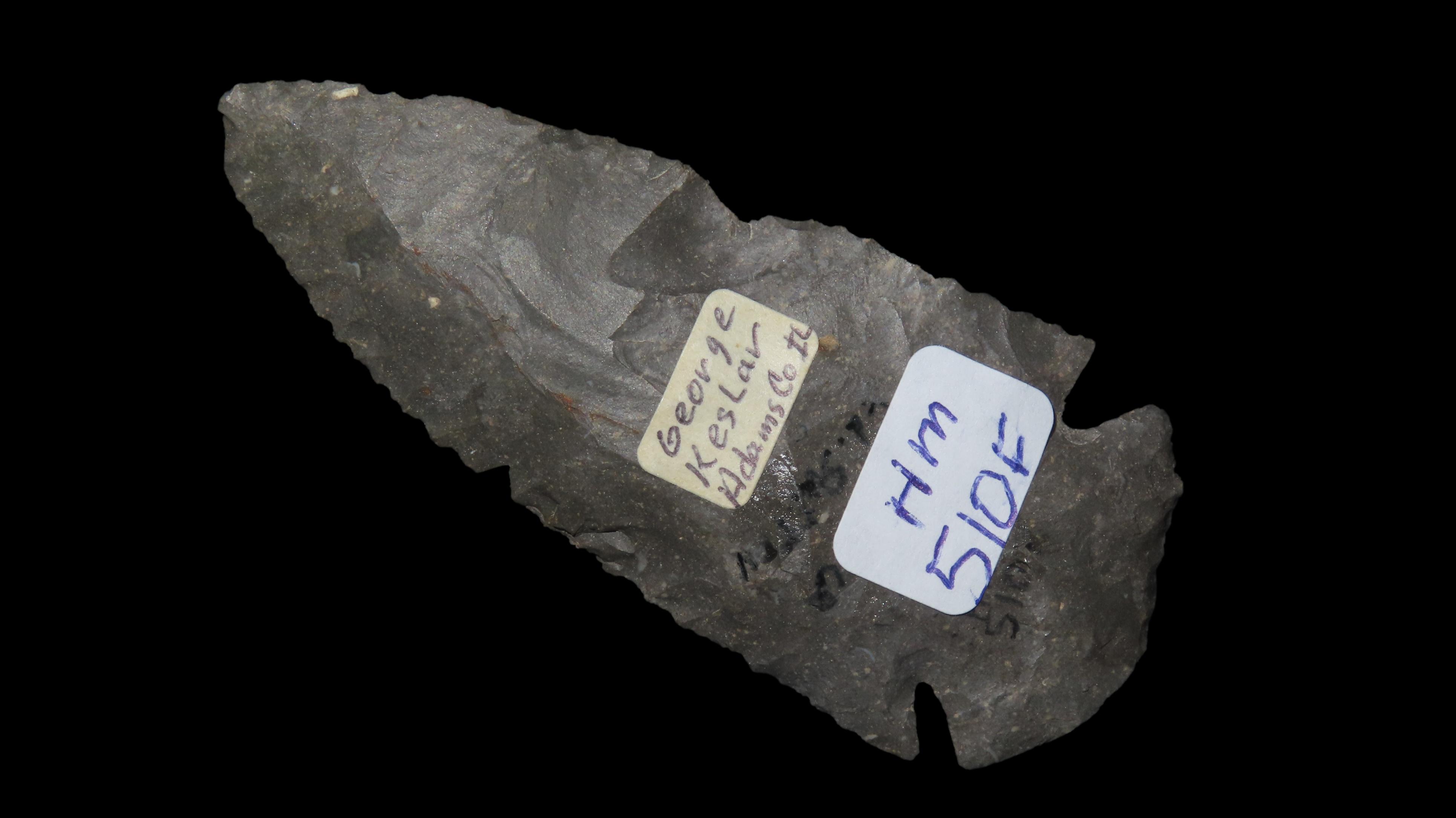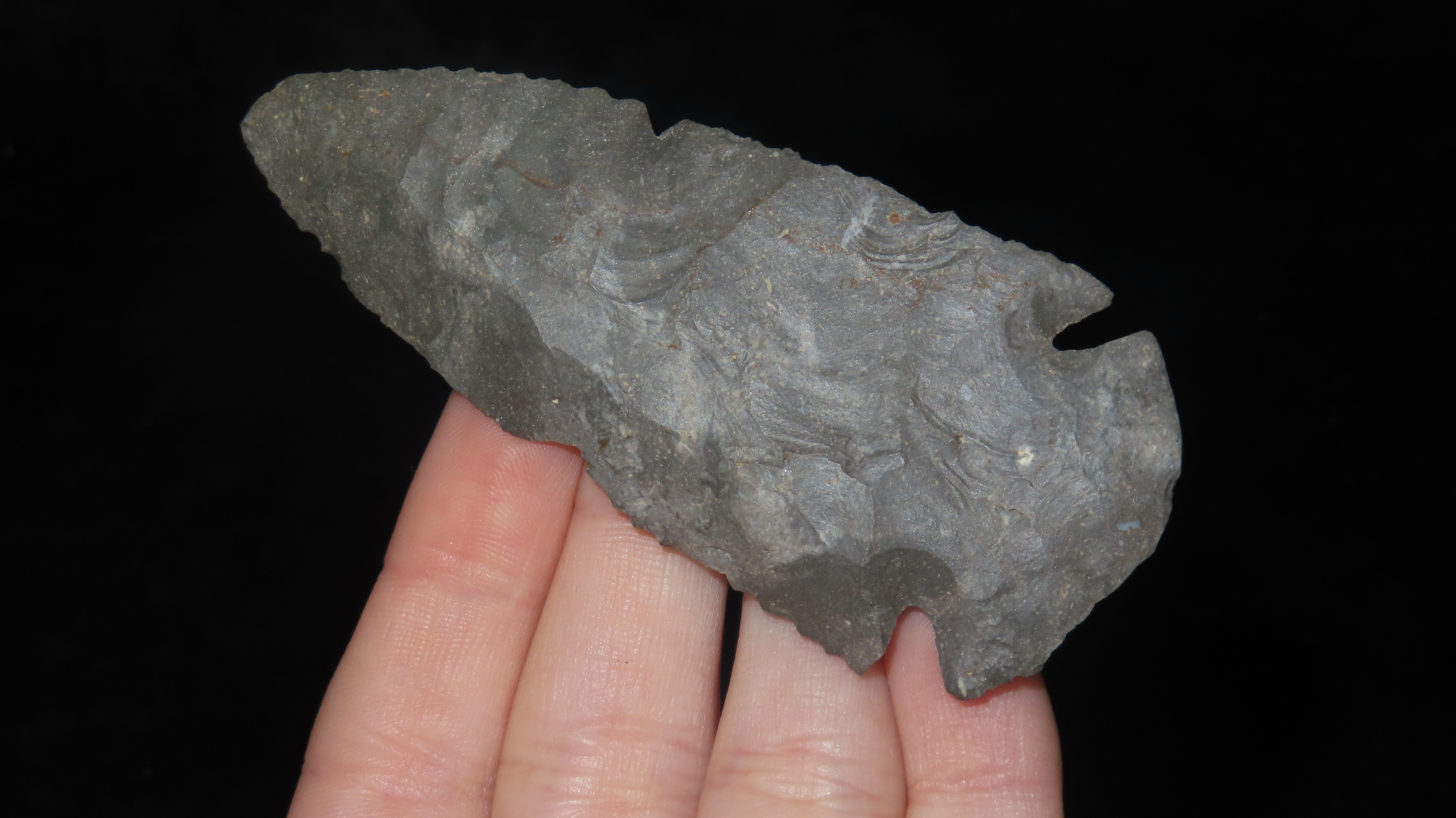 3 1/4″ x 1 1/2″ Dovetail, Found in Adams Co. Illinois by George Keslar in the town of Adams, IL. Nicely beveled with serrated blade edges. Ex. Herb Mangold Collection