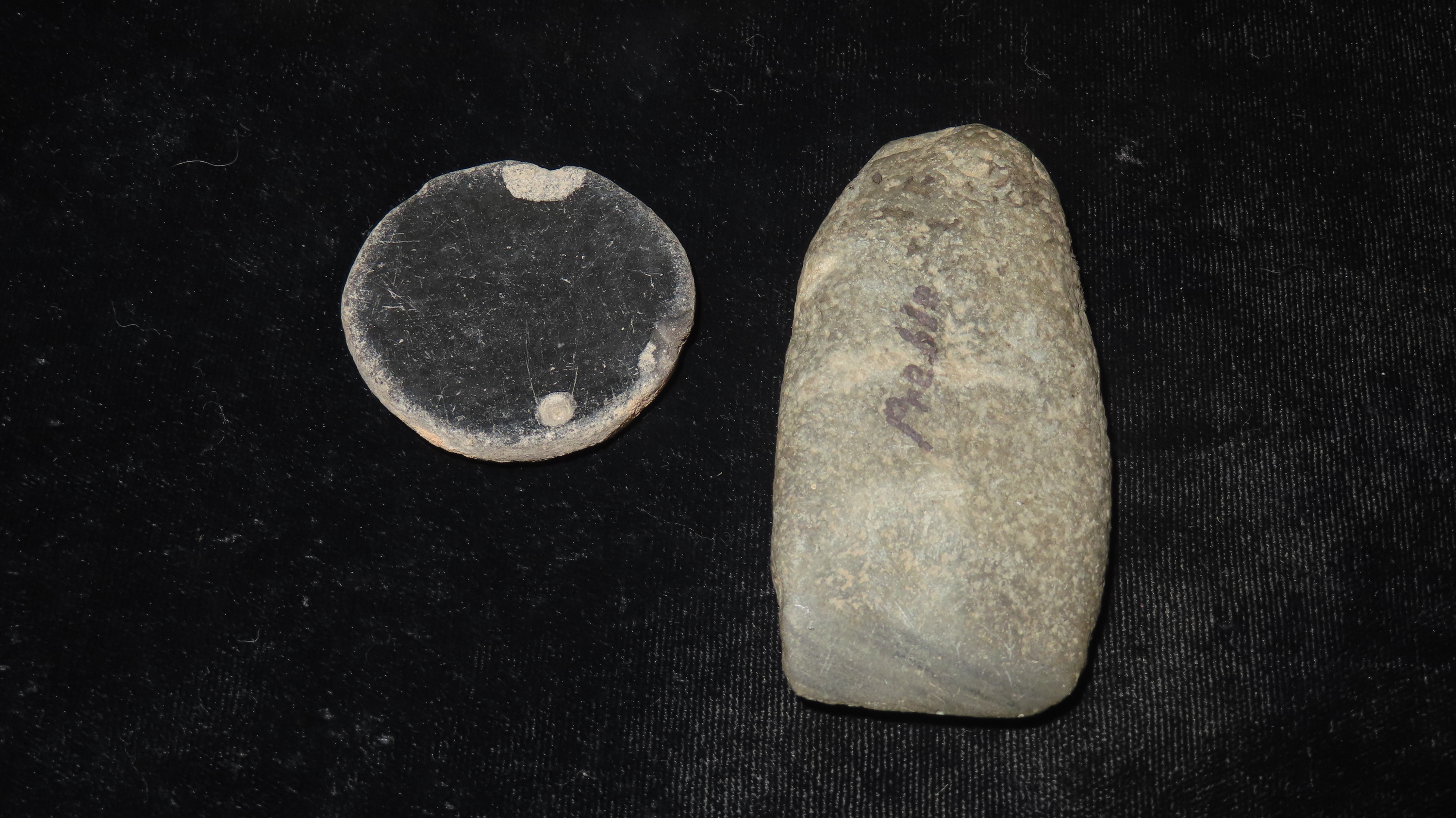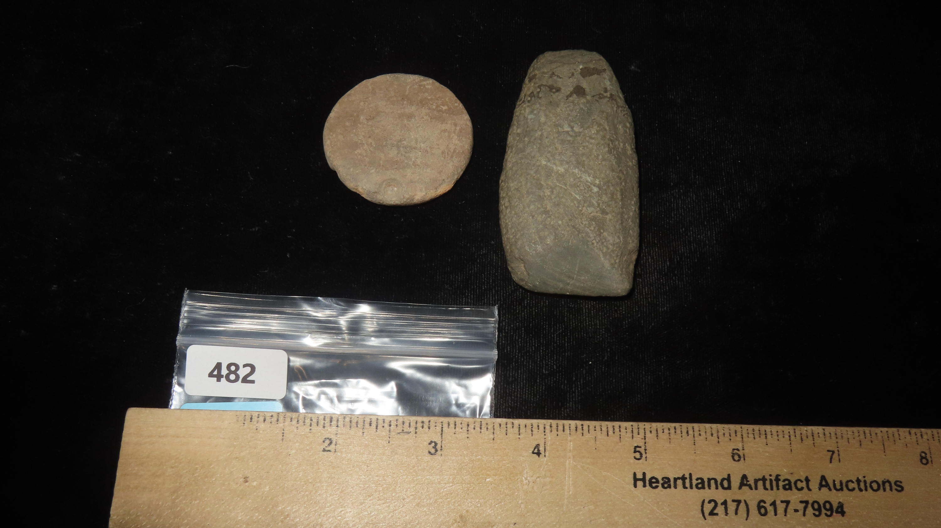 Lot of 2 Items, 1 5/8 unfinished pottery pendant, the other item is a celt measuring 2 7/8″