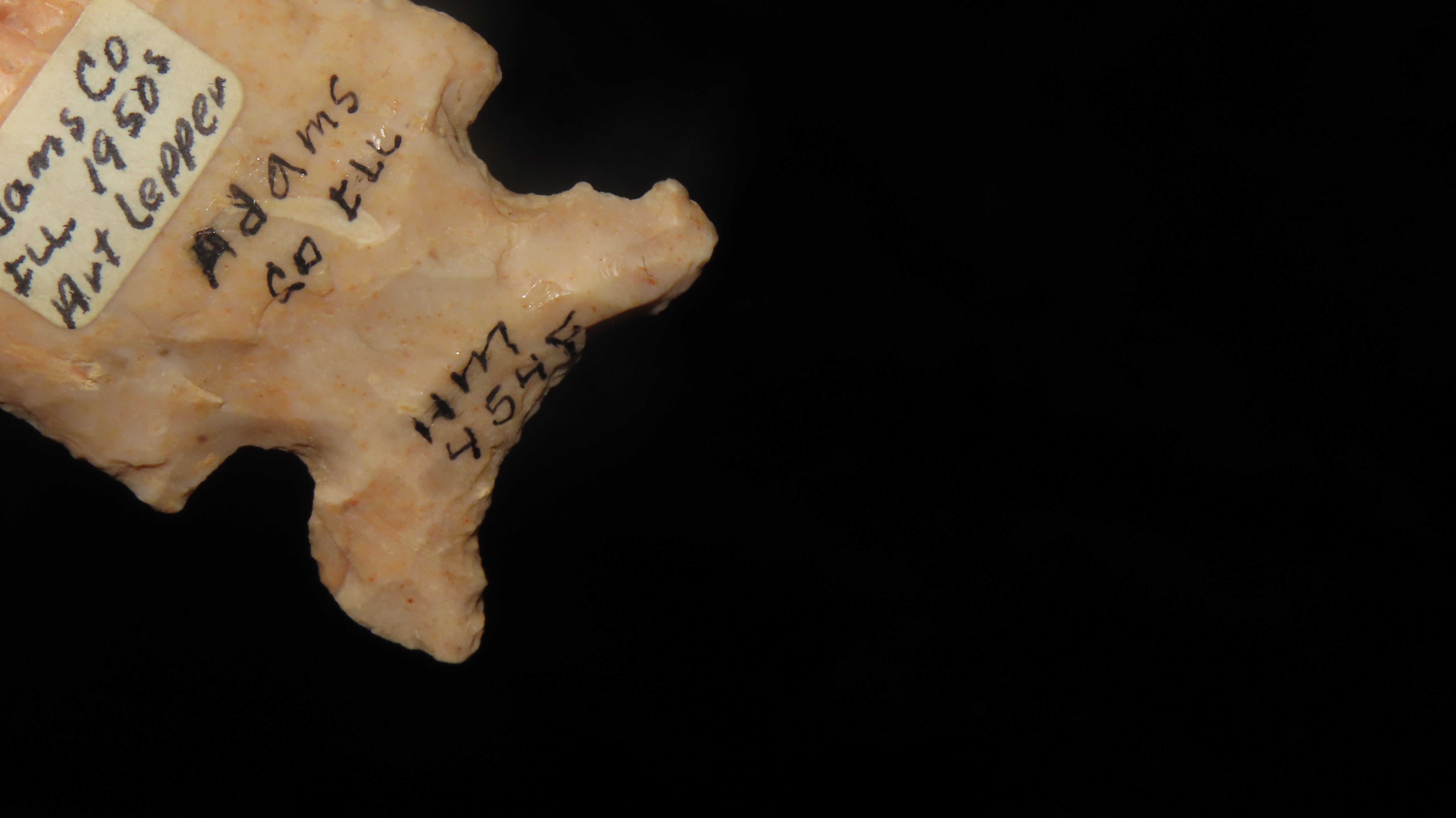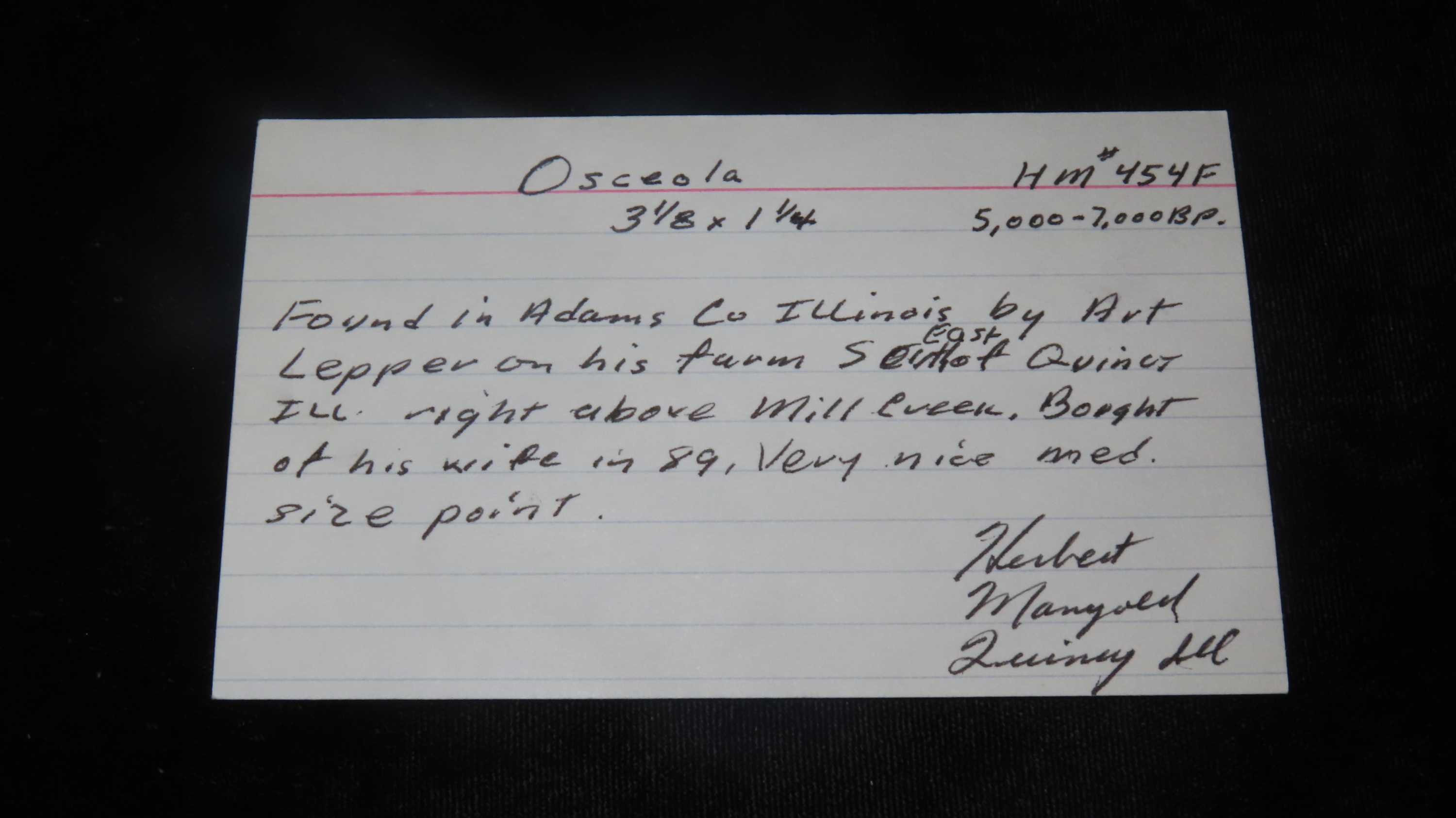 3 1/8″ x 1 1/4″ Osceola, Found in Adams Co. Illinois by Art Lepper on his farm south of Quincy, Illinois, Right above Mill Creek. Bought from his wife in 1989. Ex. Herb Mangold Collection