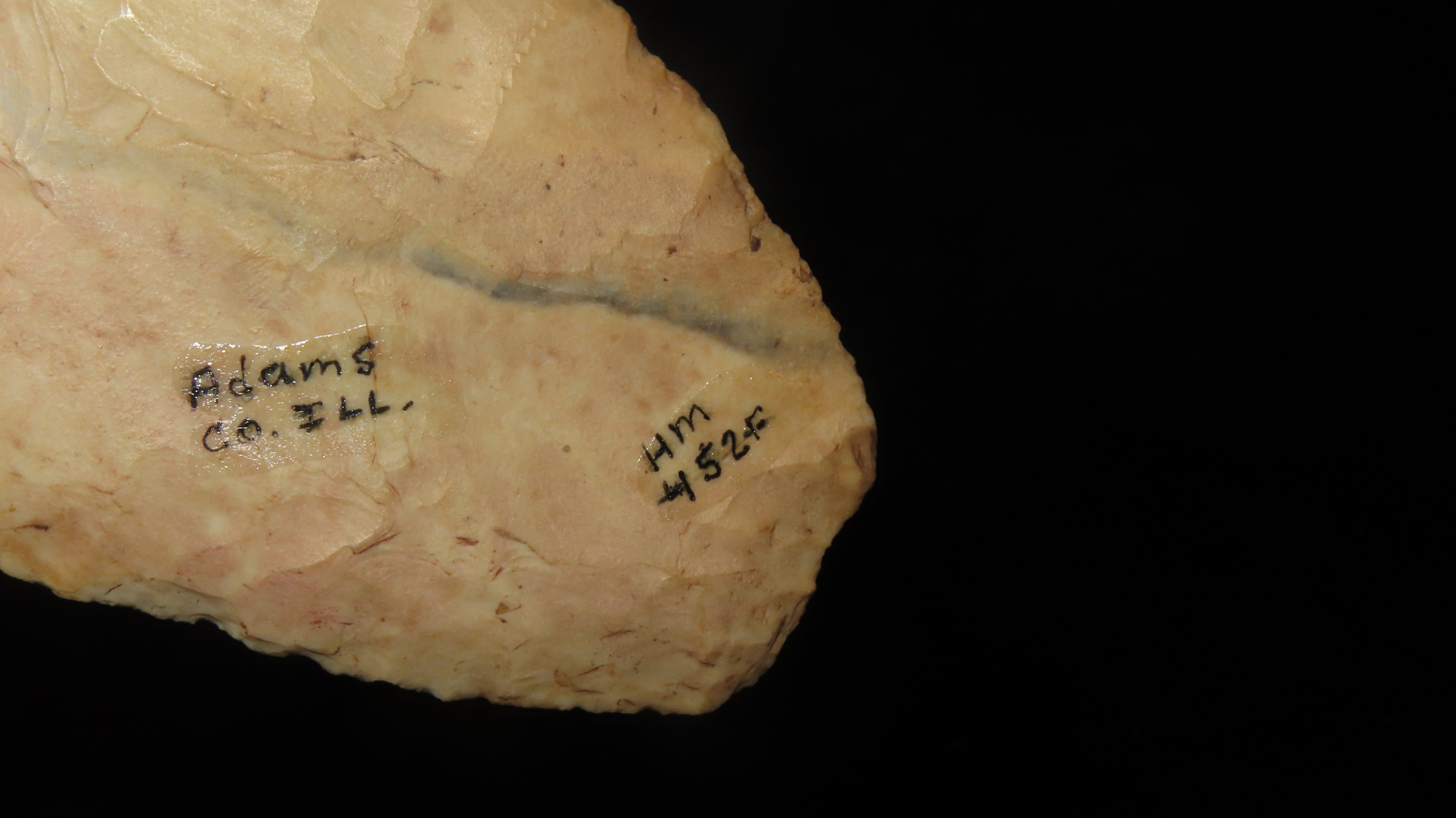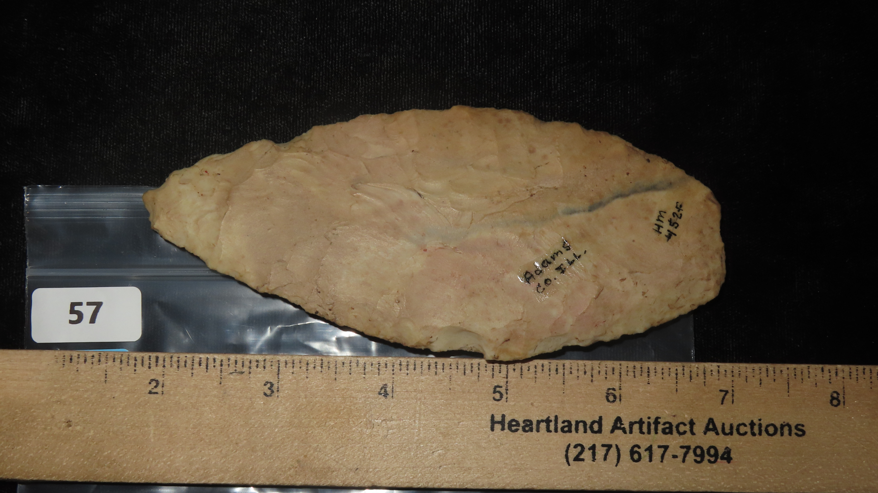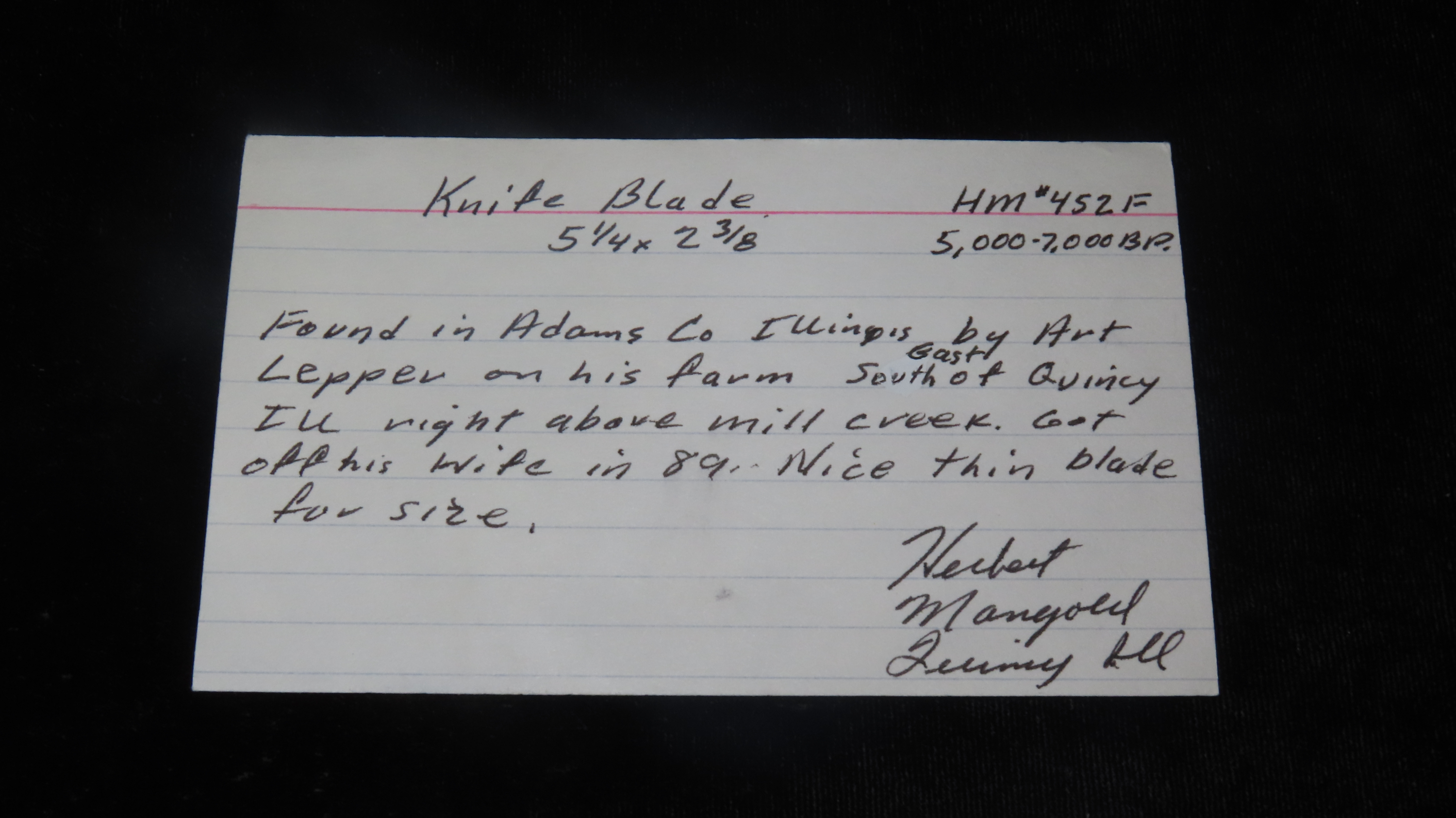 5 1/4″ x 2 3/8″ Knife Blade, Found in Adams Co. Illinois by Art Lepper on his farm south of Quincy, Illinois, Right above Mill Creek. Bought from his wife in 1989. Ex. Herb Mangold Collection