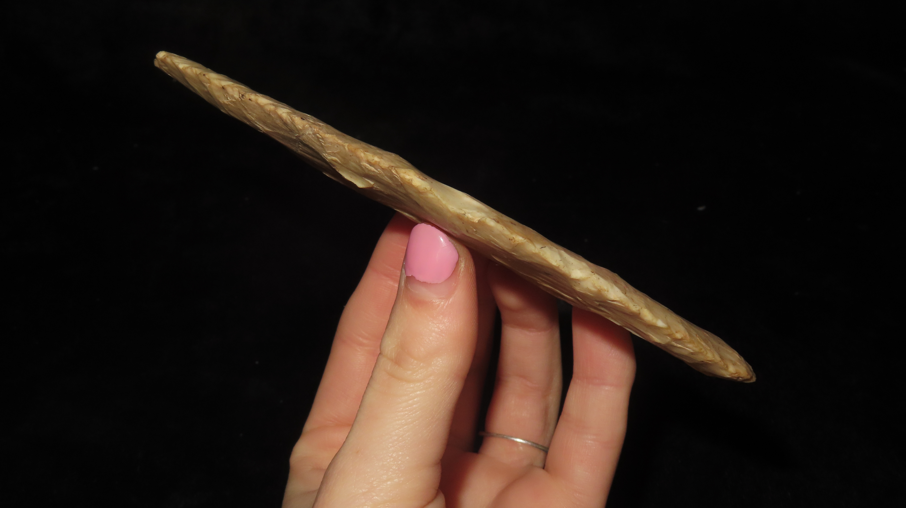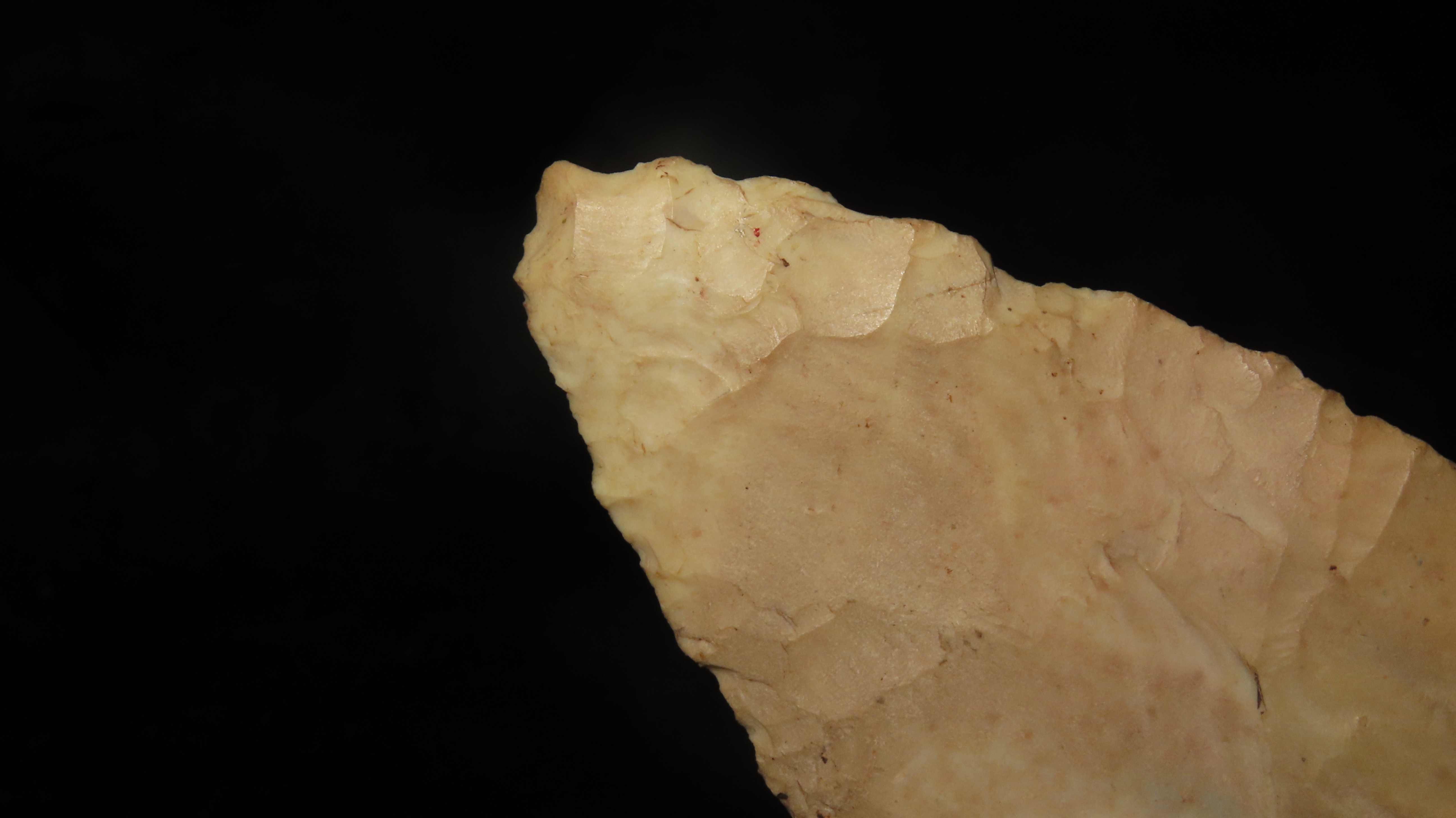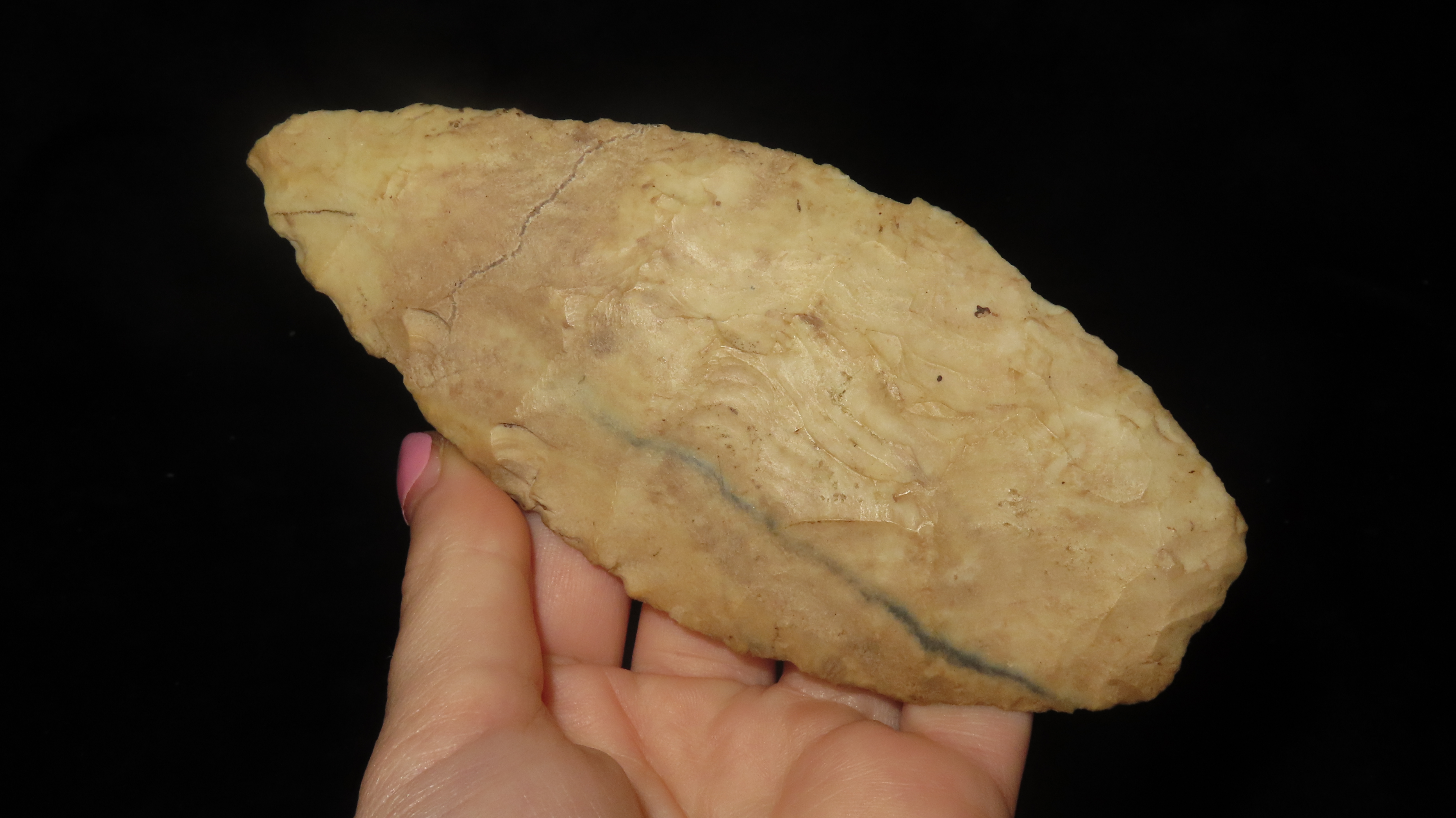 5 1/4″ x 2 3/8″ Knife Blade, Found in Adams Co. Illinois by Art Lepper on his farm south of Quincy, Illinois, Right above Mill Creek. Bought from his wife in 1989. Ex. Herb Mangold Collection