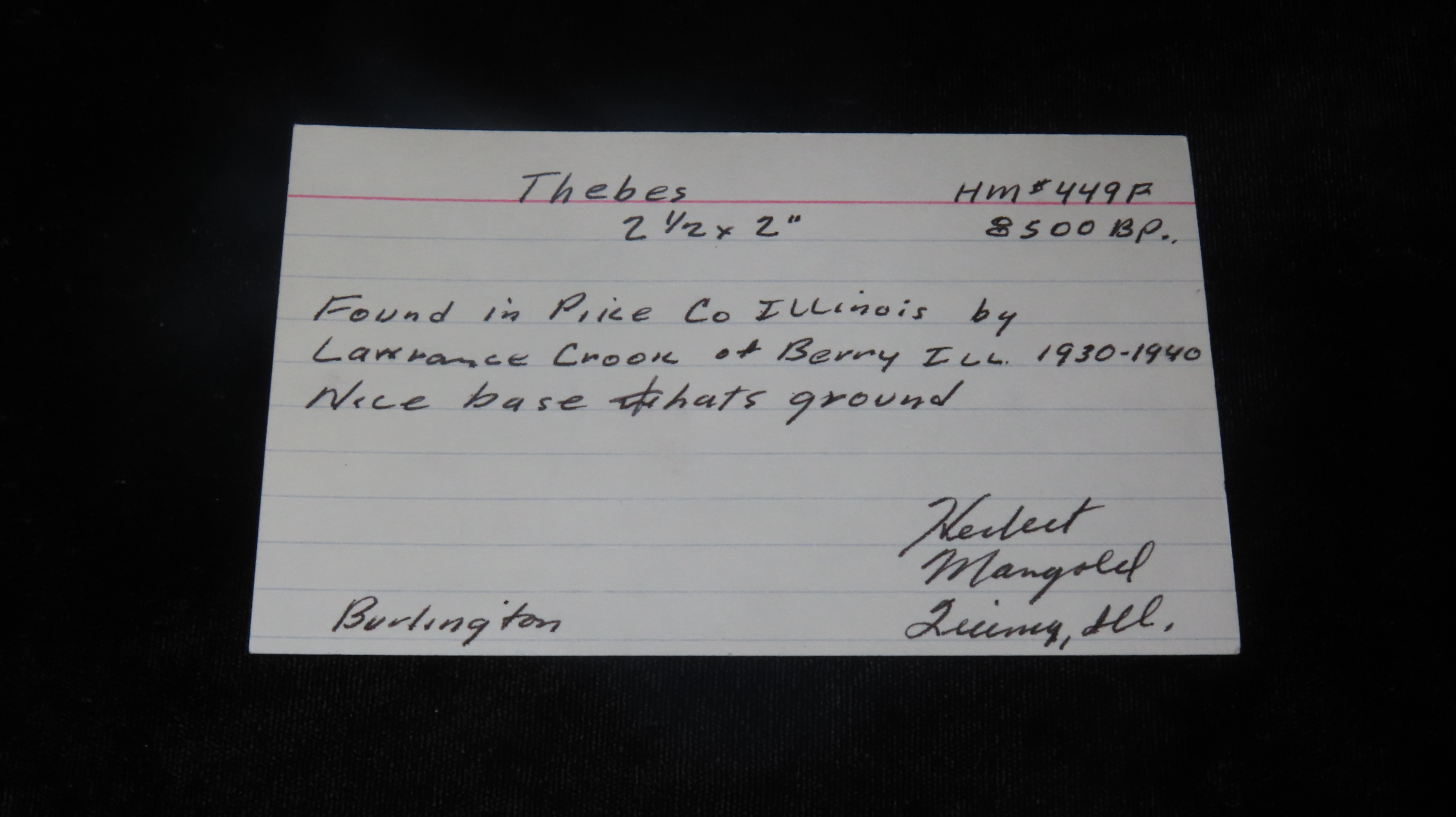 2 1/2″ x 2″ Thebes, Found in Pike Co. Illinois by Lawrance Crook of Berry Illinois sometime between 1930-1940. Nice ground base. Ex. Herb Mangold Collection