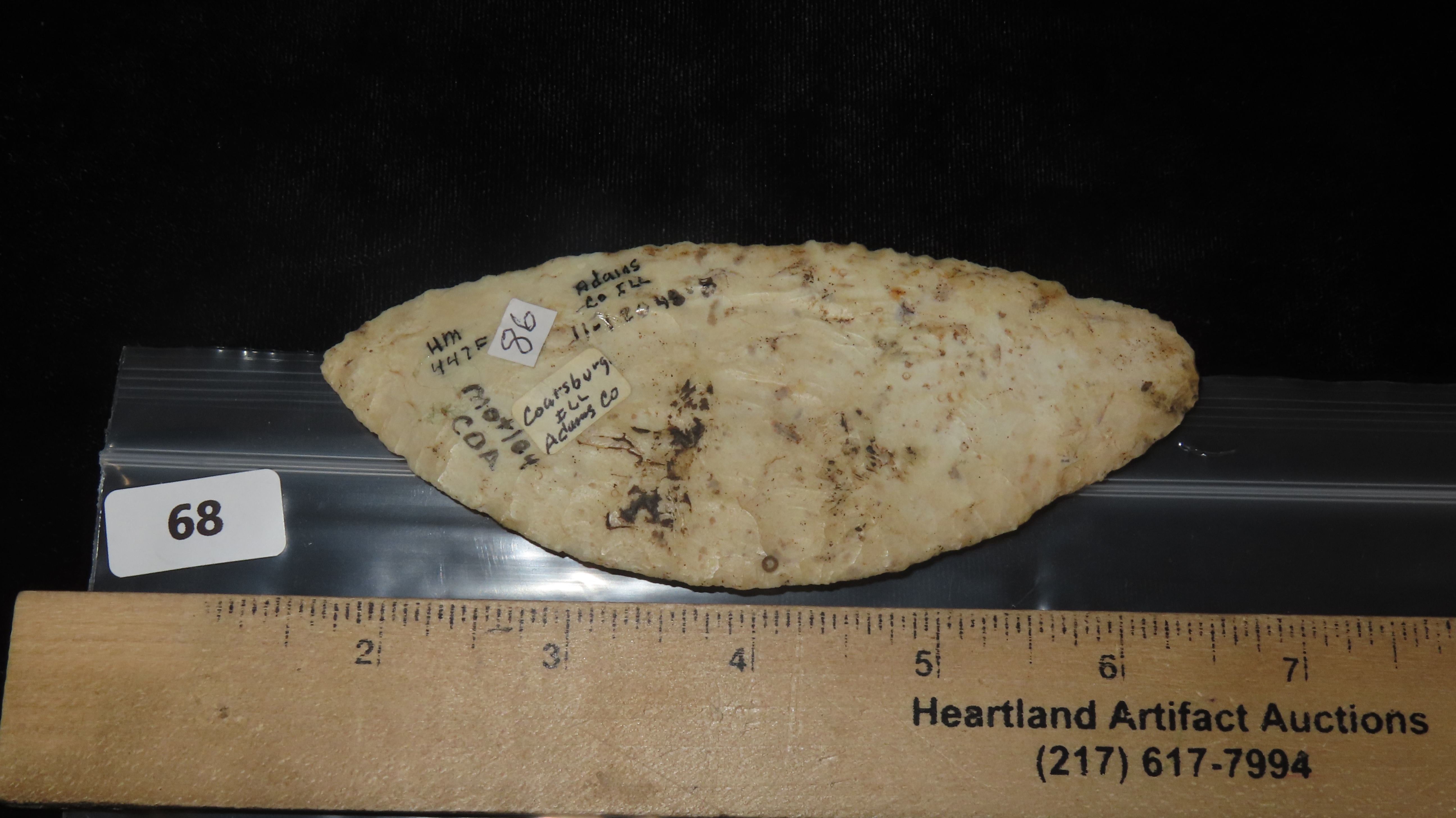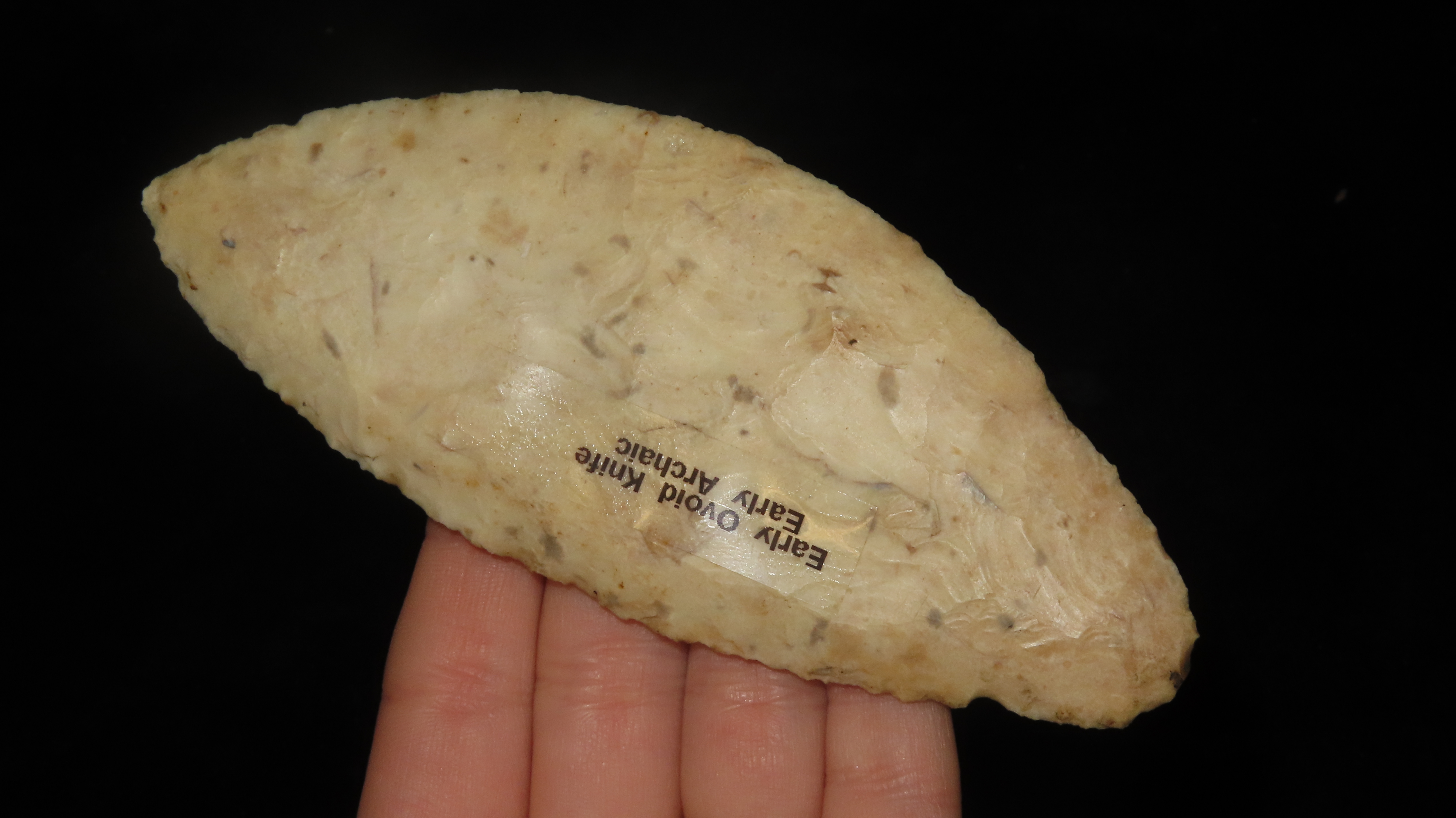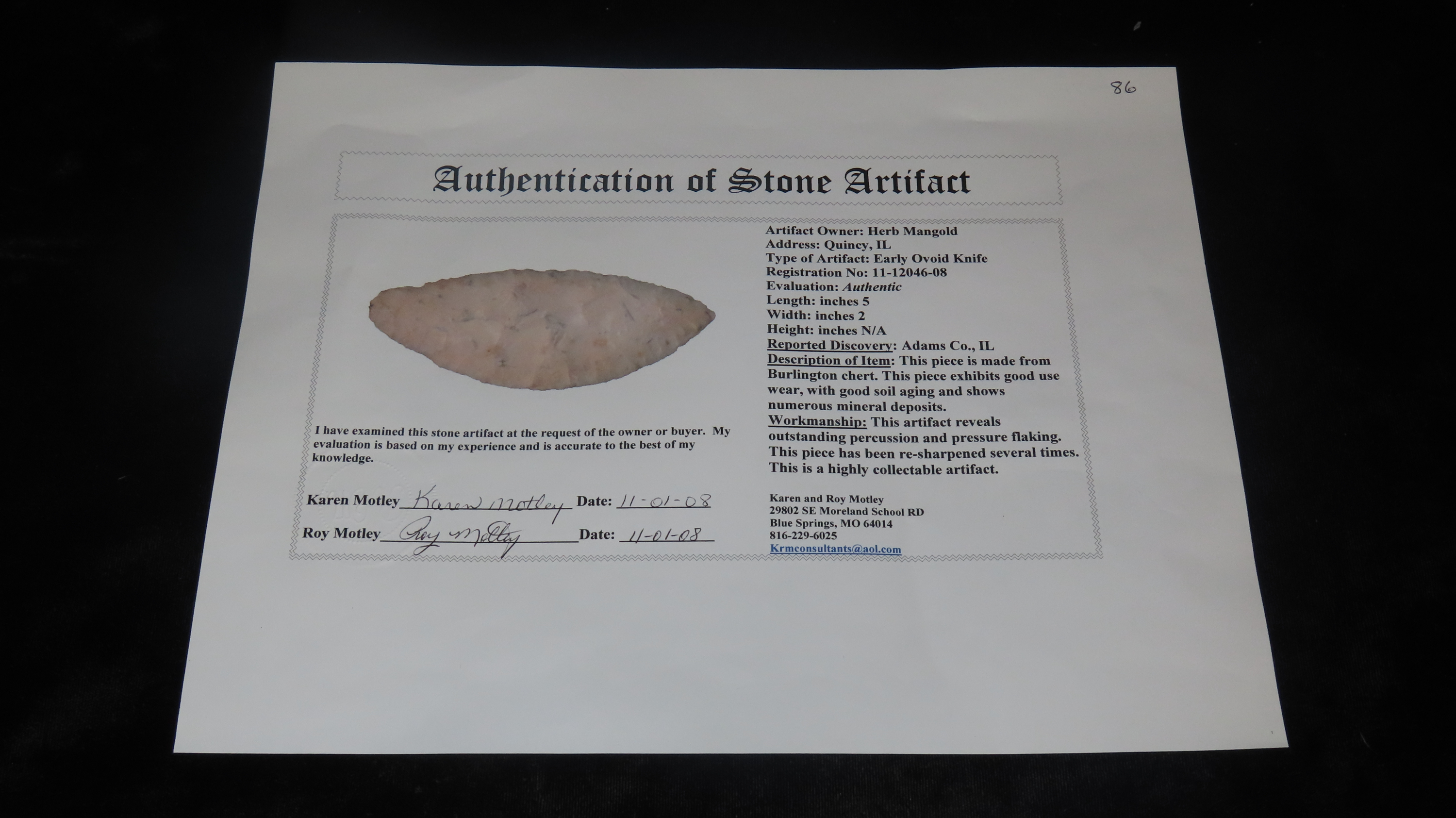 5″ x 2″ Ovoid Knife, Motley COA, Found in Adams Co. Illinois, Made of Burlington Chert. Ex. Herb Mangold Collection