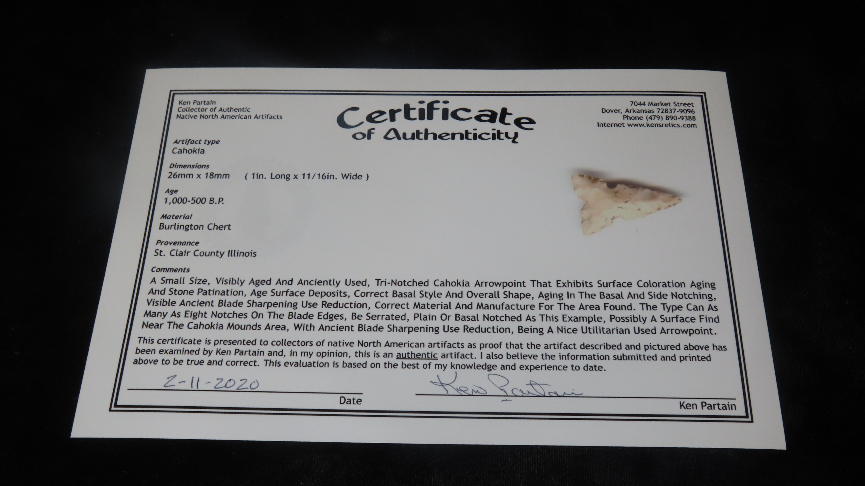 1 1/4″ x 9/16″ Cahokia, Partain COA, Found in St. Clair Co. Illinois, Ex. James Hinson Collection