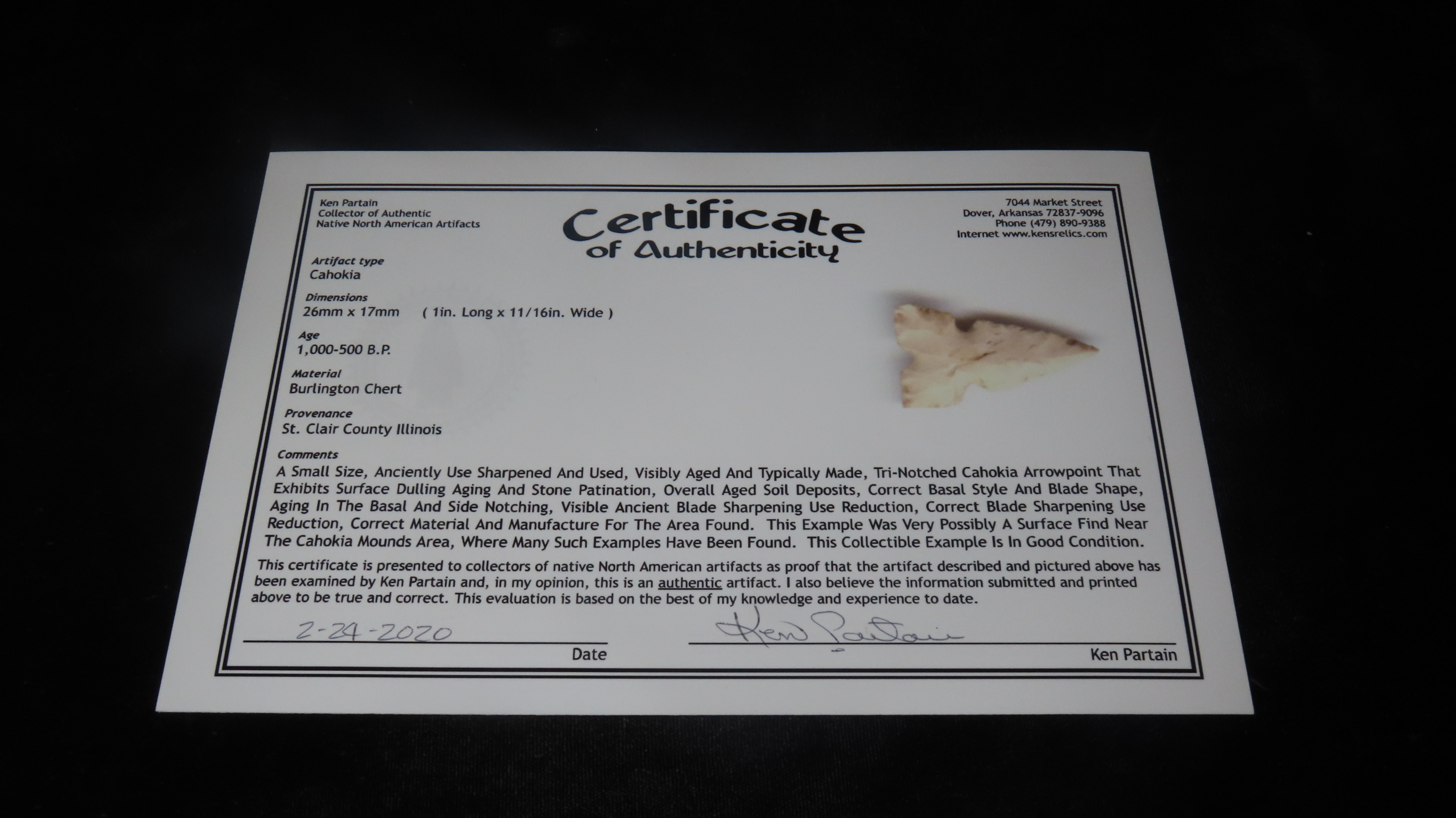 1″ x 11/16″ Cahokia, Partain COA, Found in St. Clair Co. Illinois, Burlington Chert, Ex. James Hinson Collection