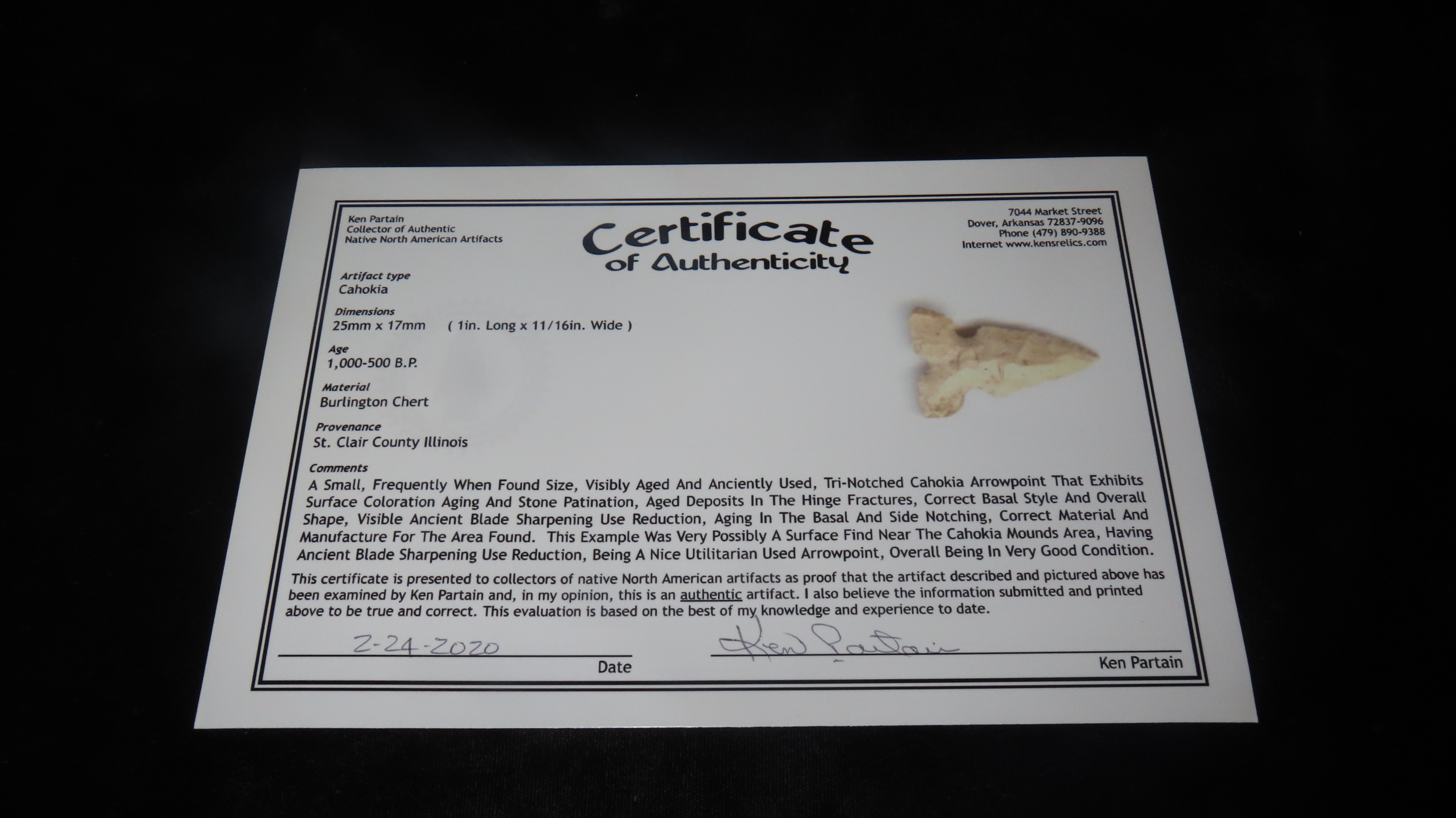 1″ x 11/16″ Cahokia, Partain COA, Found in St. Clair Co. Illinois, Burlington Chert, Ex. James Hinson Collection