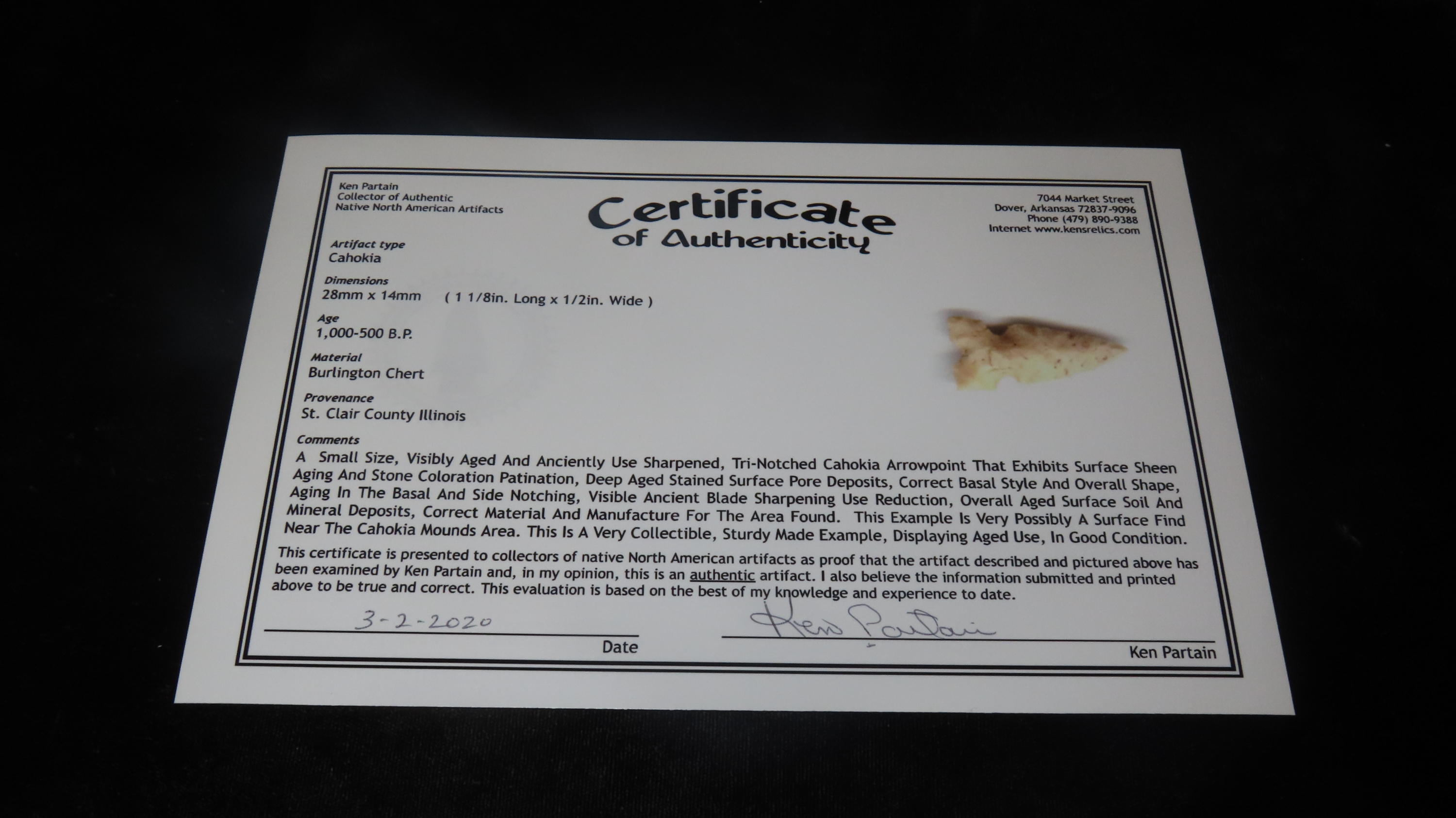 1″ x 11/16″ Cahokia, Partain COA, Found in St. Clair Co. Illinois, Burlington Chert, Ex. James Hinson Collection