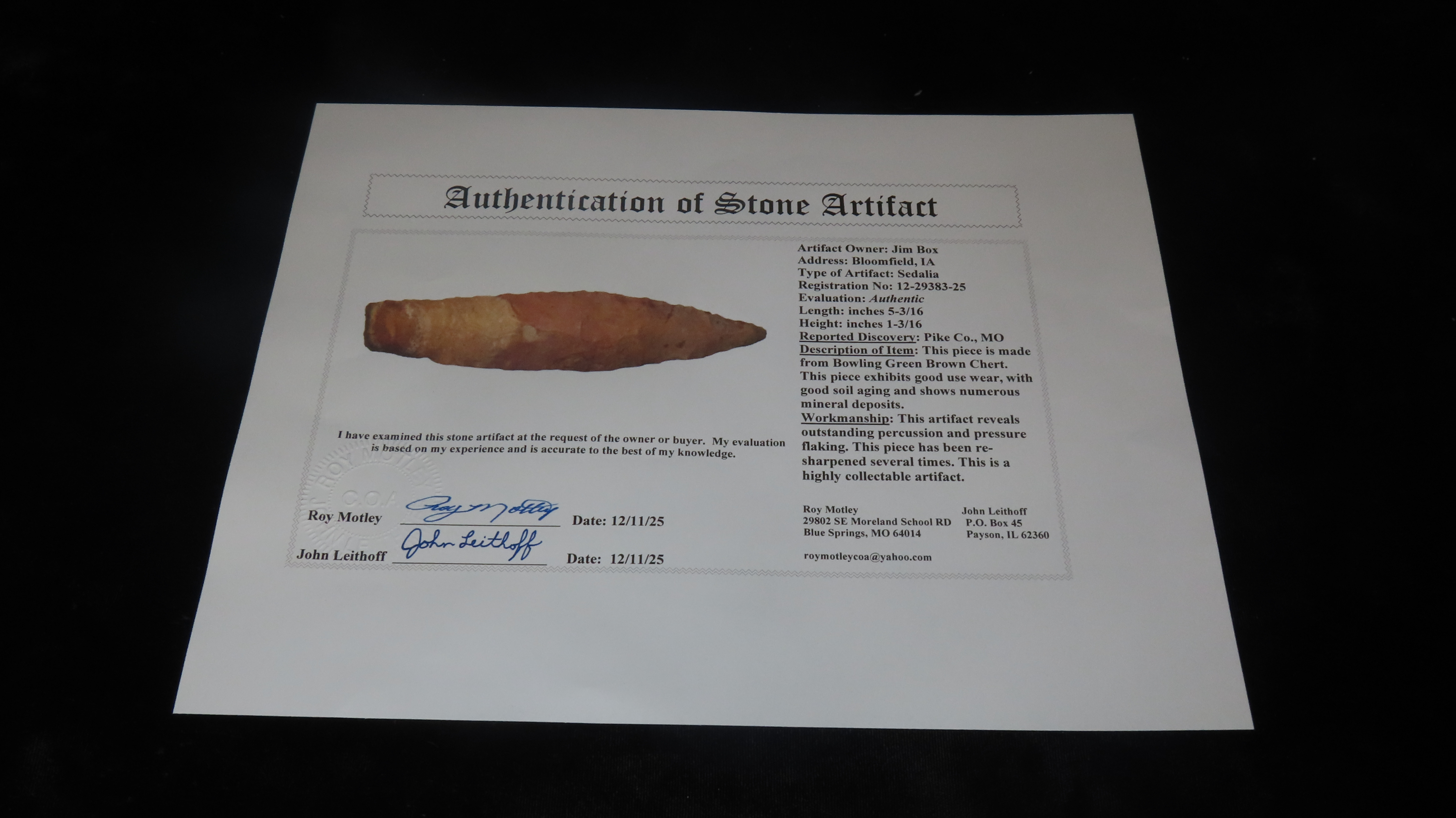 5 3/16″ x 1 3/16″ Sedalia, Motley COA, Found in Pike Co., Missouri, Made of Bowling Green Brown Chert