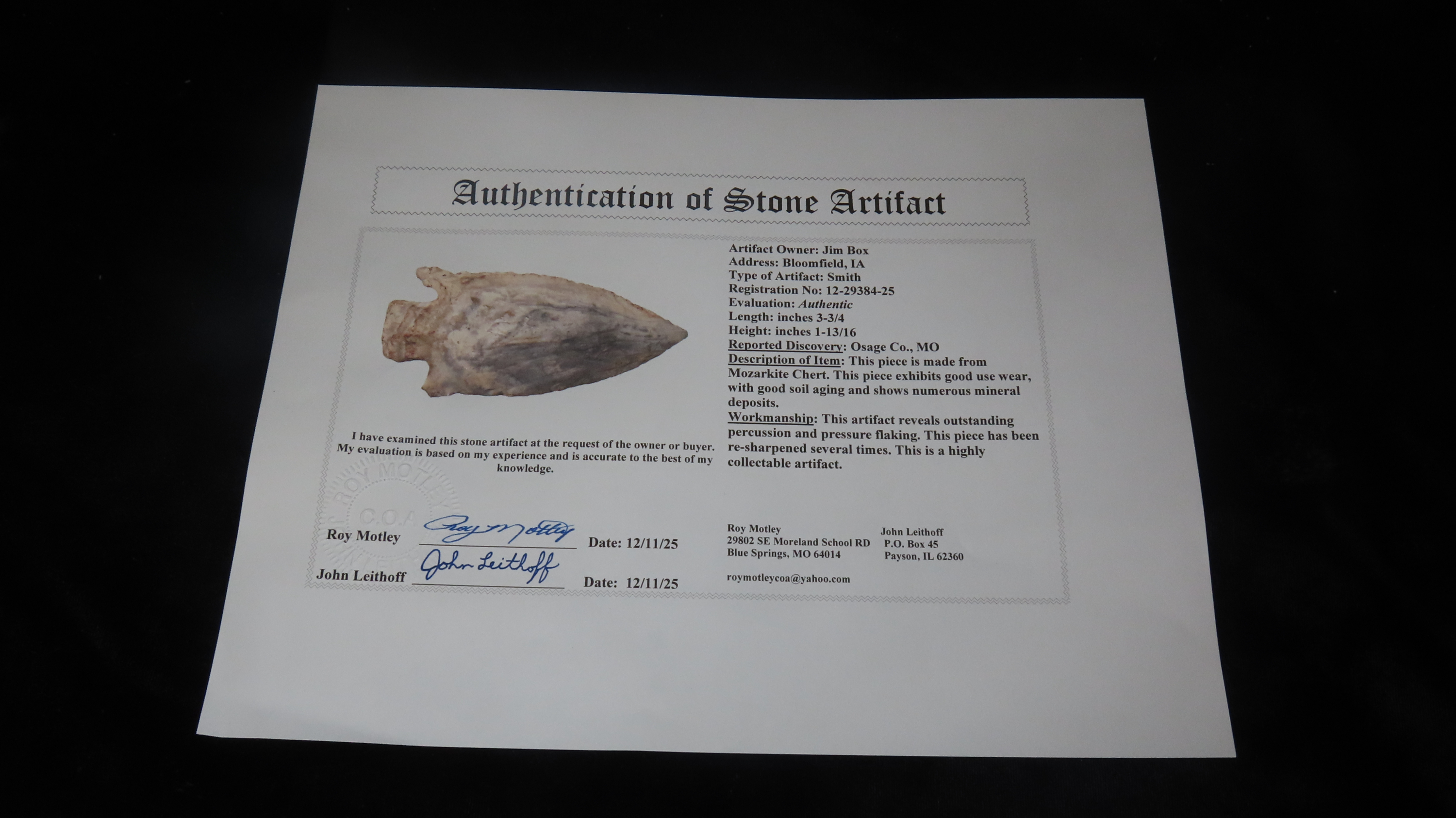 3 3/4″ x 1 13/16″ Smith, Motley COA, Found in Osage Co., Missouri, Made of Mozarkite