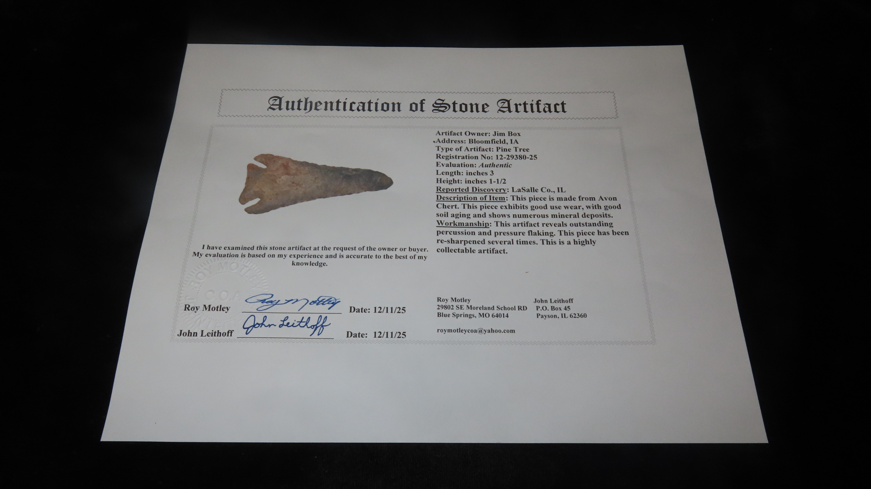 3″ x 1 1/2″ Pine Tree, Motley COA, Found in LaSalle Co., Illinois, Made of Avon Chert