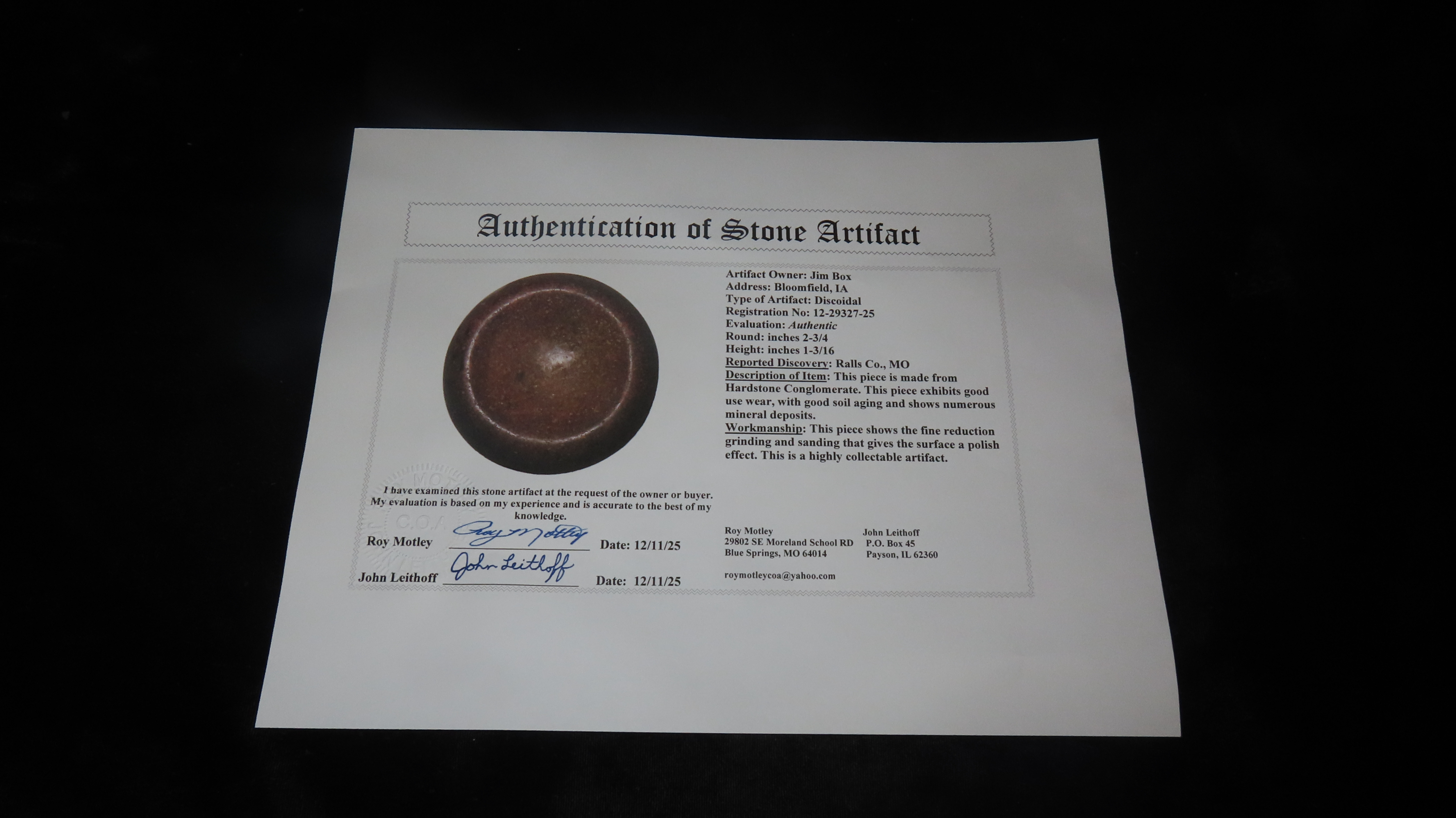2 3/4″ x 1 3/16″ Discoidal, Motley COA, Found in Ralls Co., Missouri