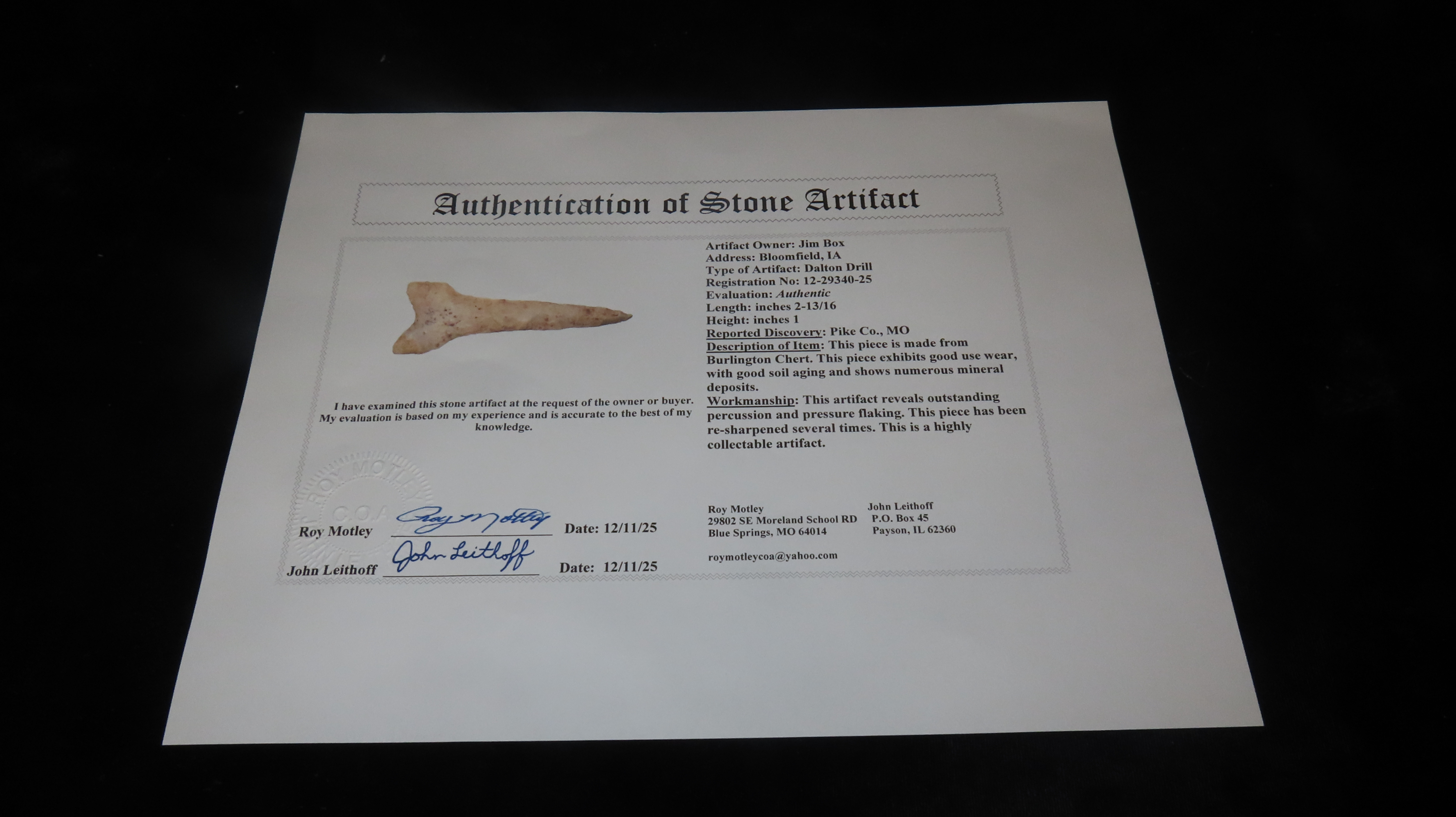 2 13/16″ x 1″ Dalton Drill, Motley COA, Found in Pike Co., Missouri