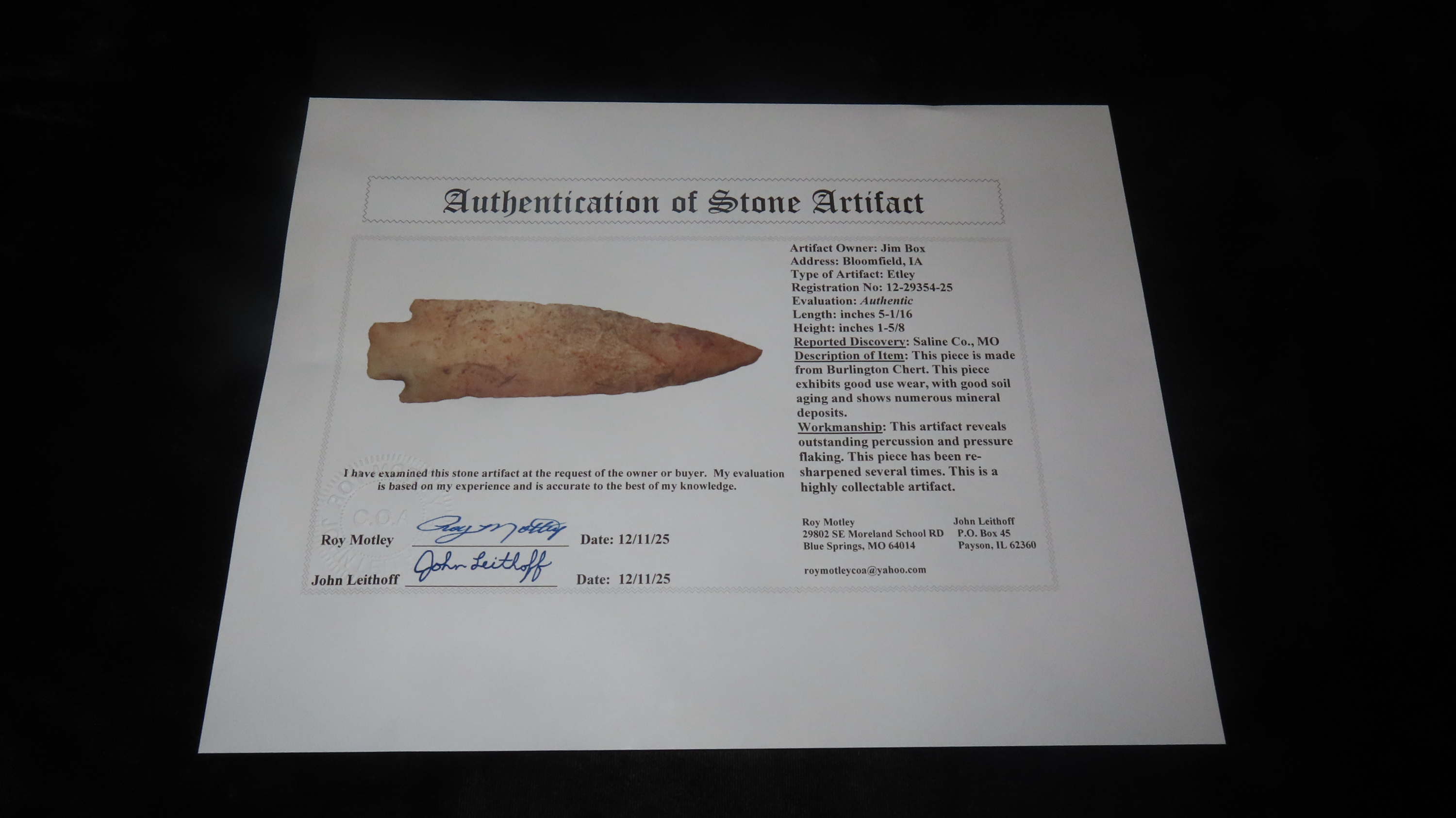 5 1/16″ x 1 5/8″ Etley, Motley COA, Found in Saline Co., Missouri