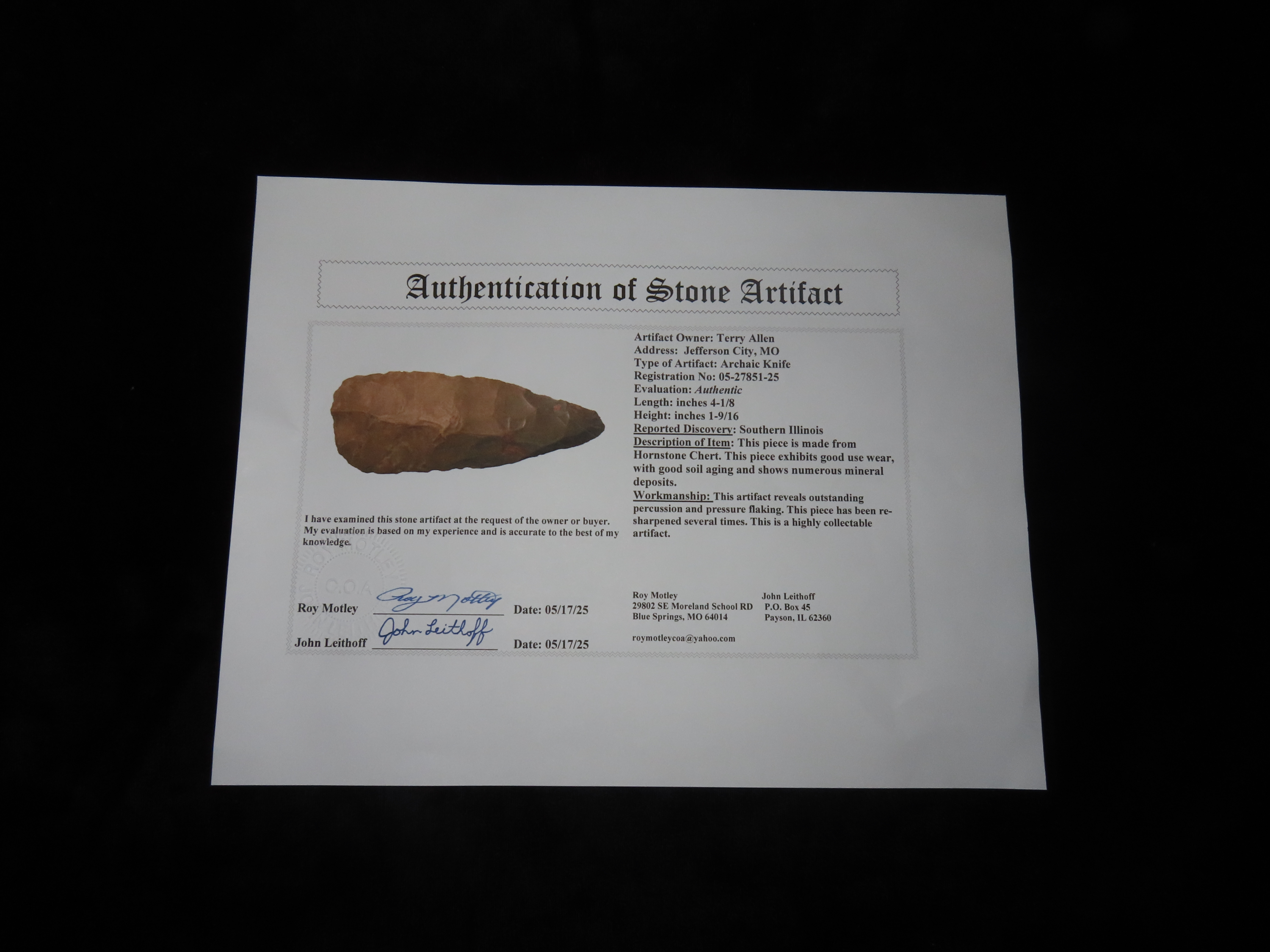 4 1/8″ x 1 9/16″ Archaic Knife, Hornstone Chert, Southern Illinois, Motley / Leithoff COA