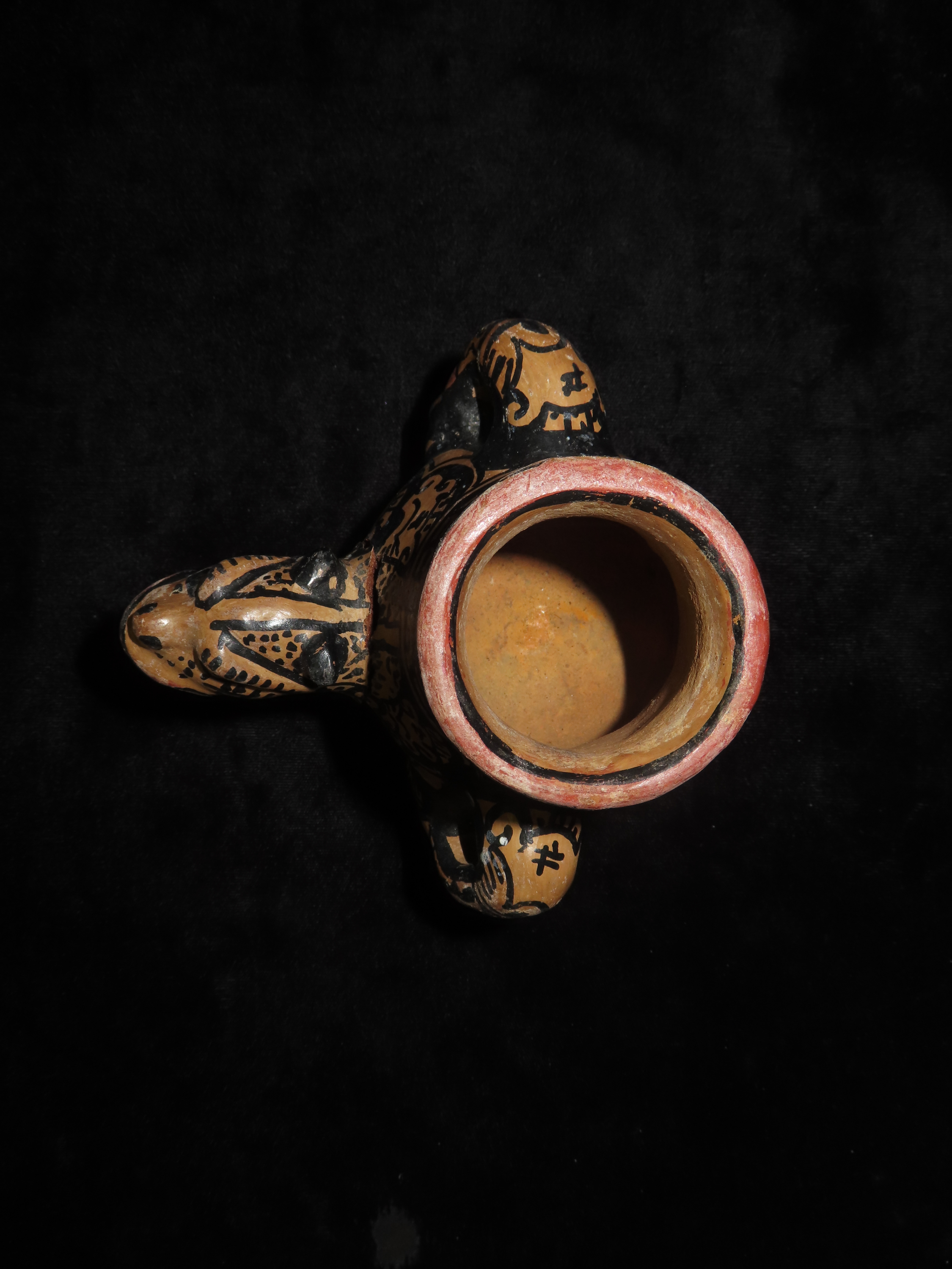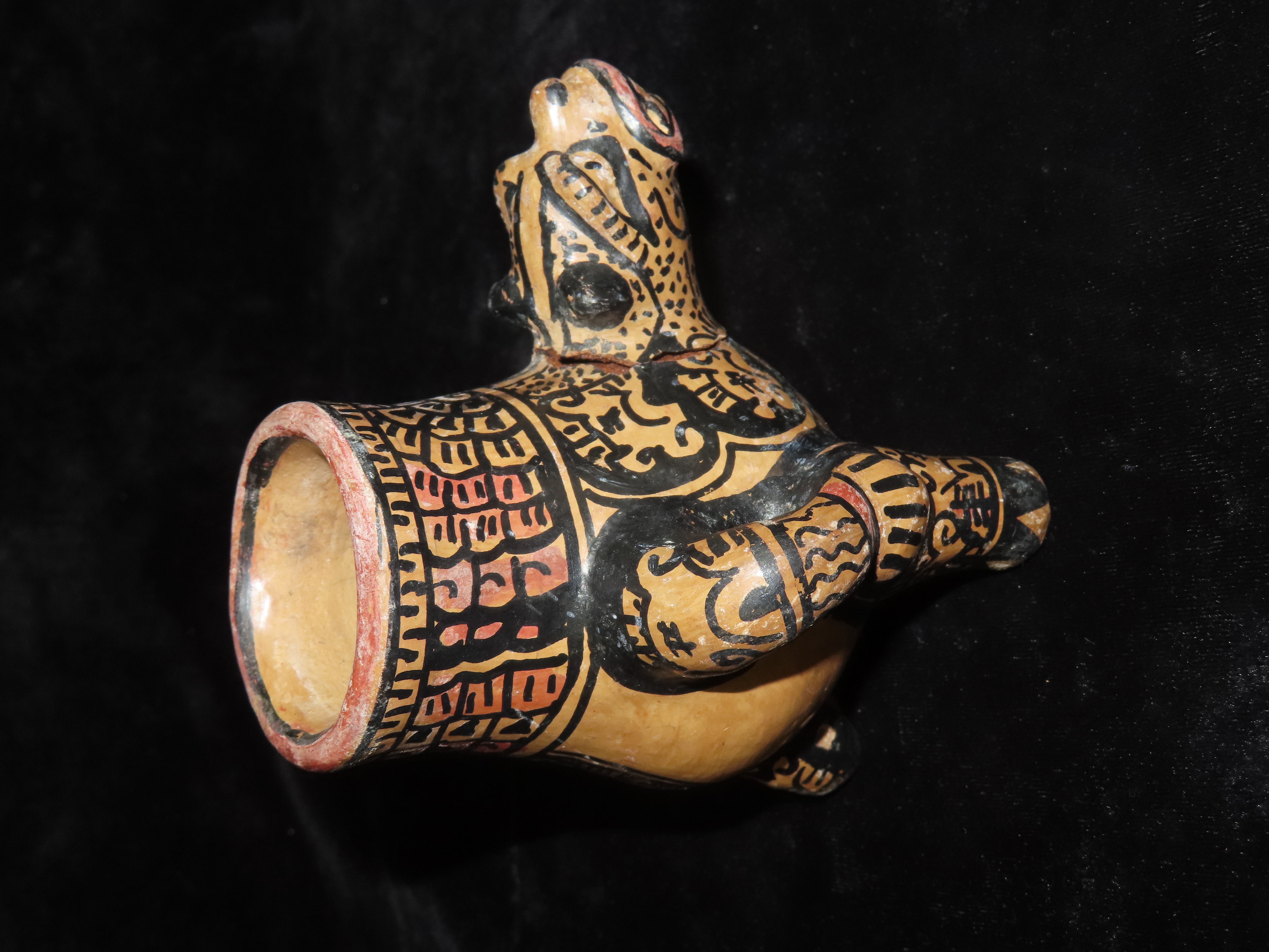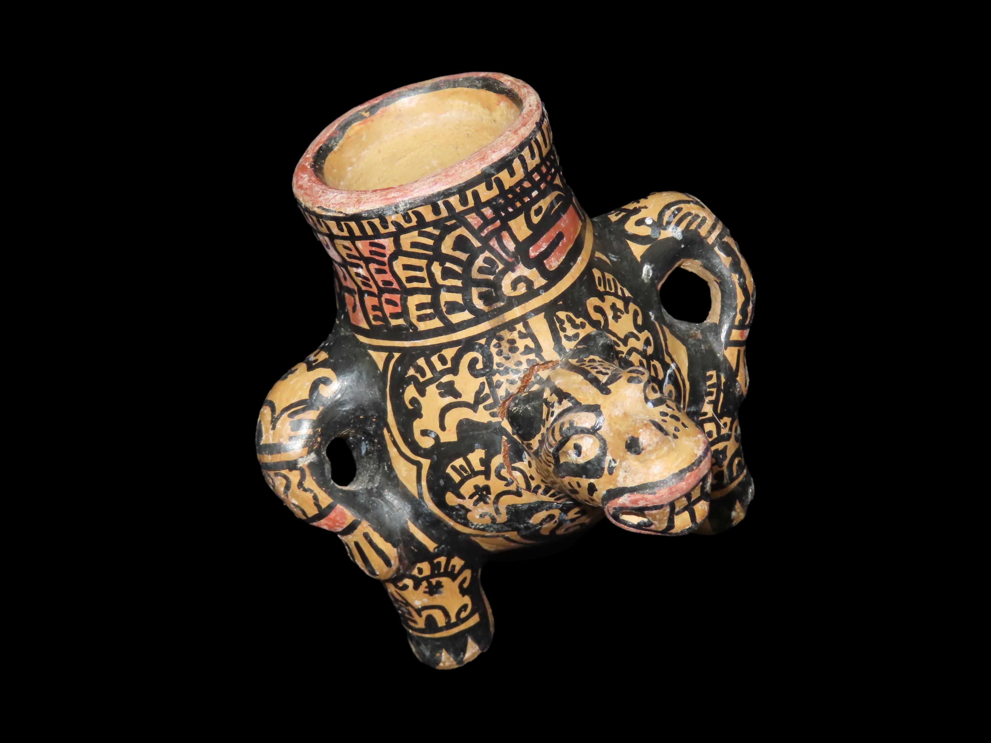 4 5/8″ Pre Columbian Jaguar effigy Pottery Vessel, Head is reattached. Wonderful paint, South America