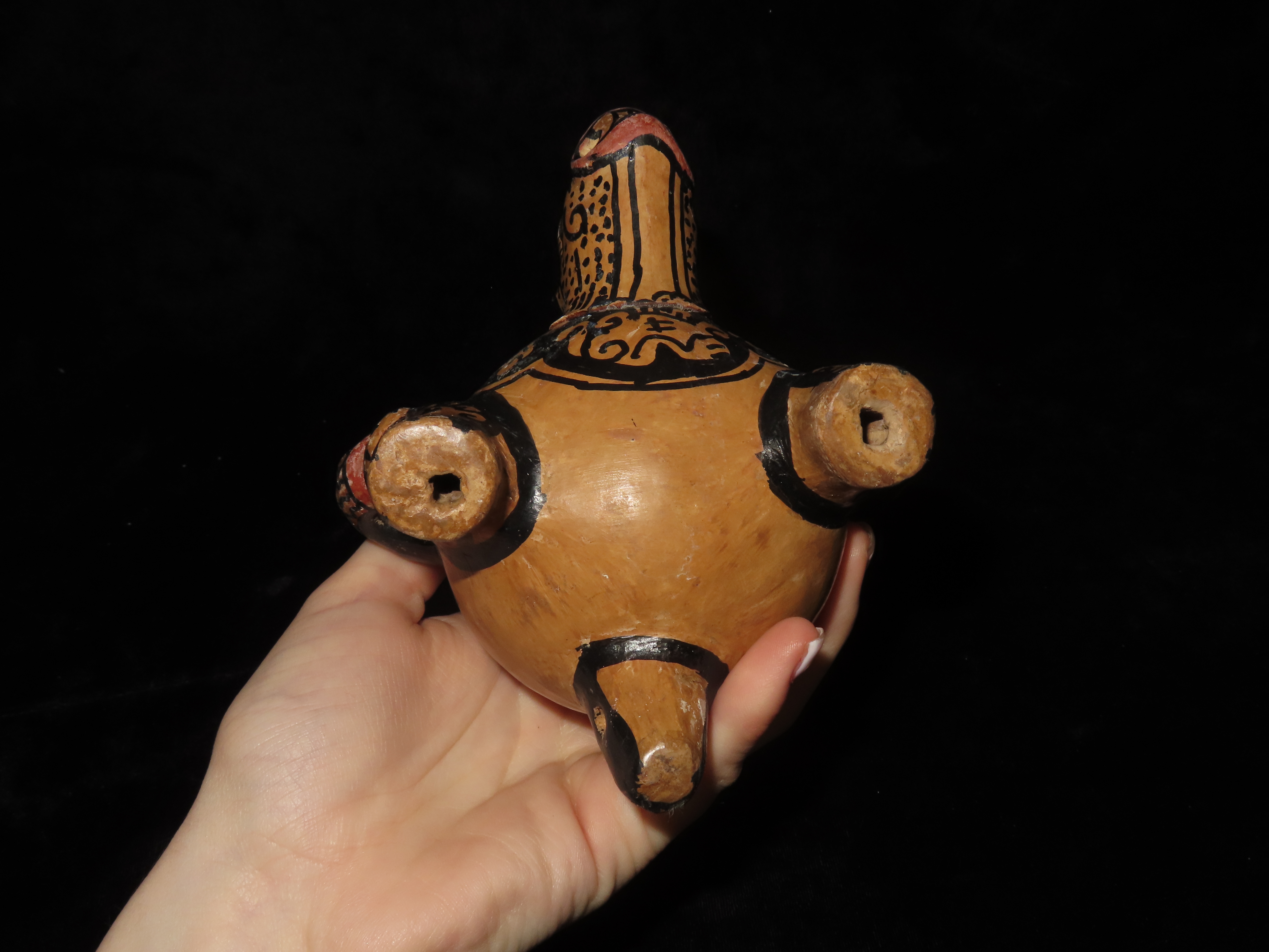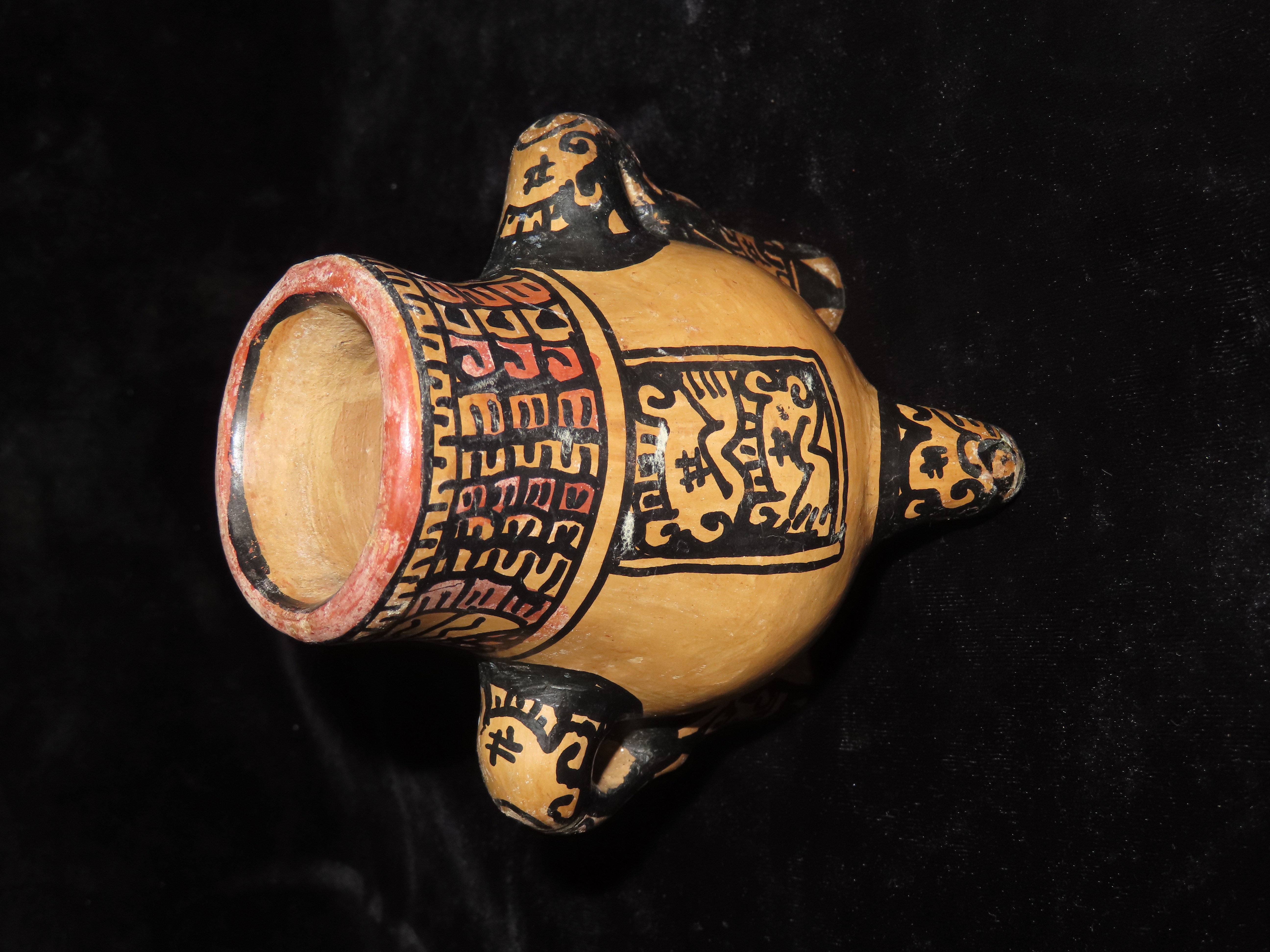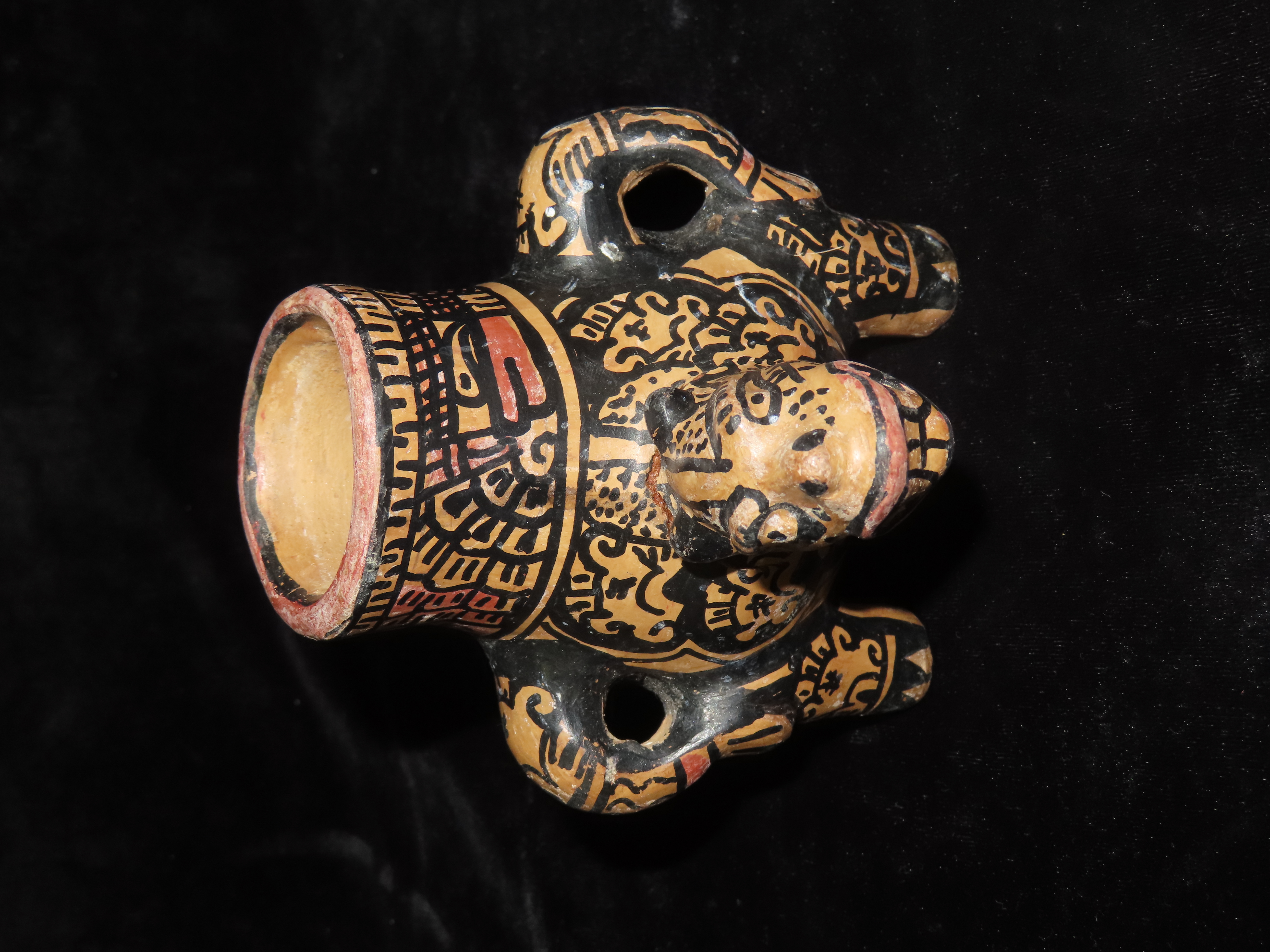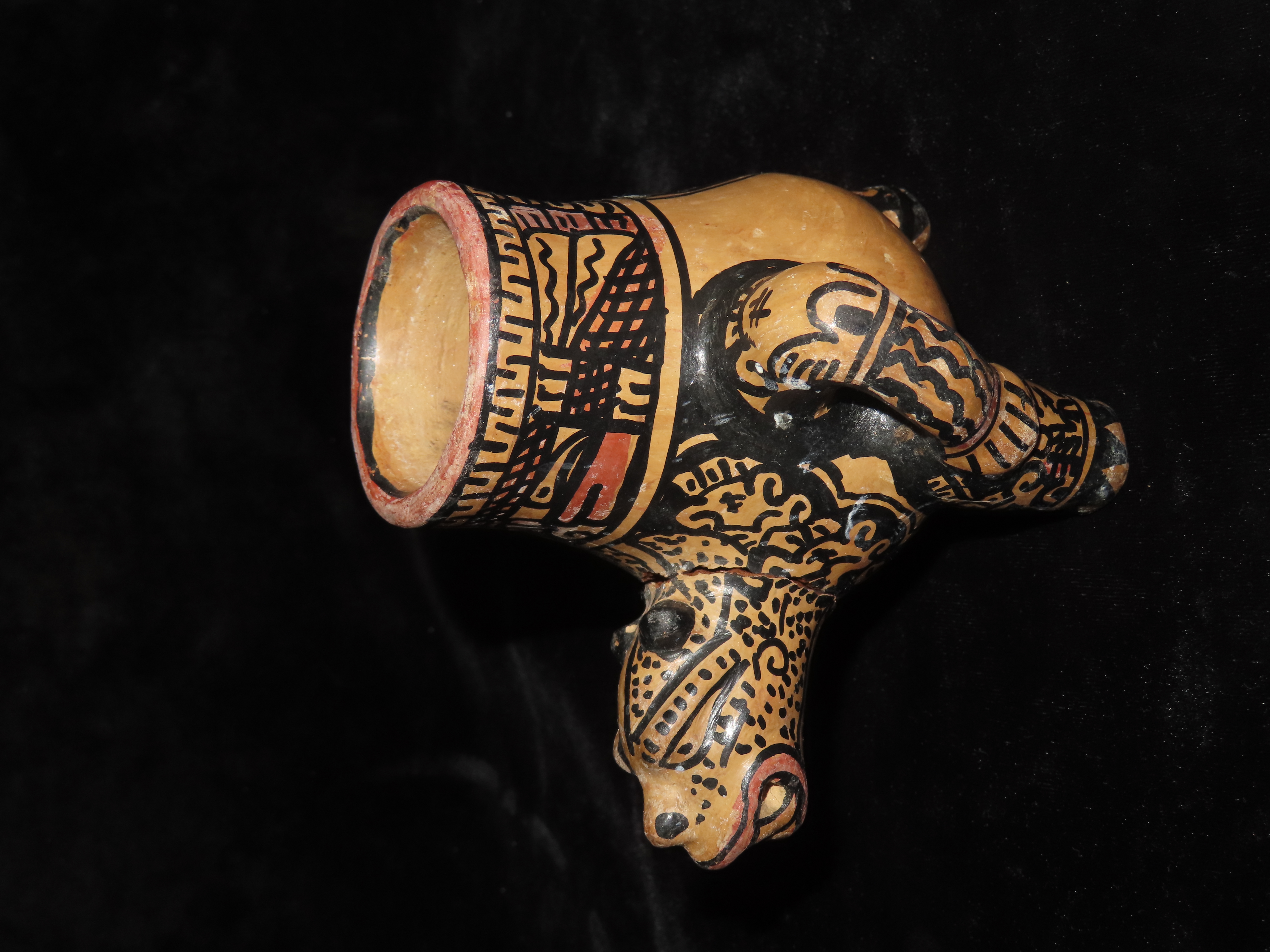 4 5/8″ Pre Columbian Jaguar effigy Pottery Vessel, Head is reattached. Wonderful paint, South America