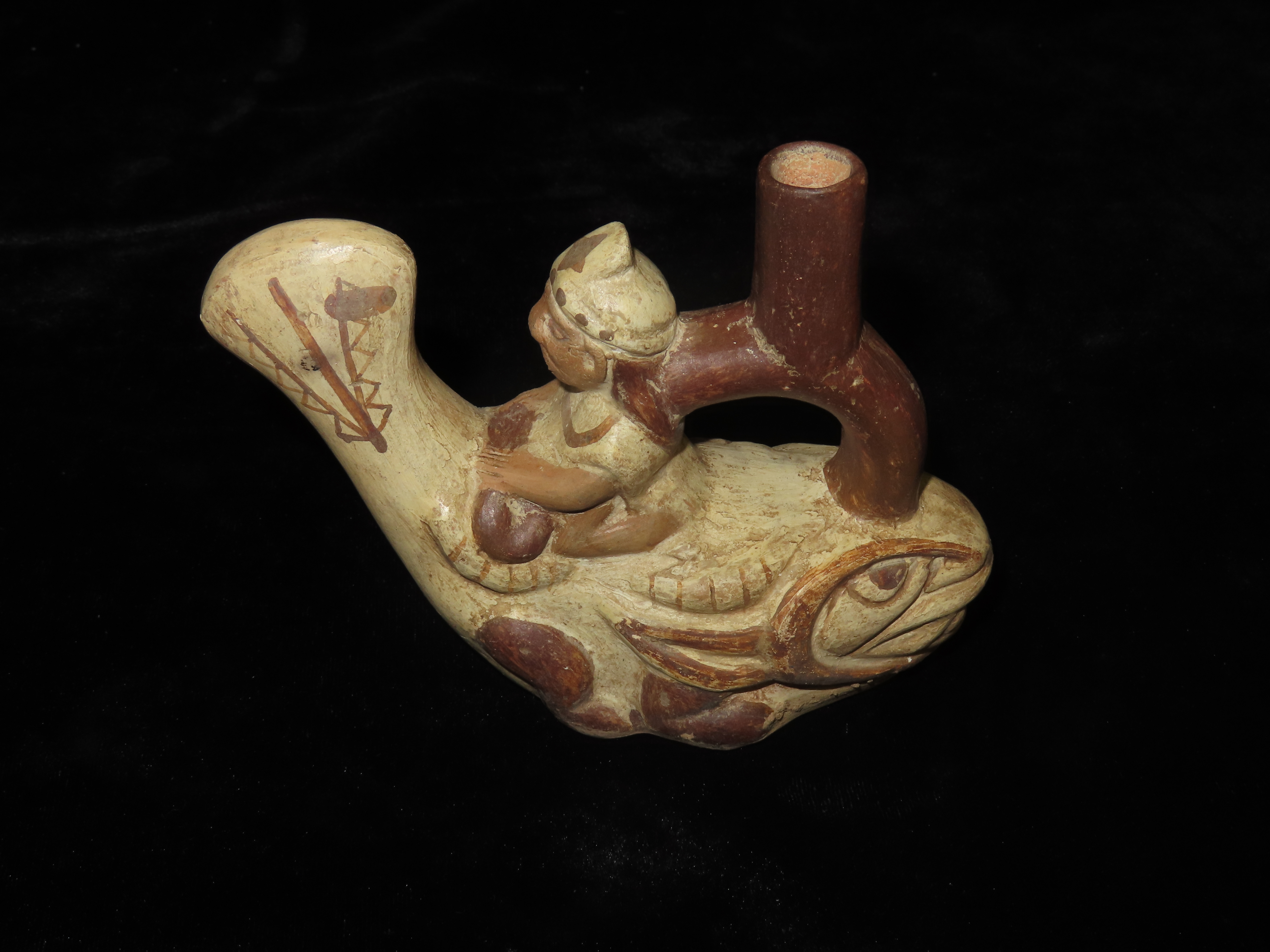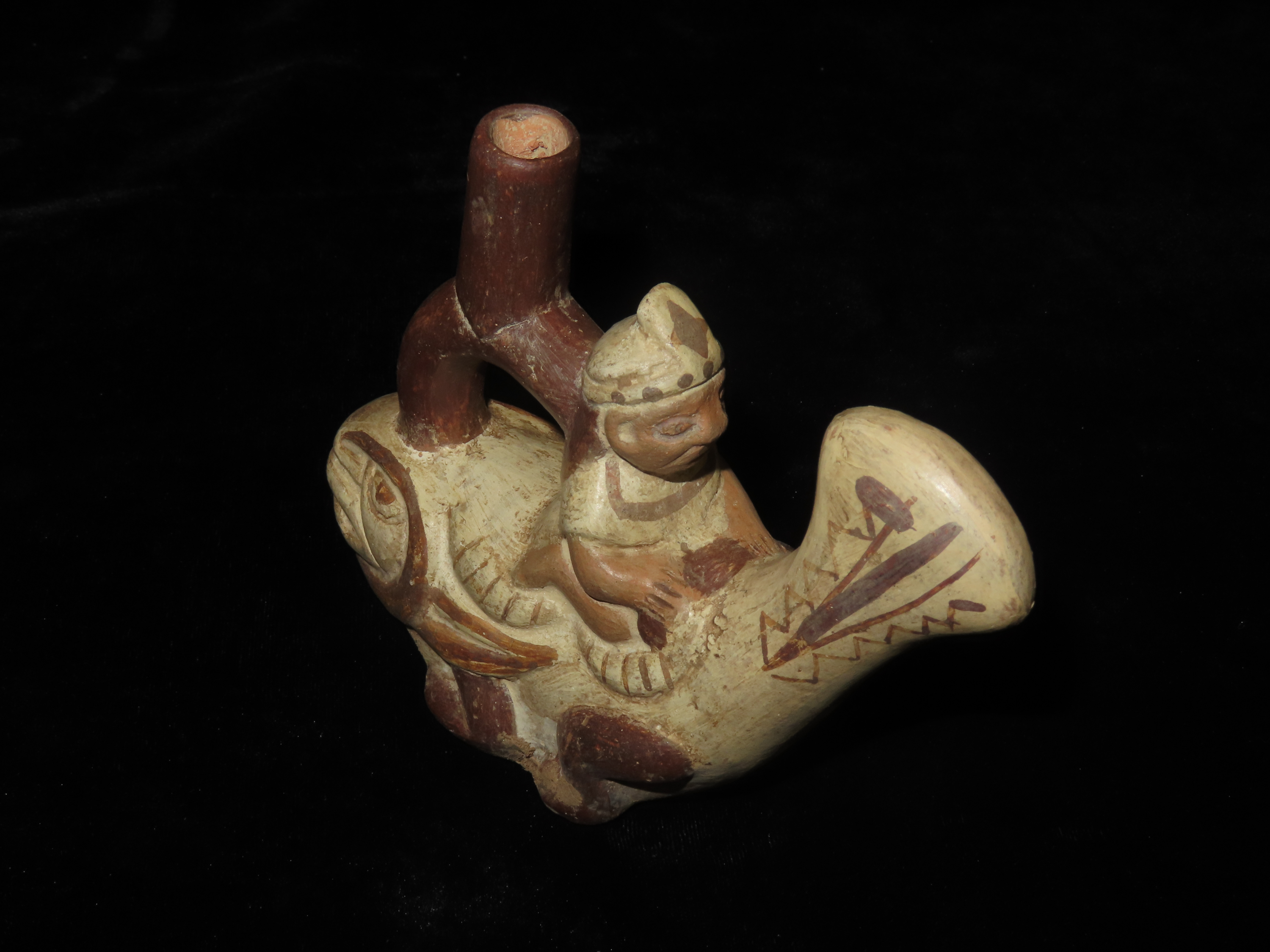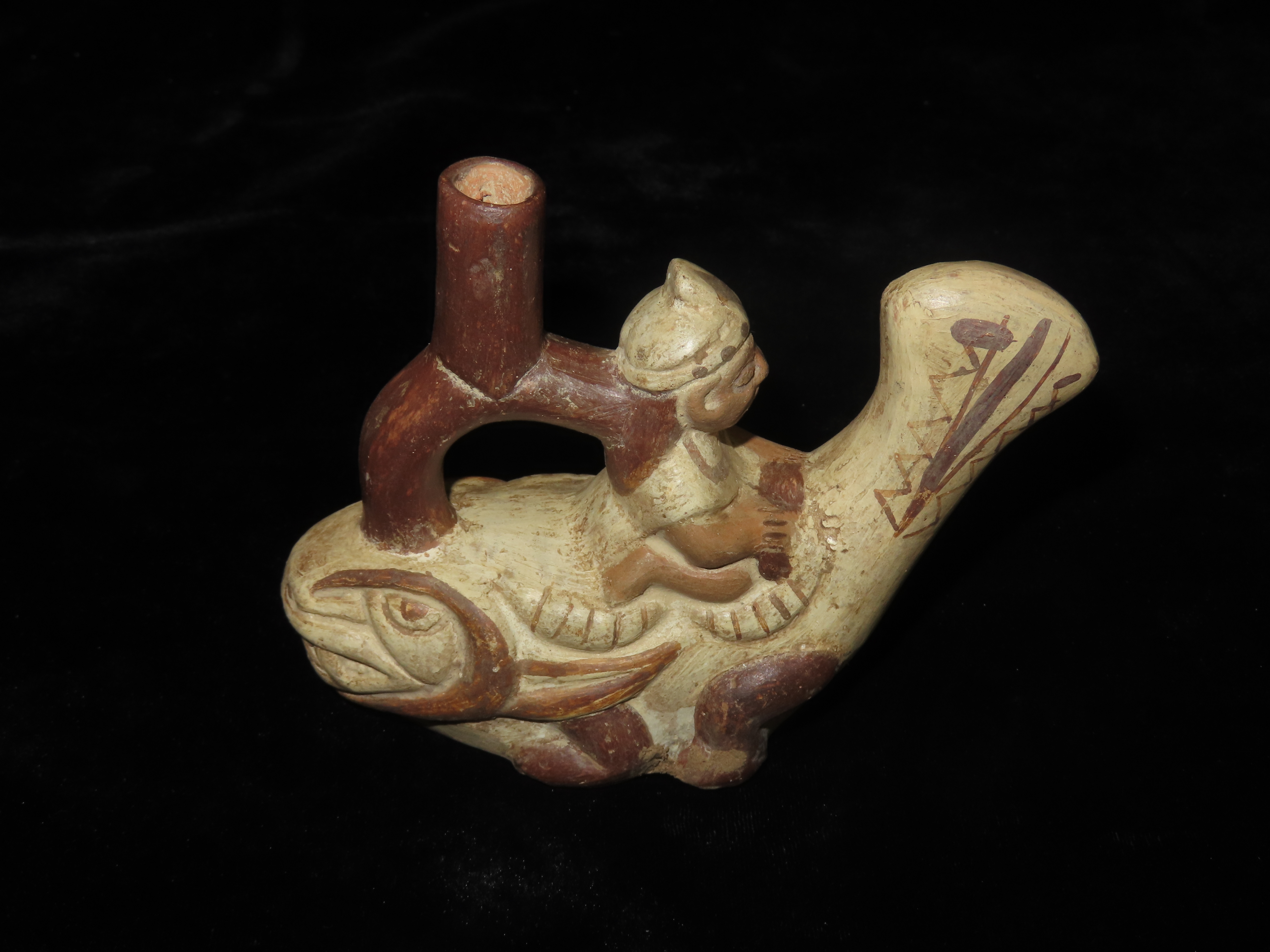 4 1/4″ Pre Columbian Stirrup Bottle, Great paint and effigy of human riding a fish. South America