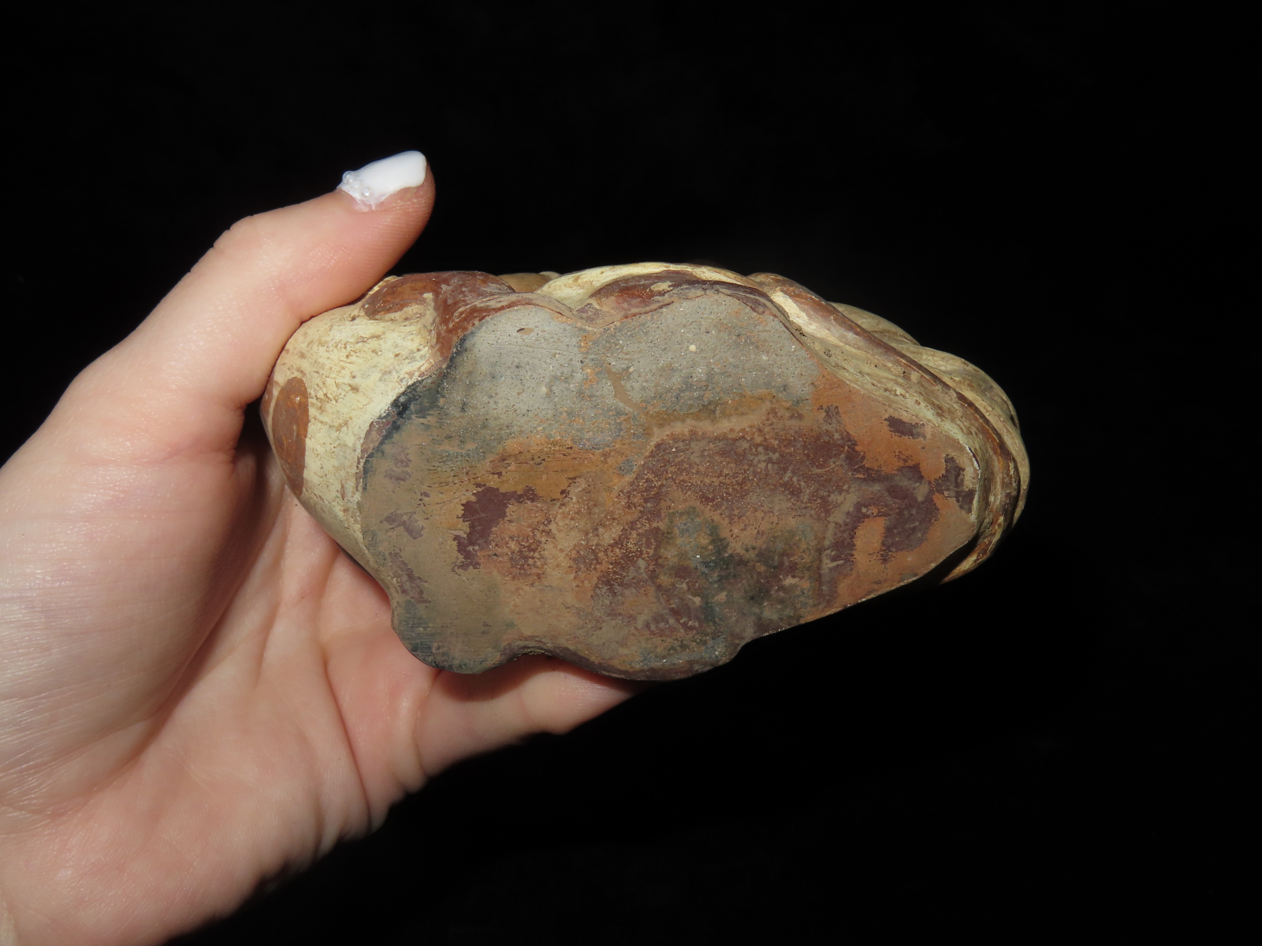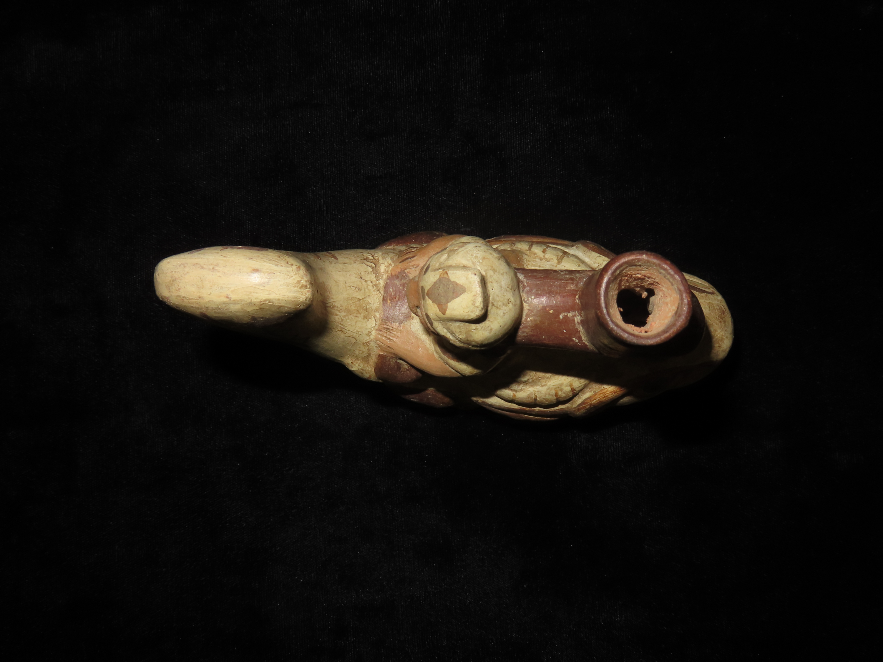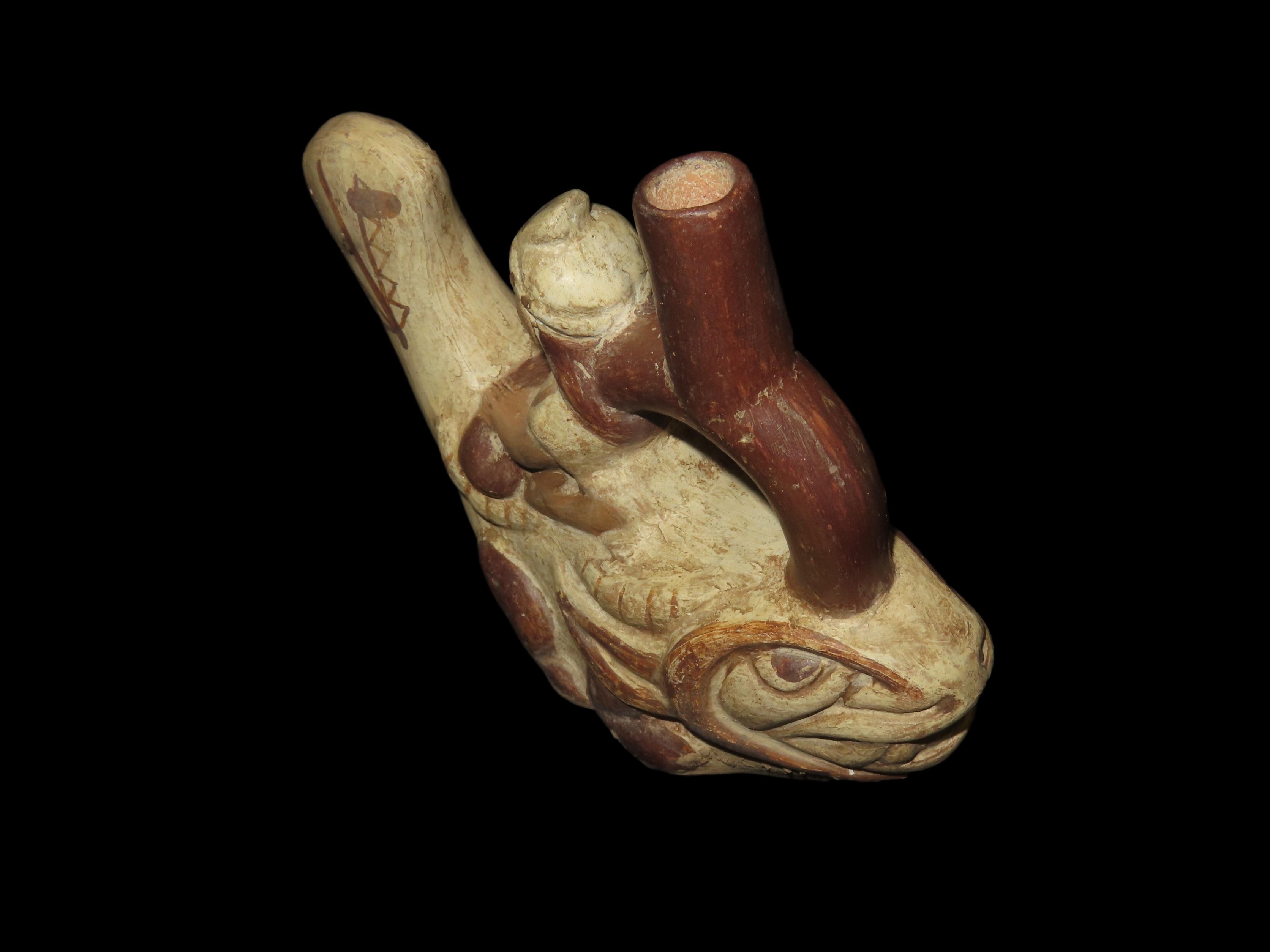 4 1/4″ Pre Columbian Stirrup Bottle, Great paint and effigy of human riding a fish. South America