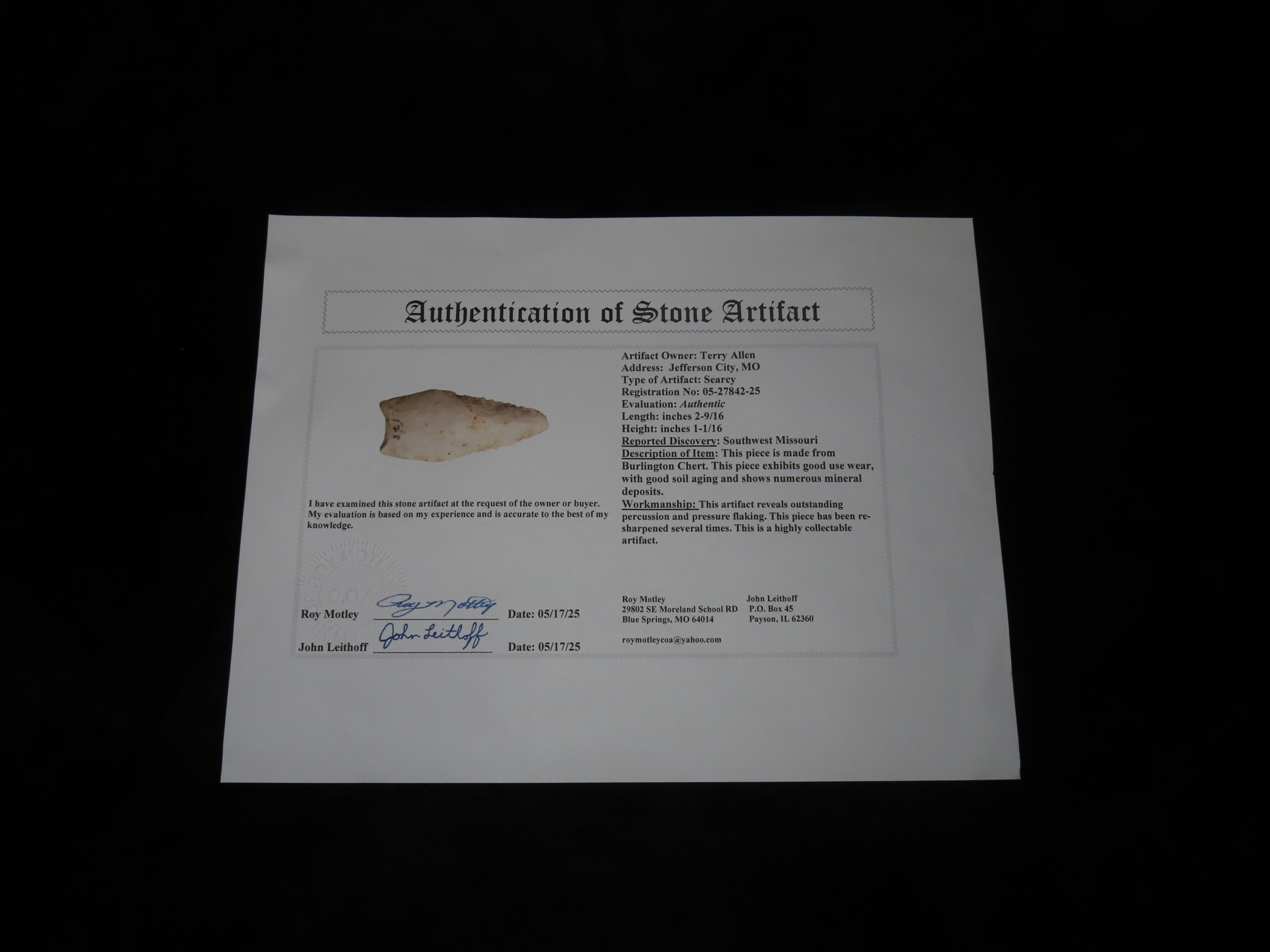 2 9/16" x 1 1/16" Searcy, Burlington Chert, Southwest Missouri, Motley / Leithoff COA