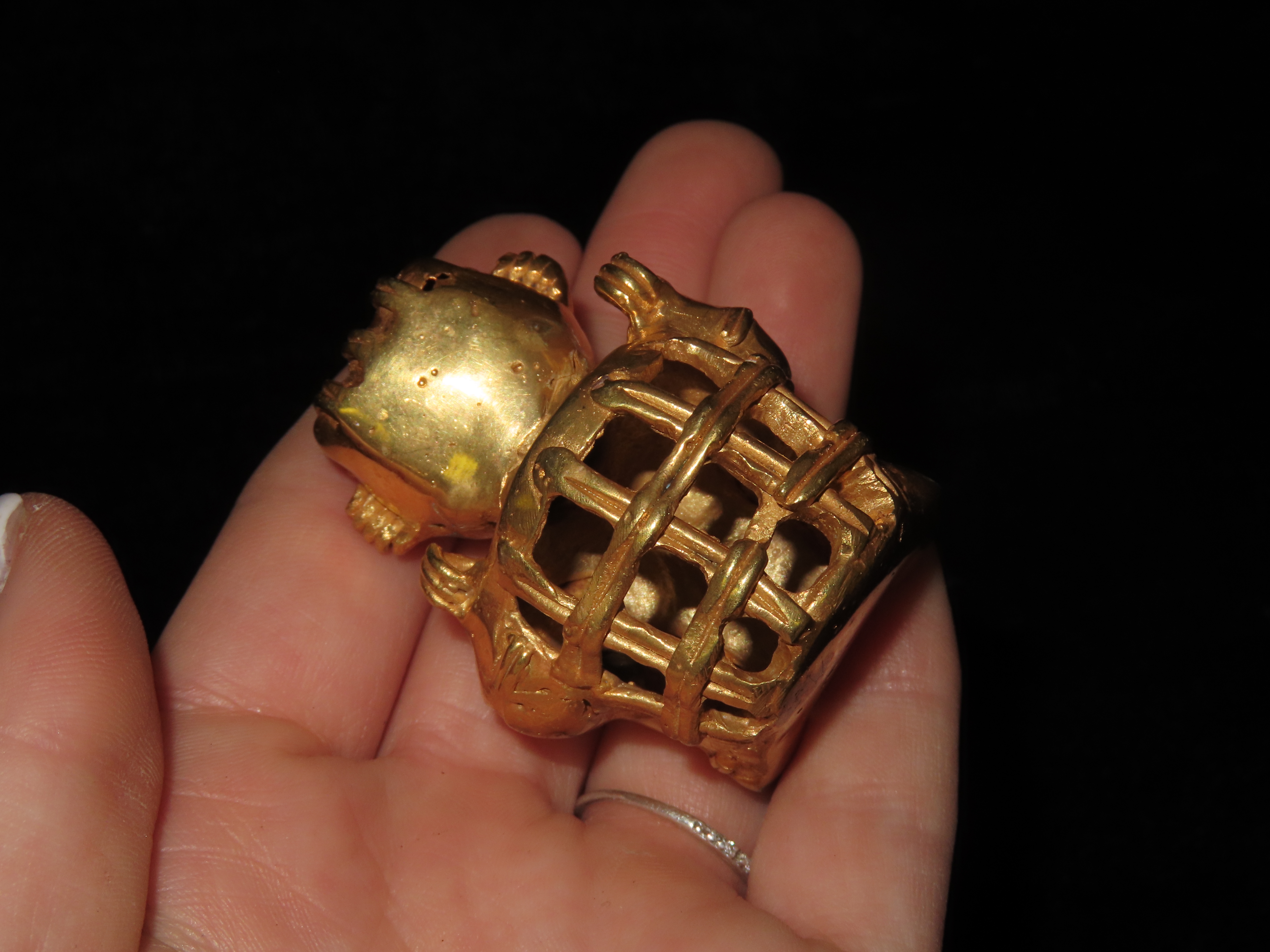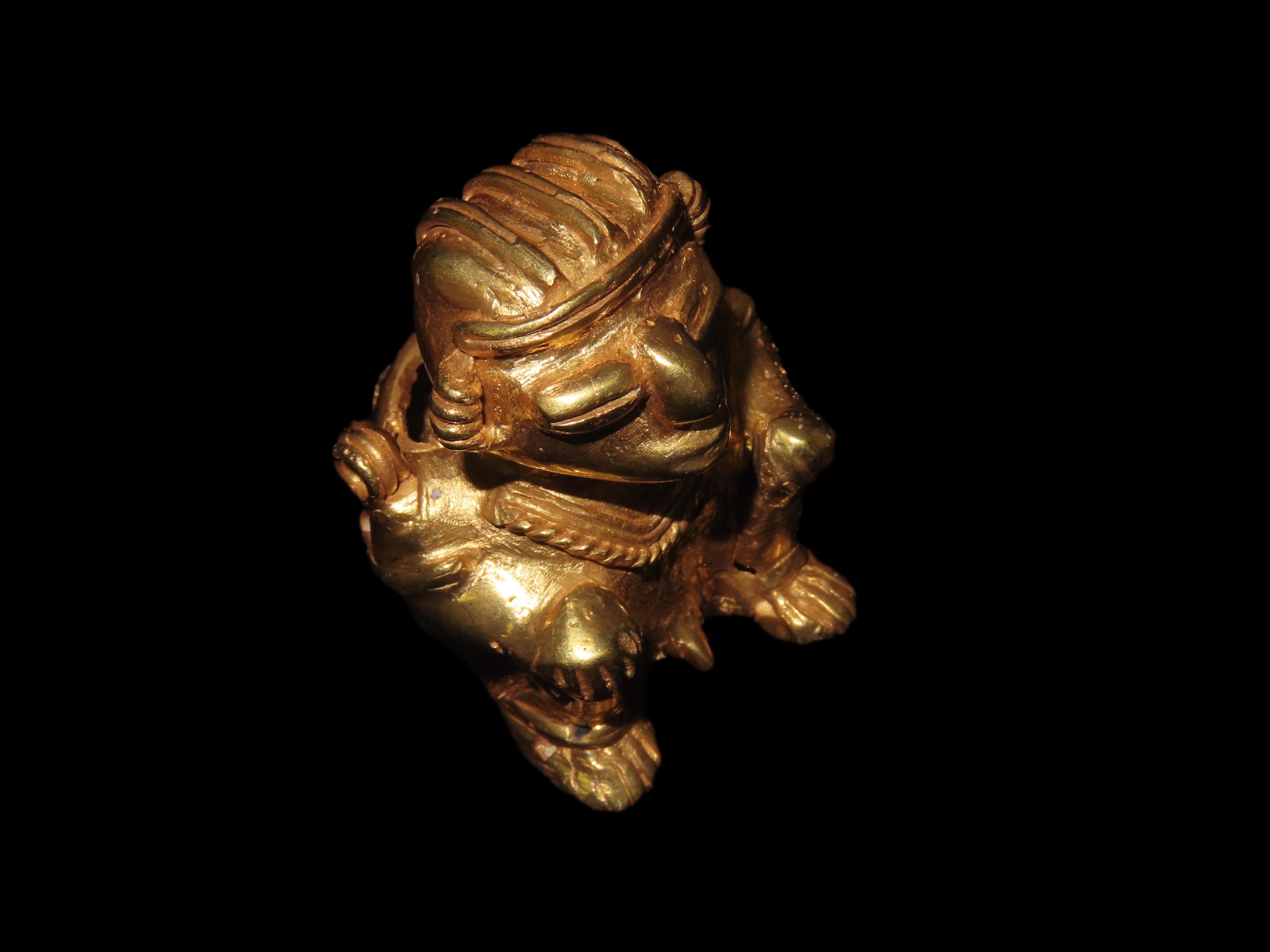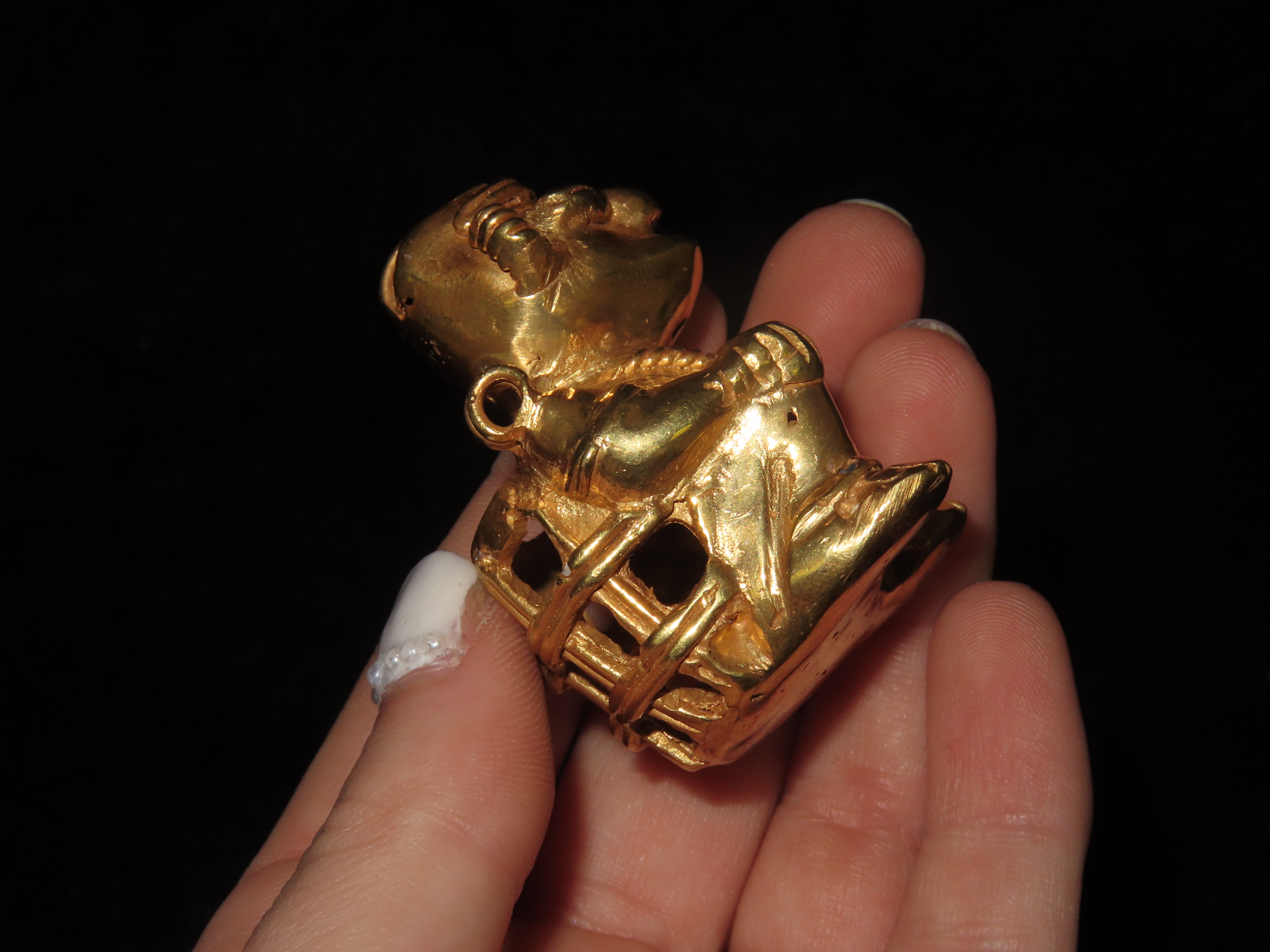 1 7/8″ Pre Columbian Tairona Tumbaga, Gold Copper Alloy, Human Carrying Basket Pendant