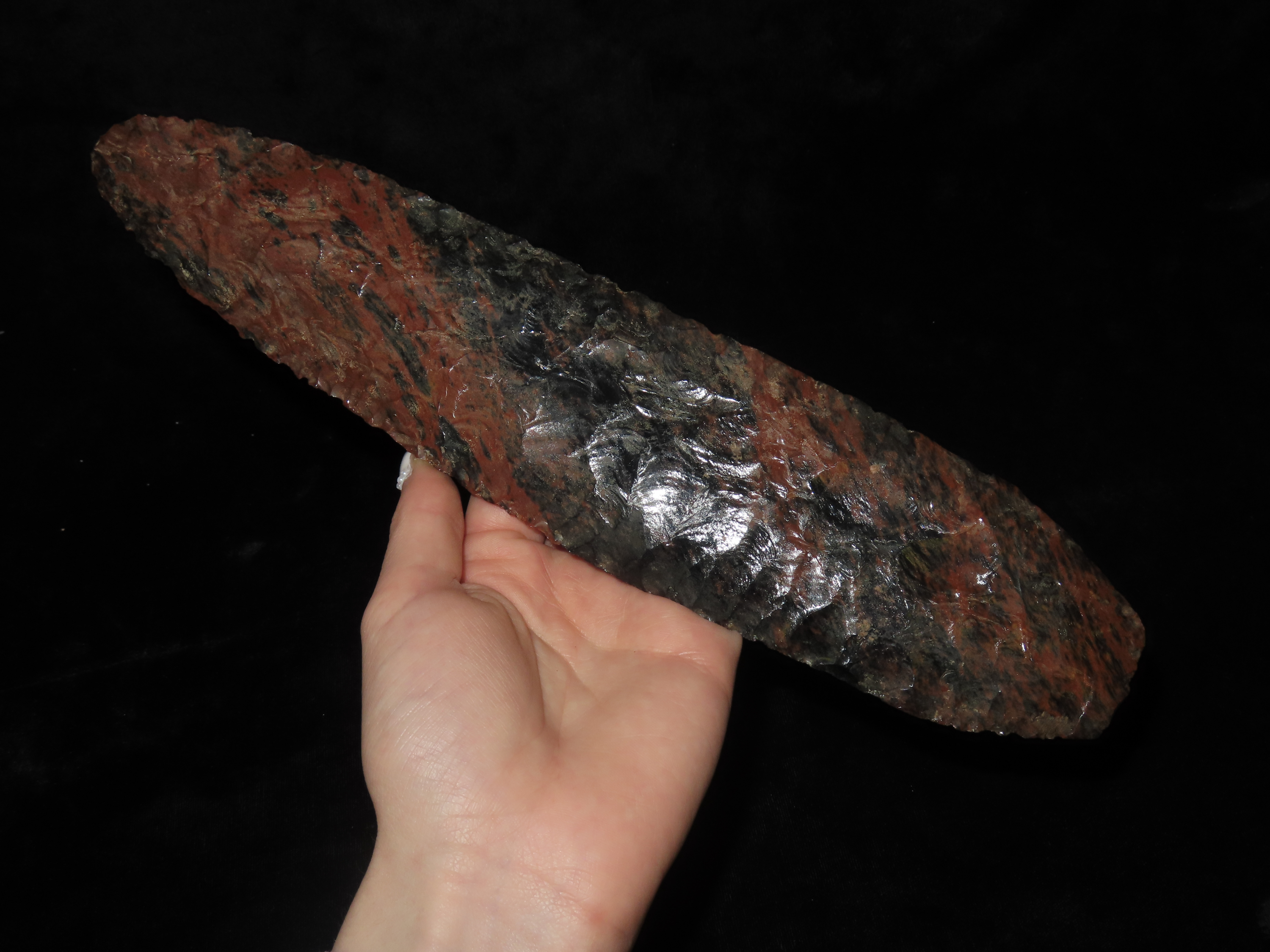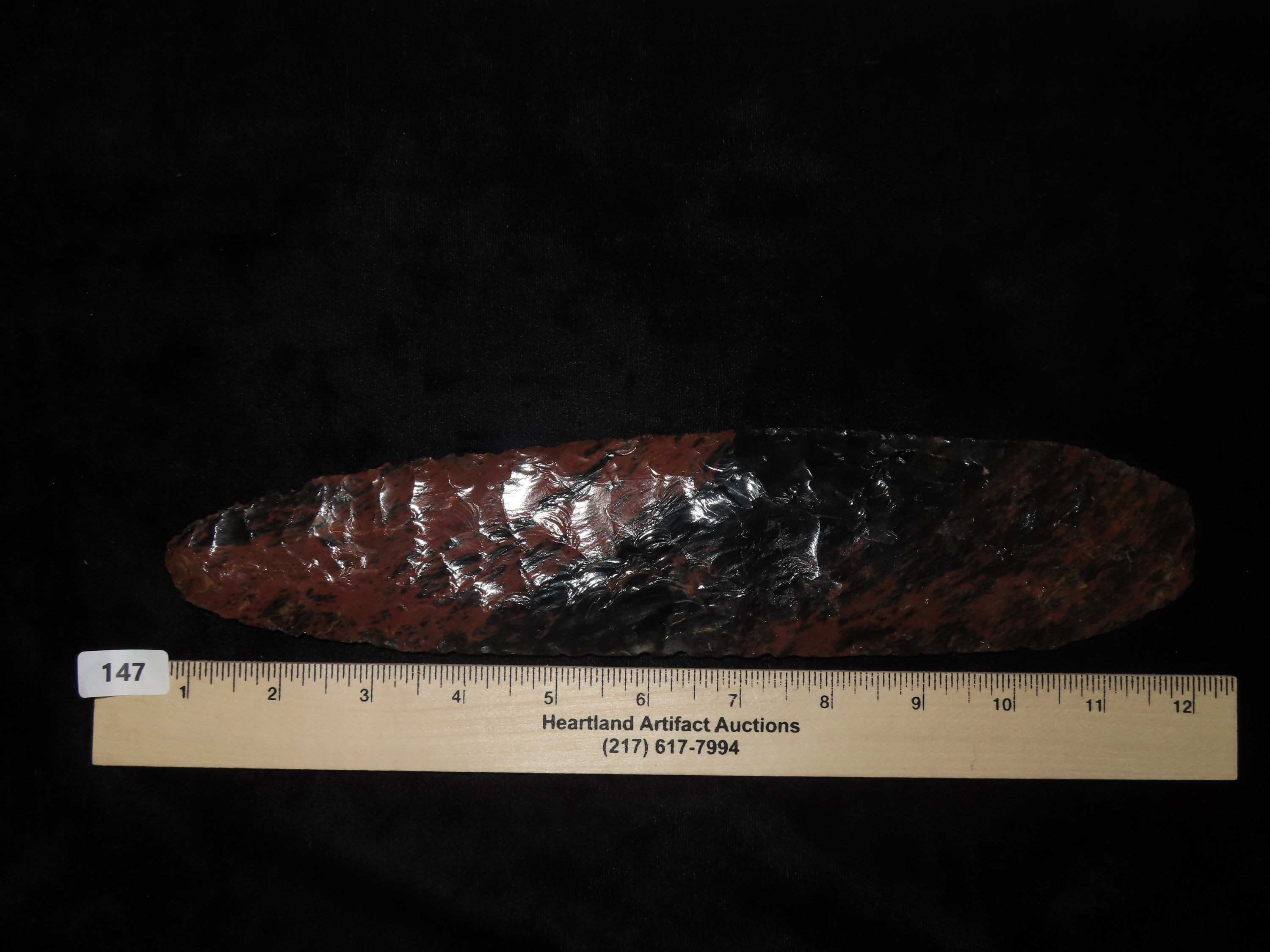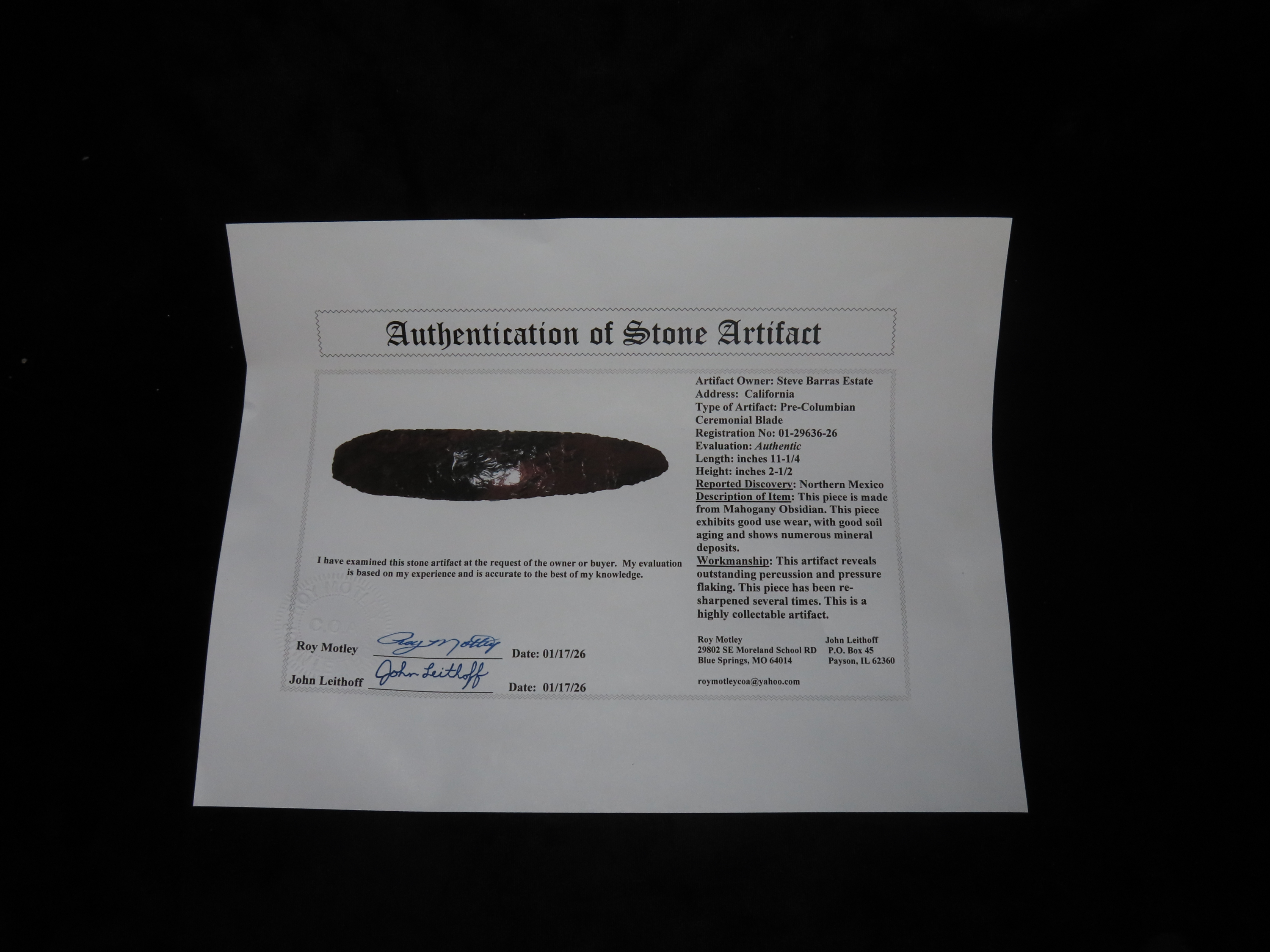 11 1/4″ x 2 1/2″ Pre-Columbian Ceremonial Blade, Mahogany Obsidian, Northern Mexico. Motley / Leithoff COA