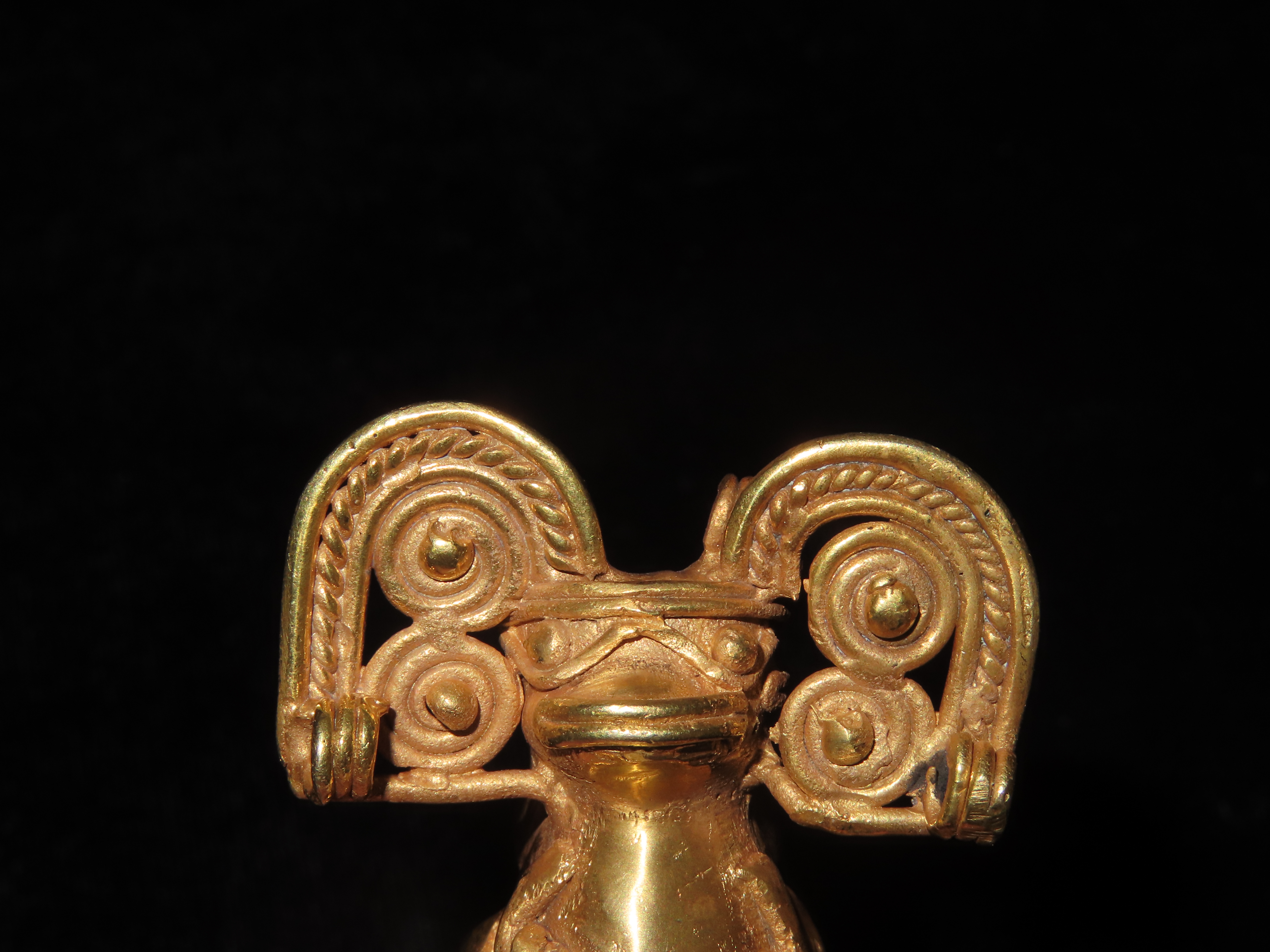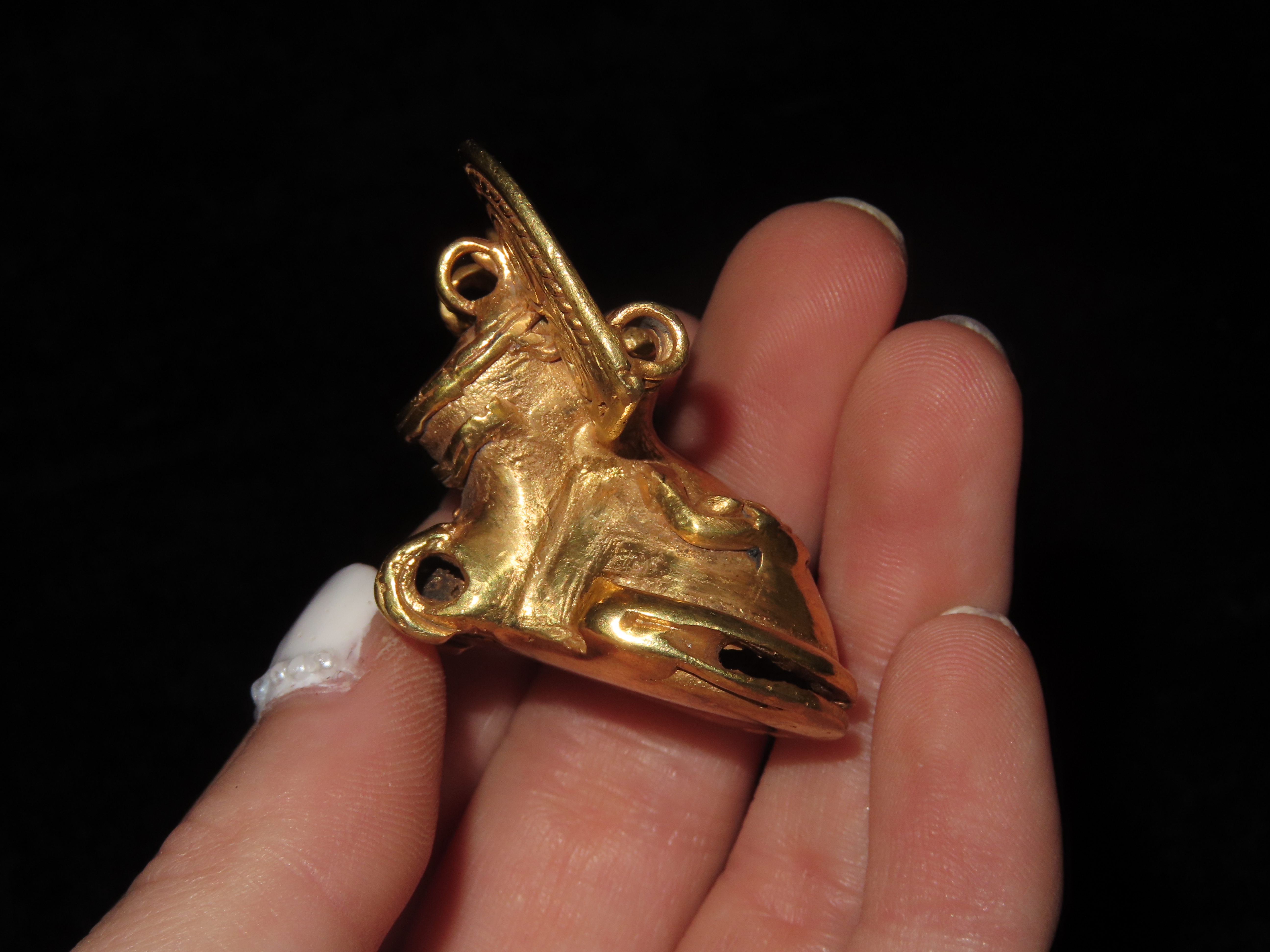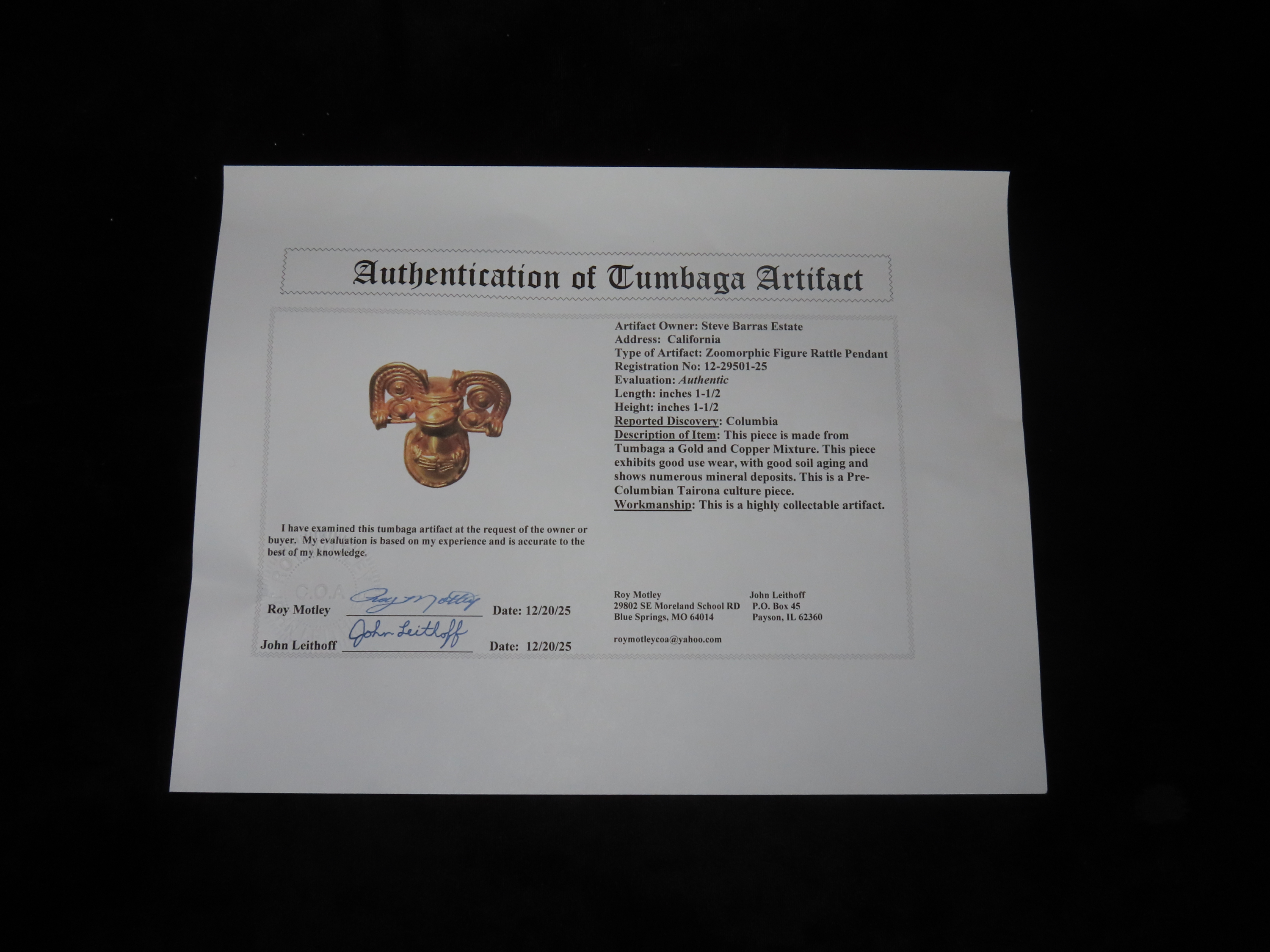 1 1/2″ x 1 1/2″ Zoomorphic Figure Rattle Pendant, Tumbaga a Gold and Copper Mixture. Columbia. Motley / Leithoff COA