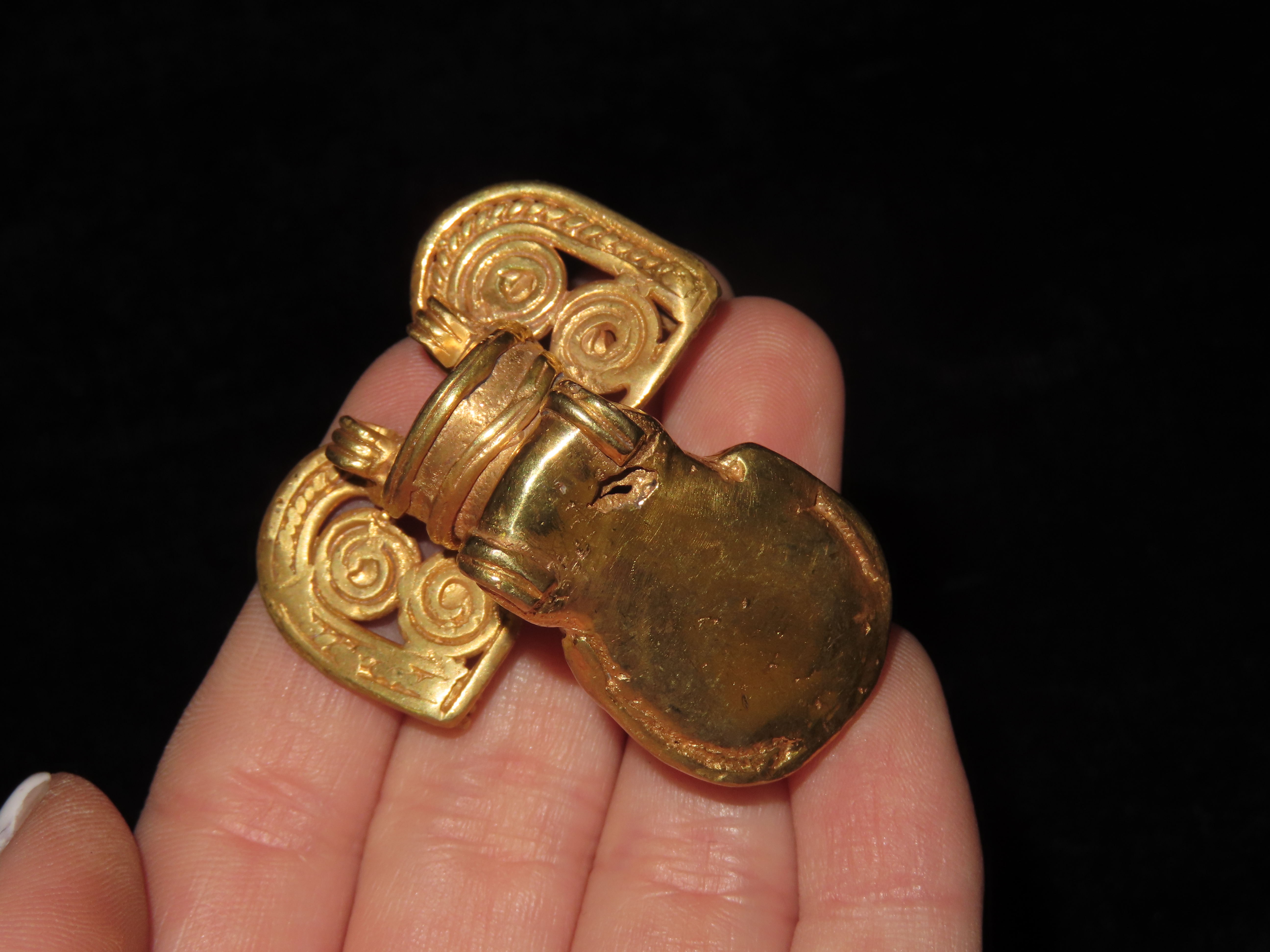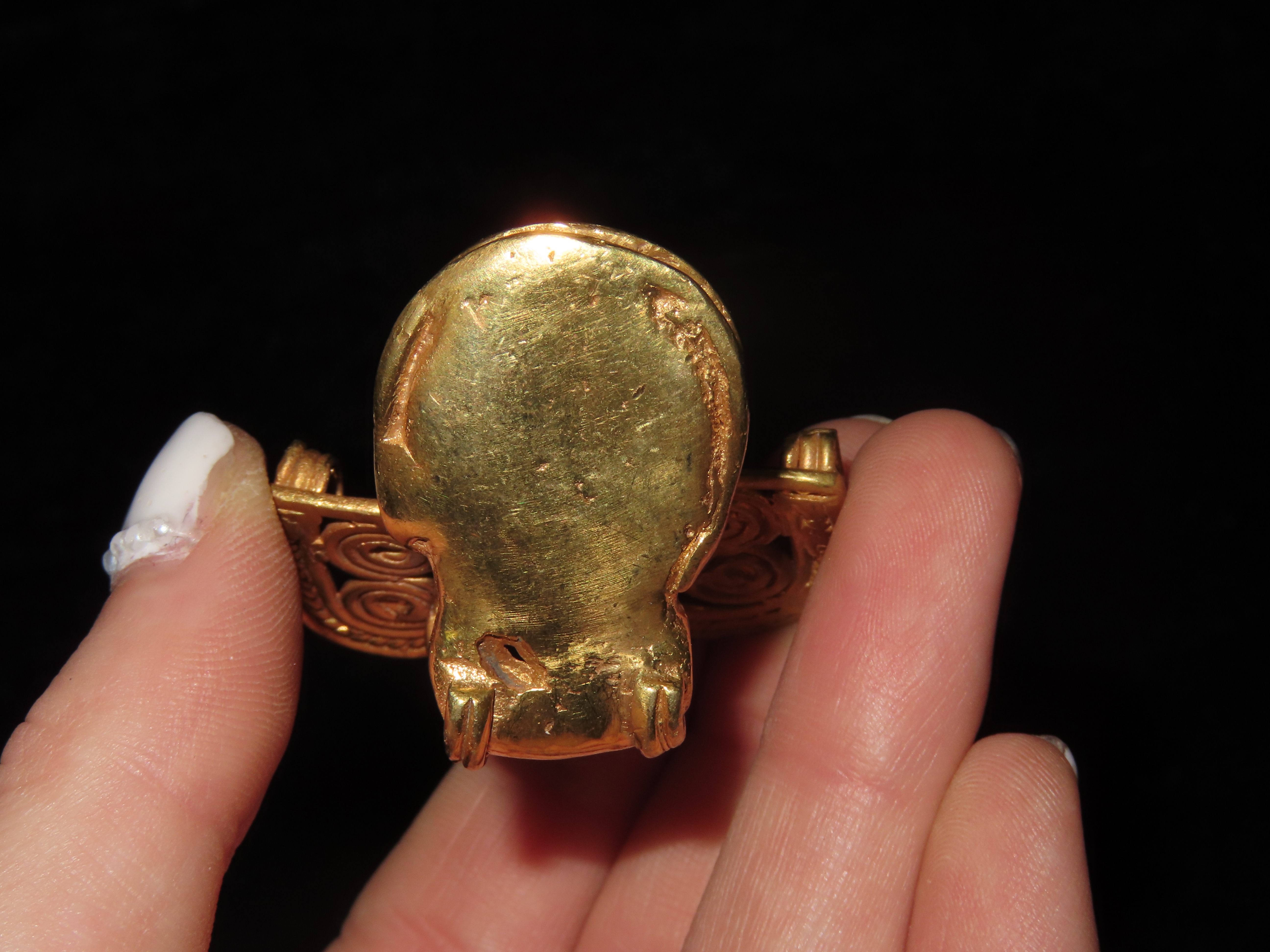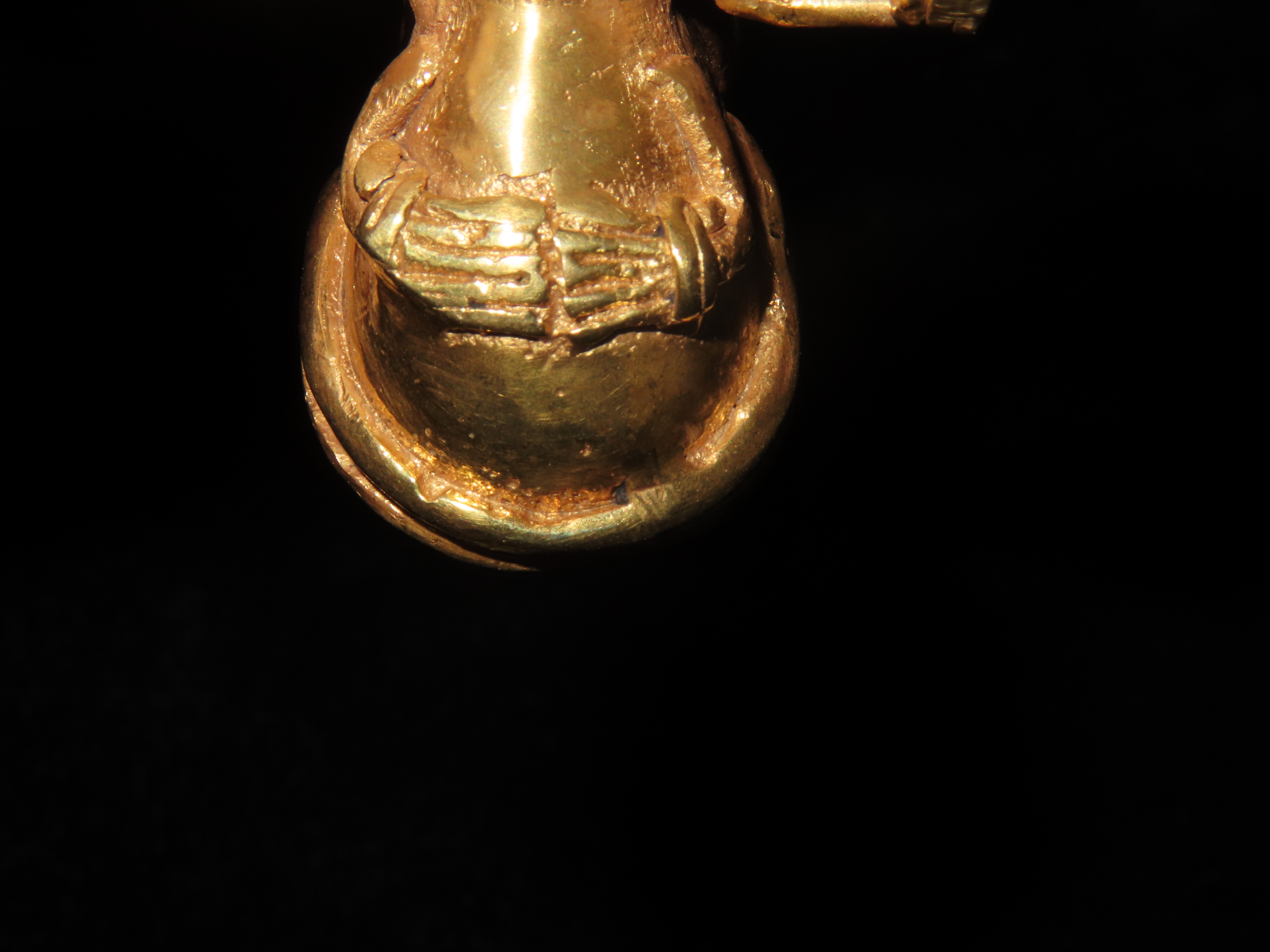 1 1/2″ x 1 1/2″ Zoomorphic Figure Rattle Pendant, Tumbaga a Gold and Copper Mixture. Columbia. Motley / Leithoff COA
