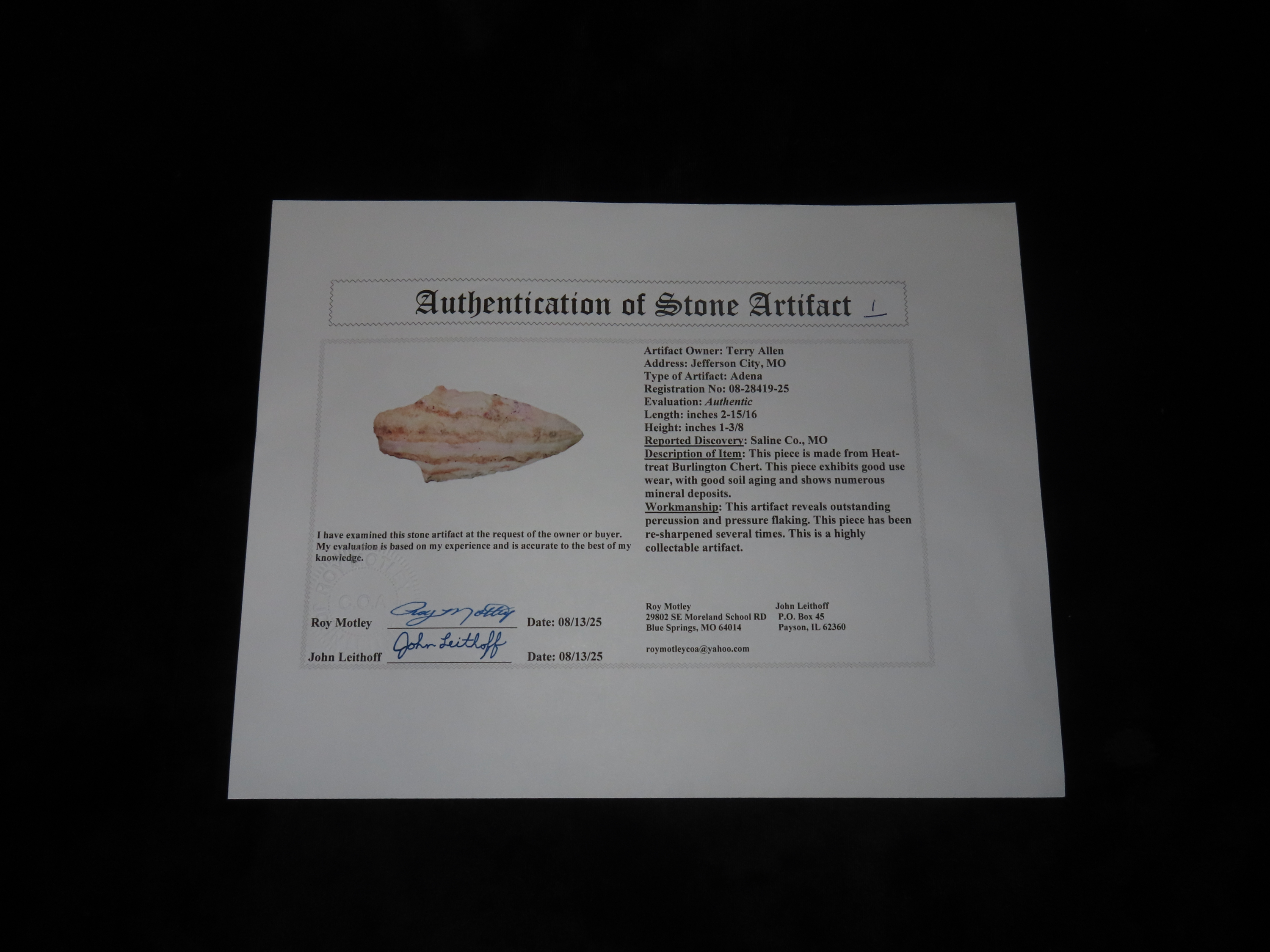 2 15/16" x 1 3/8" Adena, Burlington Chert, Saline Co. Missouri, Motley / Leithoff COA