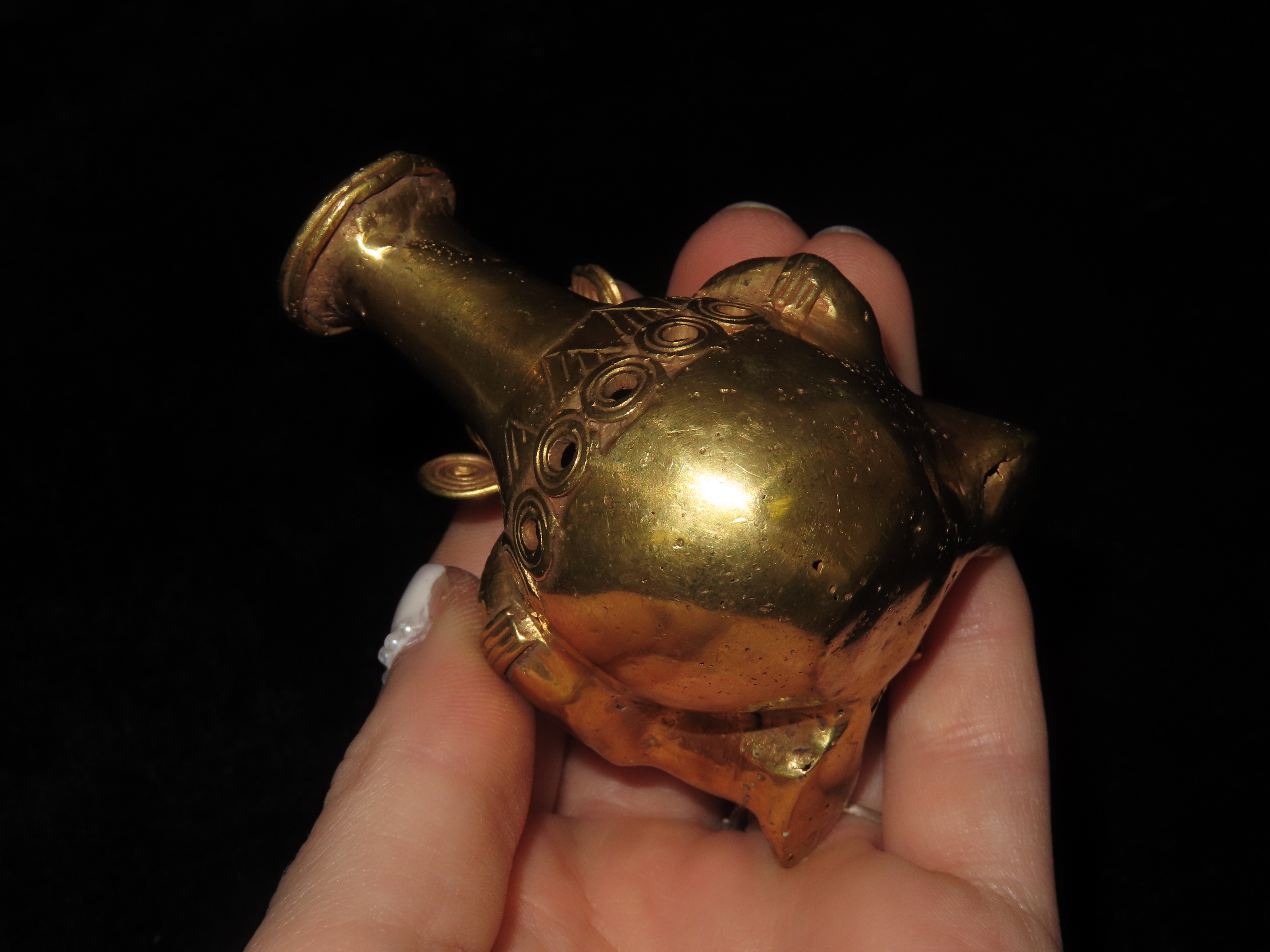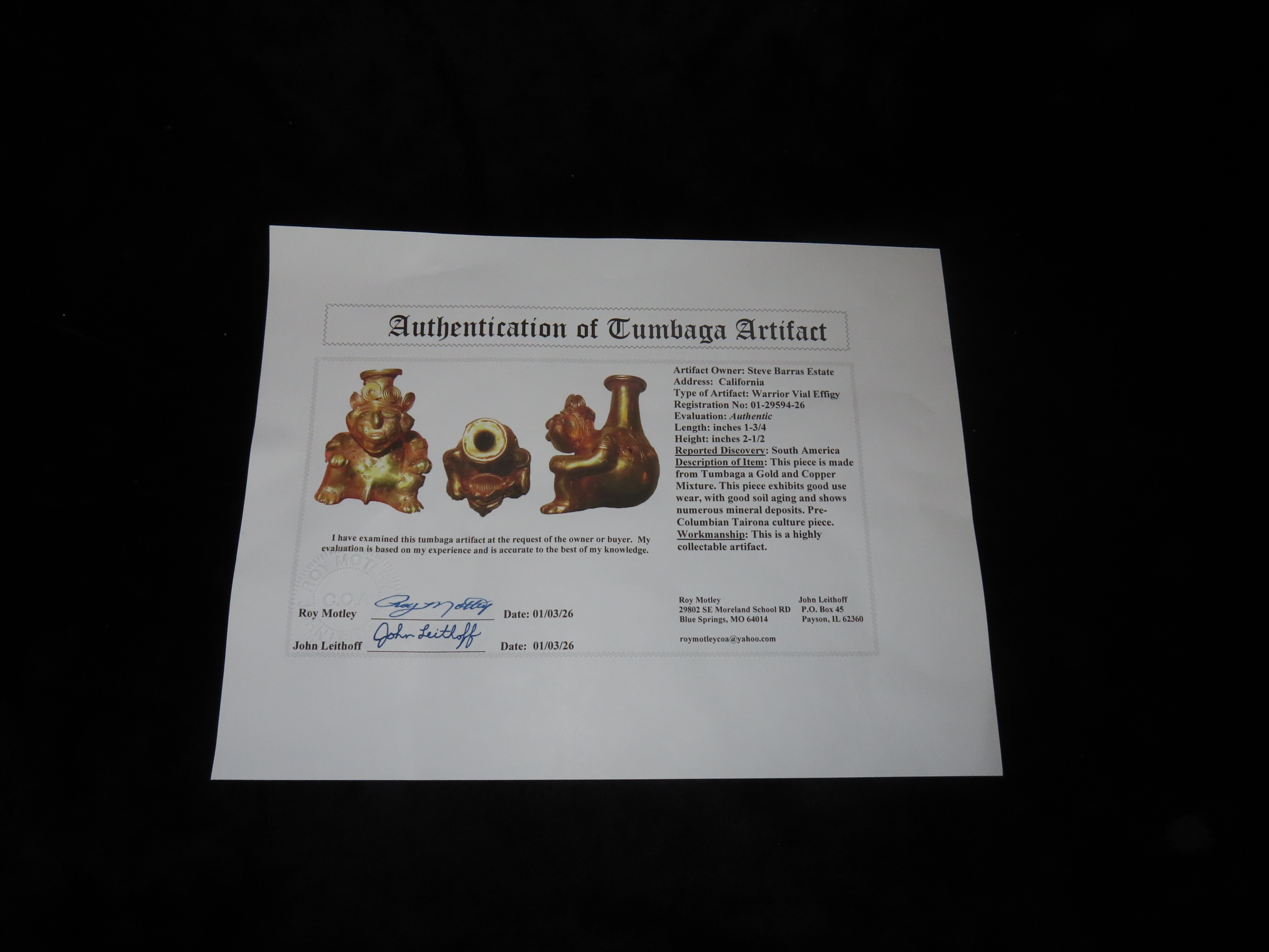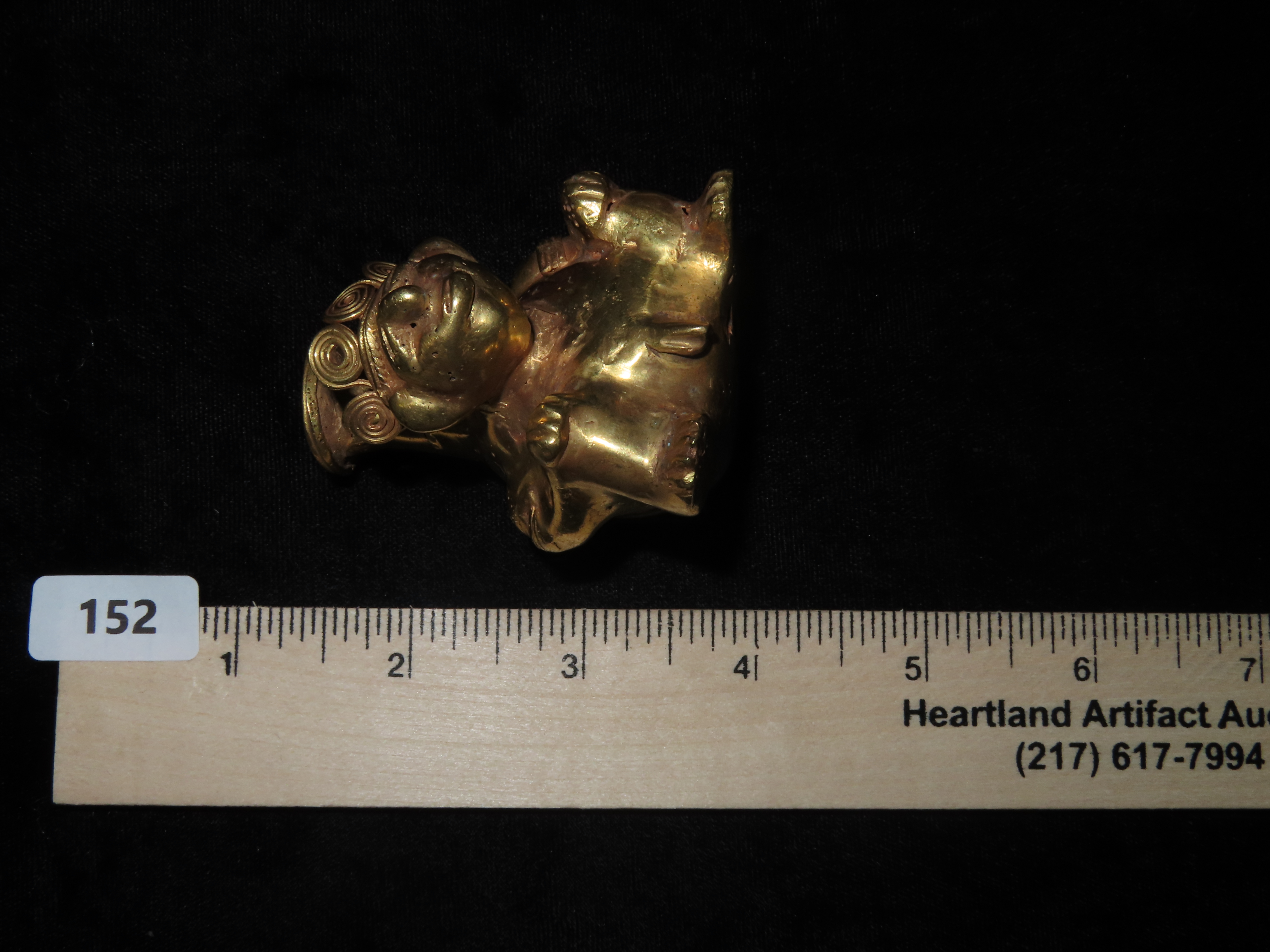 1 3/4″ x 2 1/2″ Warrior Vial Effigy, Tumbaga a Gold and Copper Mixture, South America. Motley / Leithoff COA