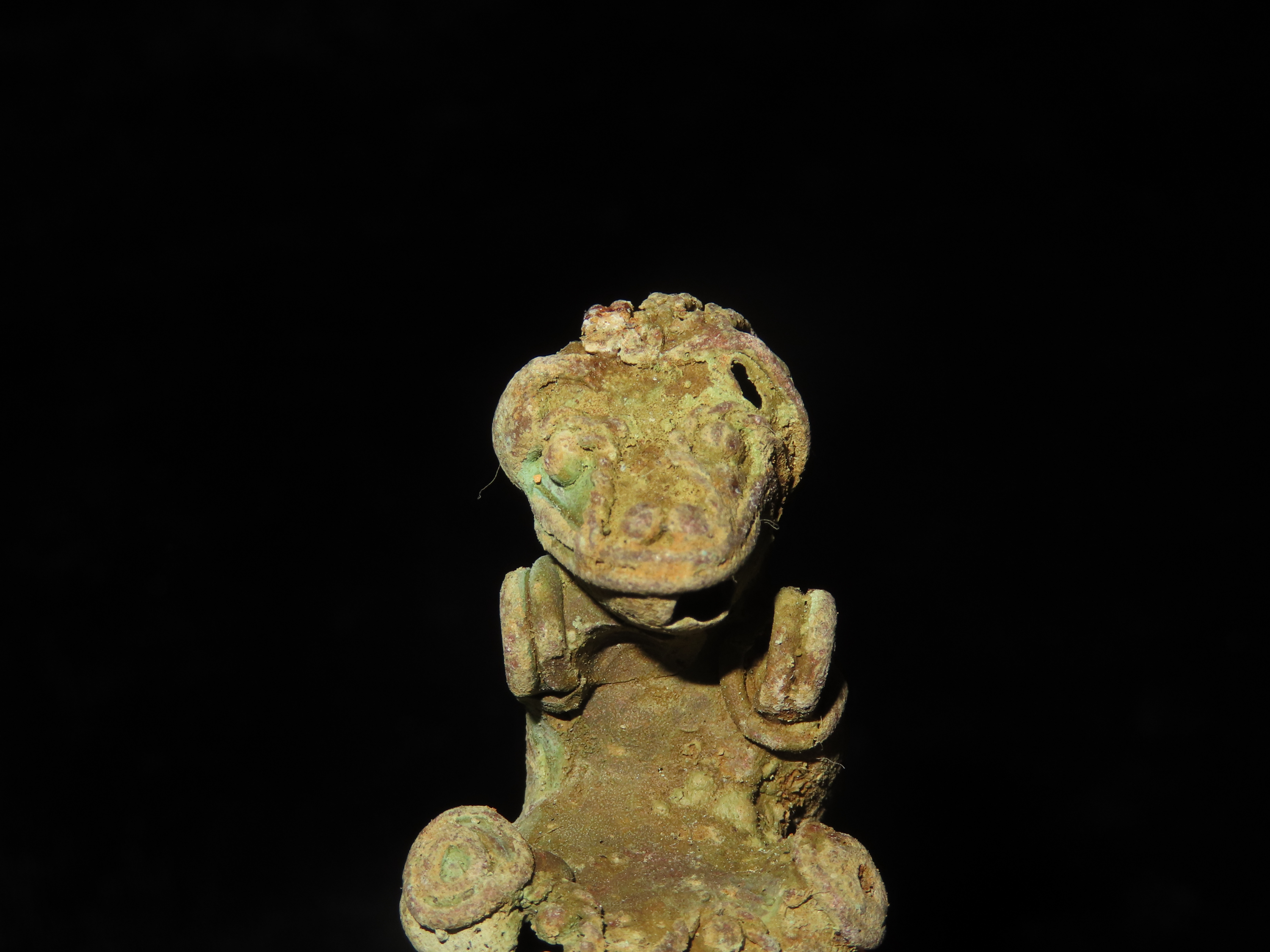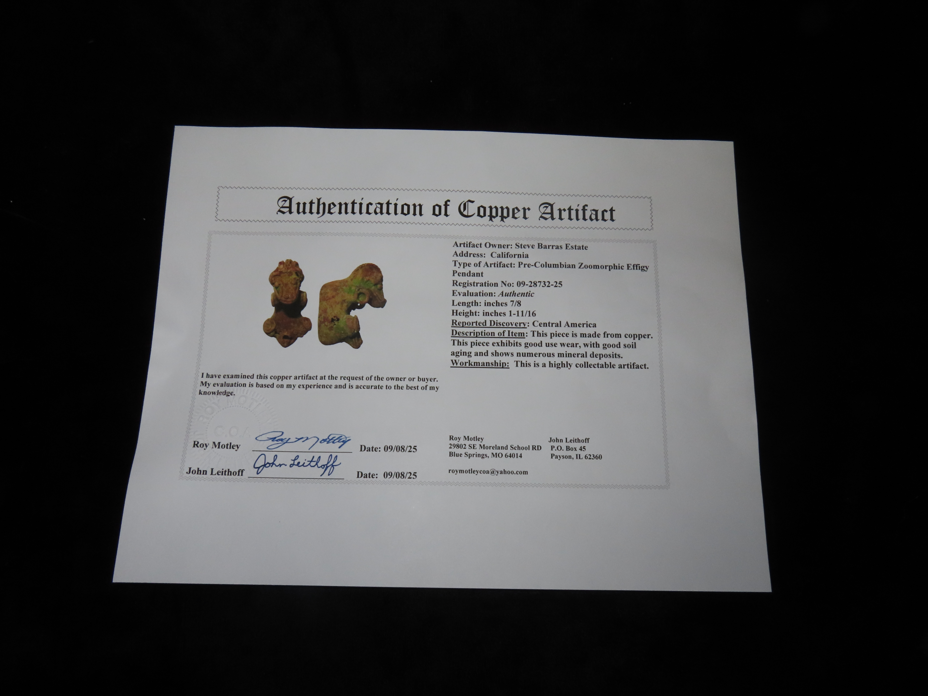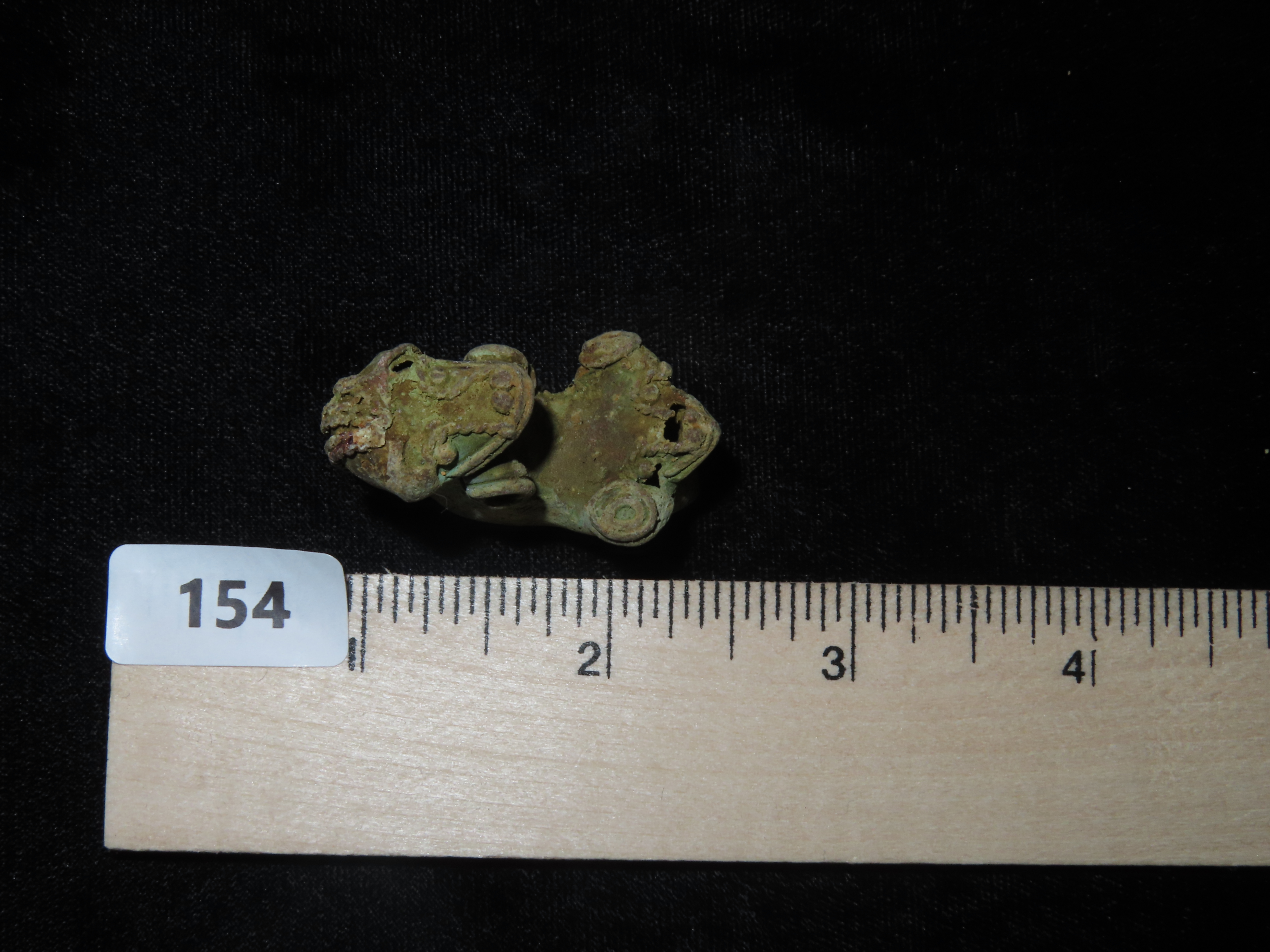 7/8″ x 1 11/16″ Pre-Columbian Zoomorphic Effigy Pendant, Copper, Central America. Motley / Leithoff COA