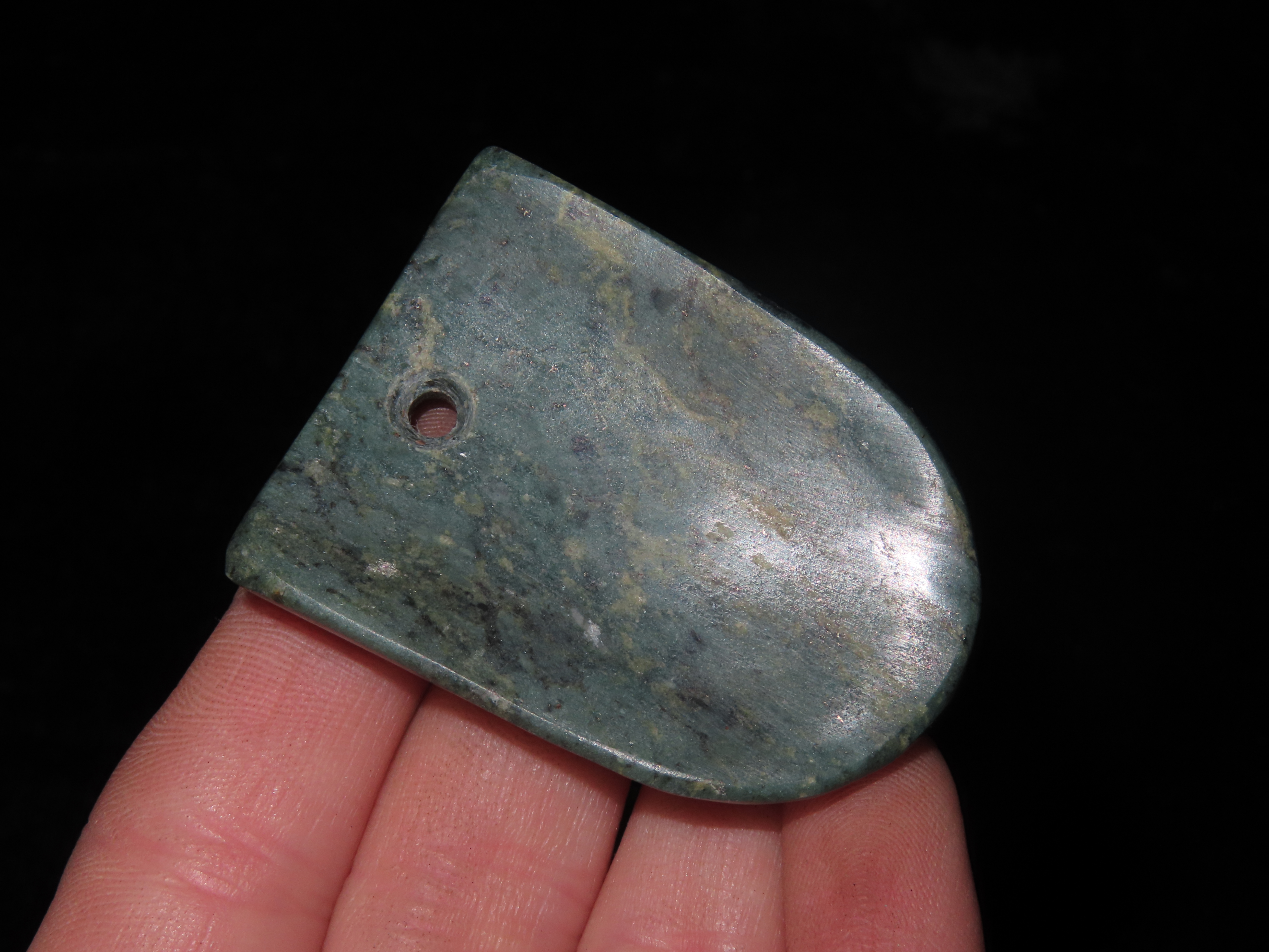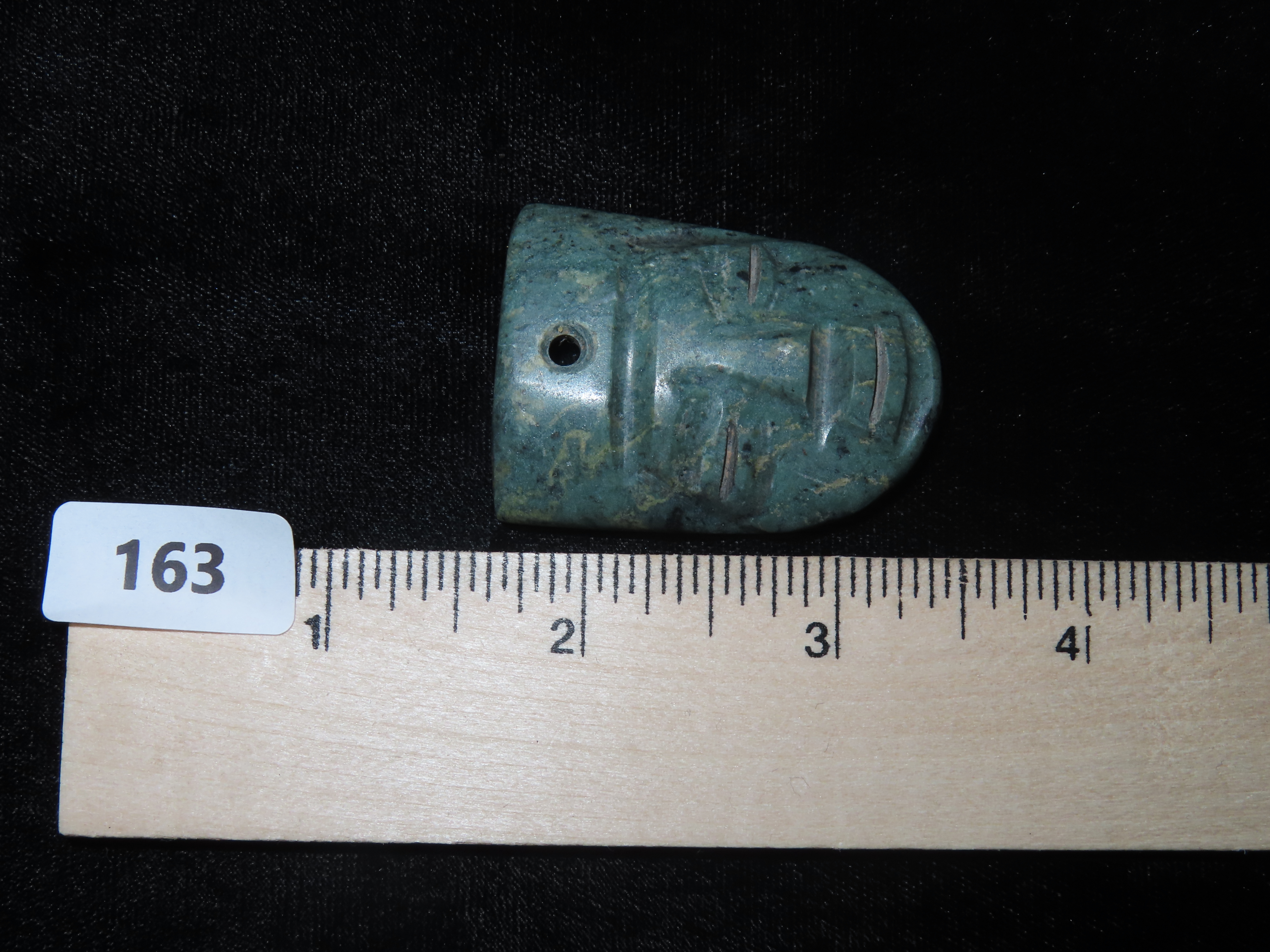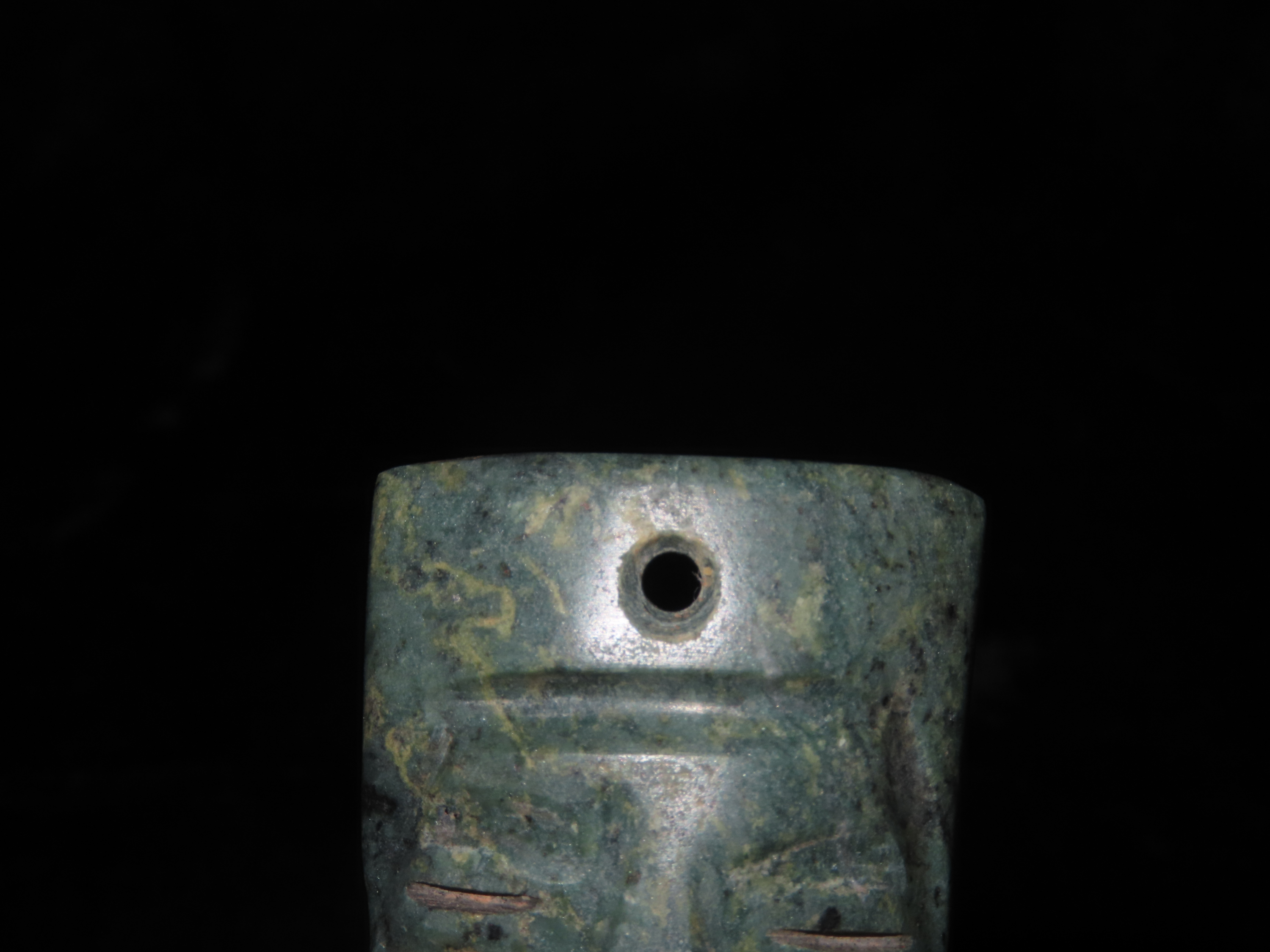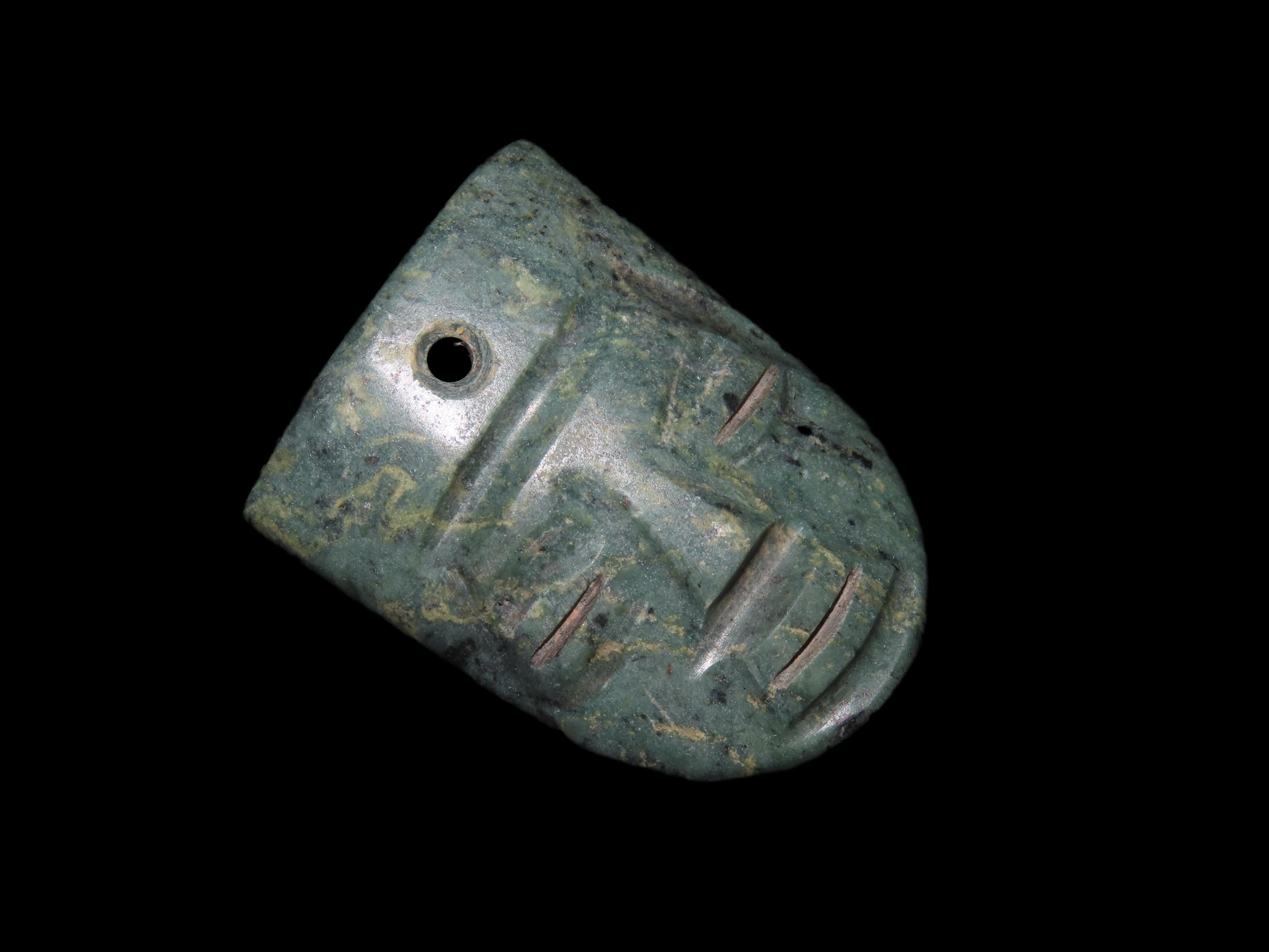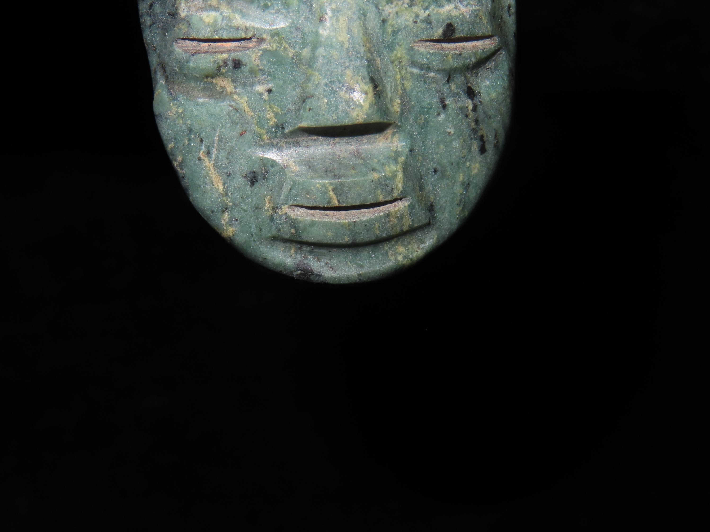 1 3/4″ Pre-Columbian Jade Maskette. Columbia South America.