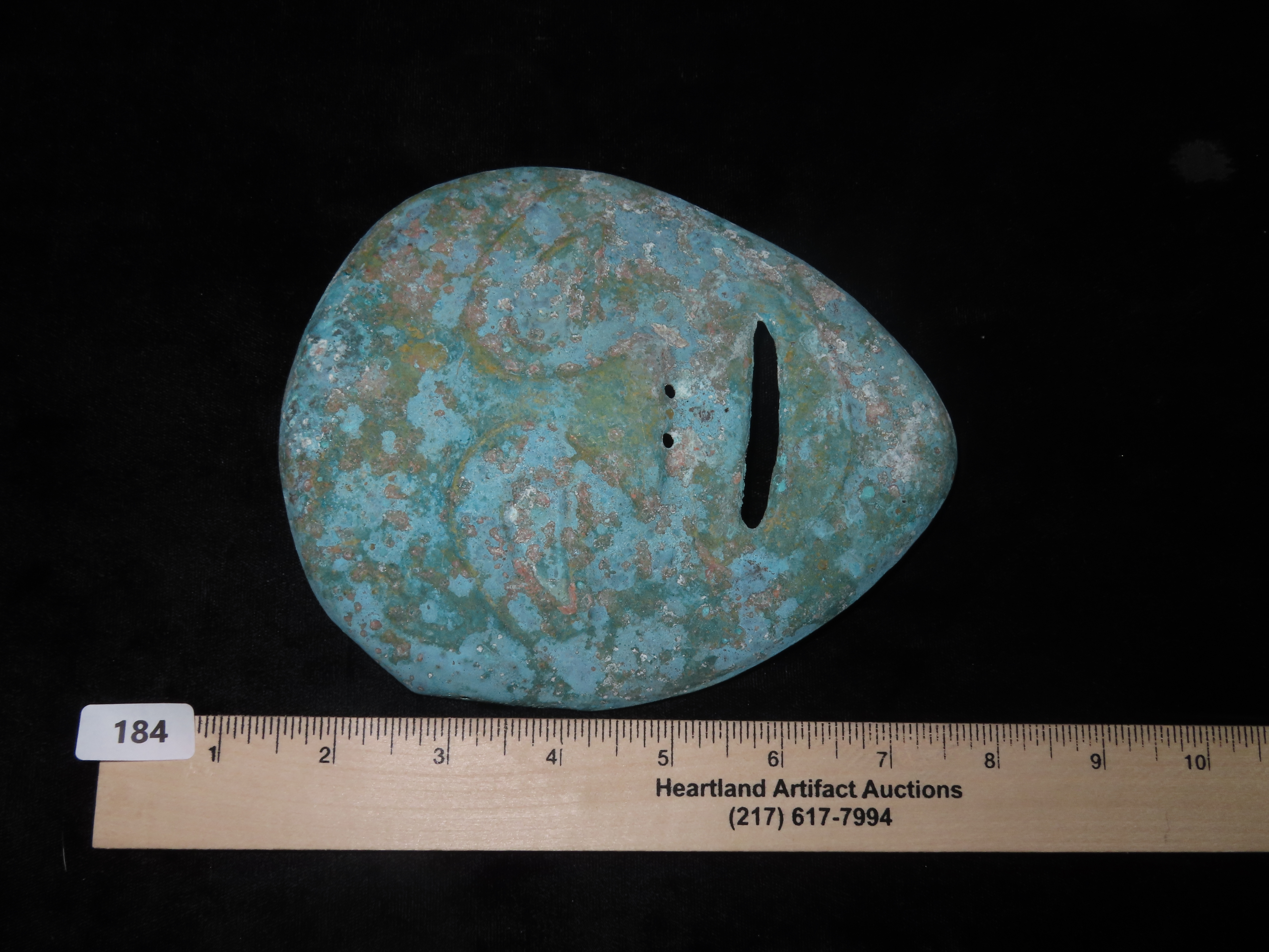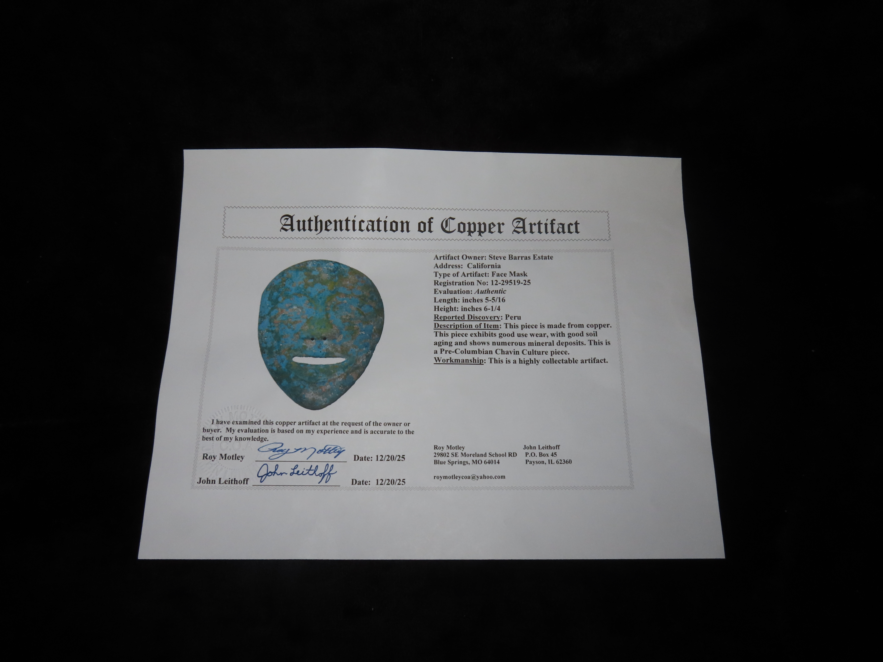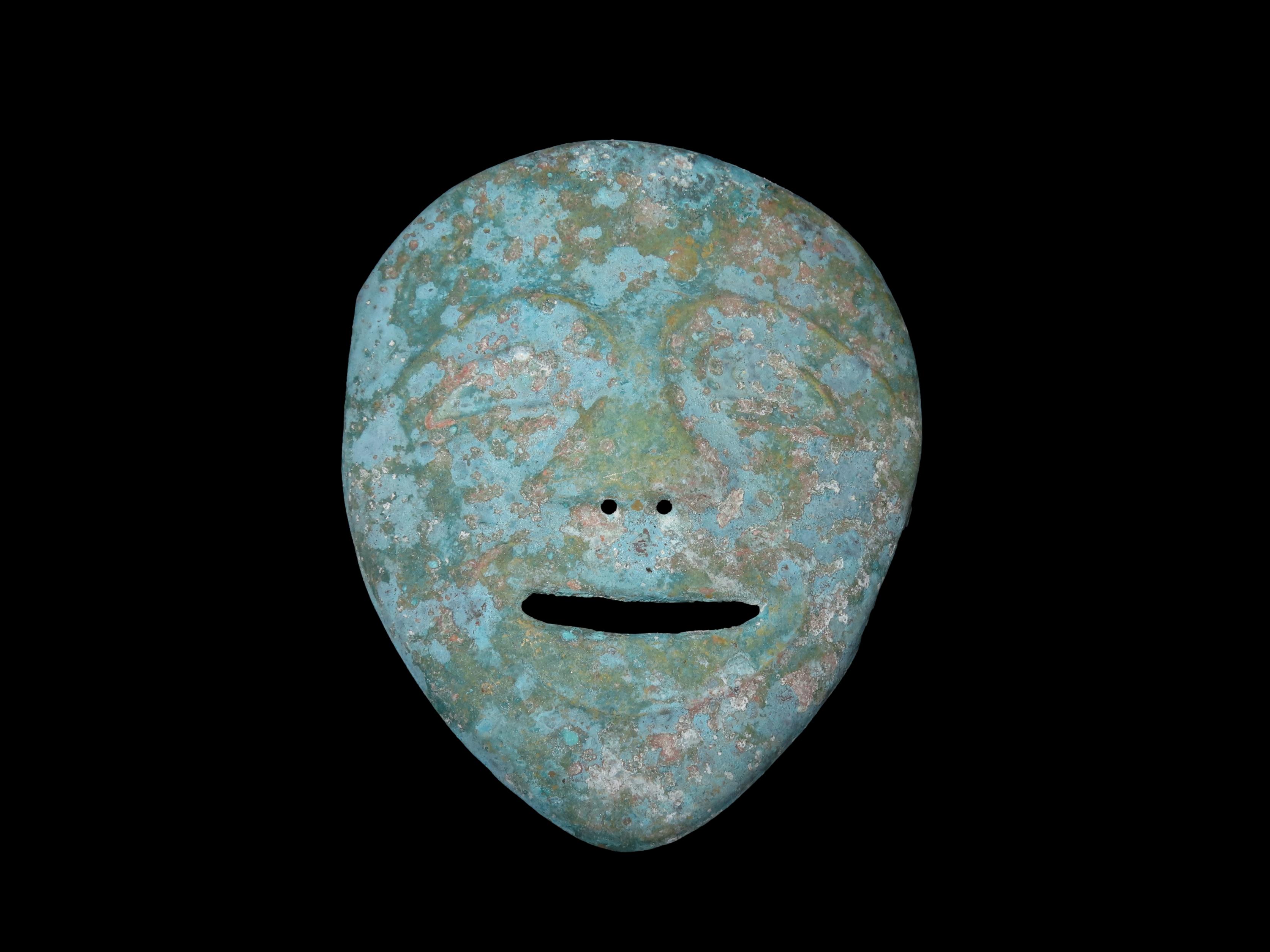 5 5/16″ x 6 1/4″ Face Mask. Copper. Peru. Motley / Leithoff COA.