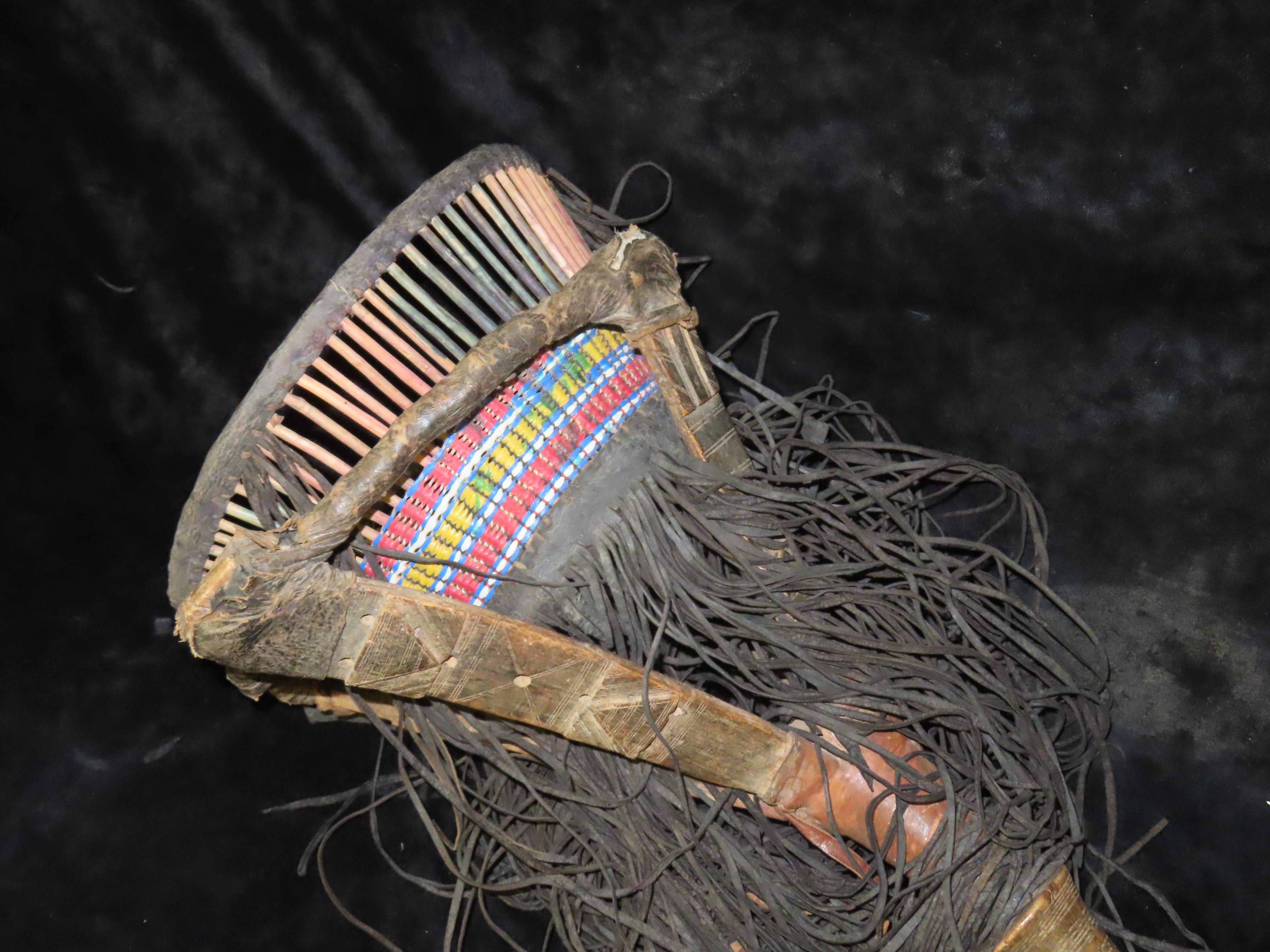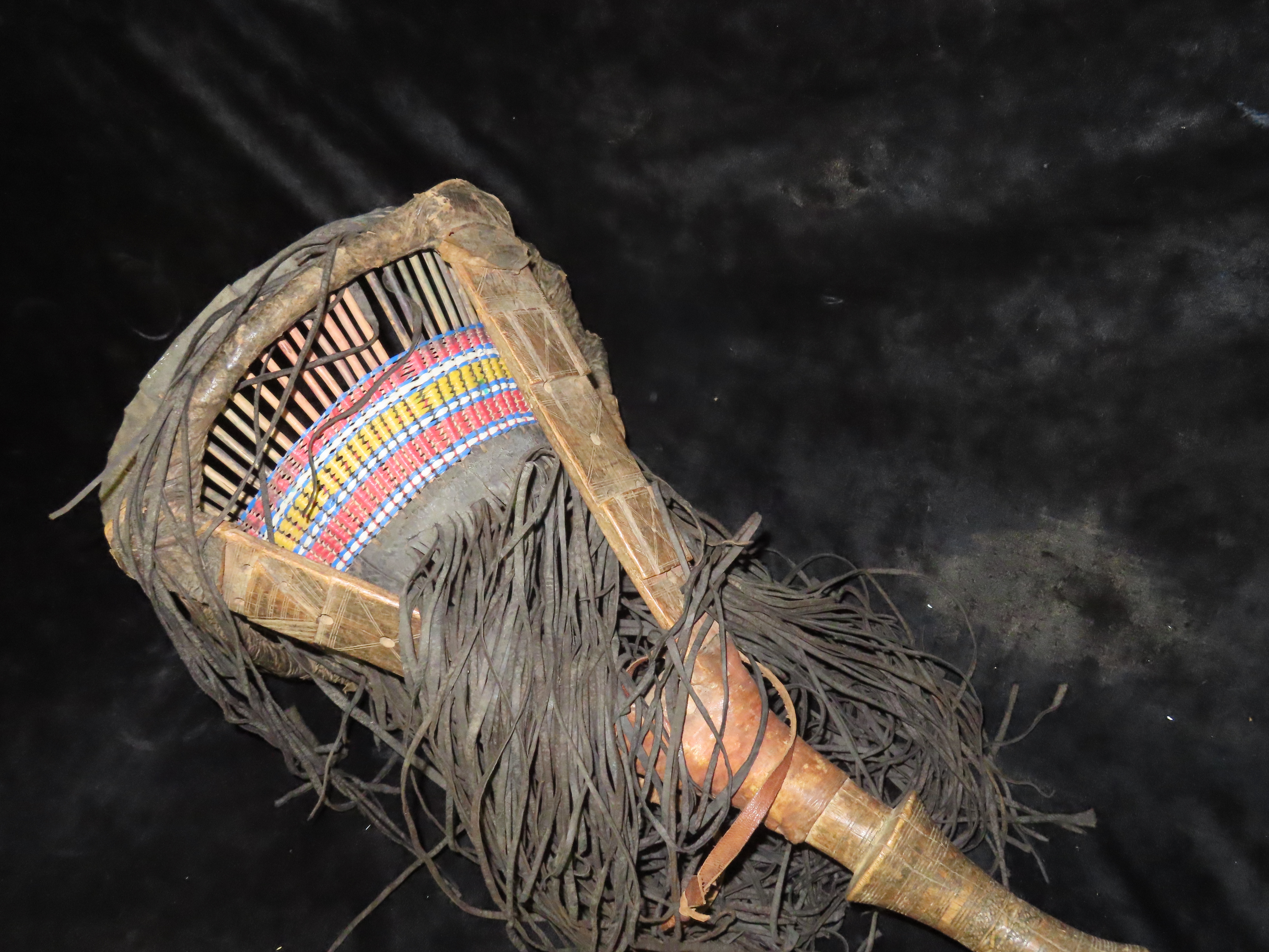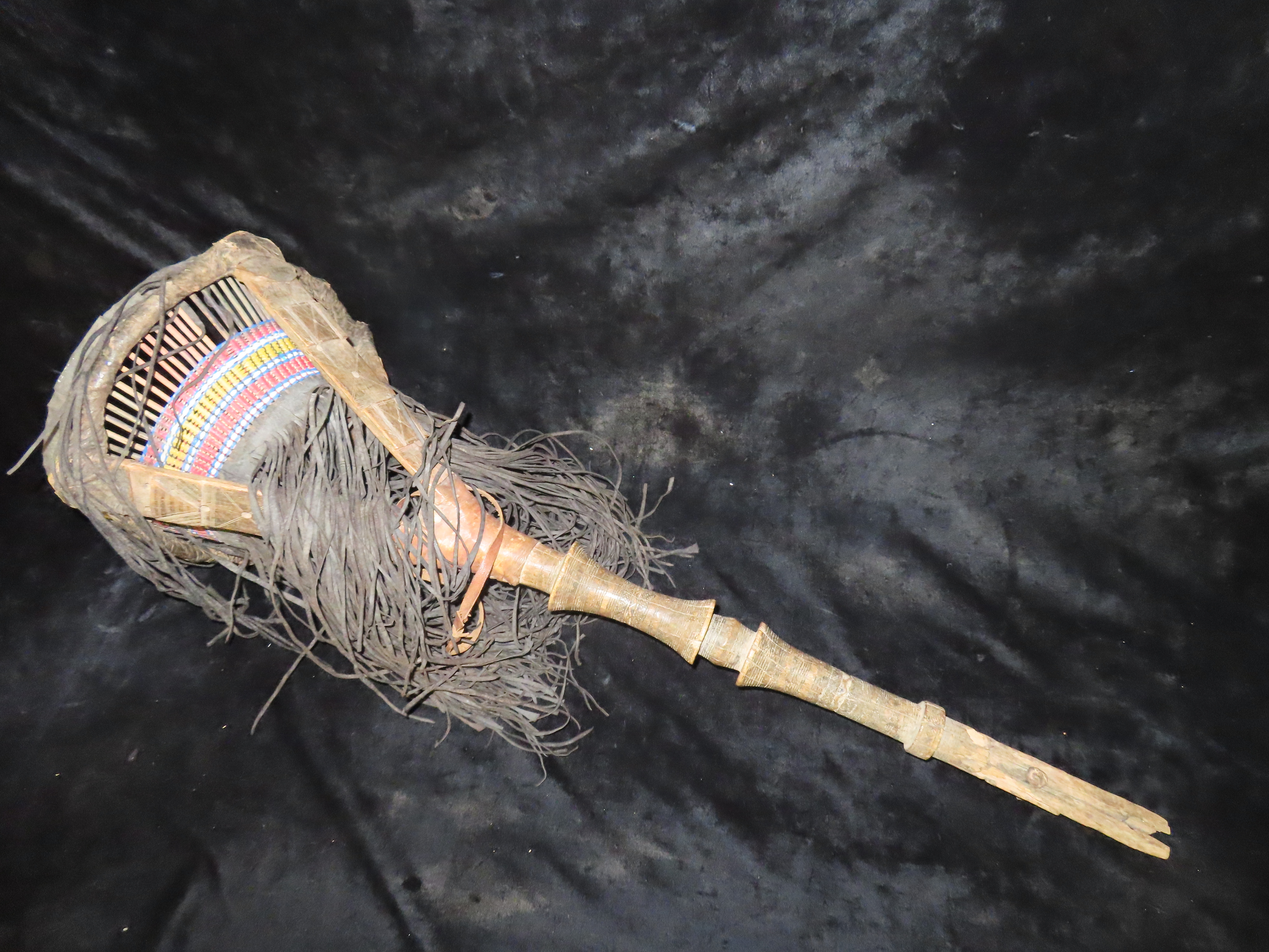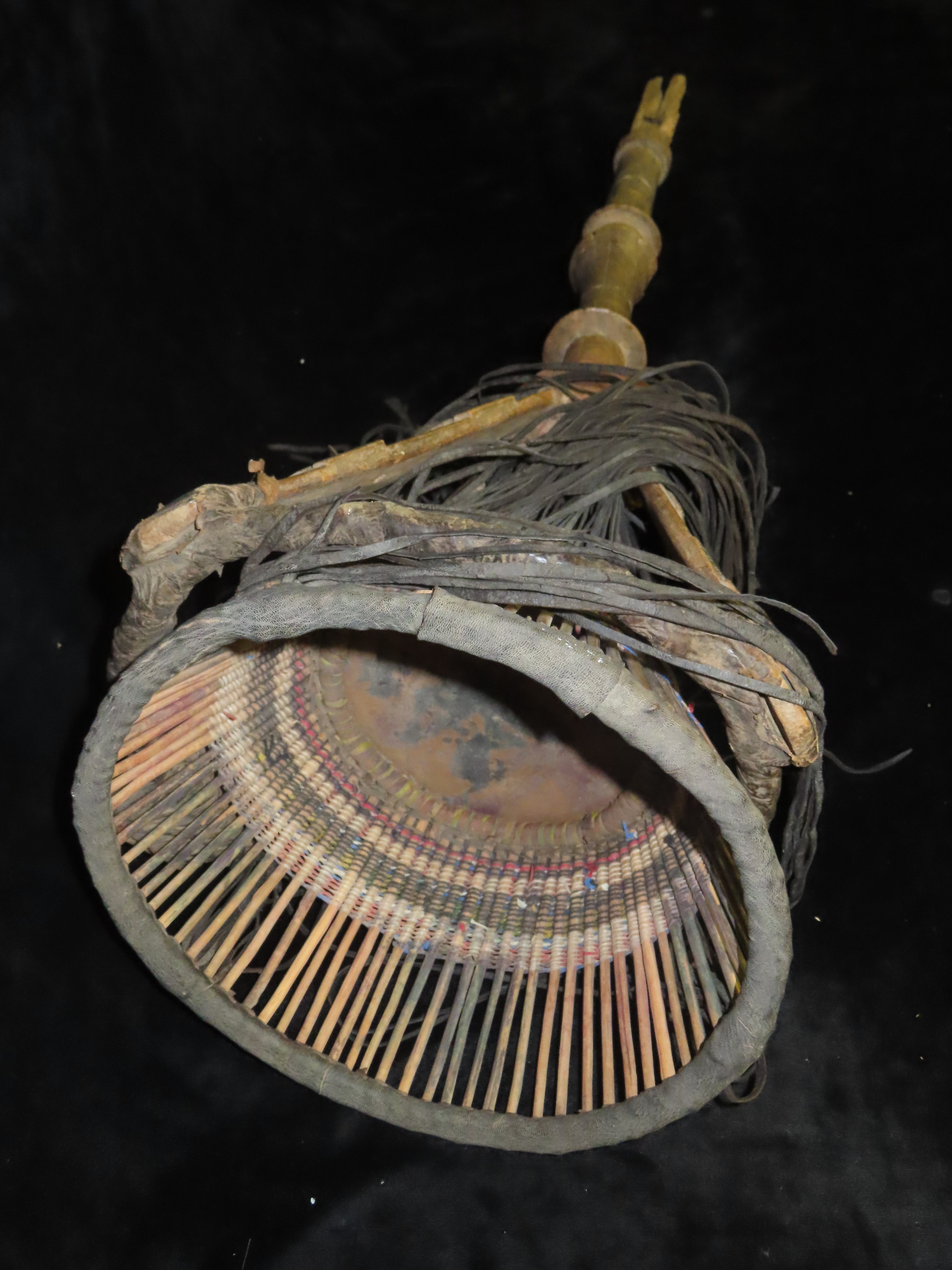 Wood, Leather and Bead Basket on a stick