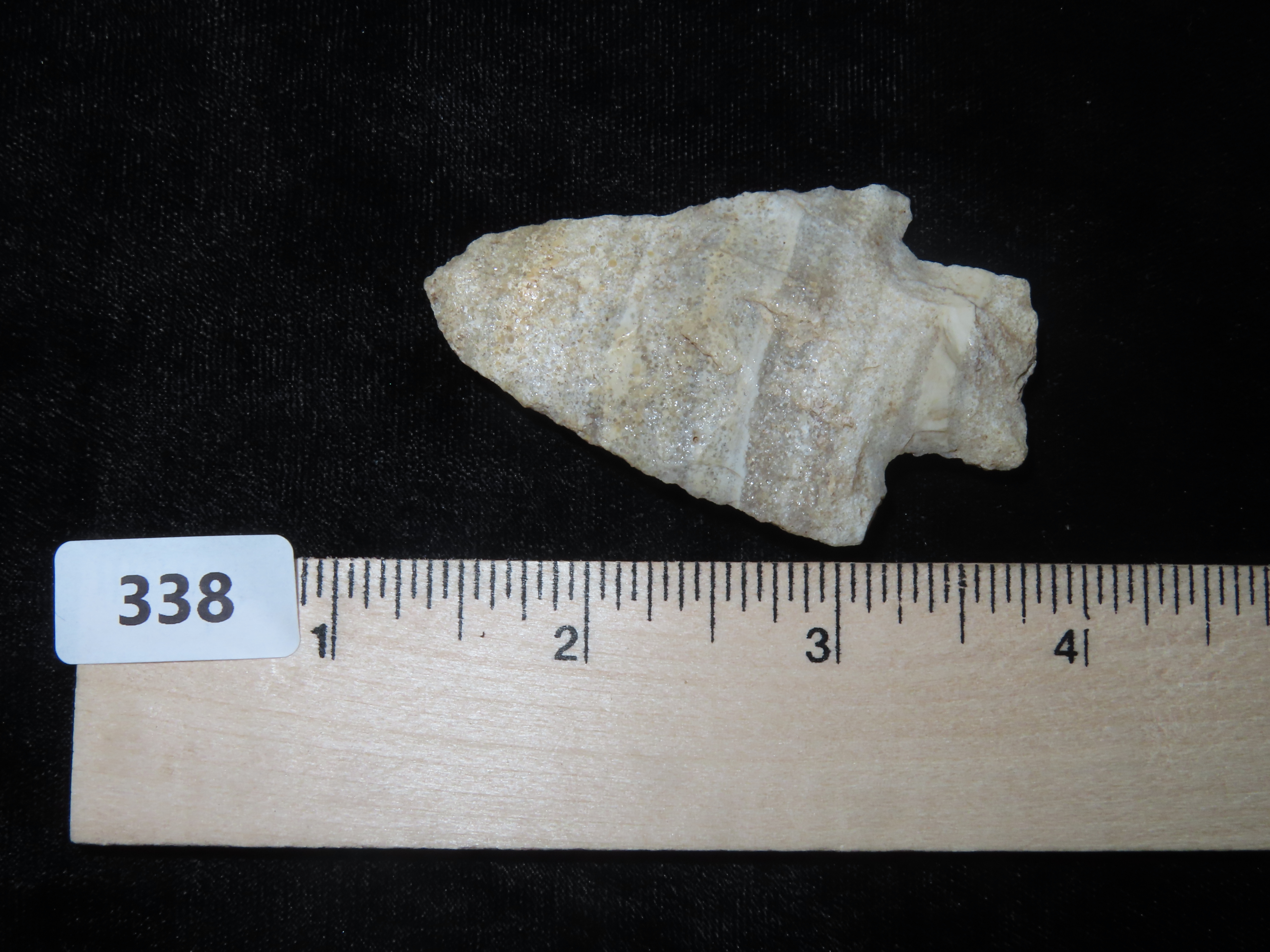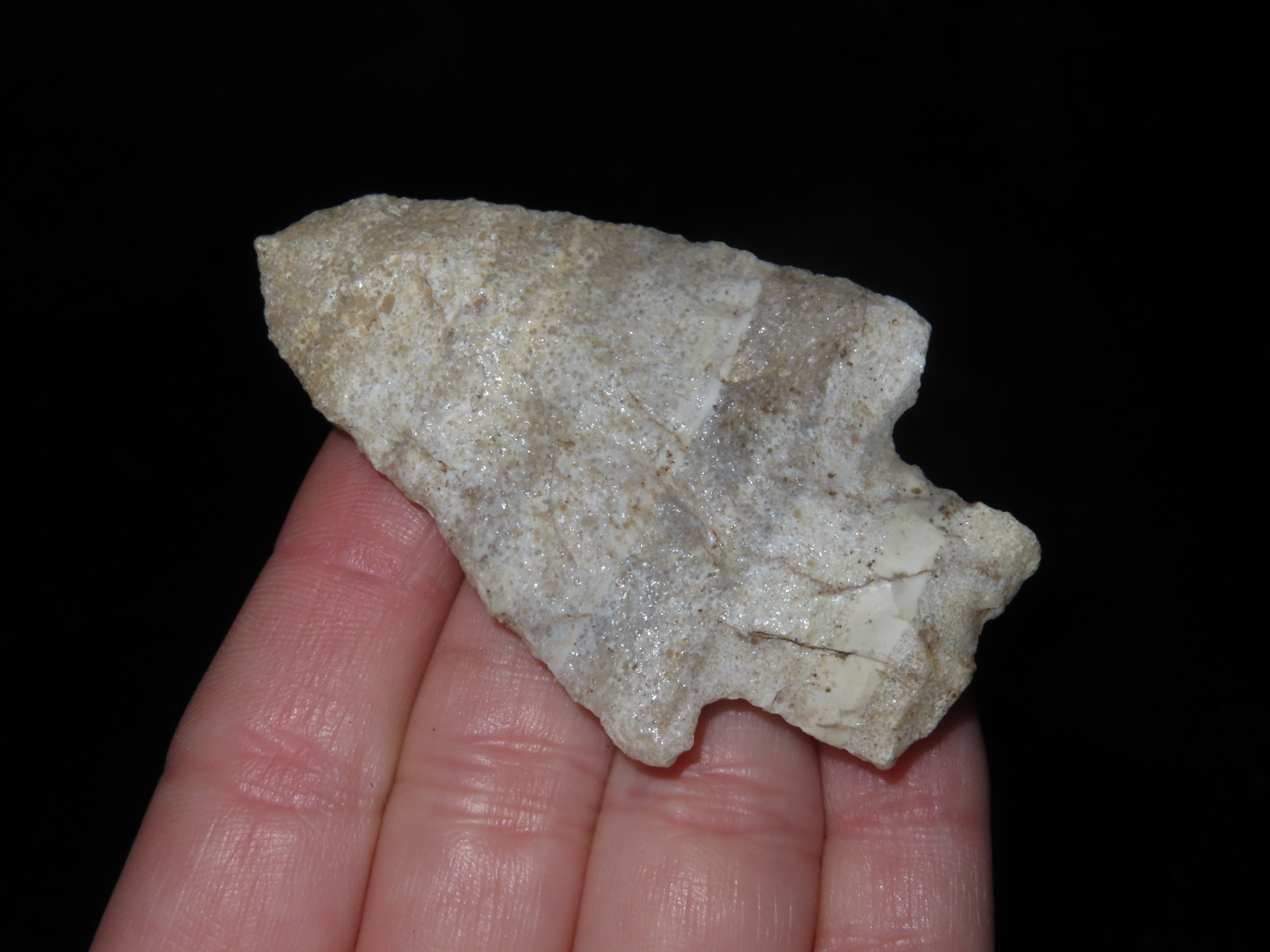 2 1/2″ Quartzite Etley Point. Butler County, Missouri. Found near Poplar Bluff by JJ Smith. 1953 – 1978.