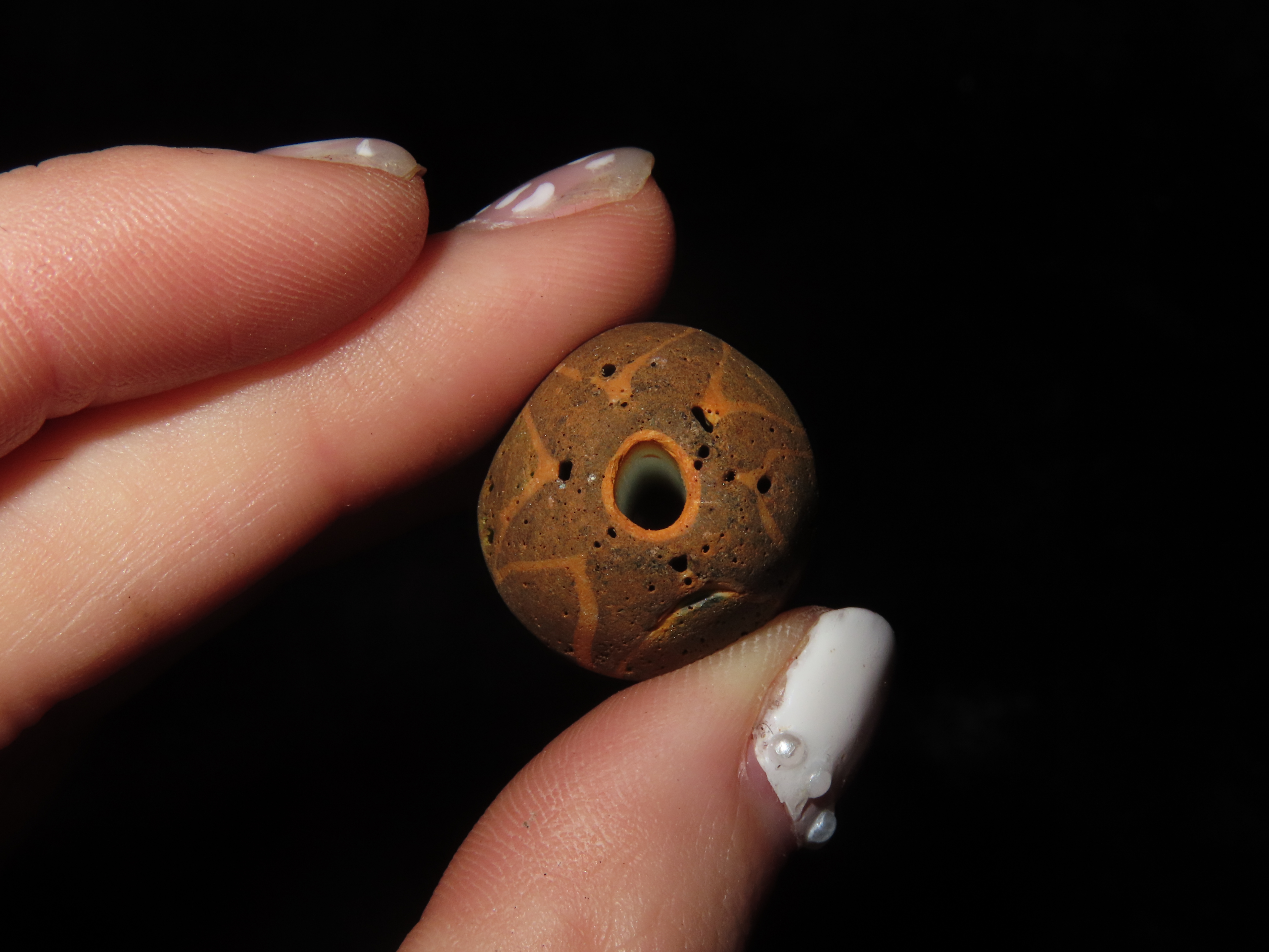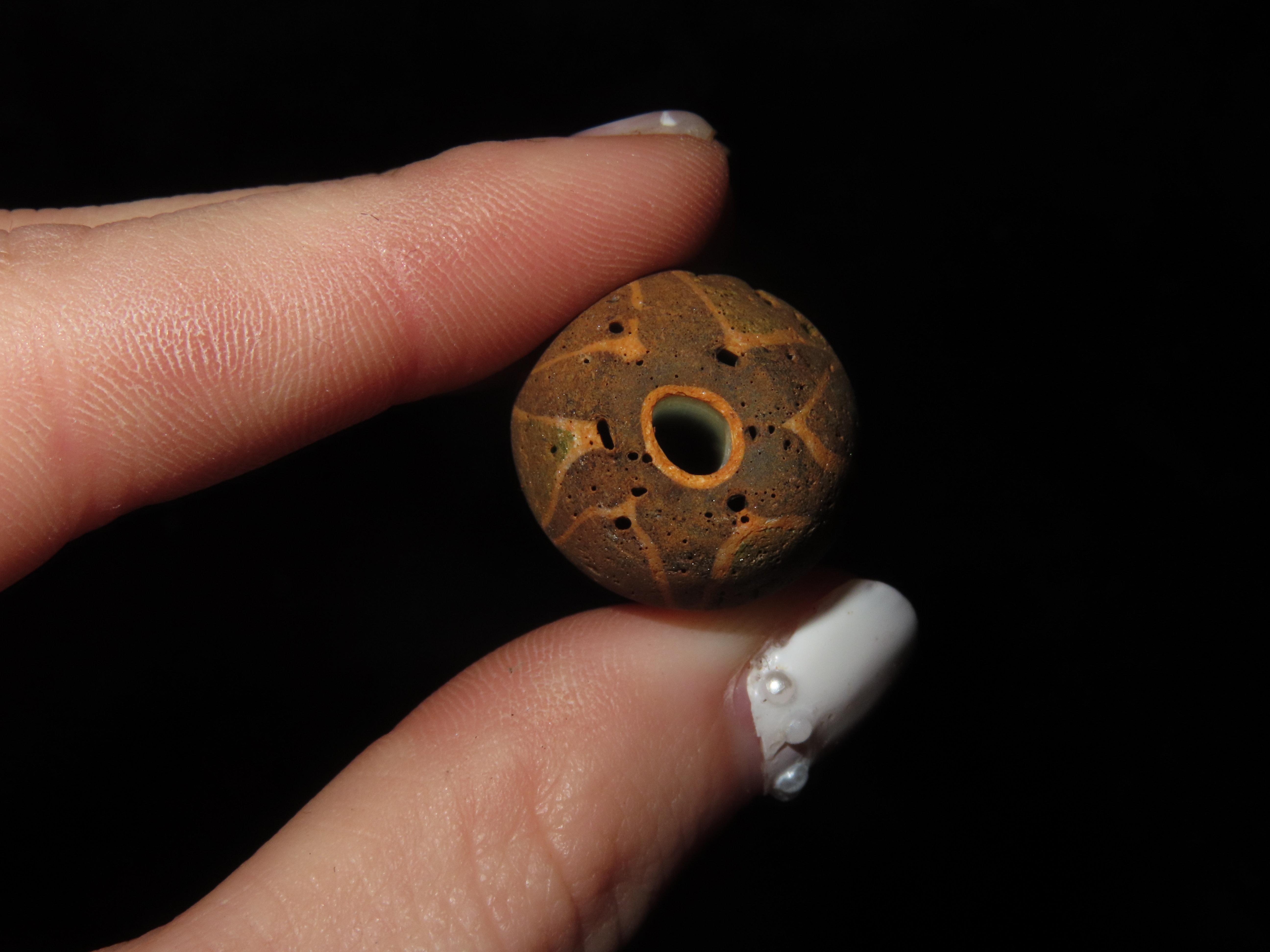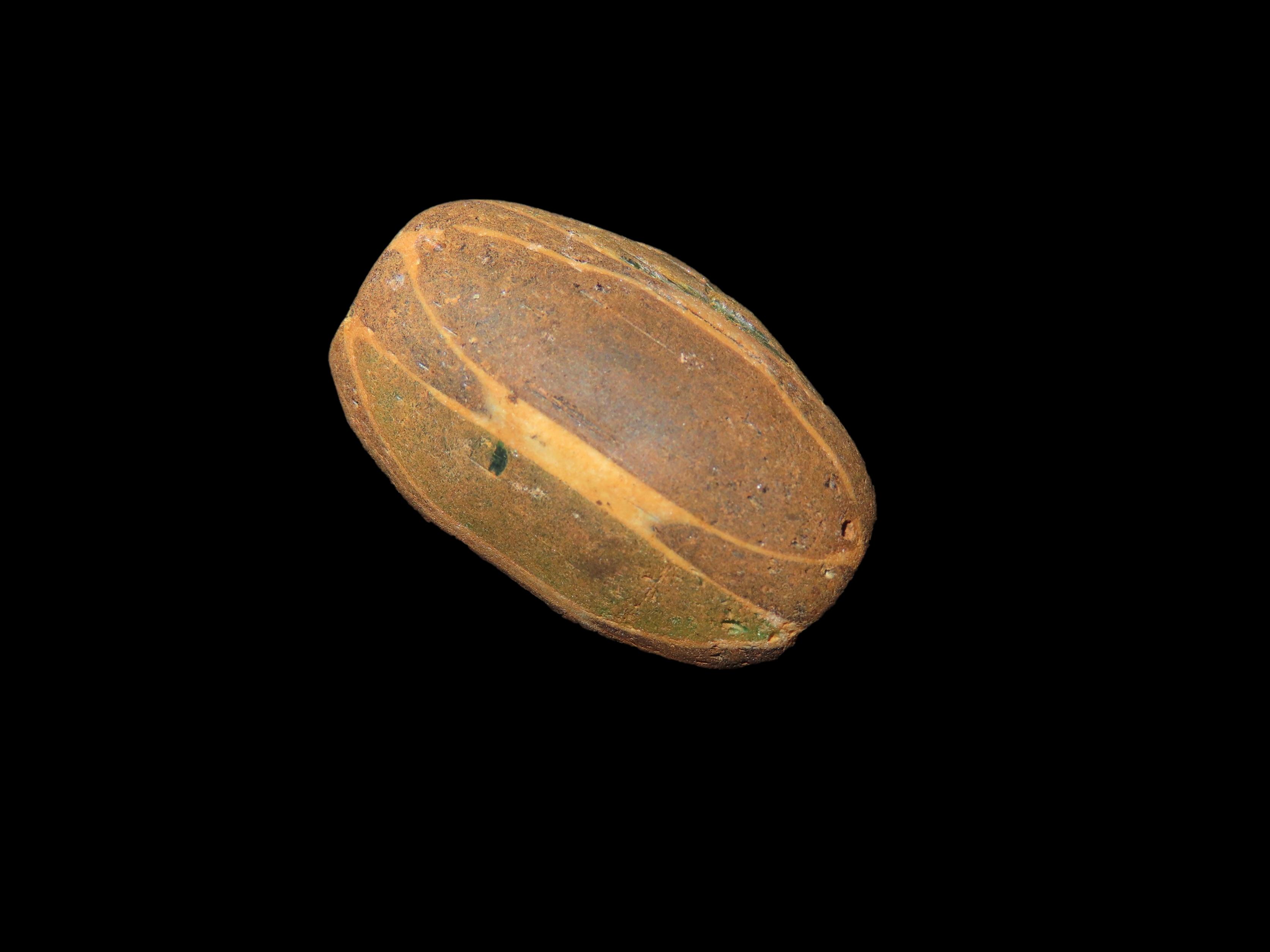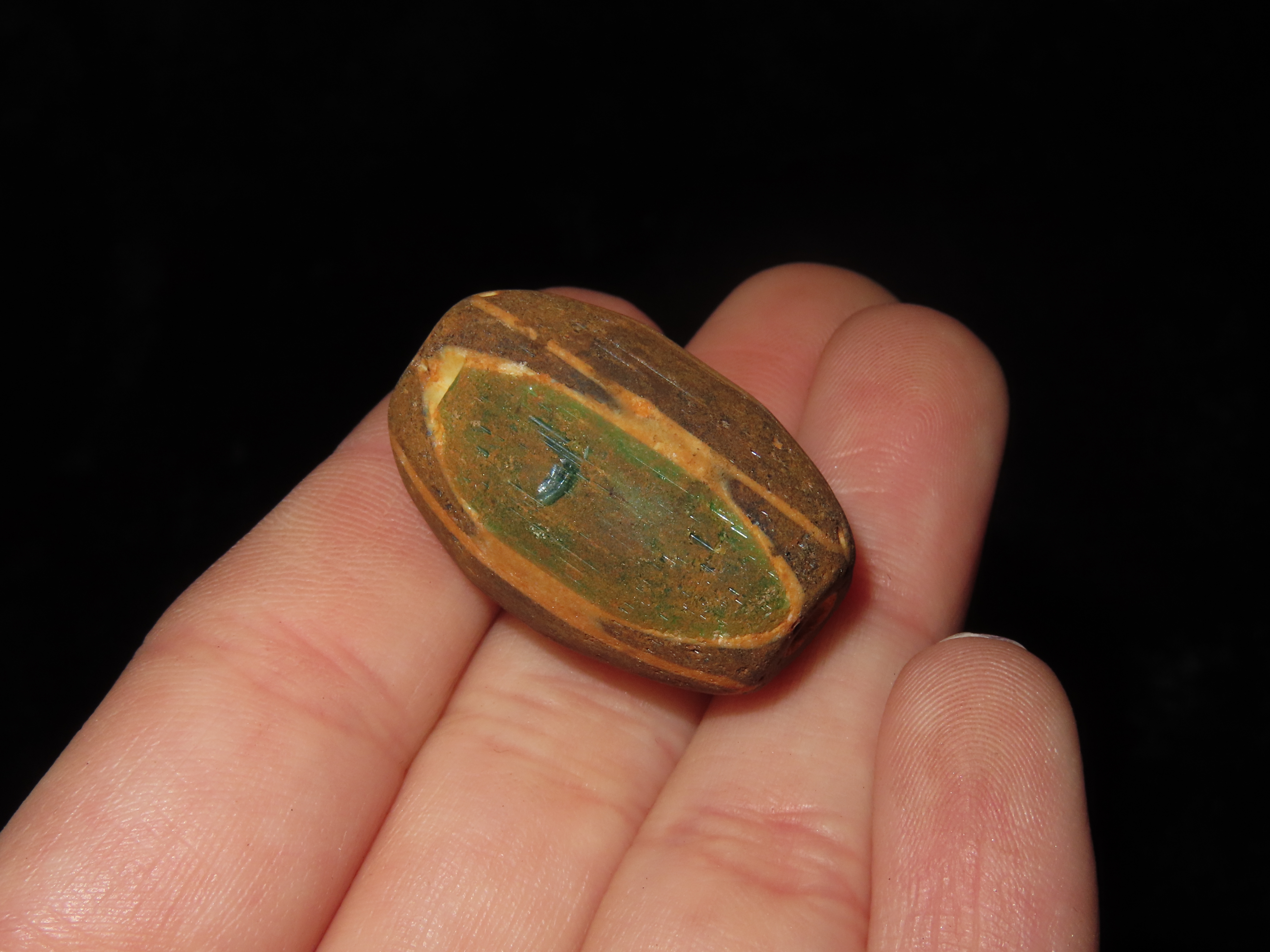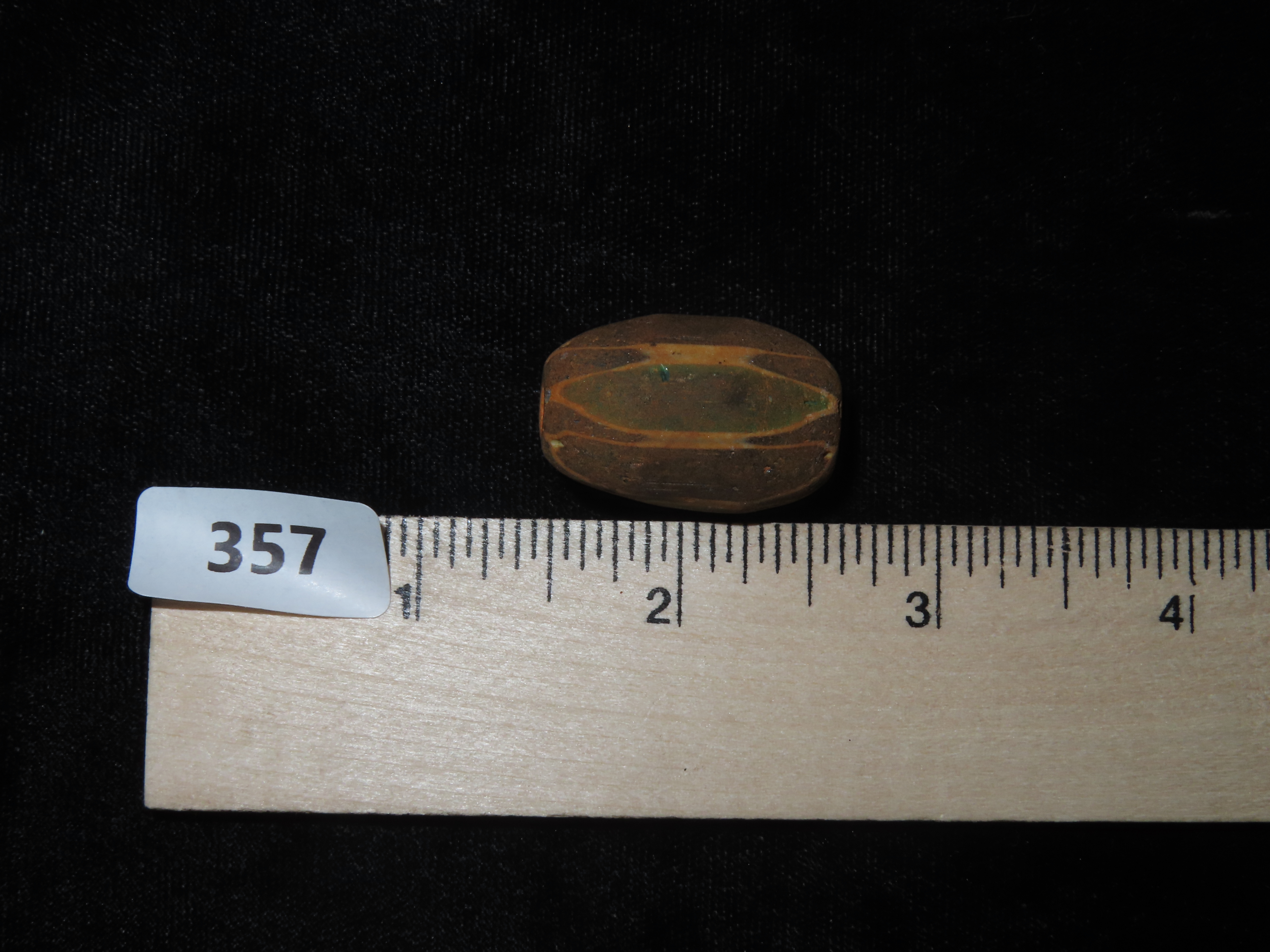 1 1/8″ Large, Antique Chevron Bead. Green, Black and White. Rare Colors.