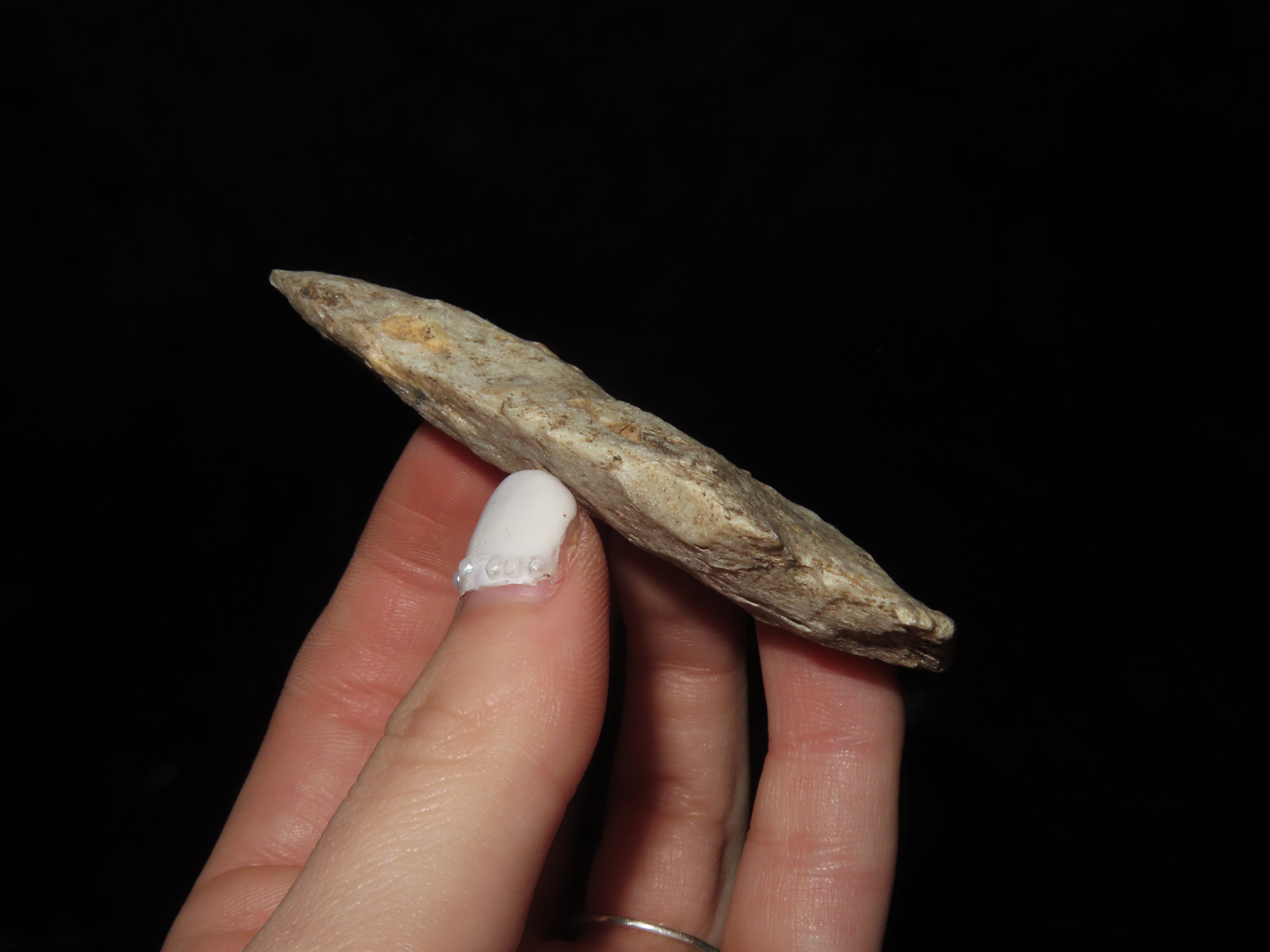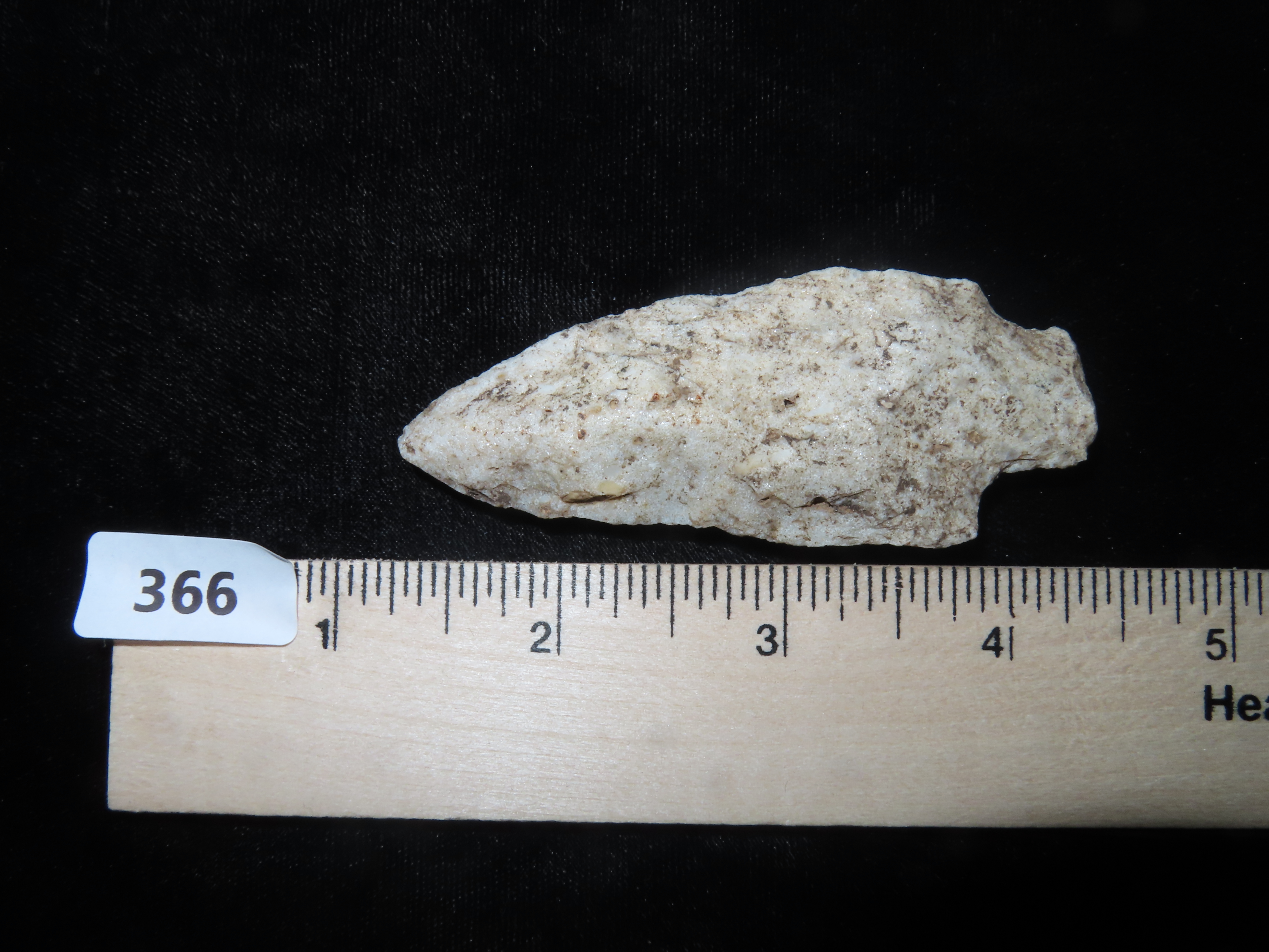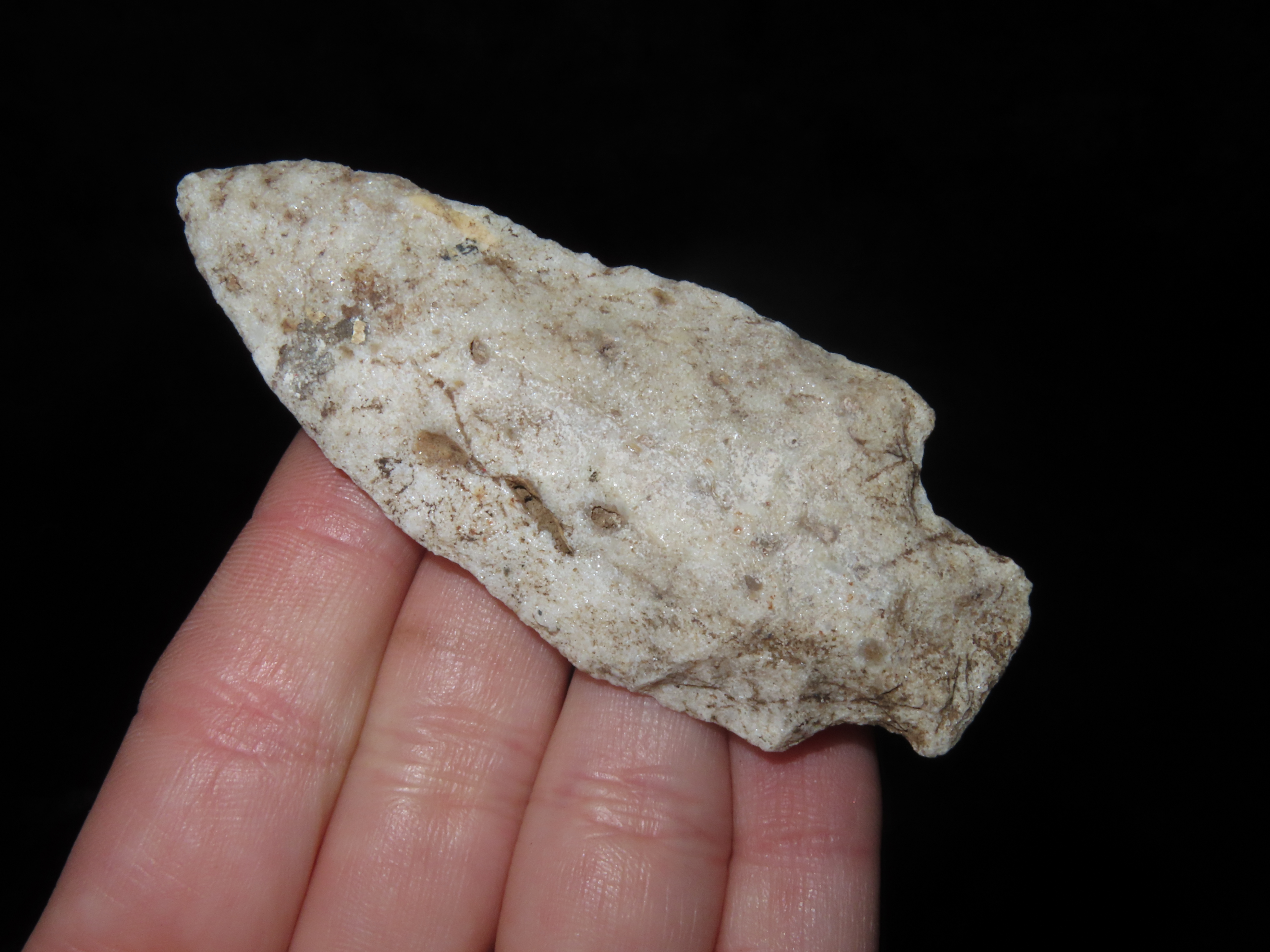 3 1/8″ Quartzite Etley Point. Butler County, Missouri. Found near Poplar Bluff by JJ Smith 1953 – 1978.