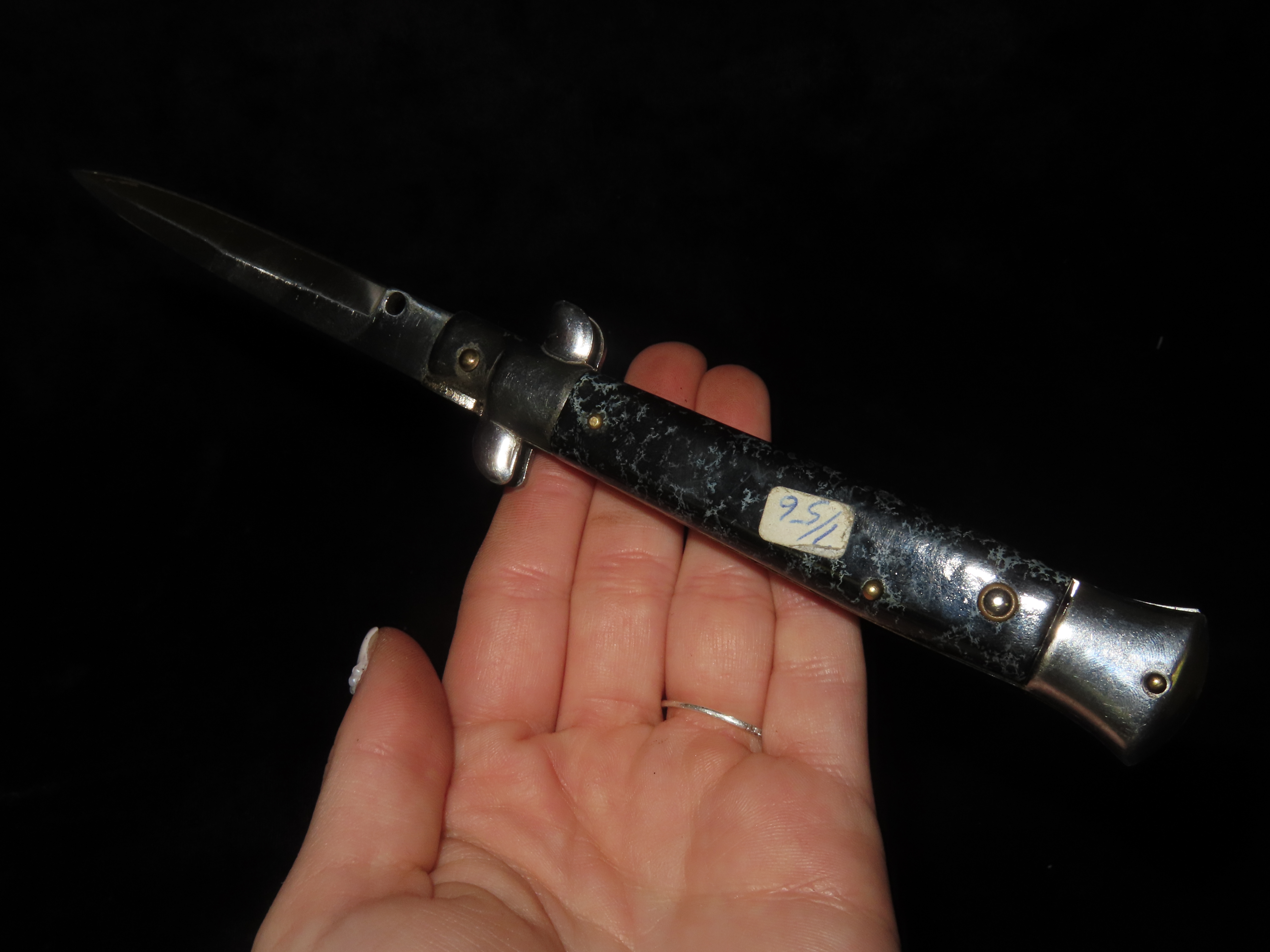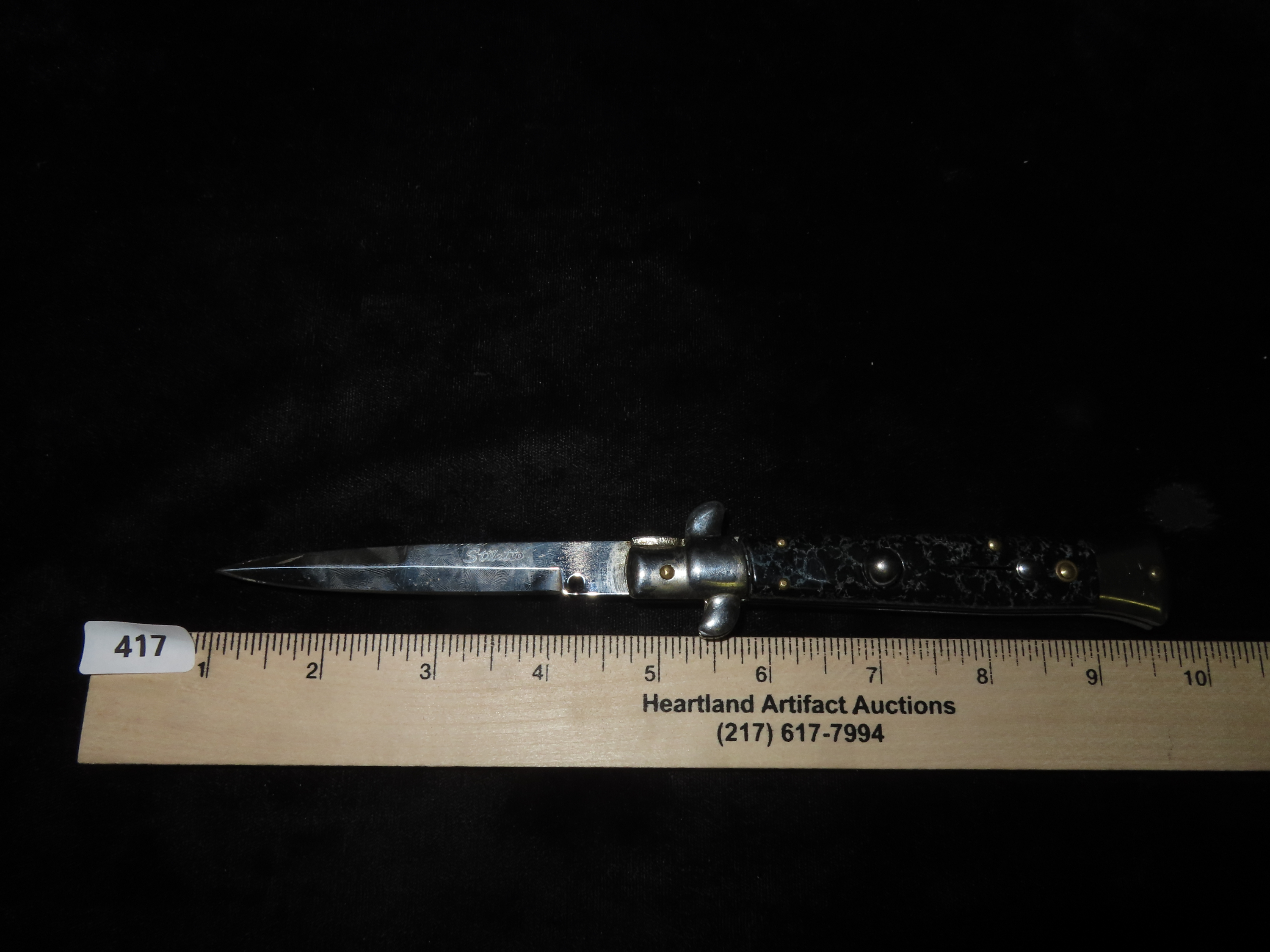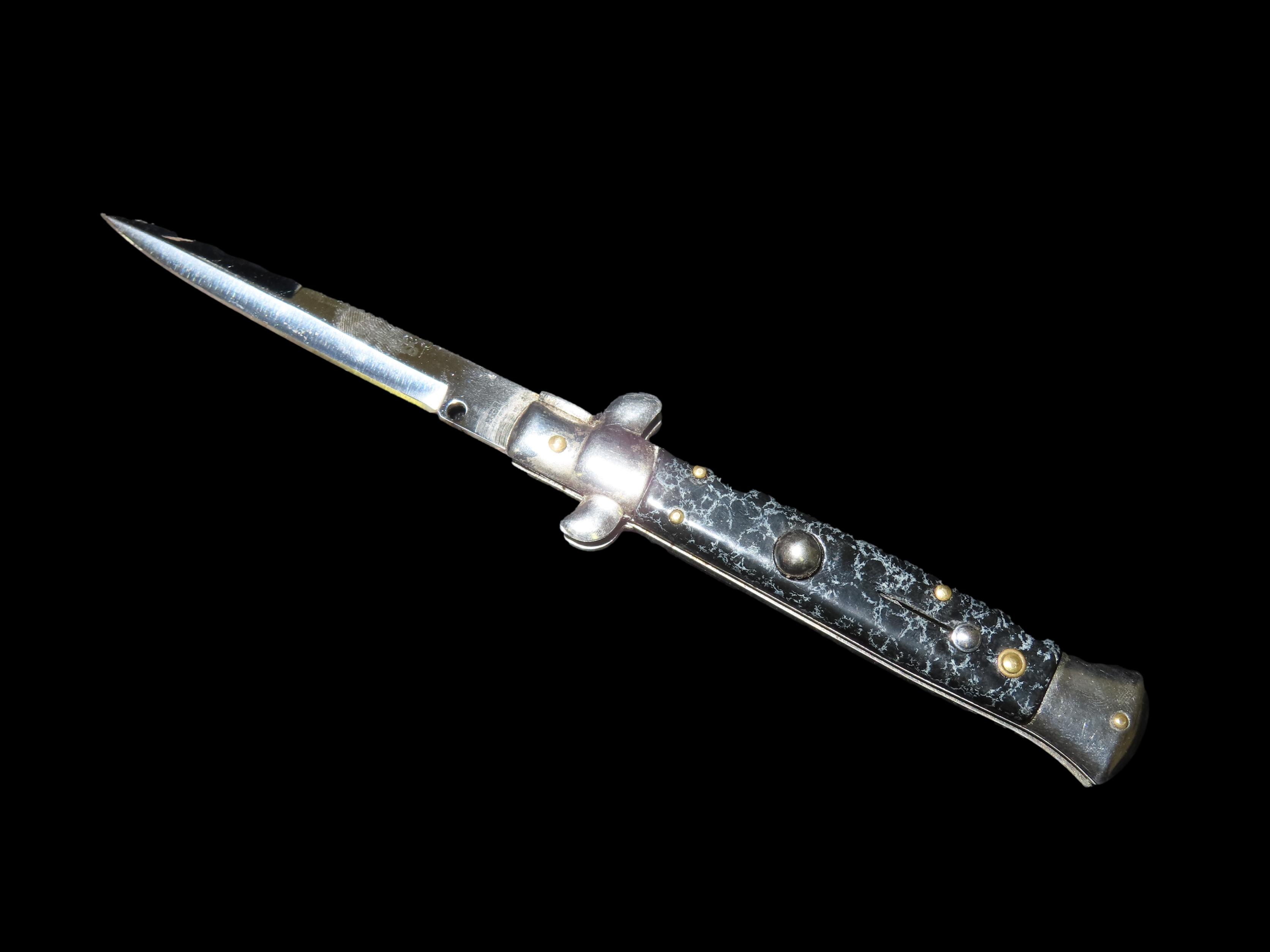 Stiletto Vintage Switch Blade. Total Length 8 5/8″, Blade Length 4 1/4″. Like New. Works Great. Black & Blueish Grey Handle.