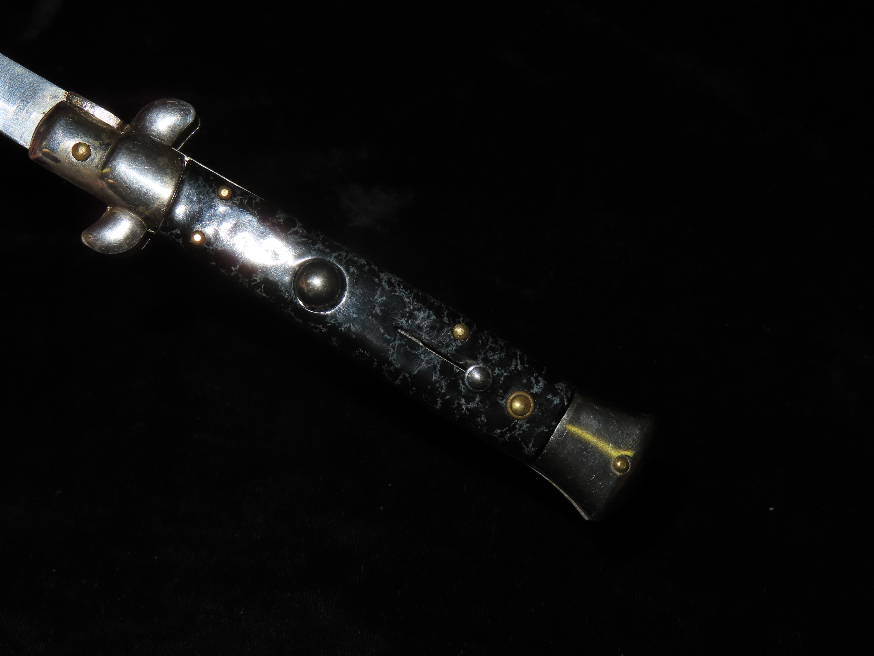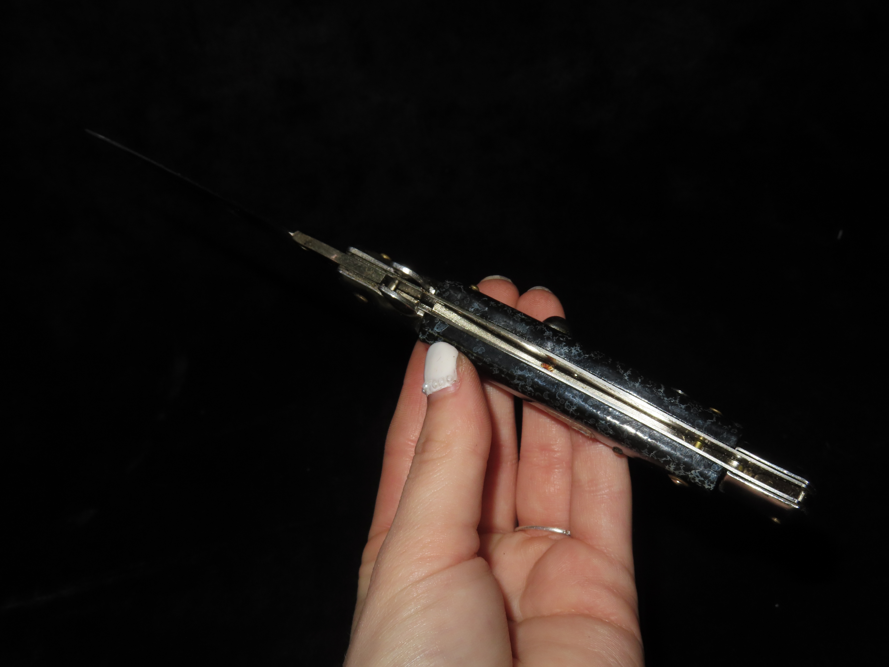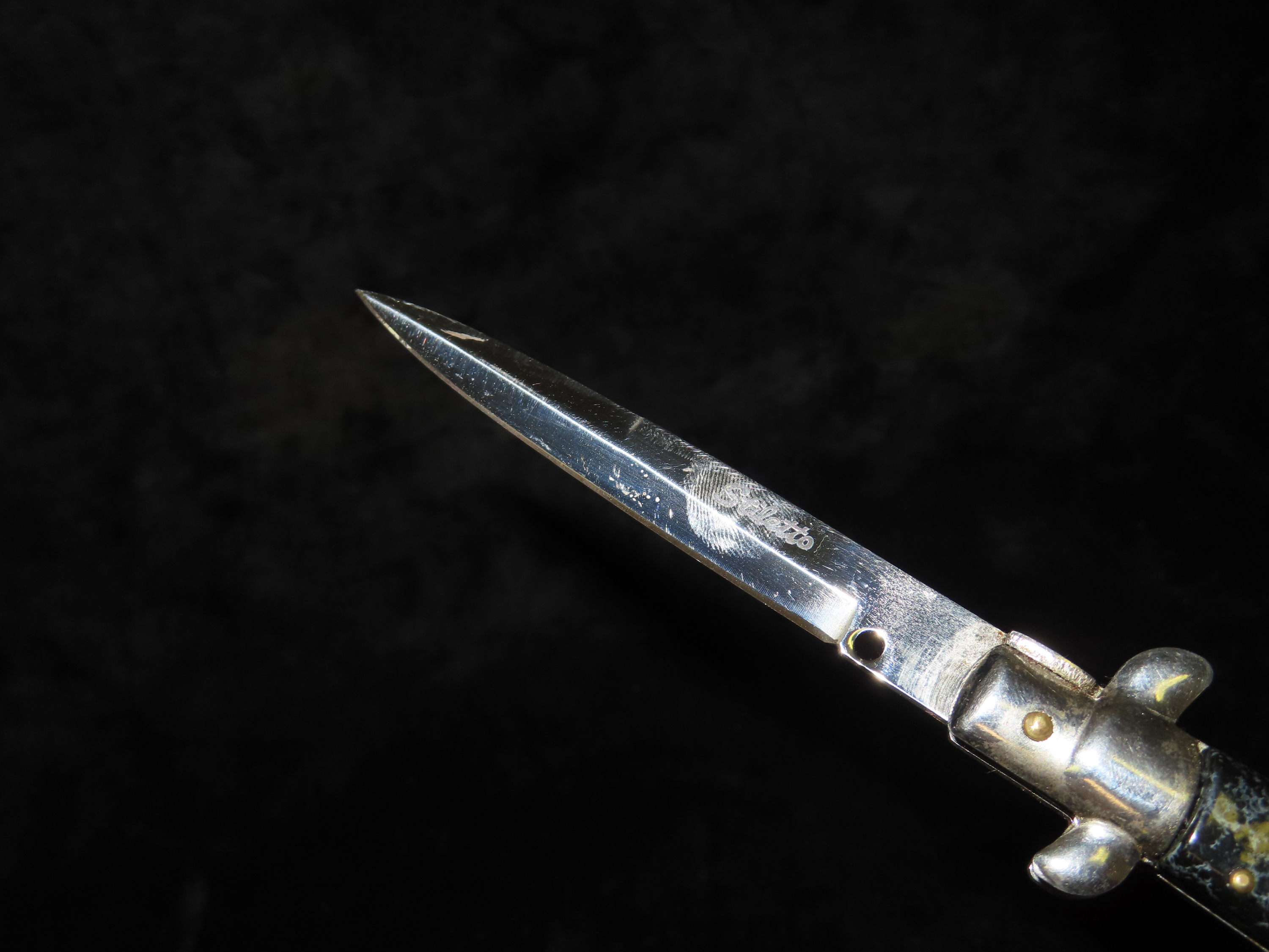 Stiletto Vintage Switch Blade. Total Length 8 5/8″, Blade Length 4 1/4″. Like New. Works Great. Black & Blueish Grey Handle.