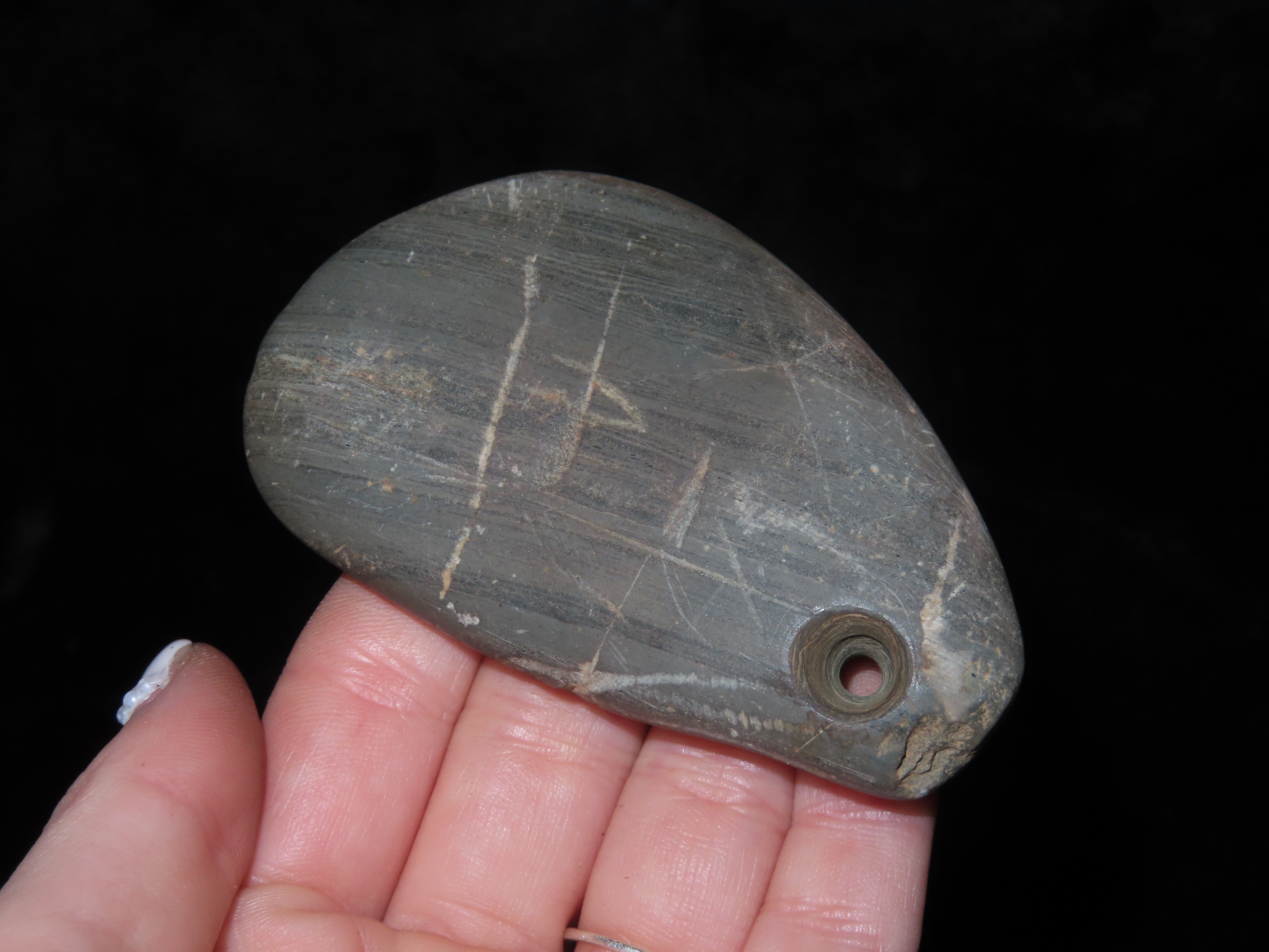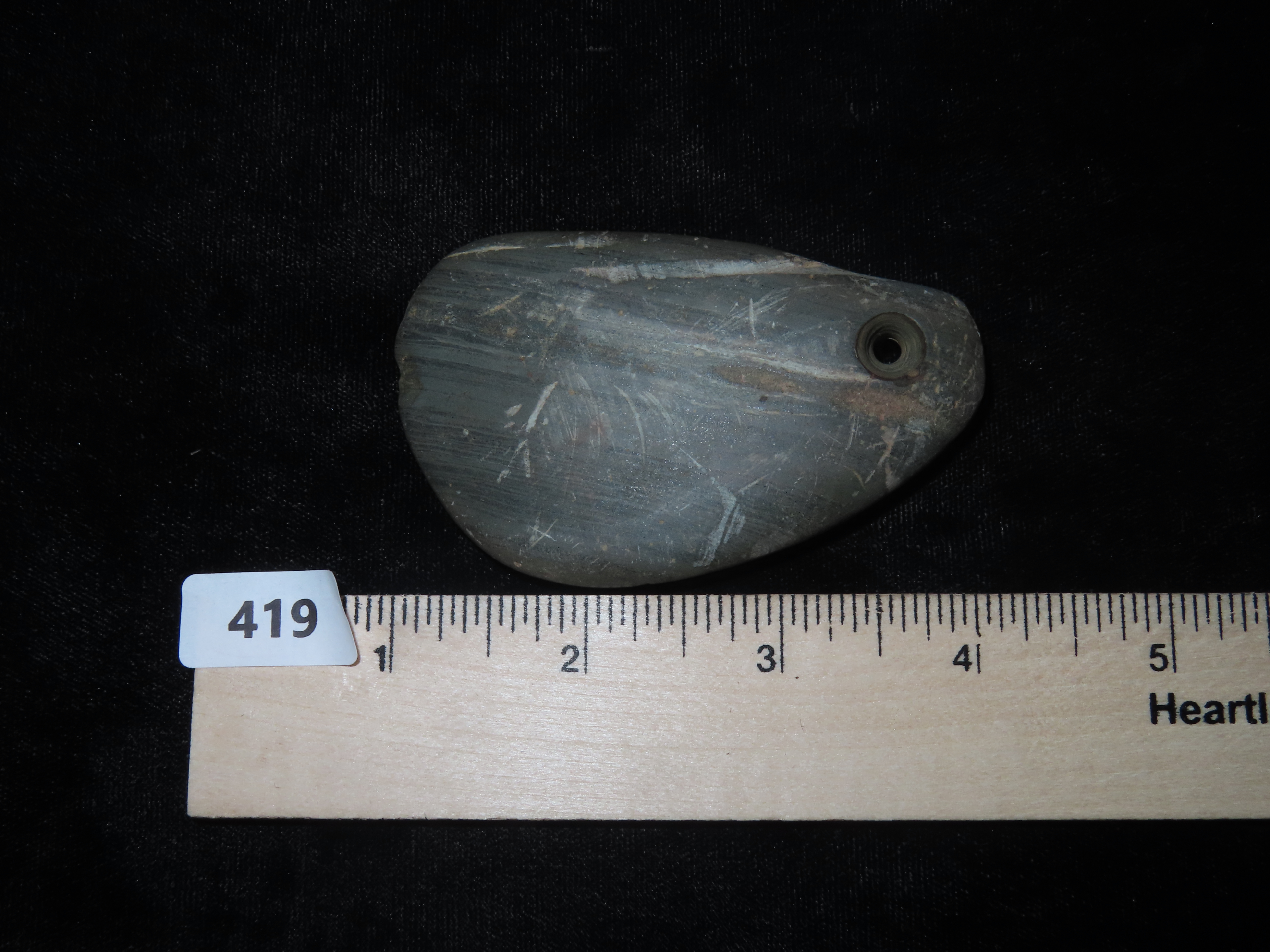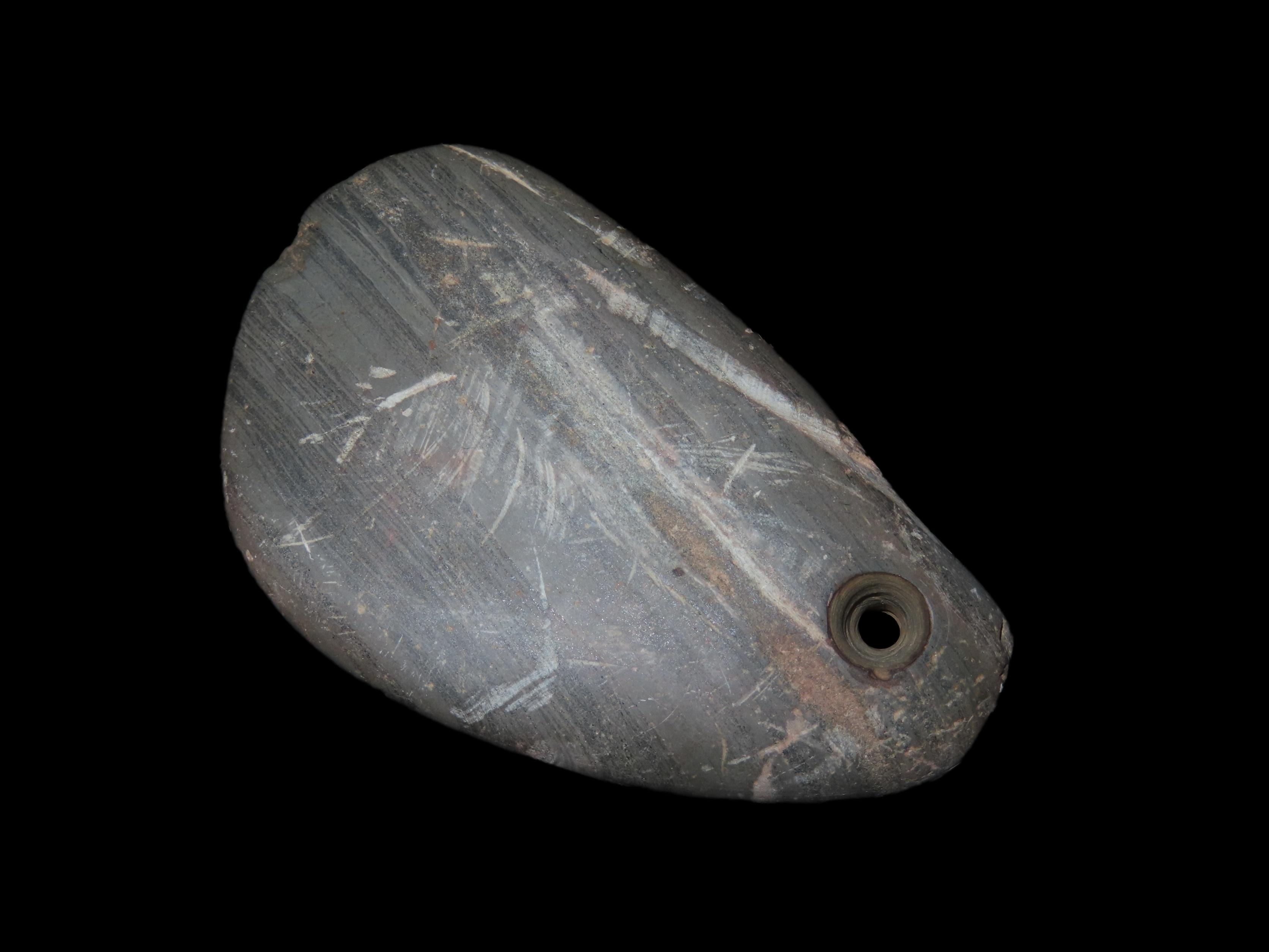 3 1/8″ x 2 1/16″ Banded Slate Pendant. Calhoune County, Illinois near Batchtown.