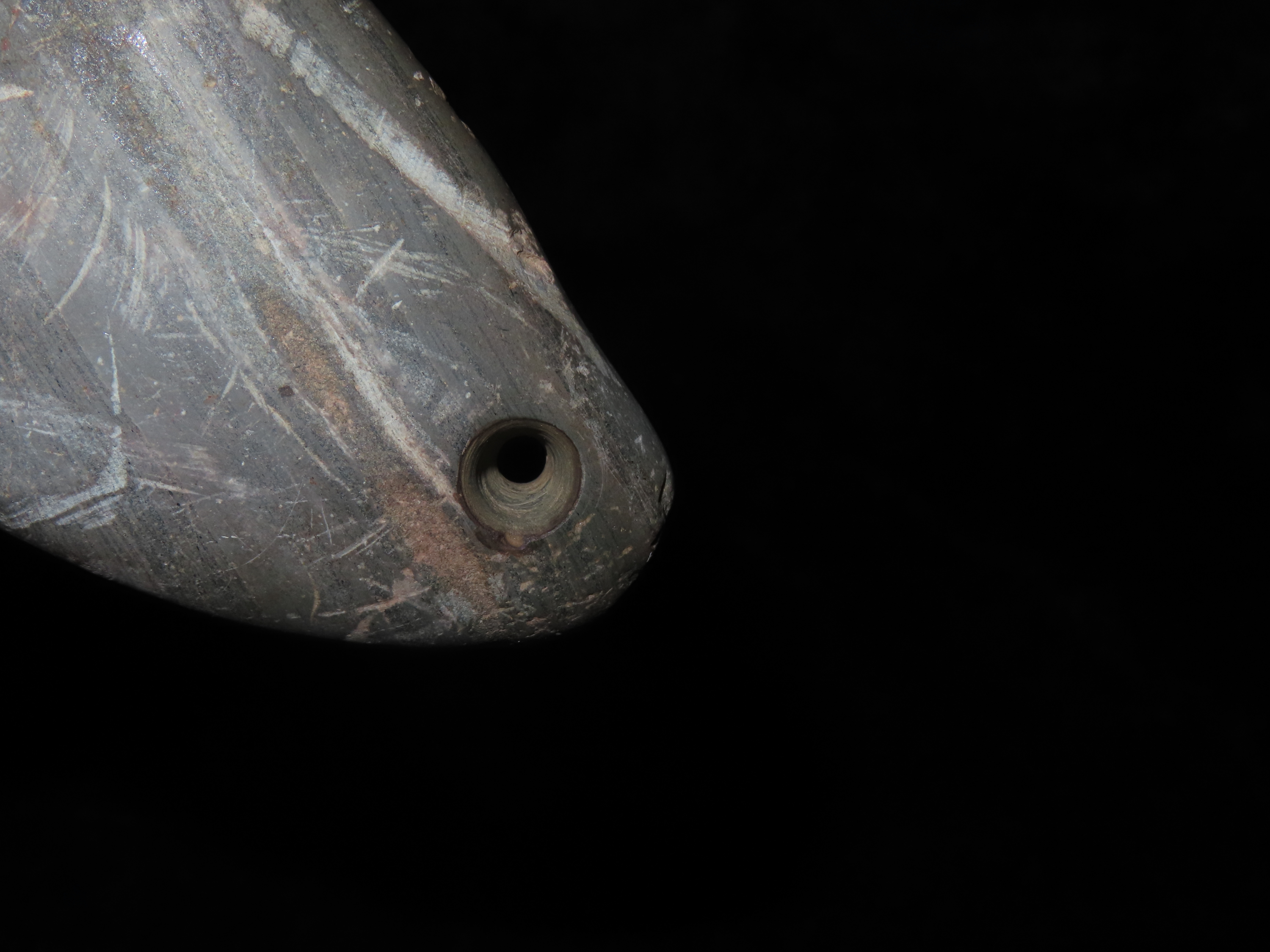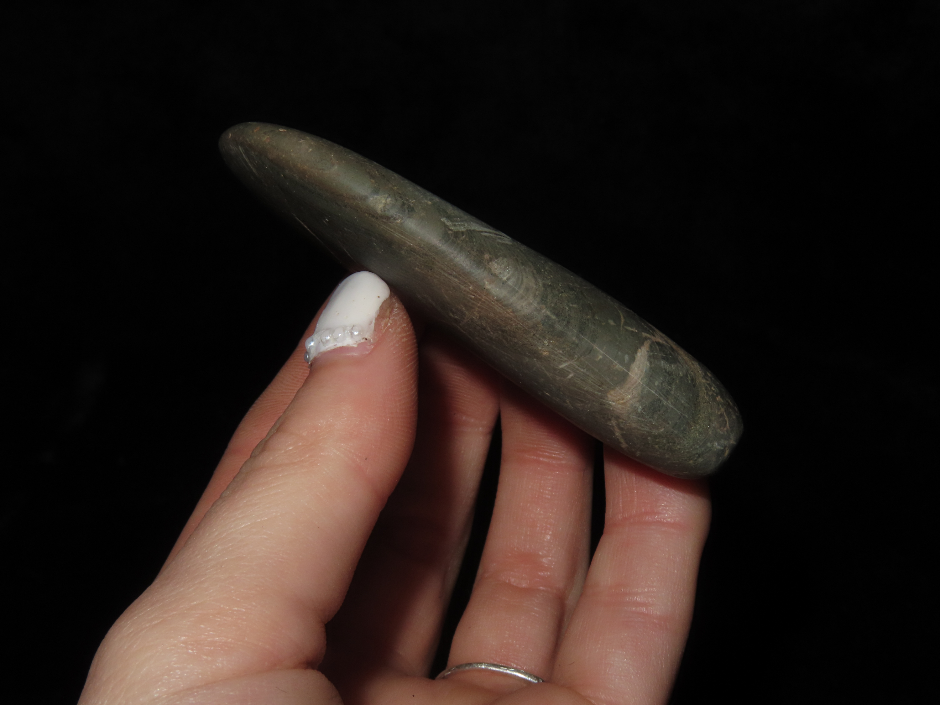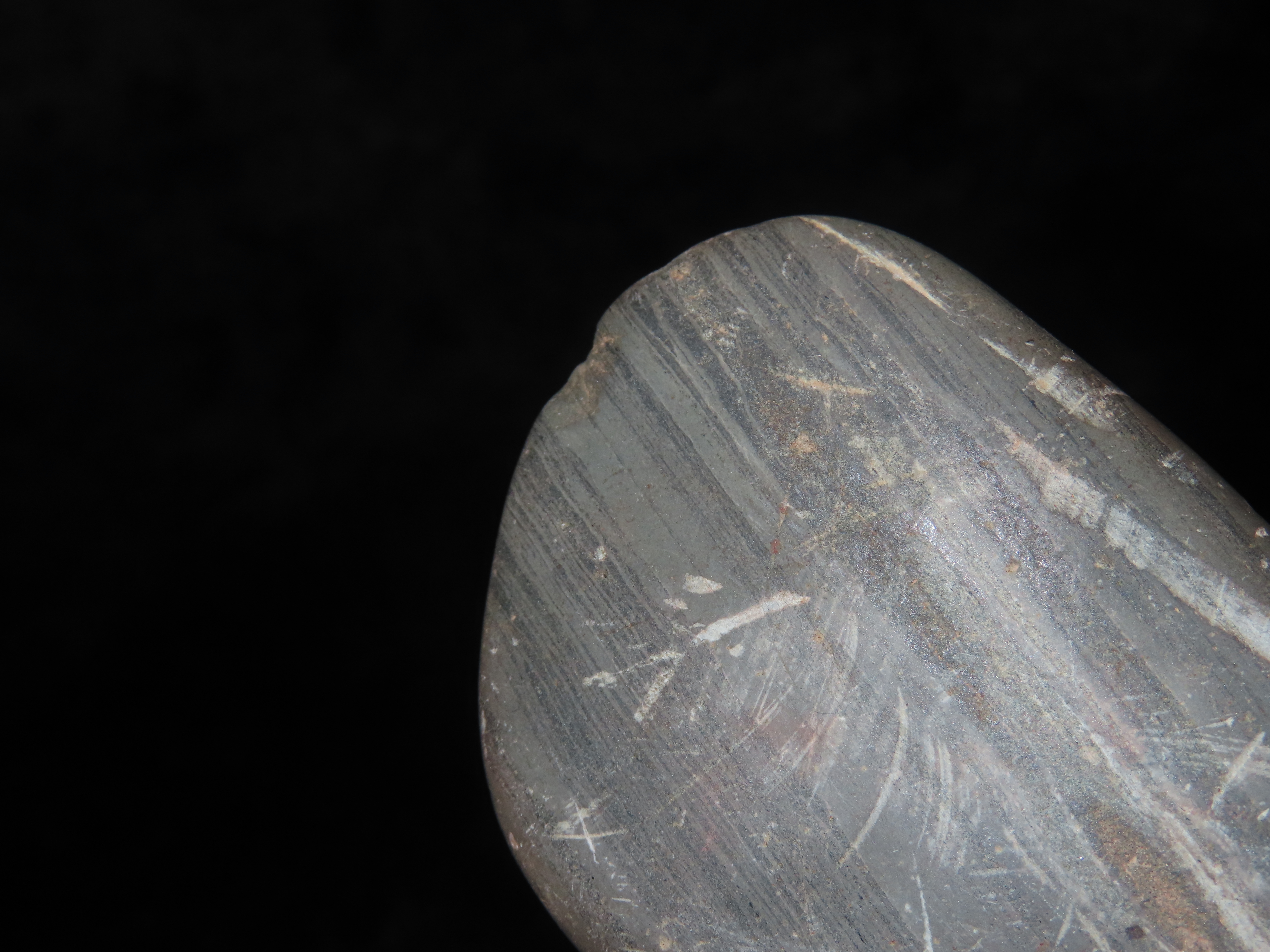3 1/8″ x 2 1/16″ Banded Slate Pendant. Calhoune County, Illinois near Batchtown.