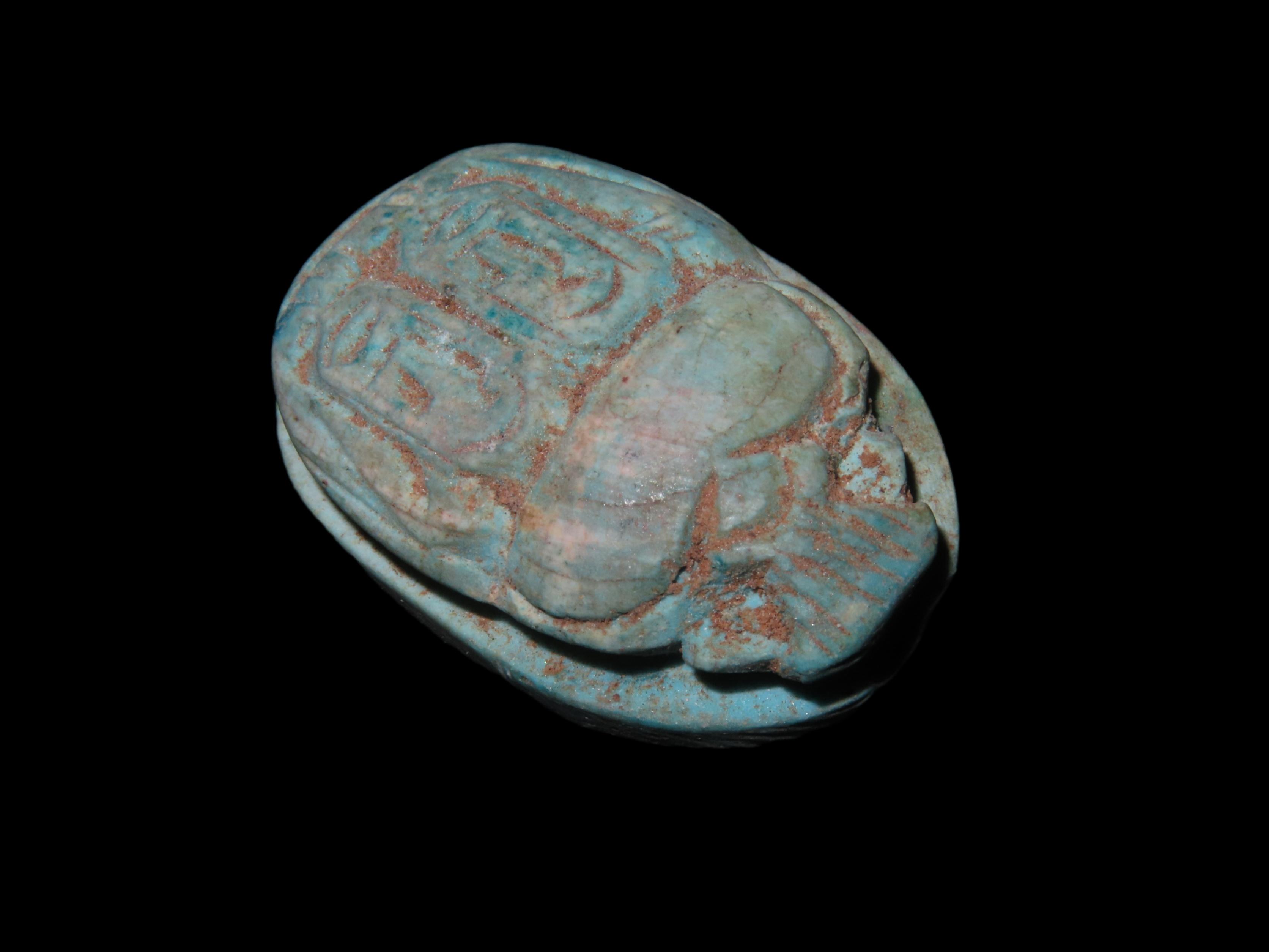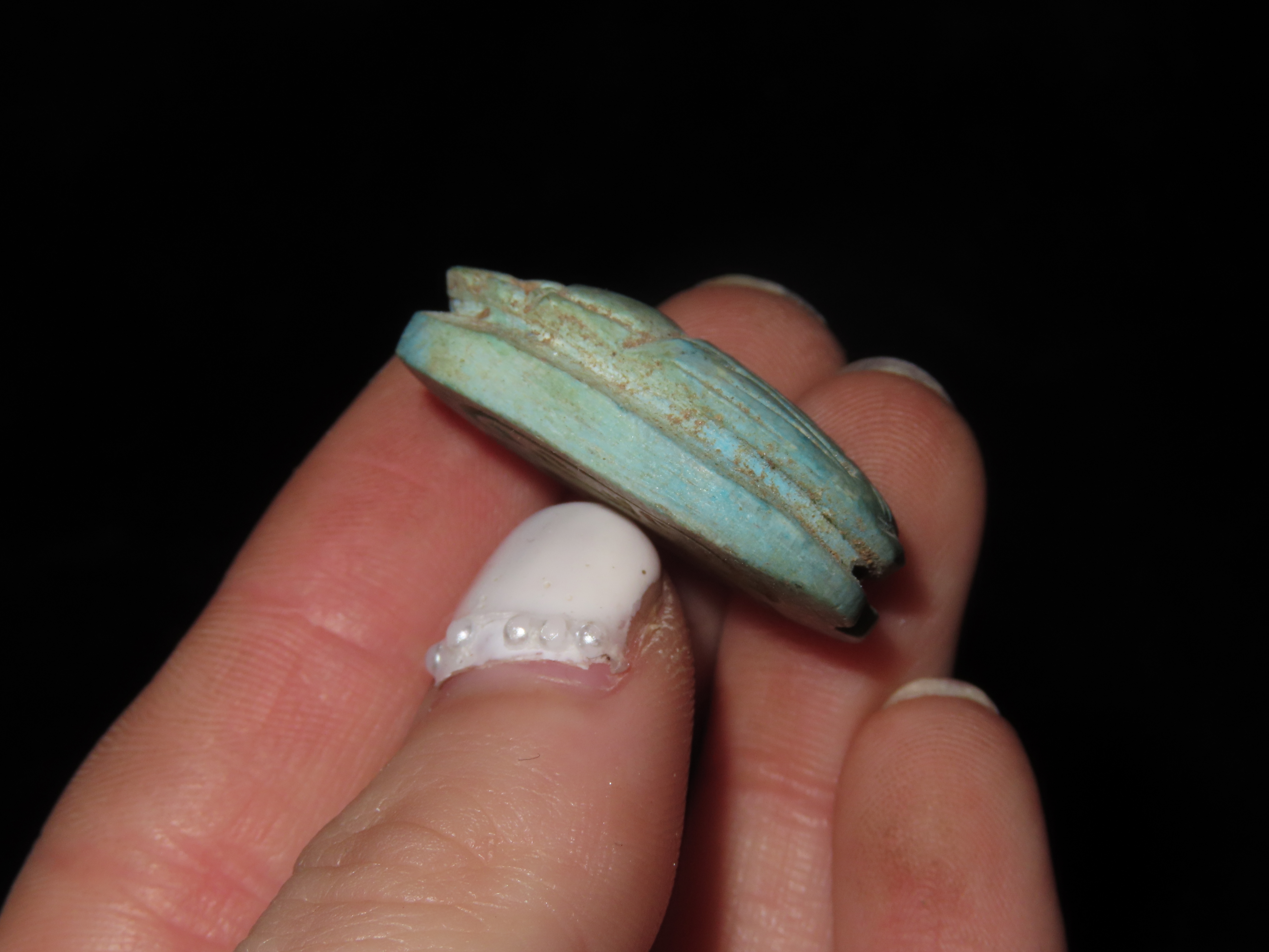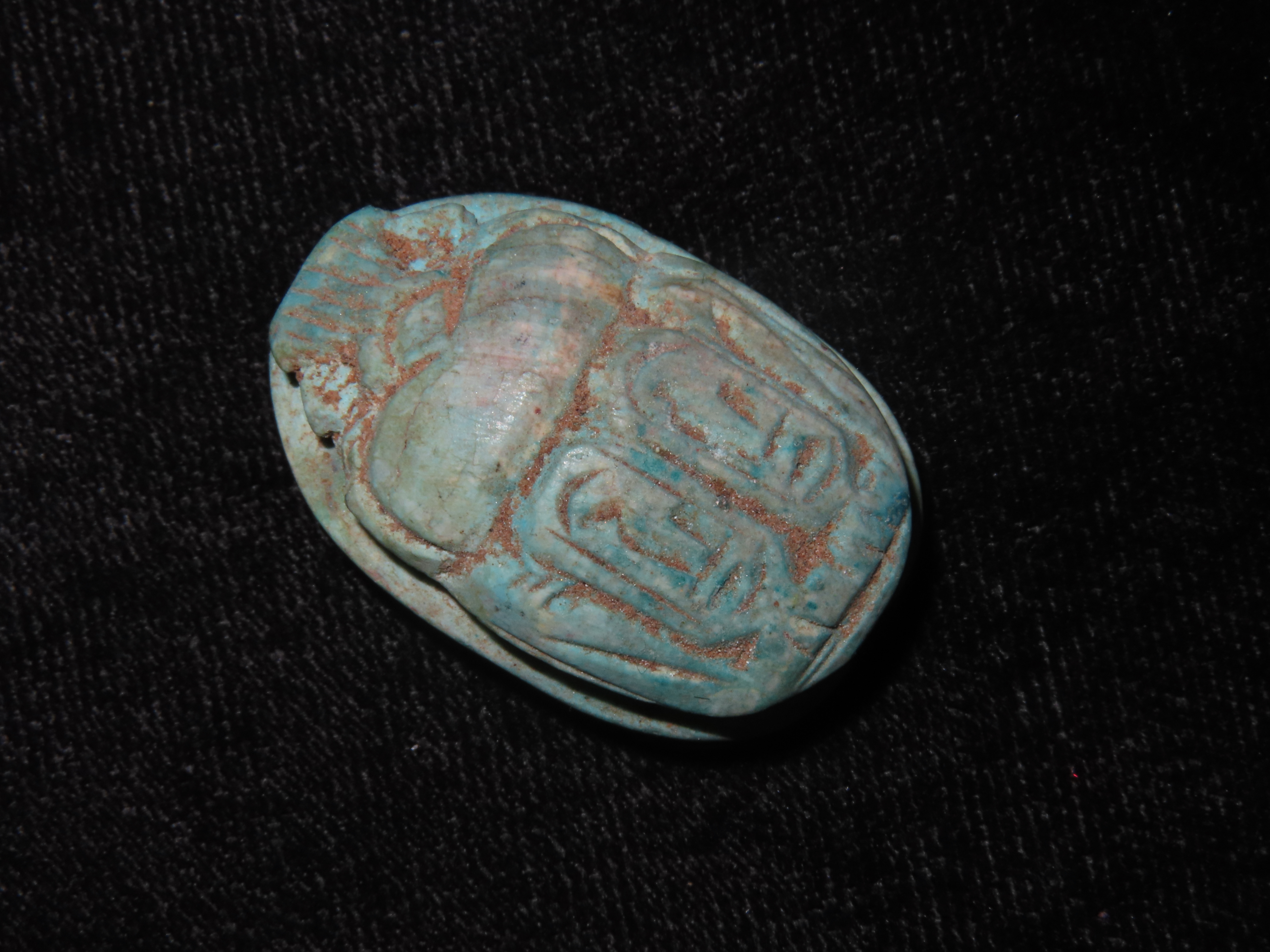 1 1/4″ Antique, Ancient Egyptian Scarb Beetle Amulet. Carved Hieroglyphs on Top and bottom. 26th Dynasty. 664 – 525 B.C.