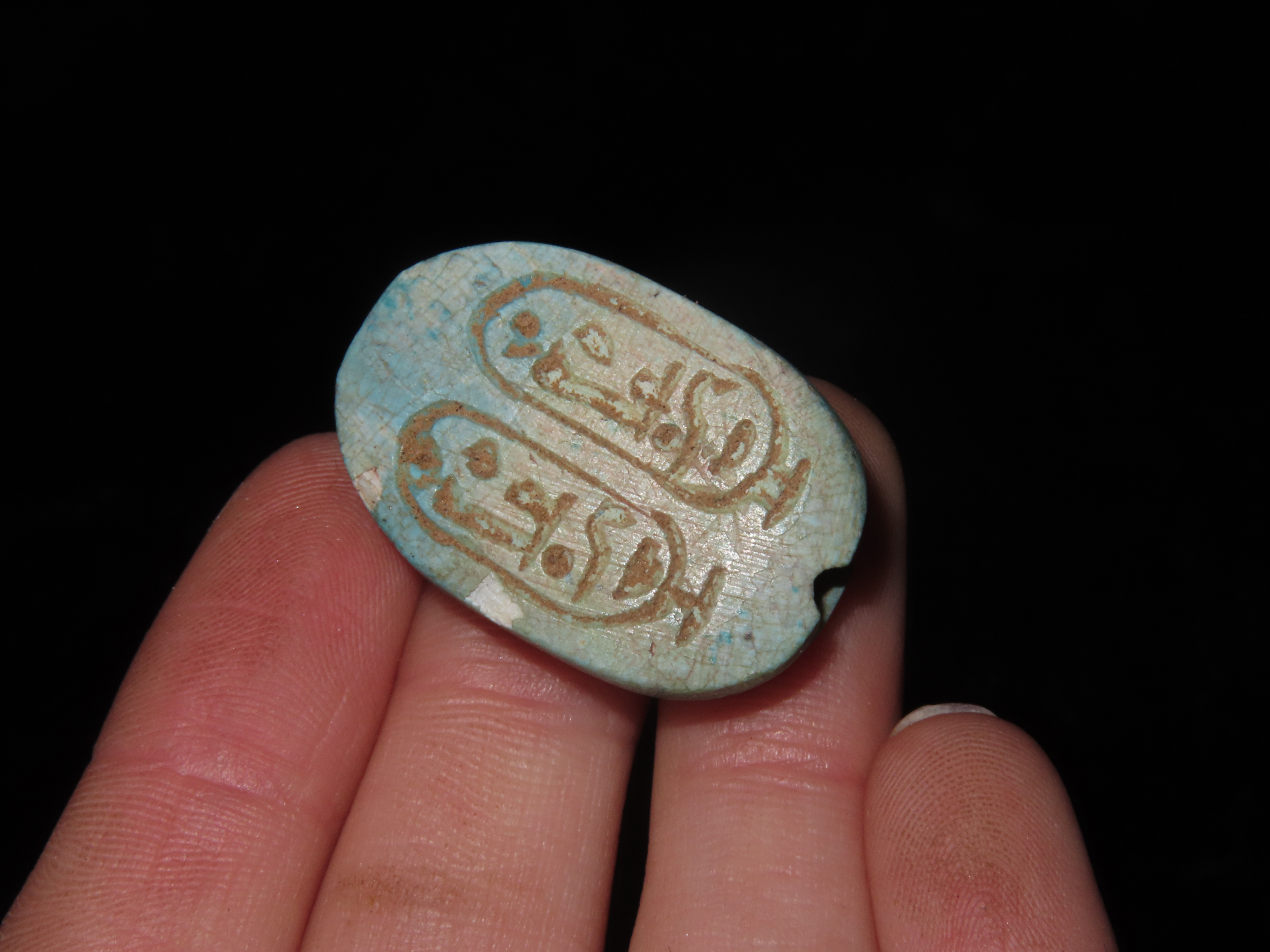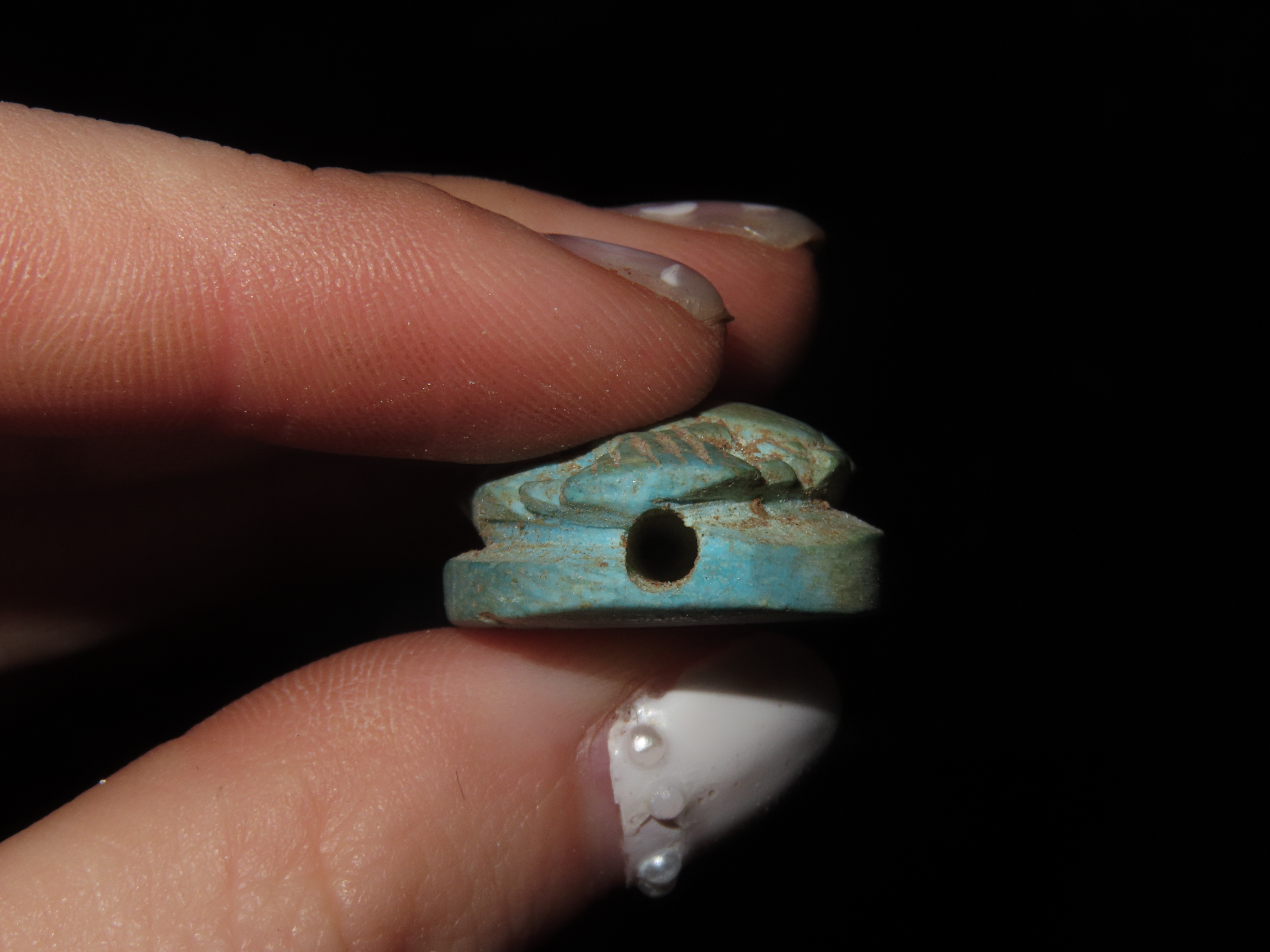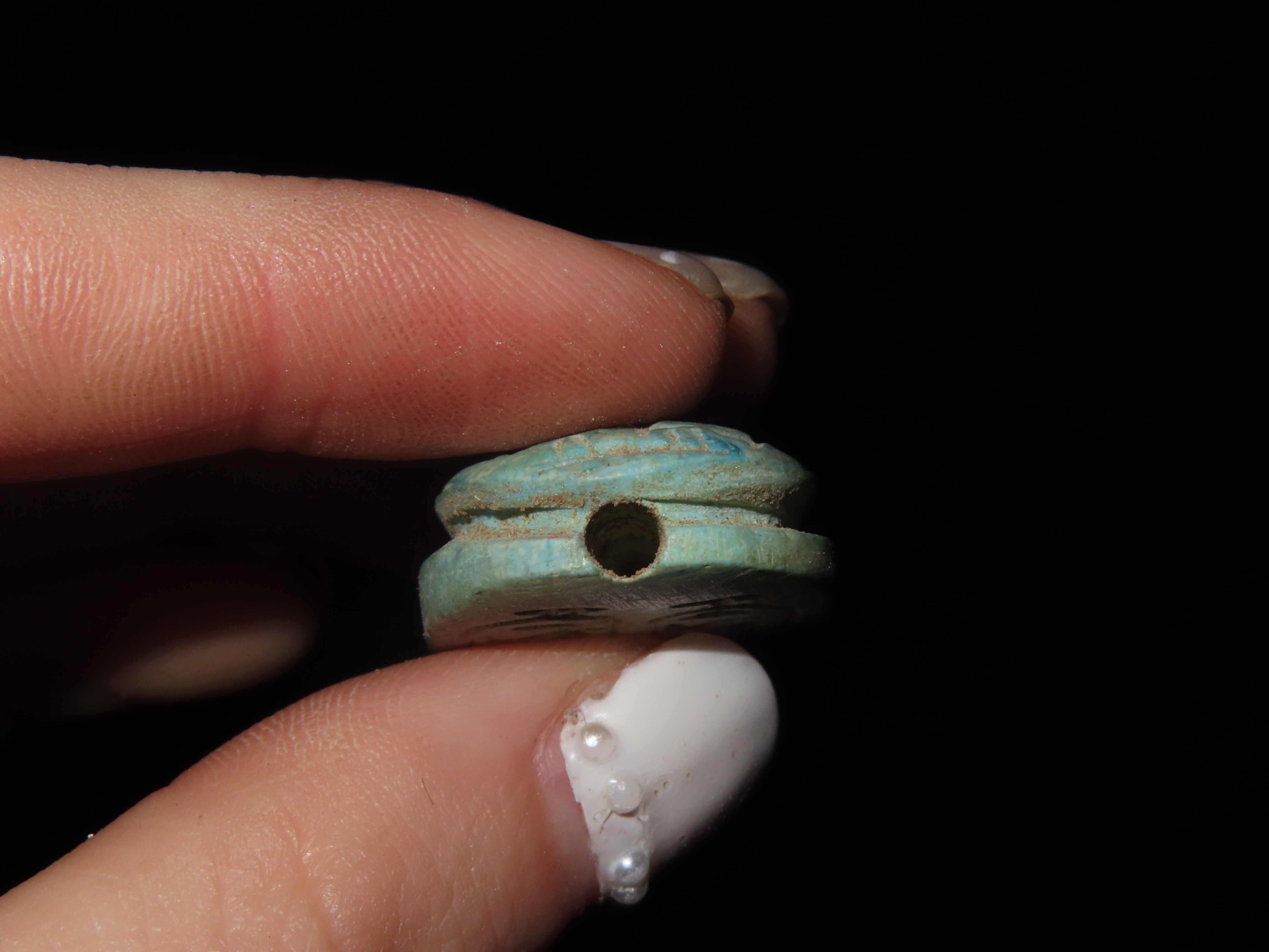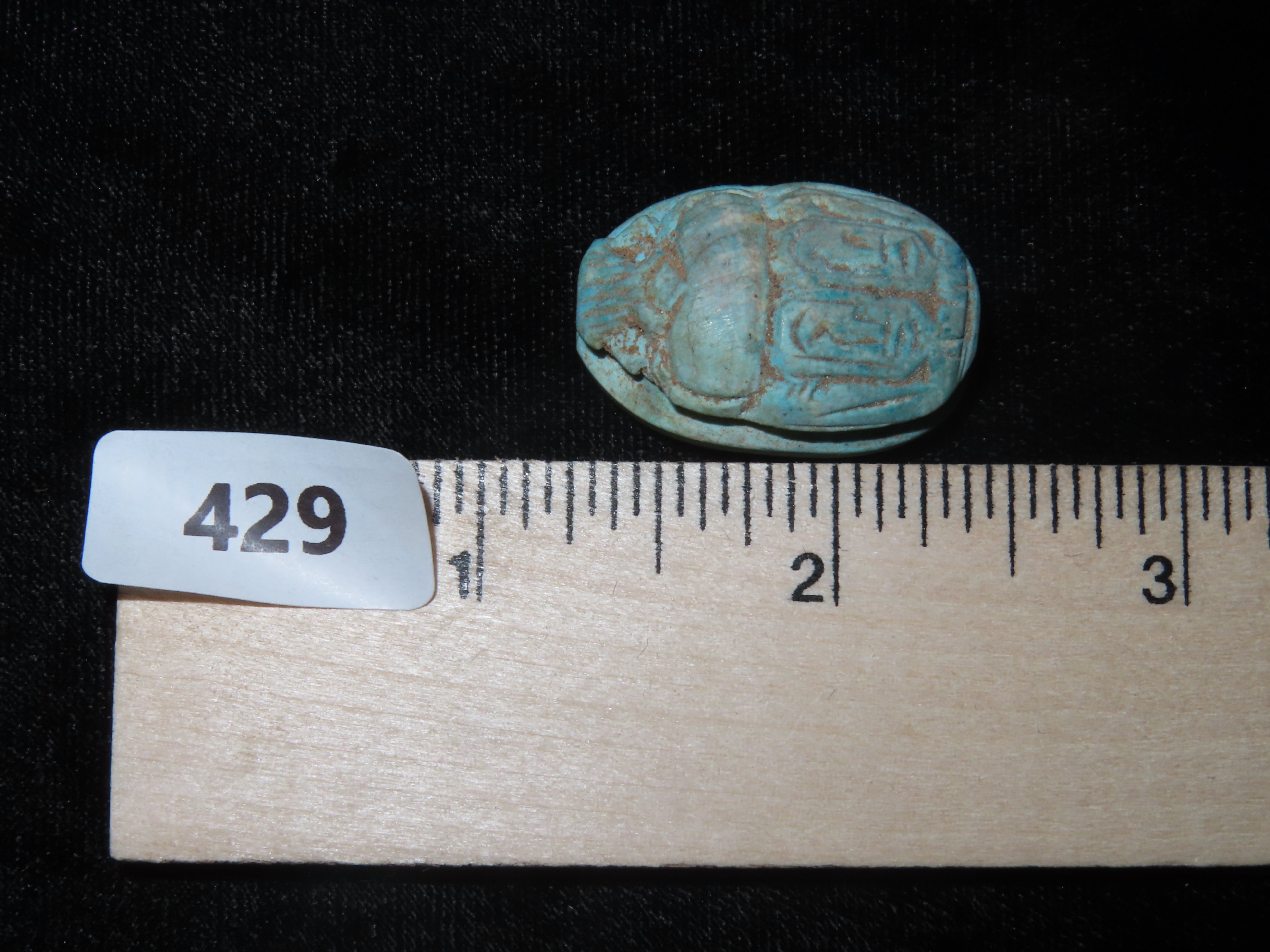 1 1/4″ Antique, Ancient Egyptian Scarb Beetle Amulet. Carved Hieroglyphs on Top and bottom. 26th Dynasty. 664 – 525 B.C.