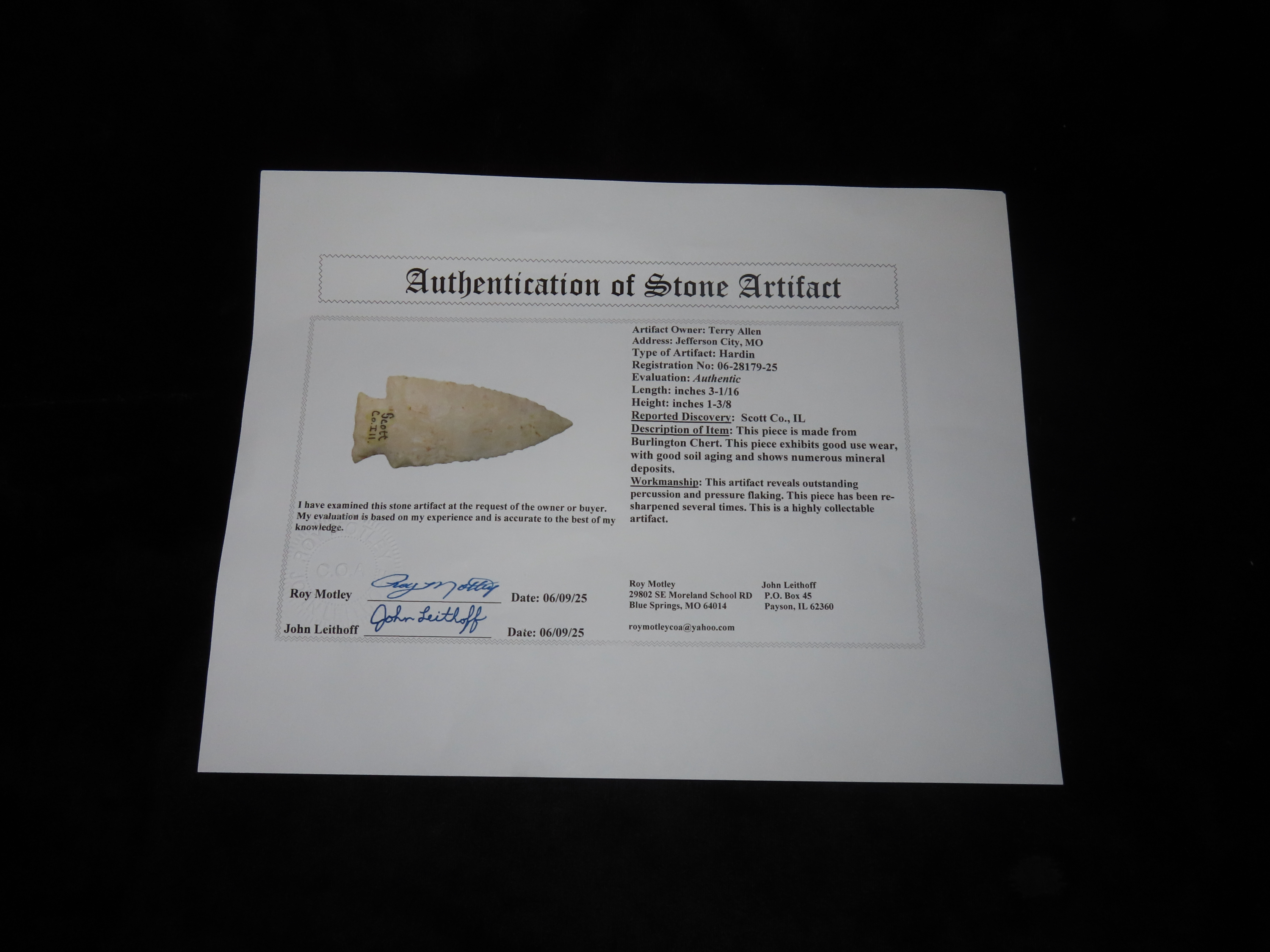 3 1/16″ x 1 3/8″ Hardin, Burlington Chert, Scott Co. Illinois, Motley / Leithoff COA