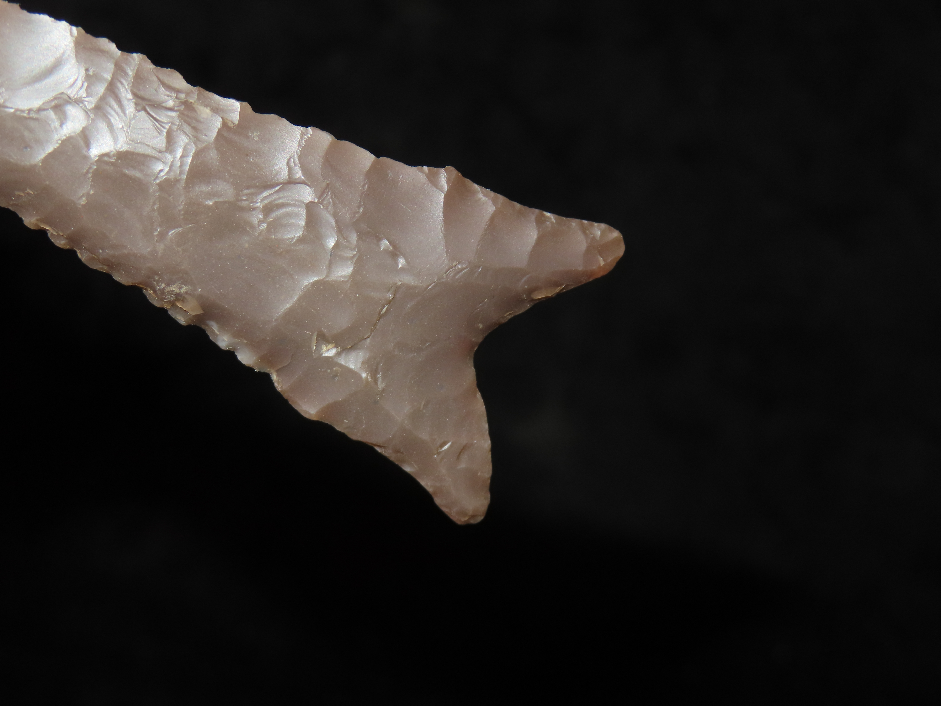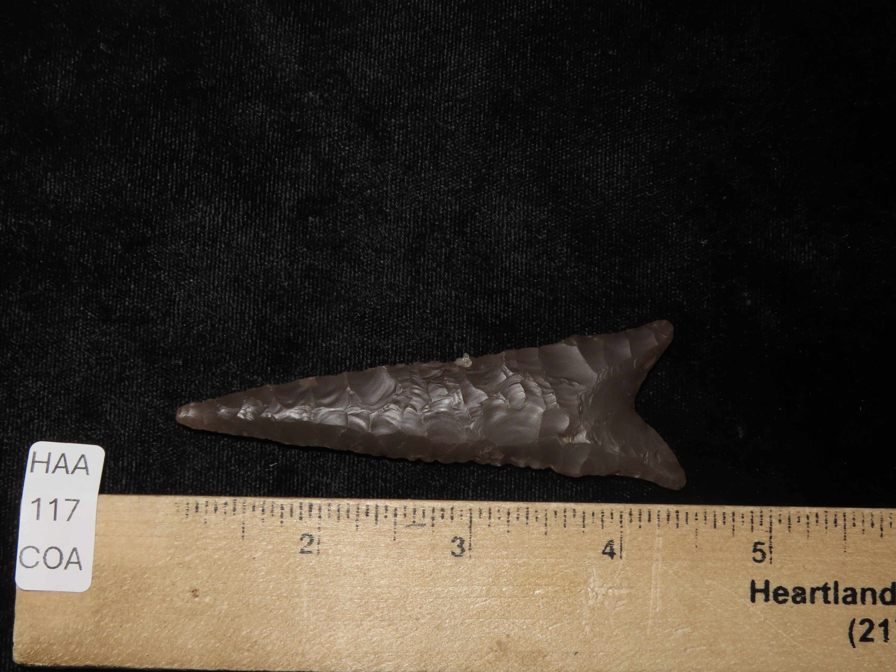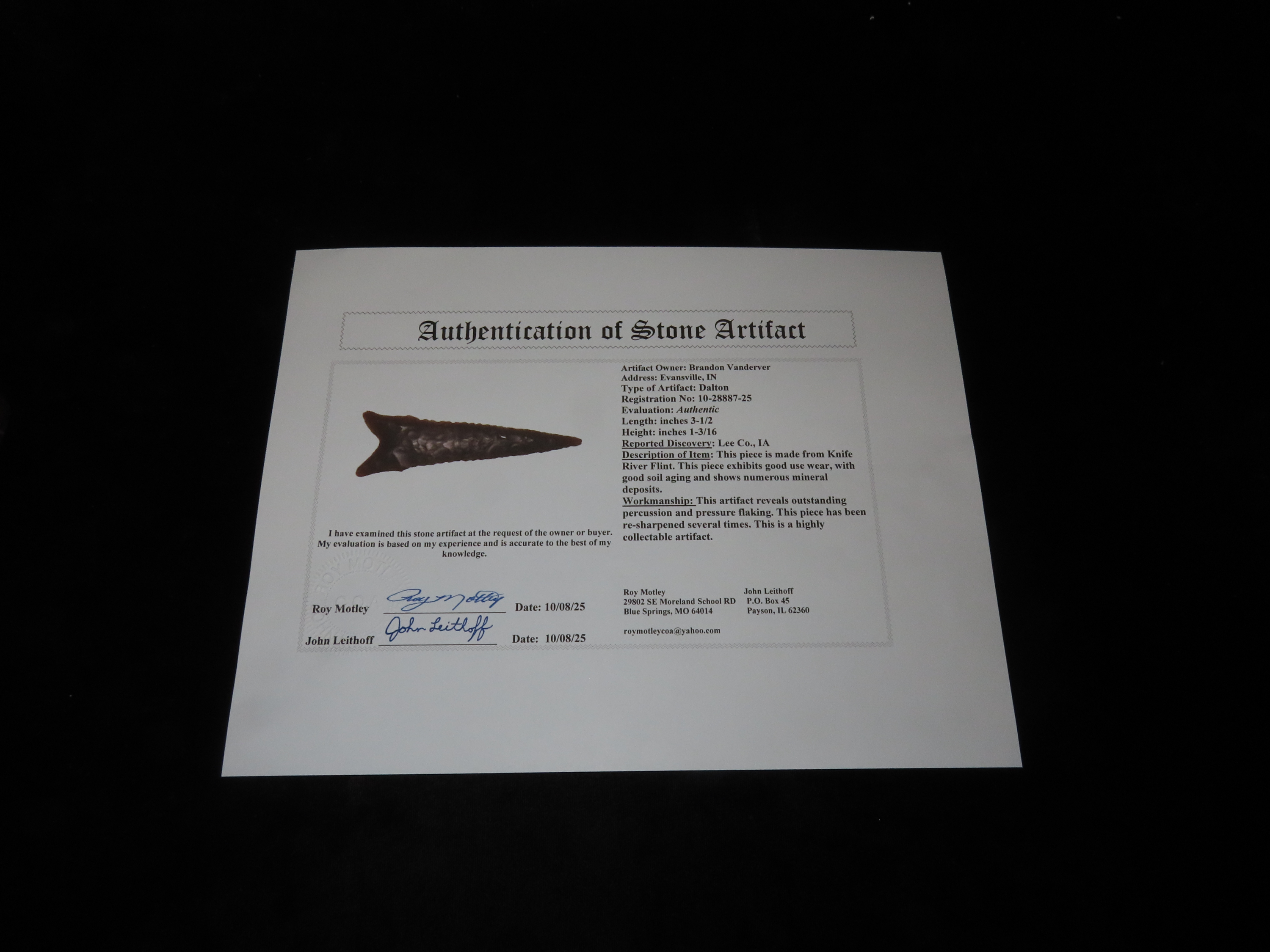 Amazing 3 1/2″ Knife River Flint Dalton, Lee Co. Iowa. Motley COA. Highly Transucent example, nice classic form, thin and very well flaked.