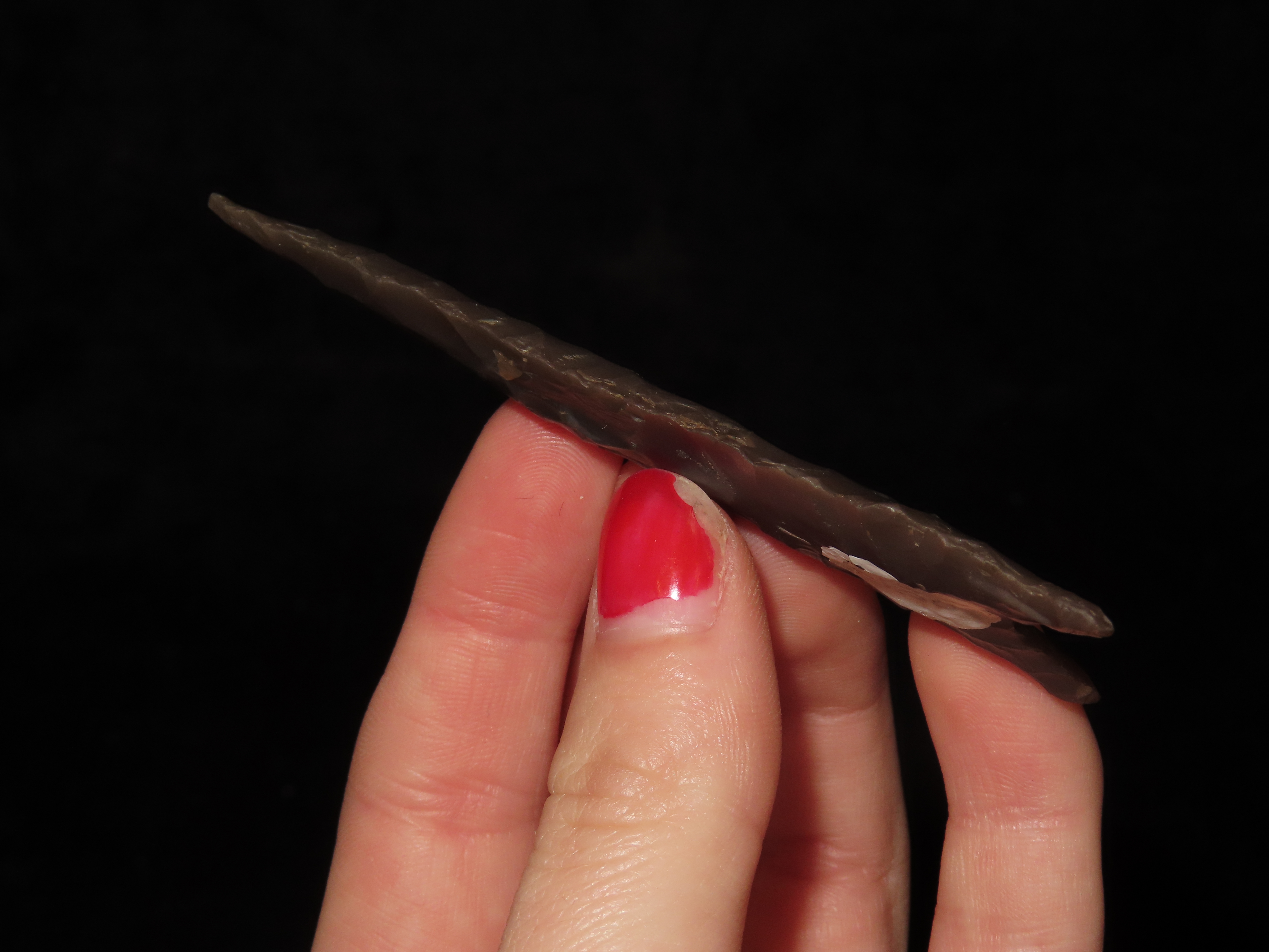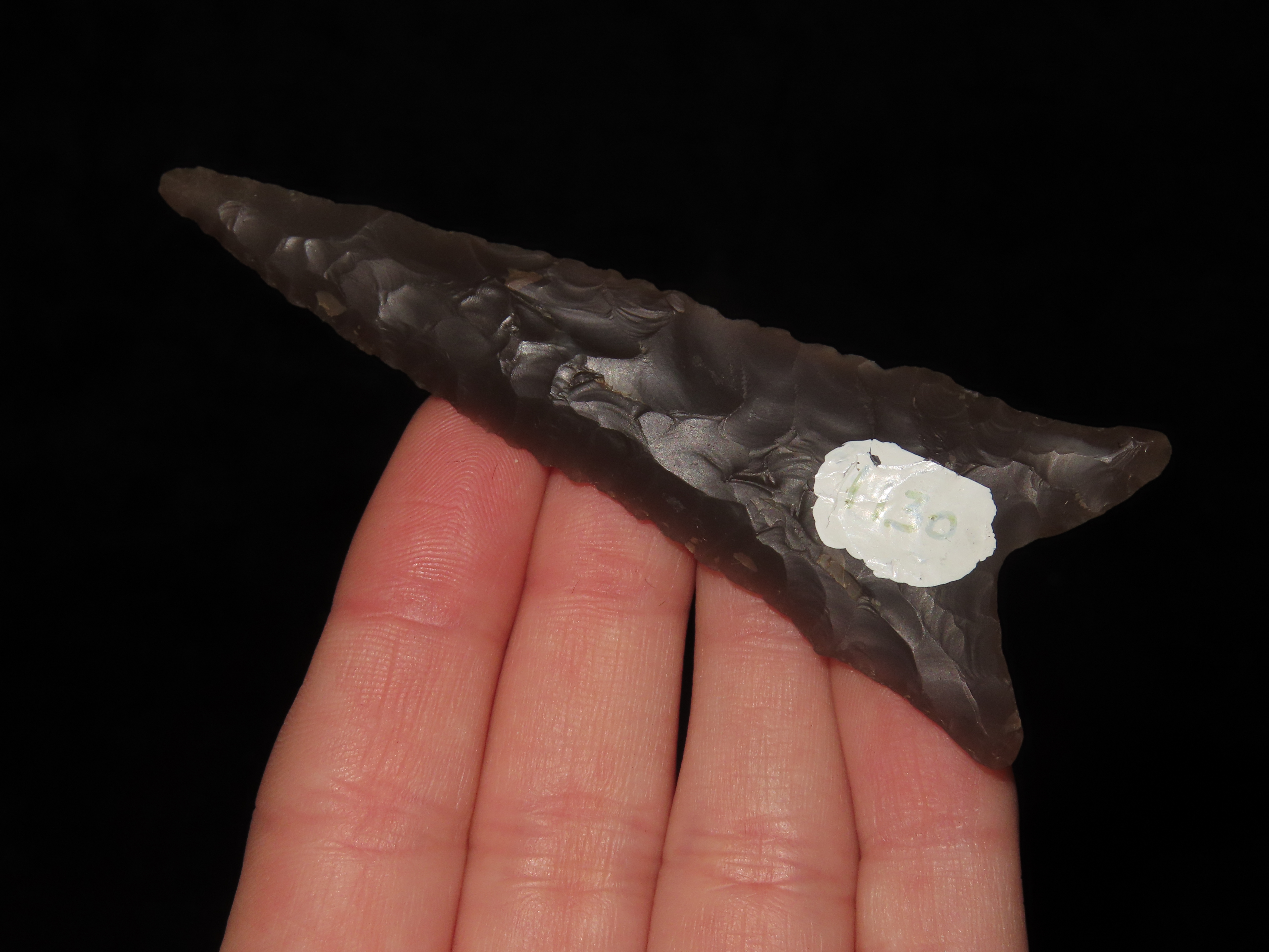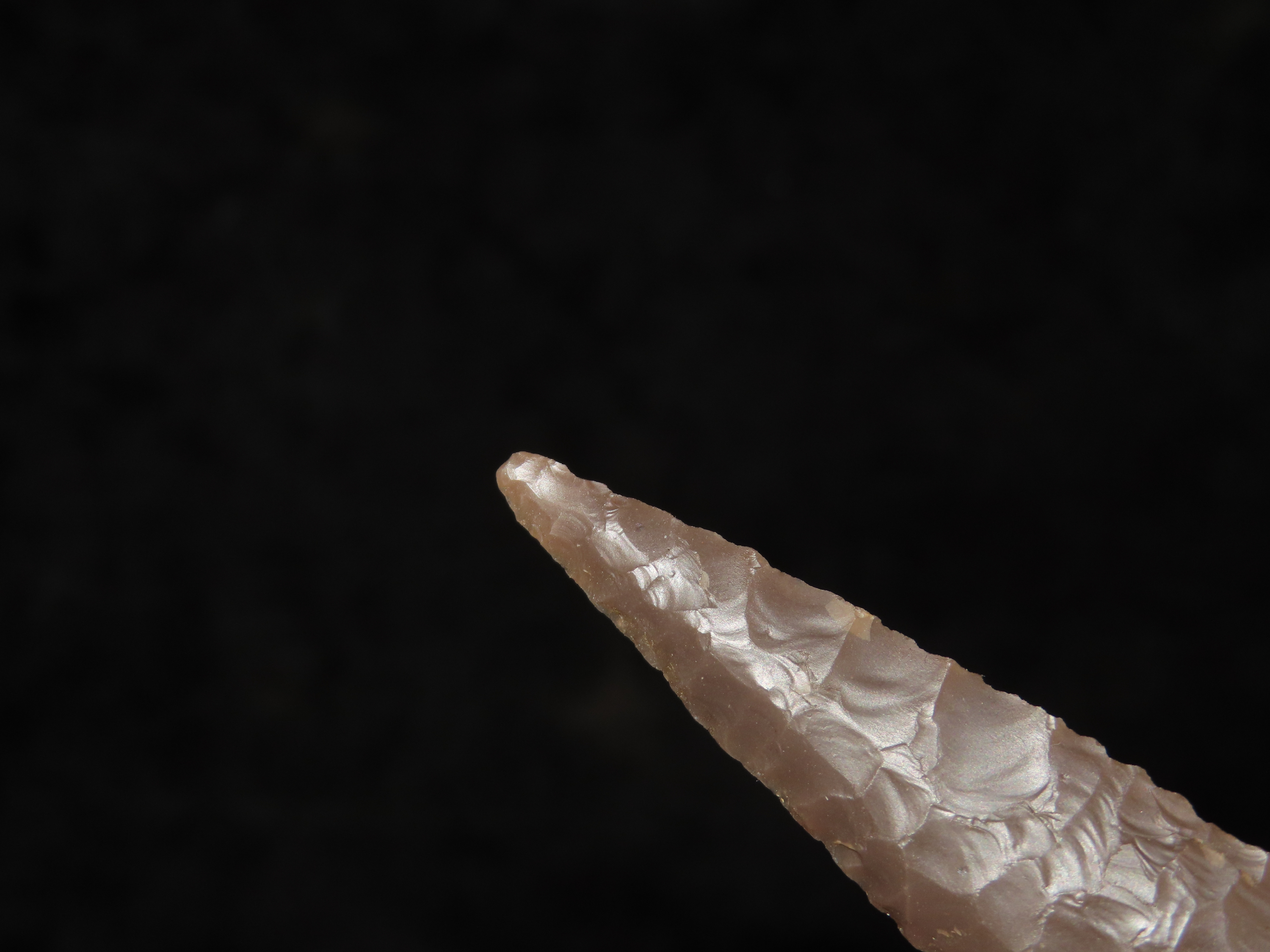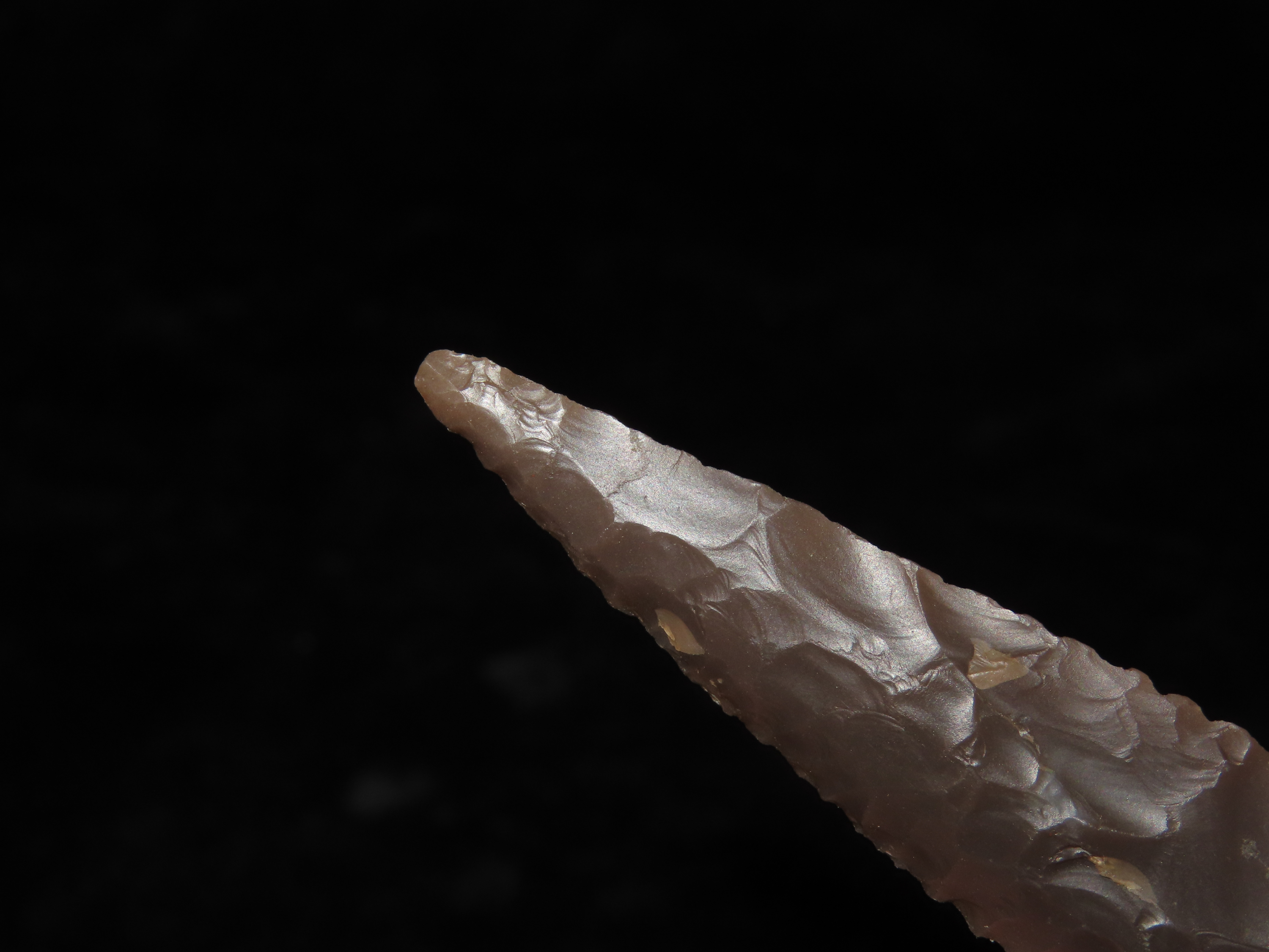 Amazing 3 1/2″ Knife River Flint Dalton, Lee Co. Iowa. Motley COA. Highly Transucent example, nice classic form, thin and very well flaked.