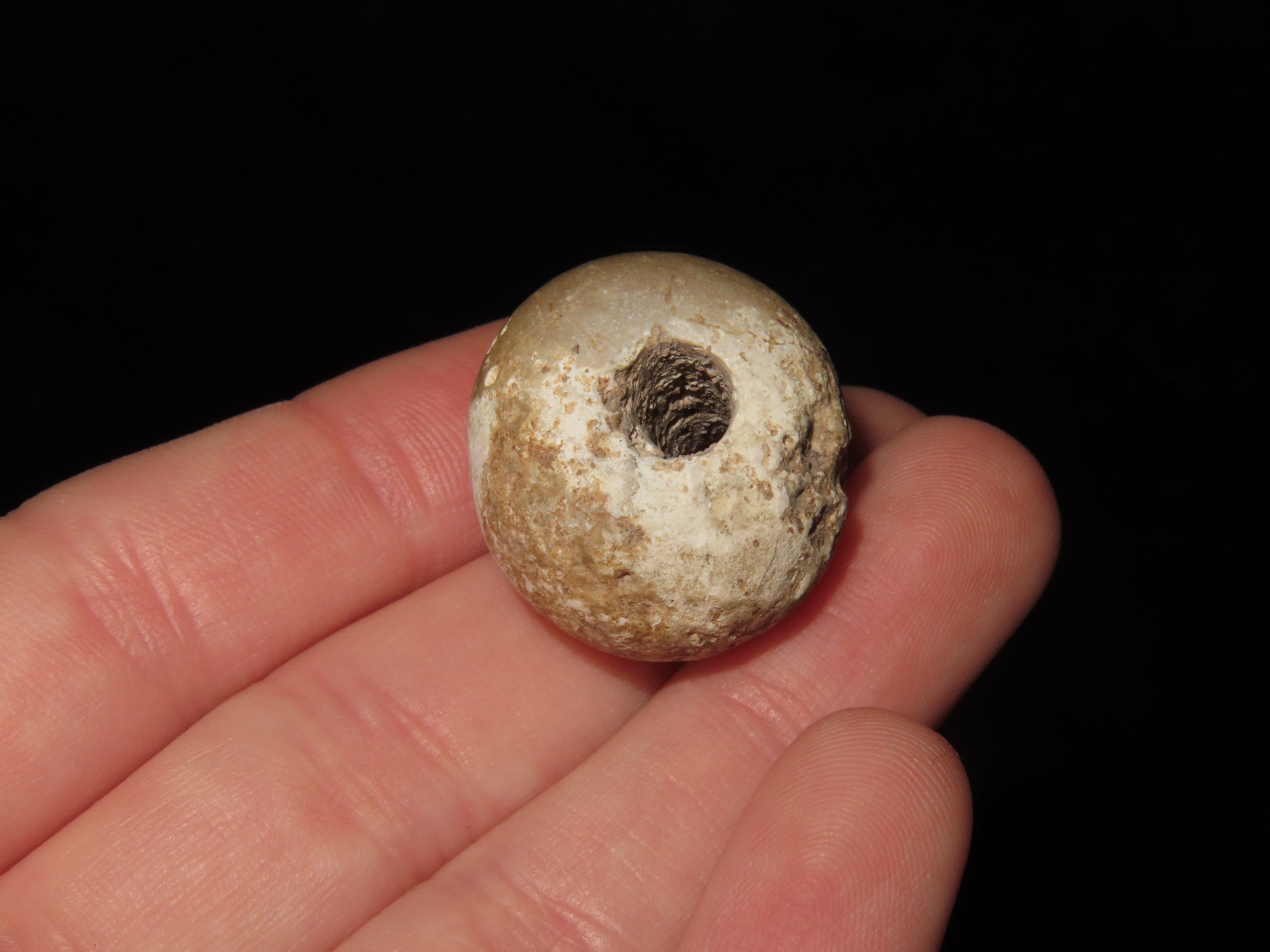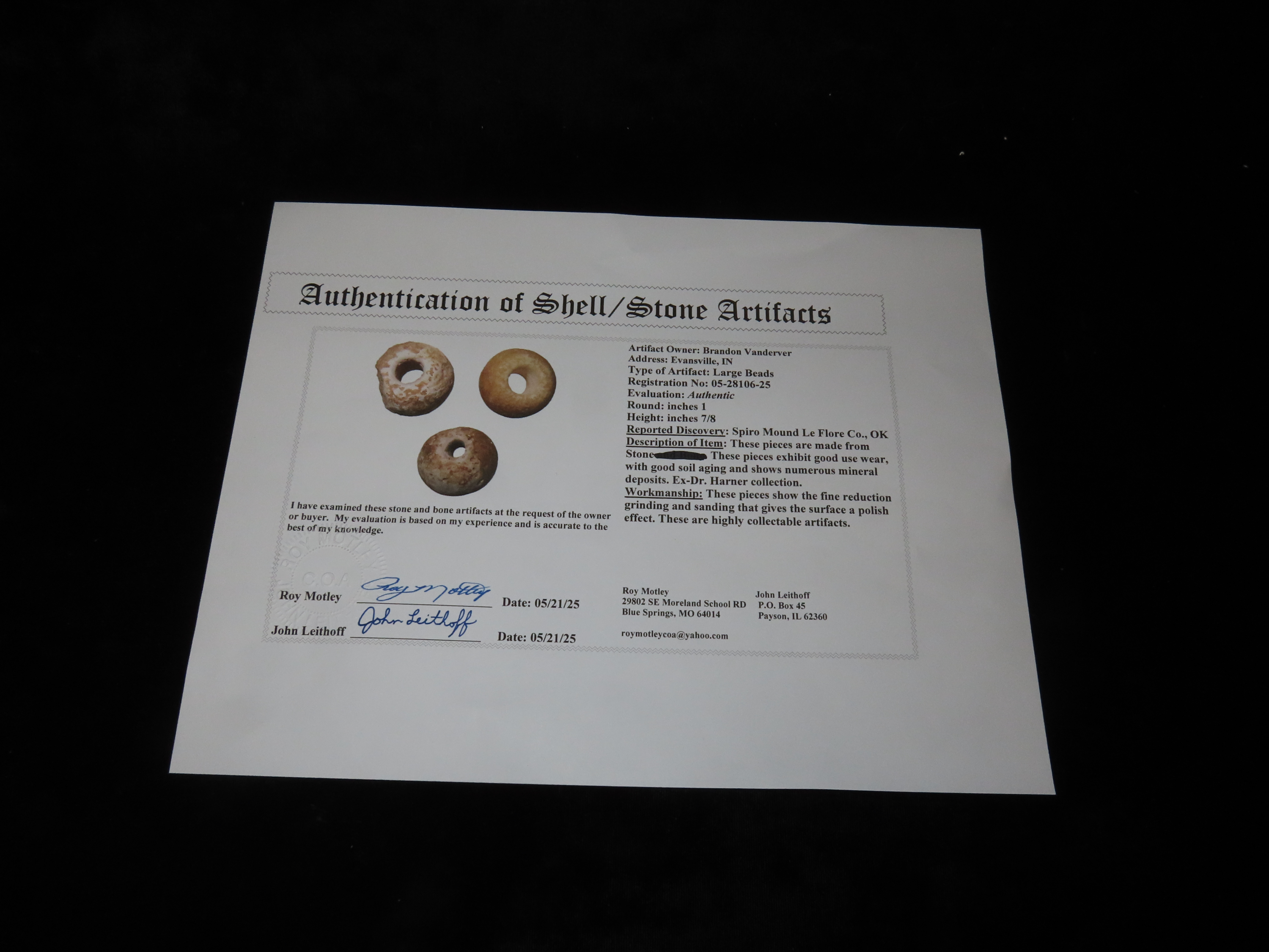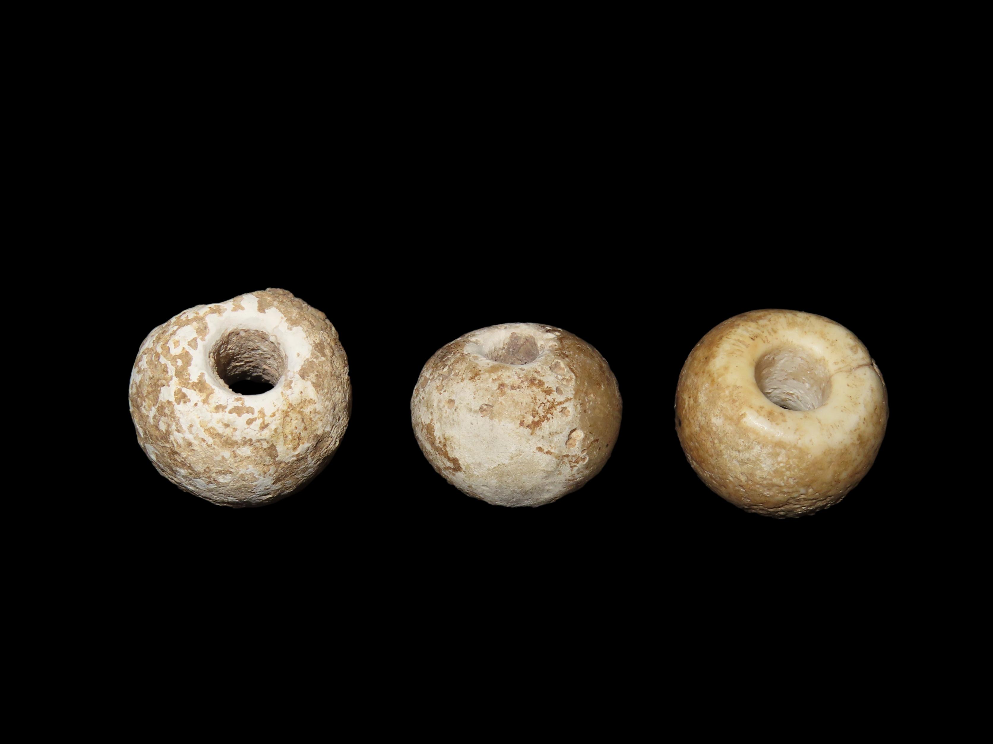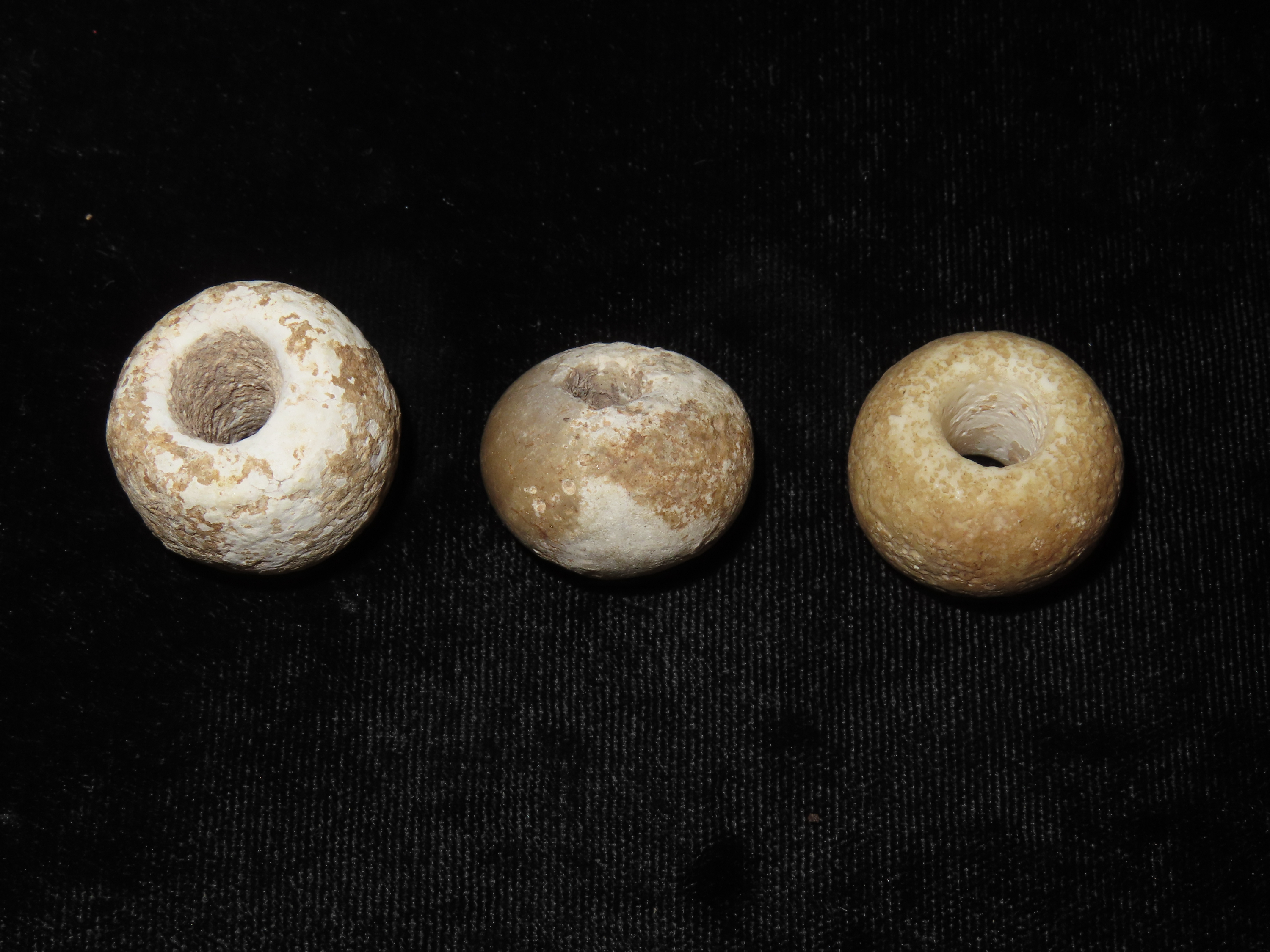 Group of 3 Large Beads, Spiro Mound, Le Flore Co. Oklahoma. Motley COA. All 3 are made from Limestone and have heavy patina and deposits. Each about 1″ wide and from 5/8 to 7/8″ thick. Ex Dr. David Harner Collection.