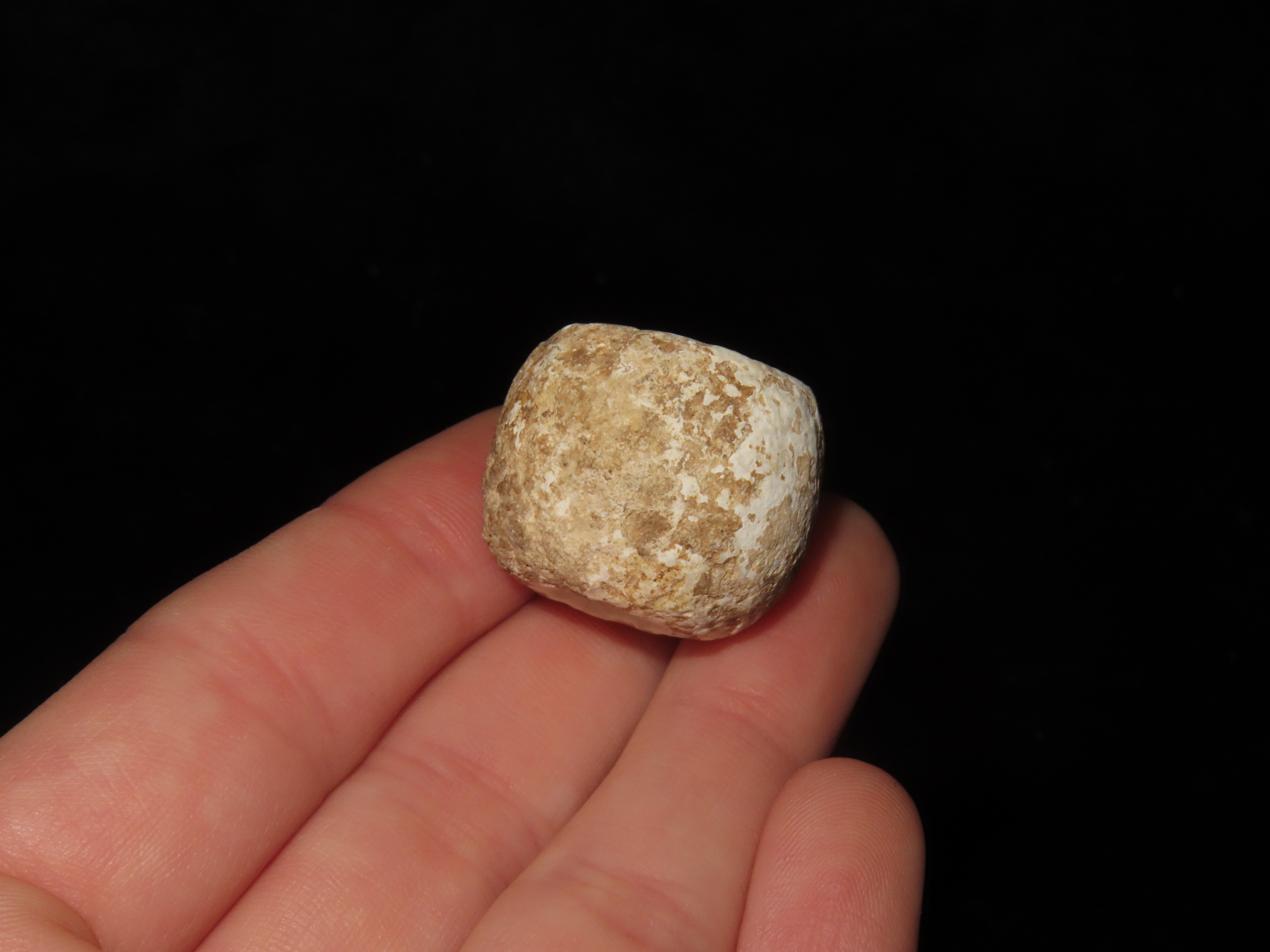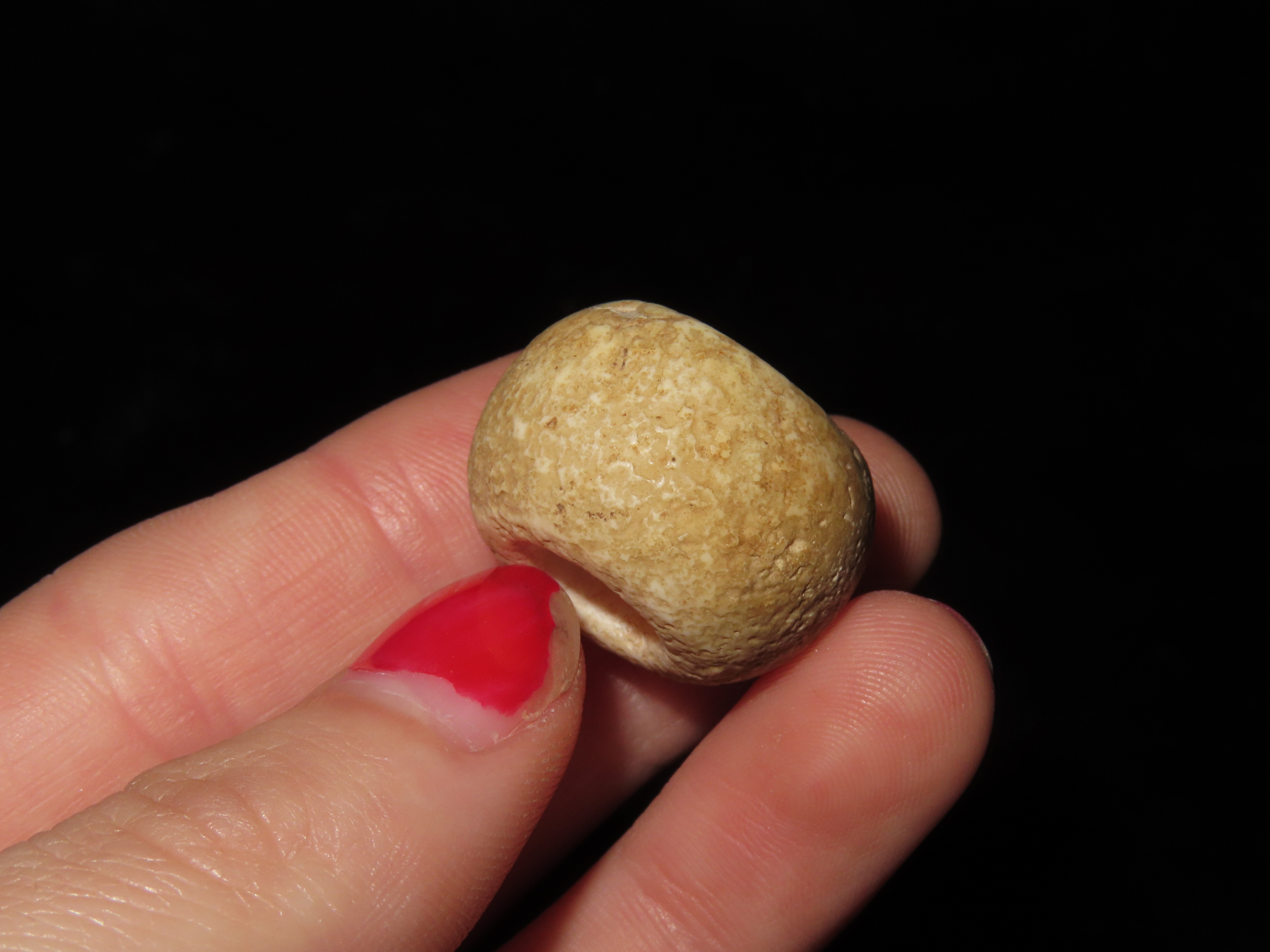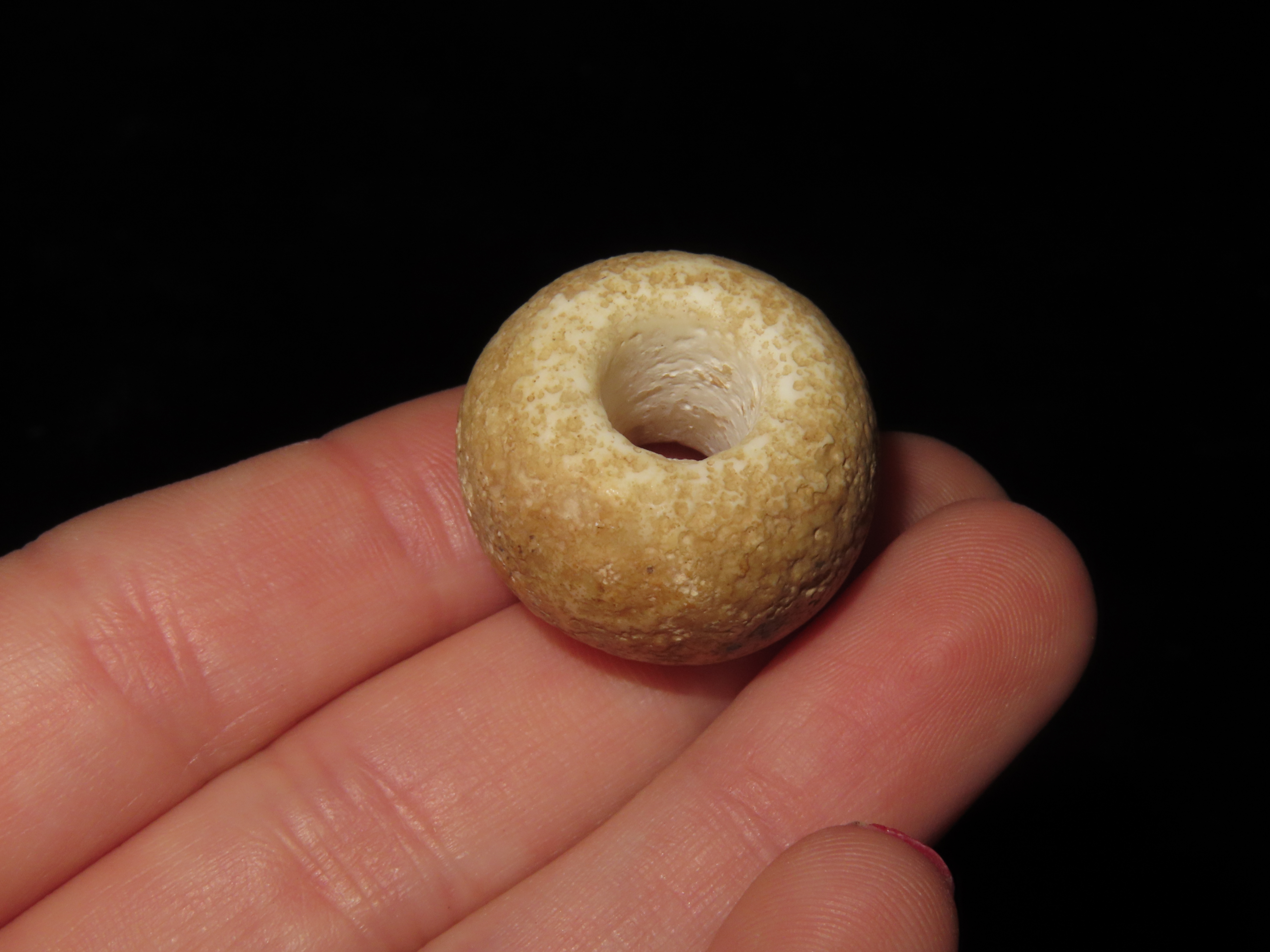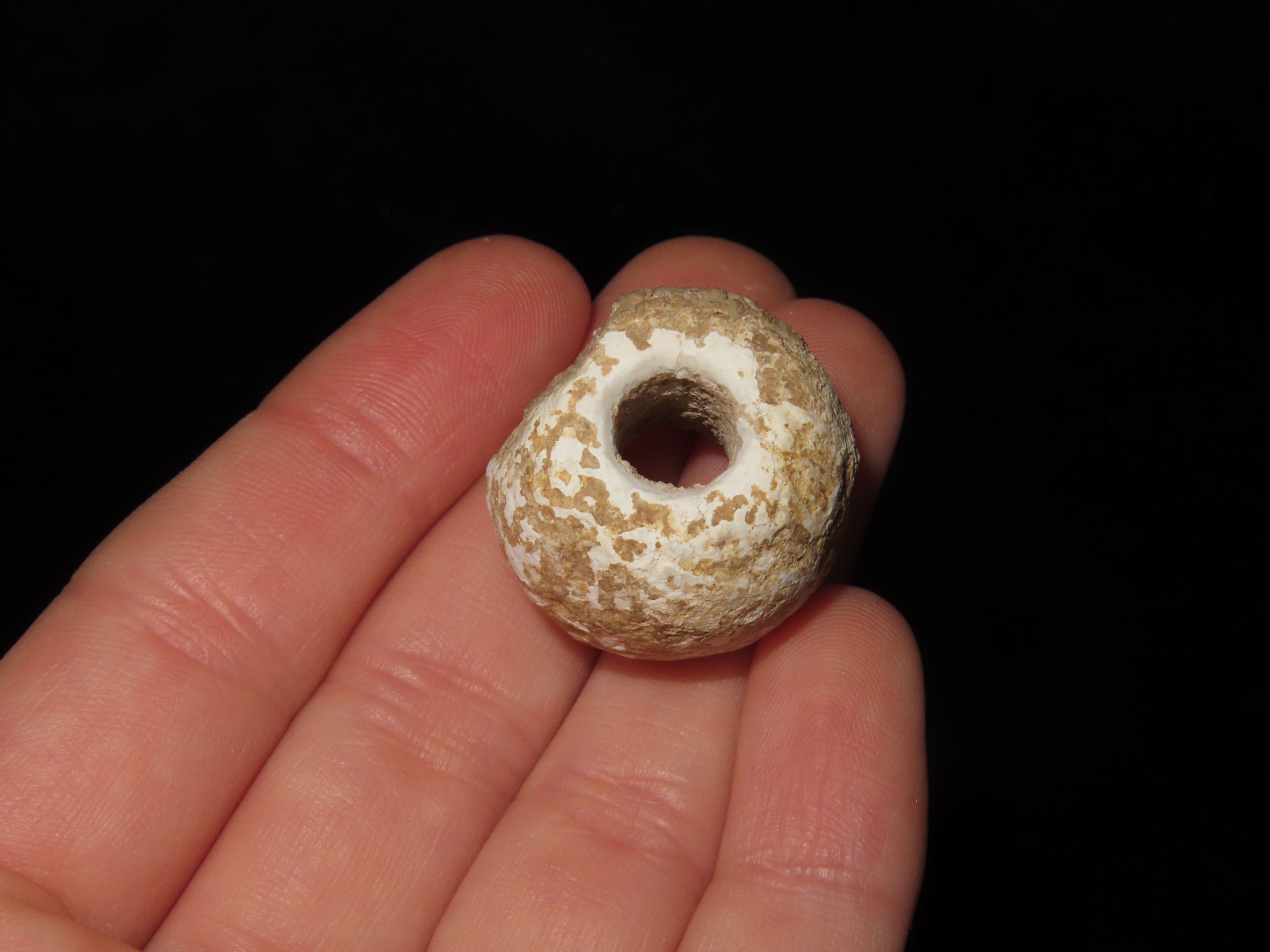 Group of 3 Large Beads, Spiro Mound, Le Flore Co. Oklahoma. Motley COA. All 3 are made from Limestone and have heavy patina and deposits. Each about 1″ wide and from 5/8 to 7/8″ thick. Ex Dr. David Harner Collection.