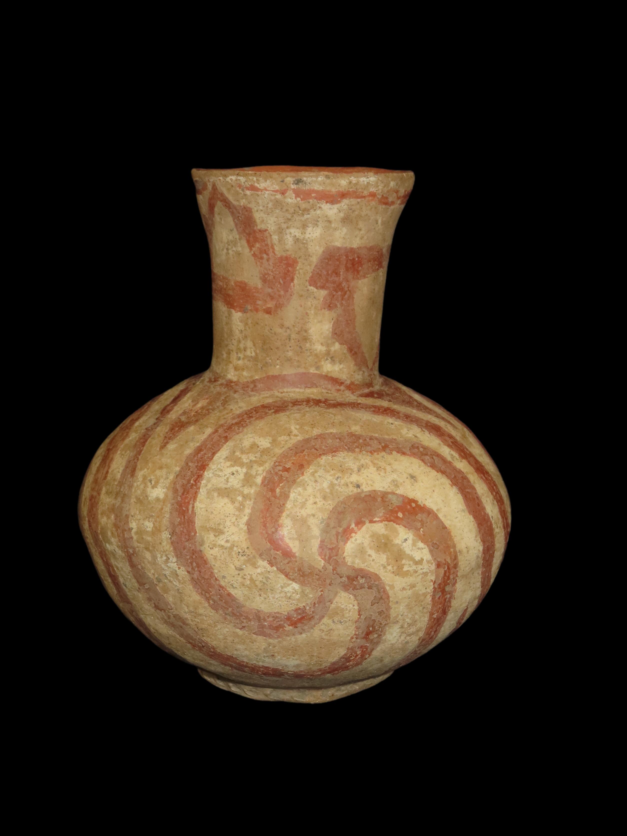 Museum Grade Red & White Swirl Pottery Water Bottle, Mississippi Co. Arkansas. Ex Jim Main, Ex Dr. Cherry, Ex Joey Ellis. Originally found by Jim Main at a site called “The Tomato Patch, ” in the spring of 1985. This site (3MS109) was located between the Crosskno & Roseland Sites in Northern mississippi County, Arkansas. Dr. Cherry, author of the “The Headpots of Northeast Arkasnas & Pemiscot Co. Missouri, ” purchased from Jim Main in December of 1985. 100% Solid and Original conditon, all original paint. Nicely decorated base. Measures 9″ tall by 7 1/2″ wide. A rare oppurtunity and a truly exceptional piece of anceint artistry!